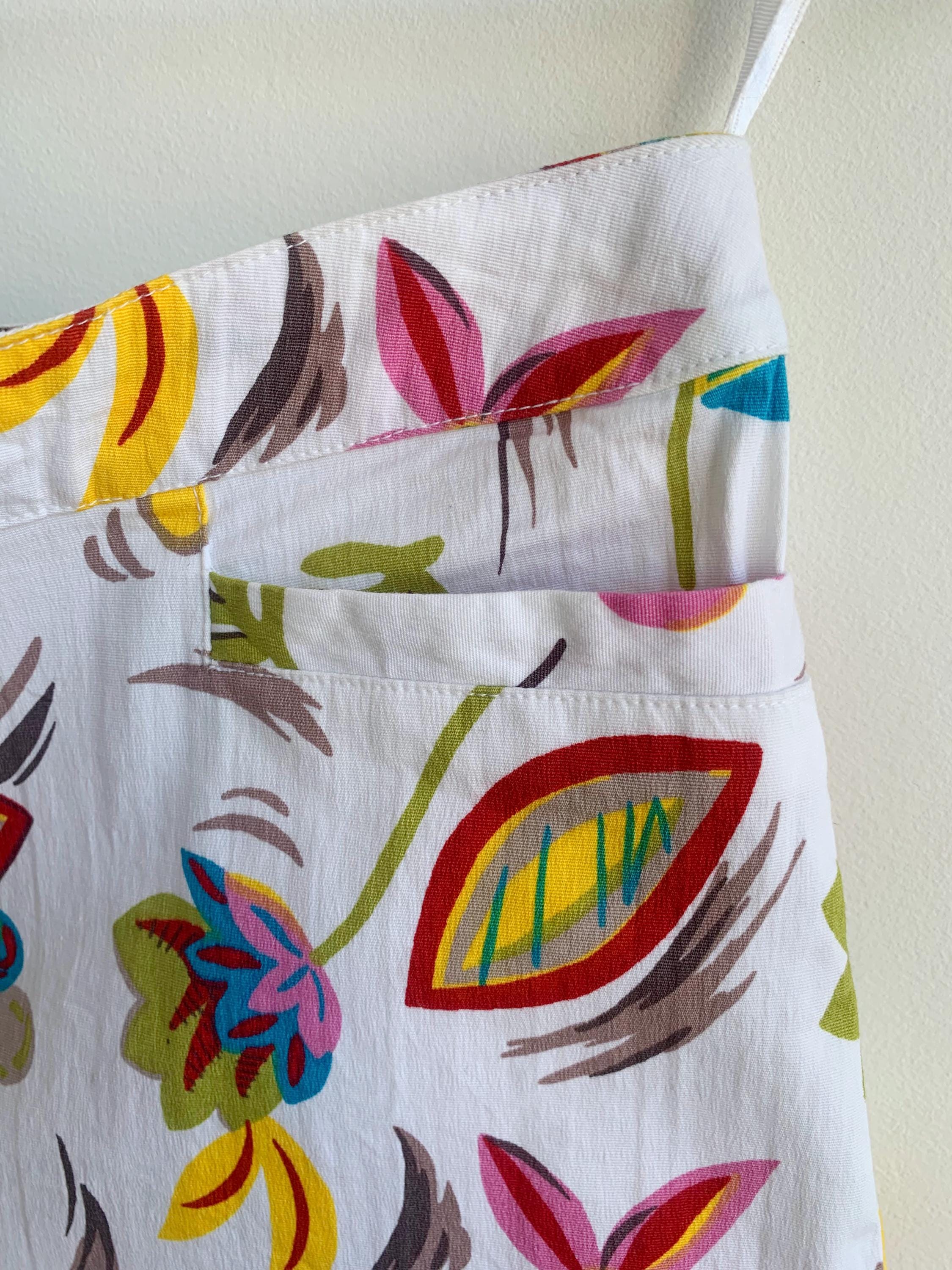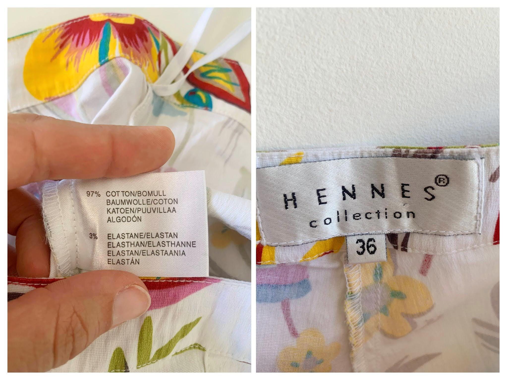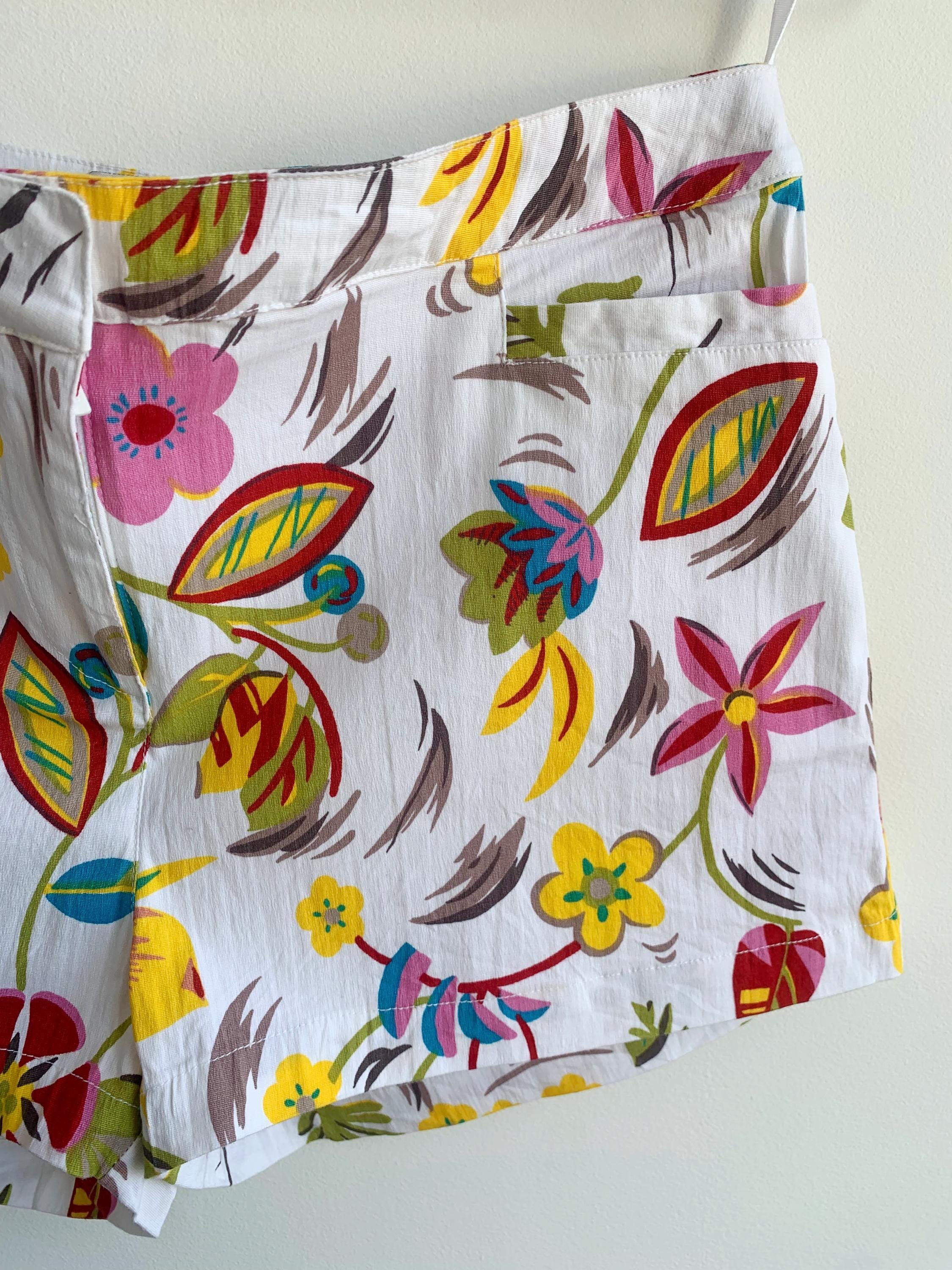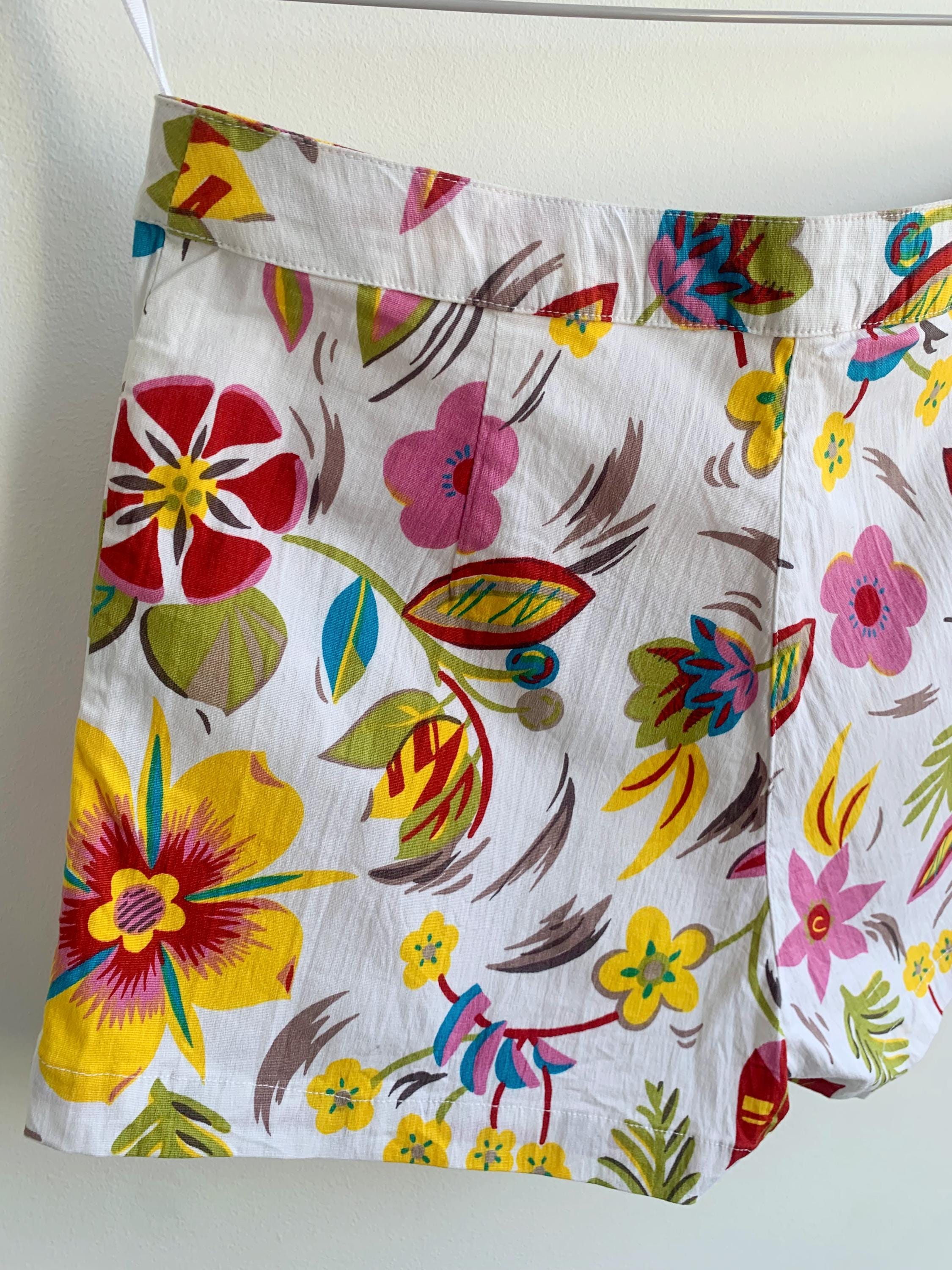 Step into a vibrant time with these absolutely stunning vintage Hennes Collection floral fhorts! If you're a 90s boho lover with a free spirit and a passion for sustainable fashion, these colorful short pants are your next must-have. These retro low waist short trousers boast a truly vibrant print floral pattern of colorful blooms on a crisp white background, perfect for a summer festival or your next getaway.