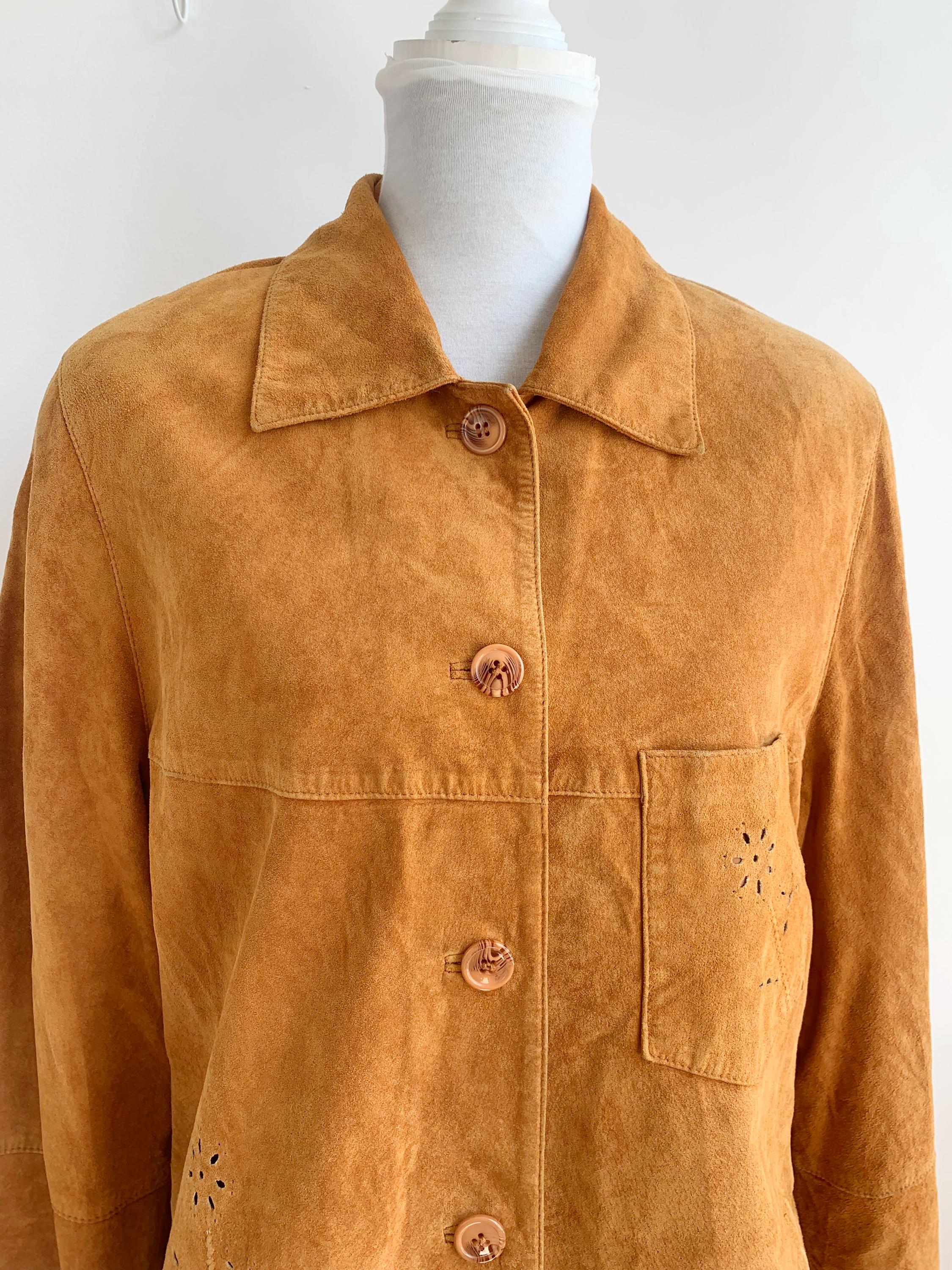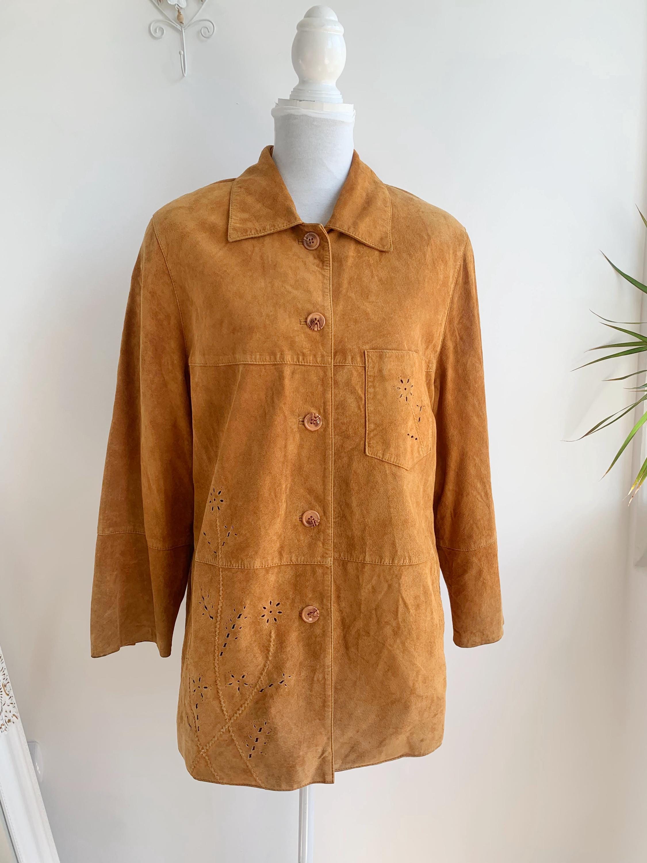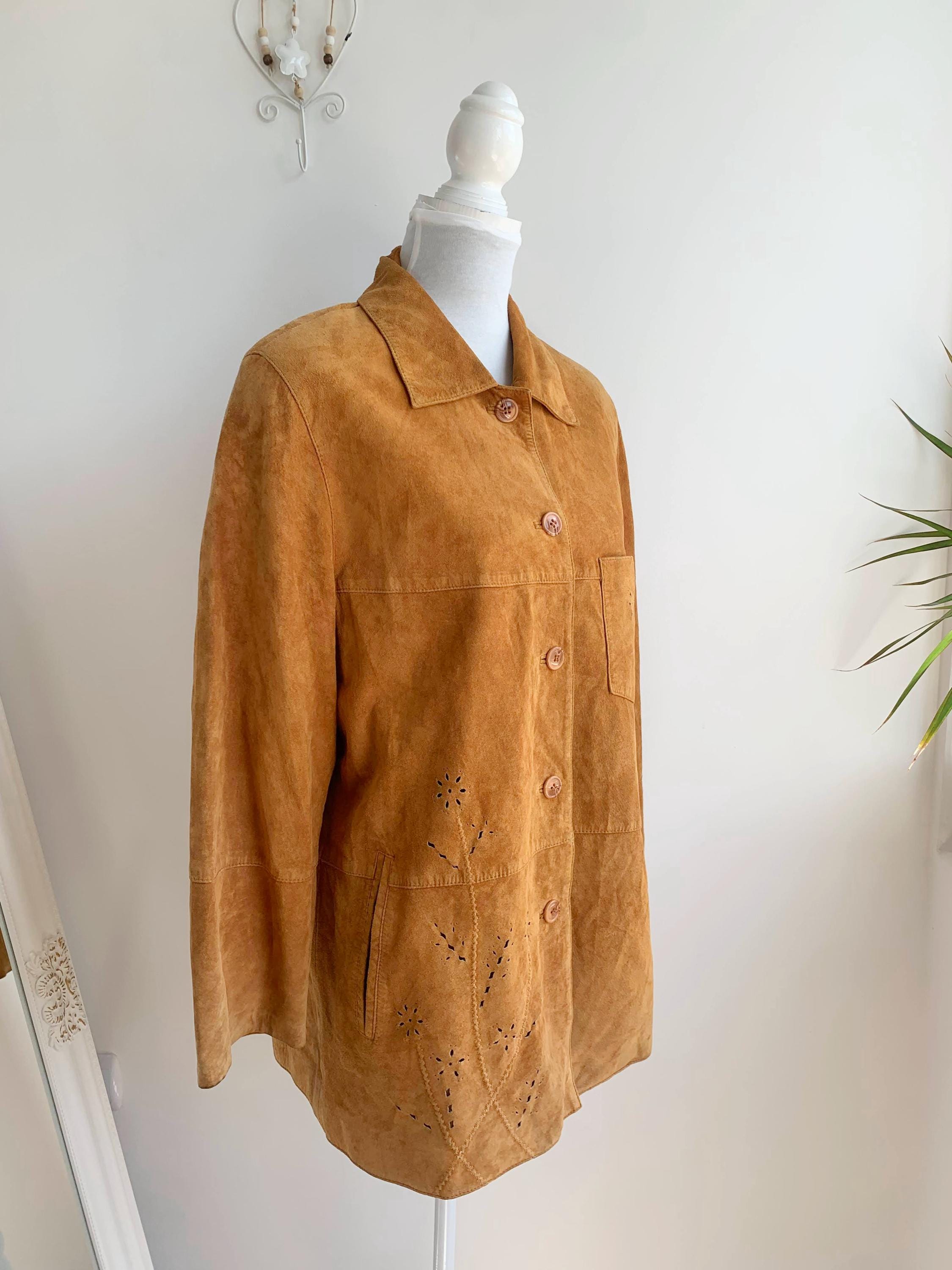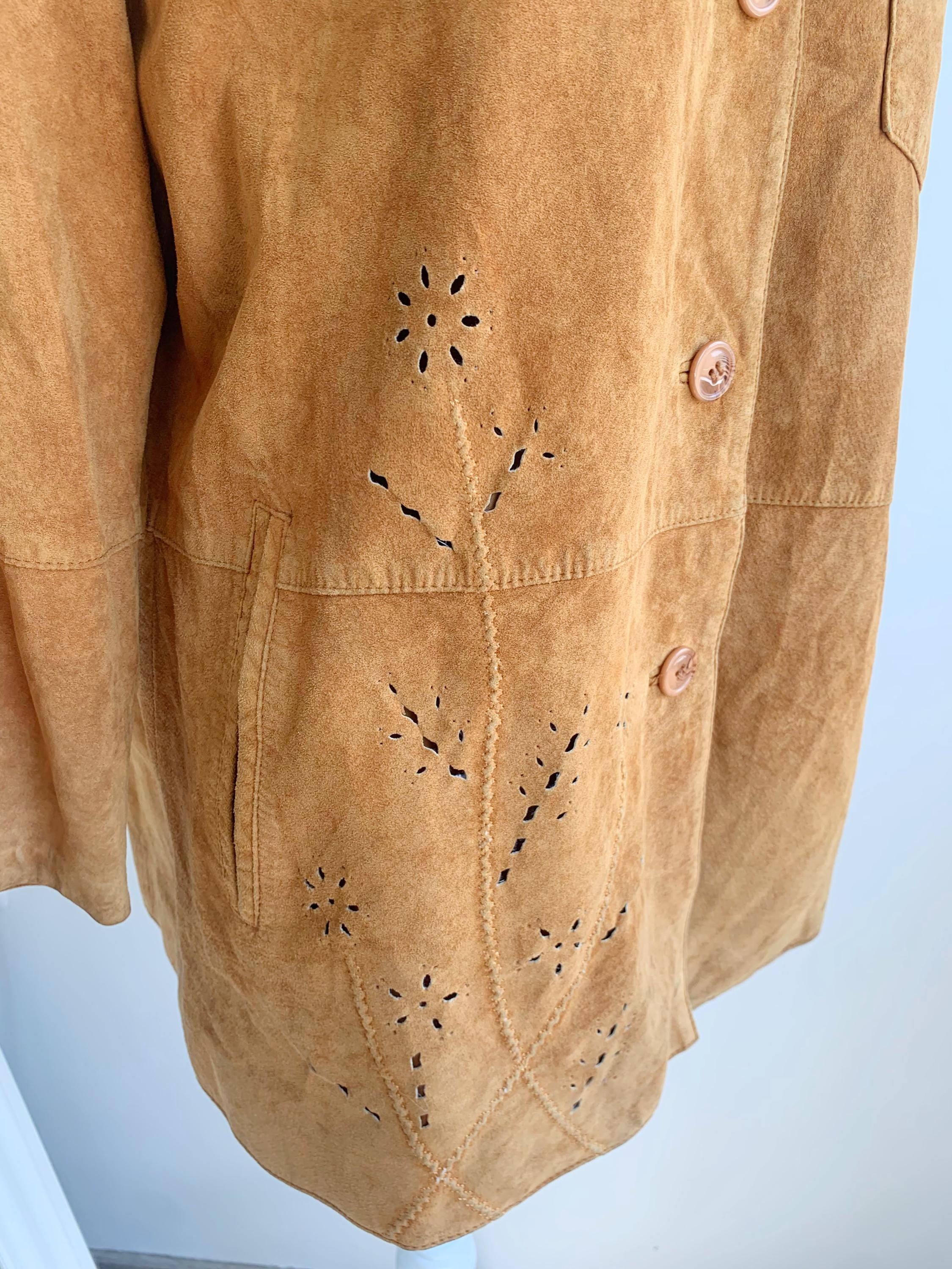 This is a vintage 90s soft genuine suede leather jacket for women with button front closure and lovely floral hollow out eyelet detailing at the side and the chest pocket. D/B/CH 44, F46, I 50, E 46, GB 18, EUR 100 , fits like size XL .