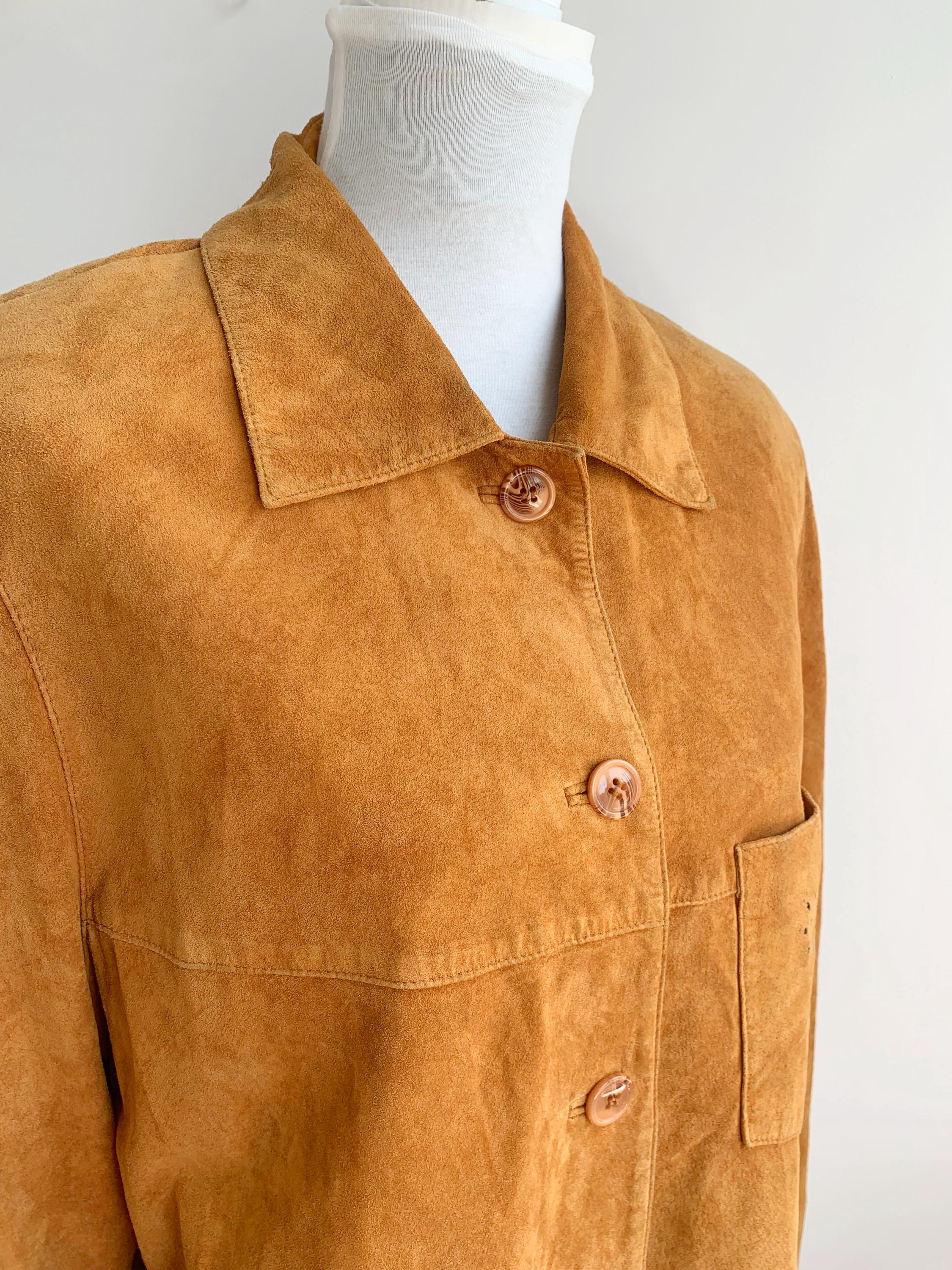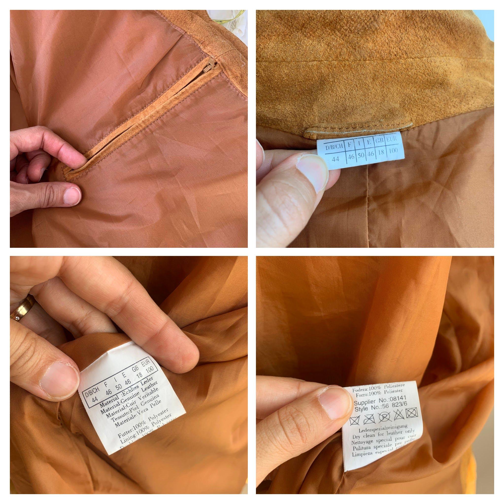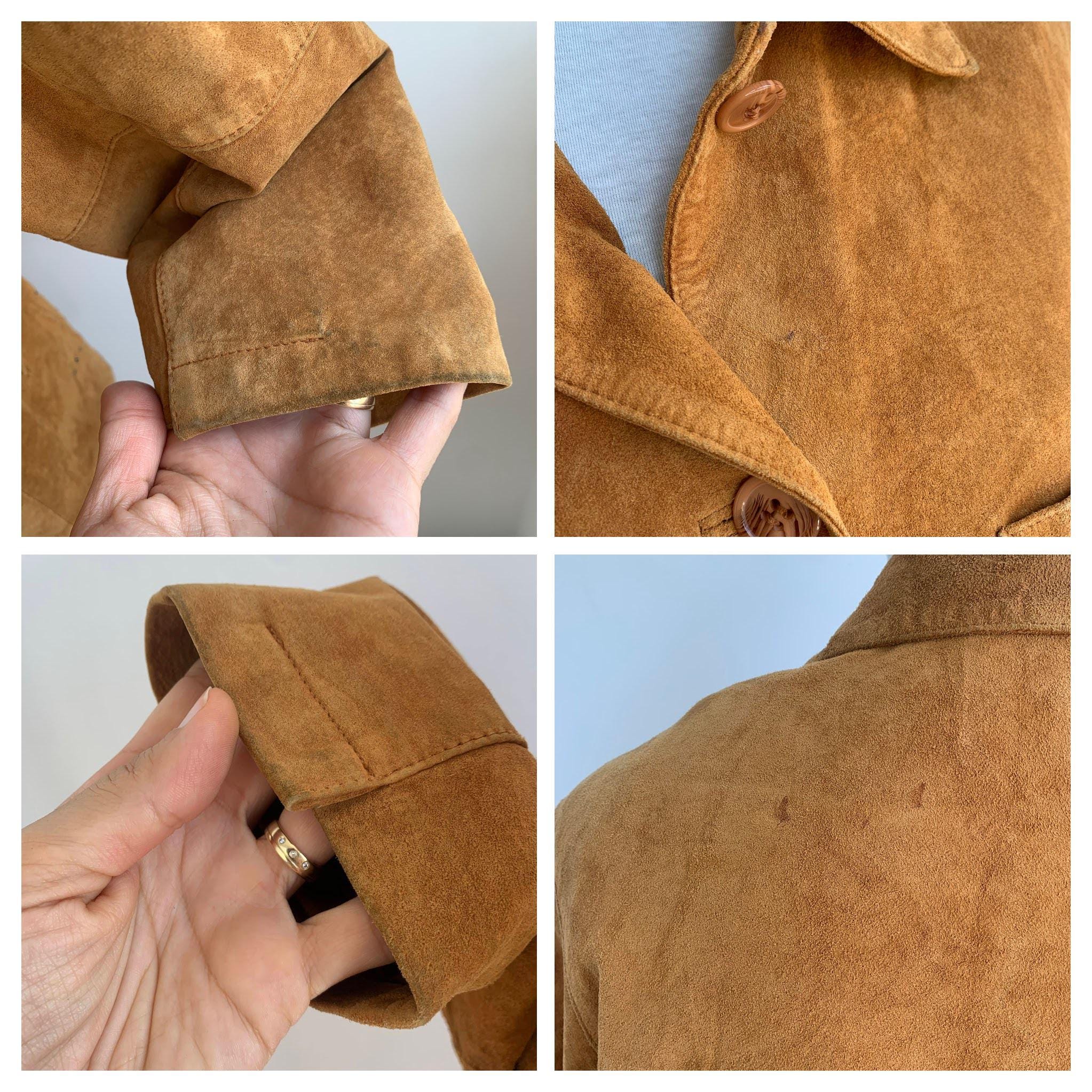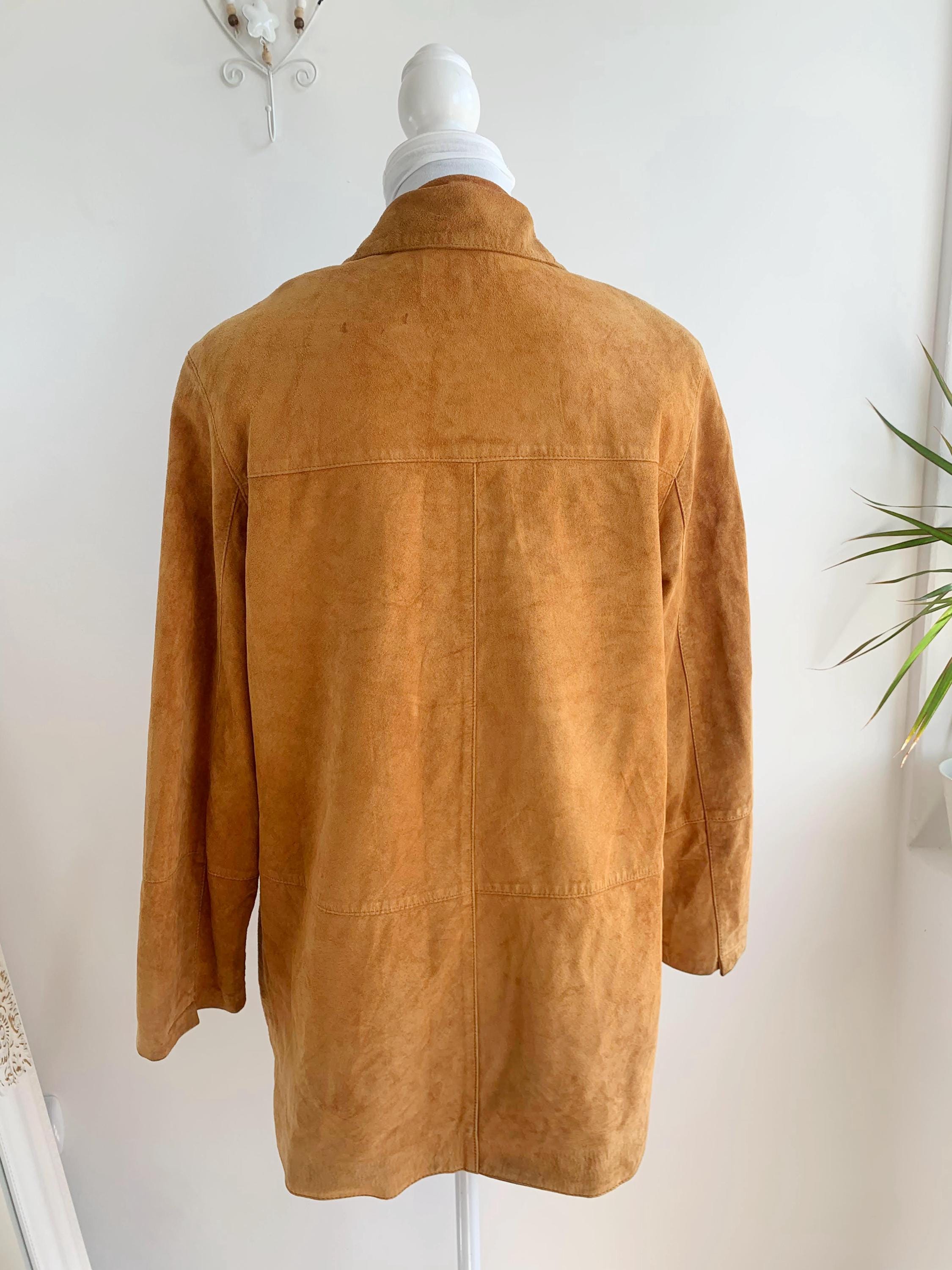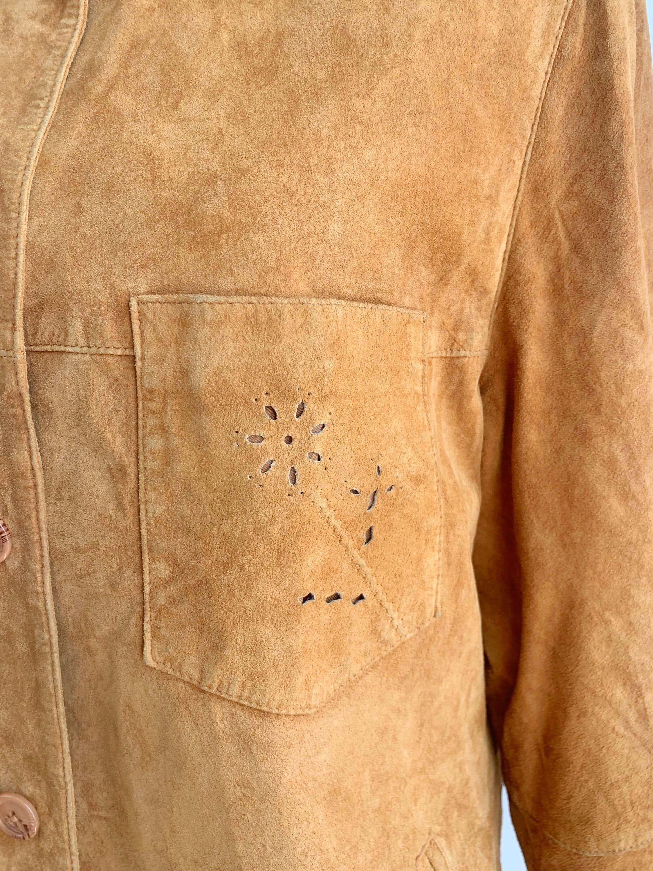 This is a vintage 90s soft genuine suede leather jacket for women with button front closure and lovely floral hollow out eyelet detailing at the side and the chest pocket. D/B/CH 44, F46, I 50, E 46, GB 18, EUR 100 , fits like size XL .