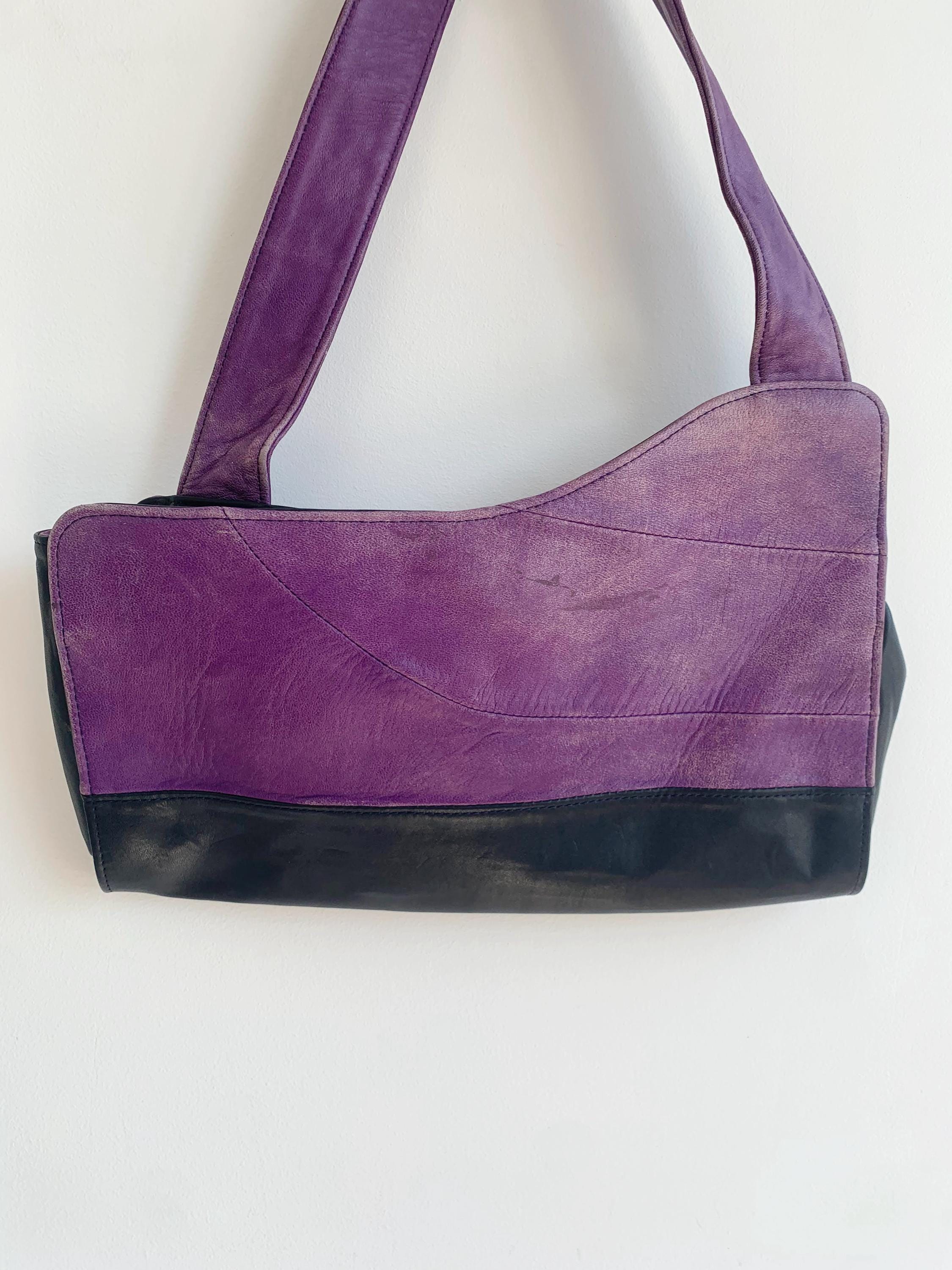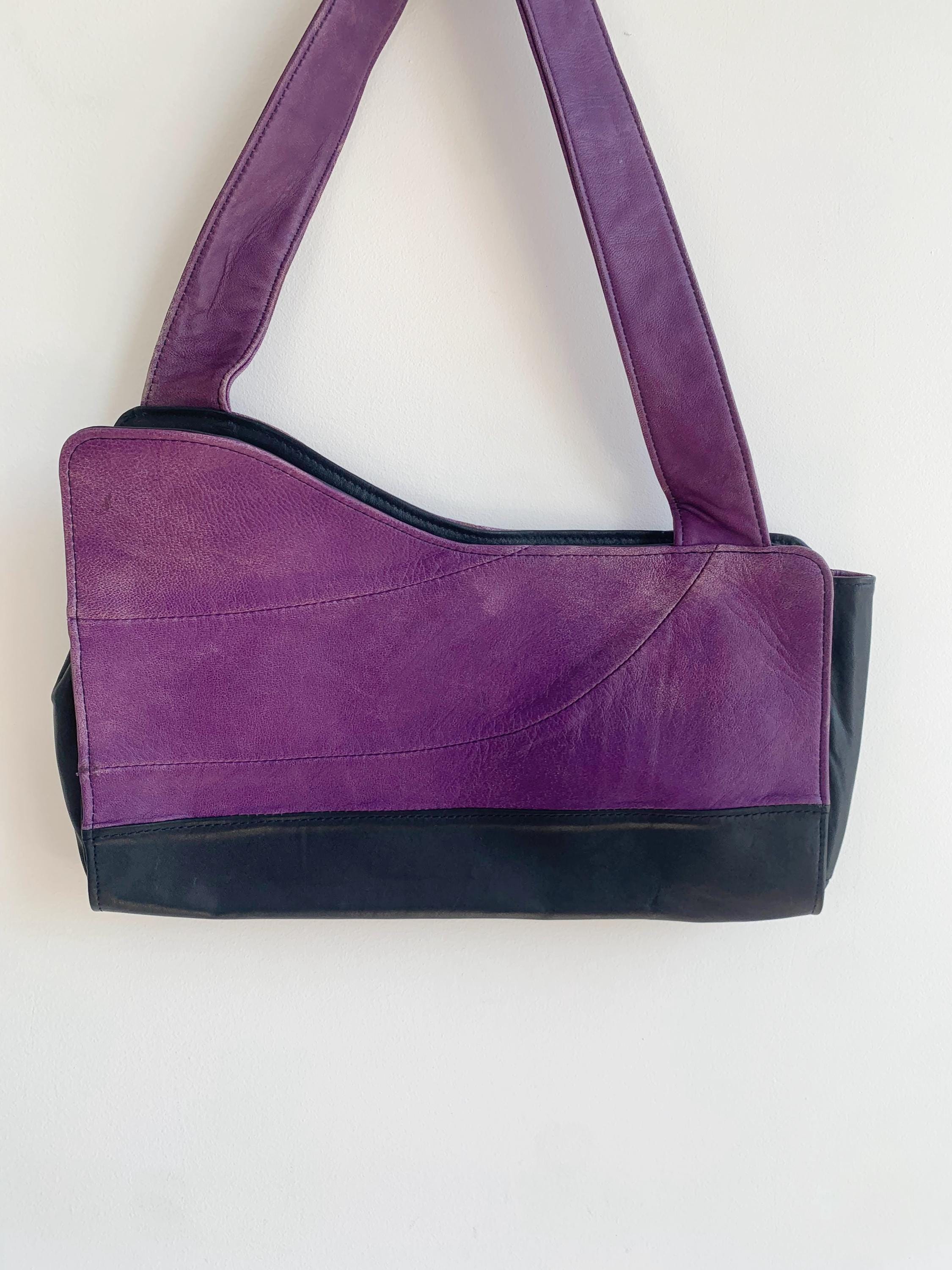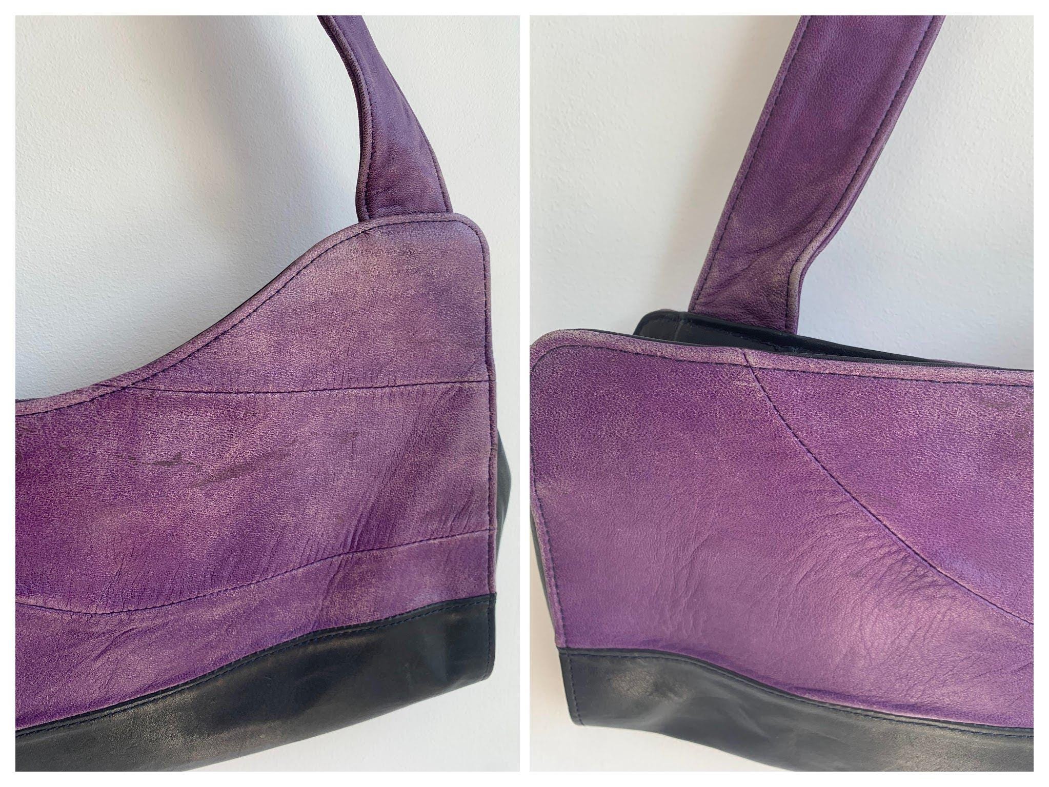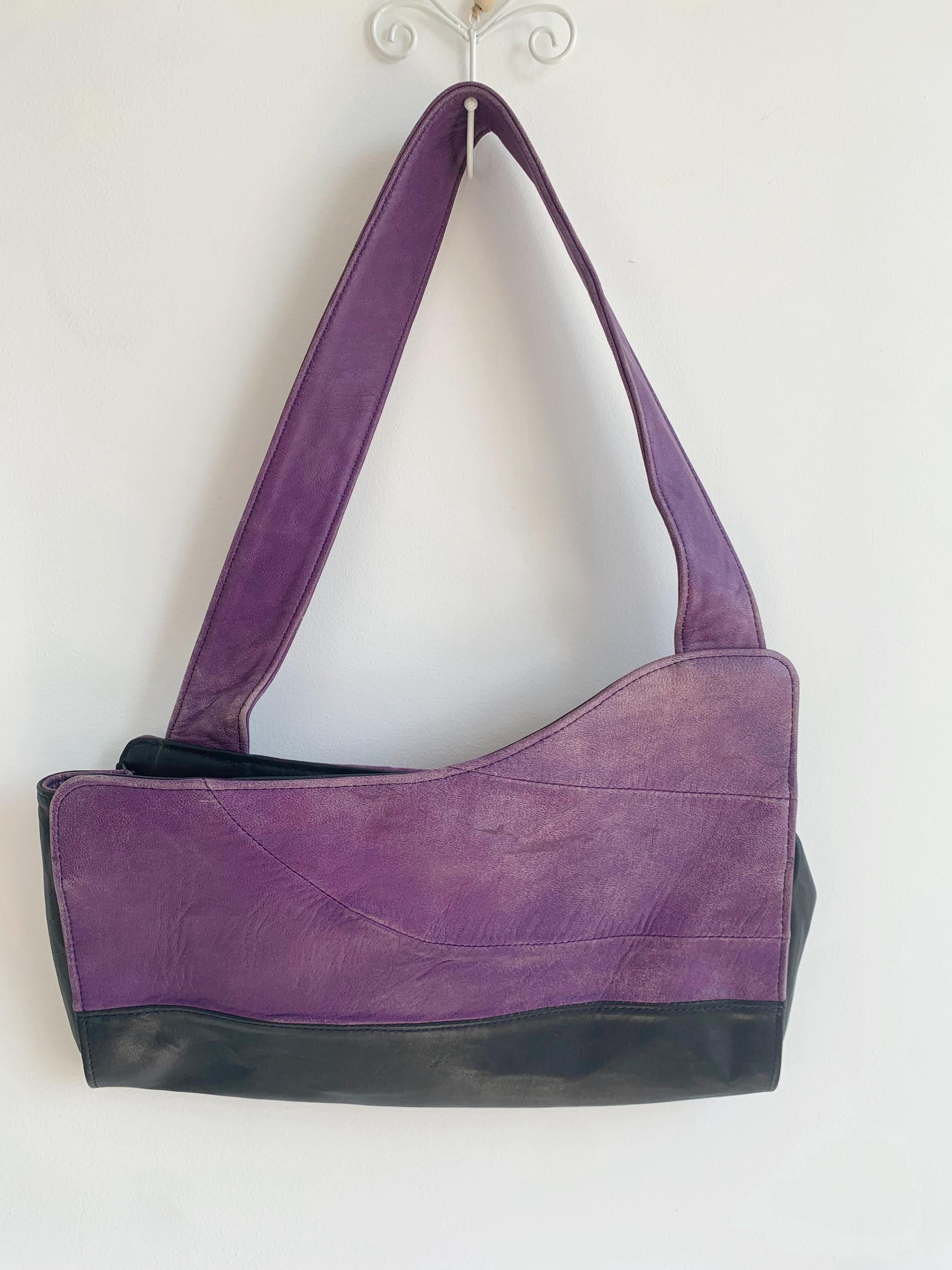 This is a lgorgeous vintage Y2K genuine leather tote bag made of soft genuine leather in rich purple and black color and asymmetrical shape. This vintage leather hobo bag has a single strap and open top with magnetic closure. The interior is lined in beautiful yellow polyester fabric. There is one compartment and one slip pocket.