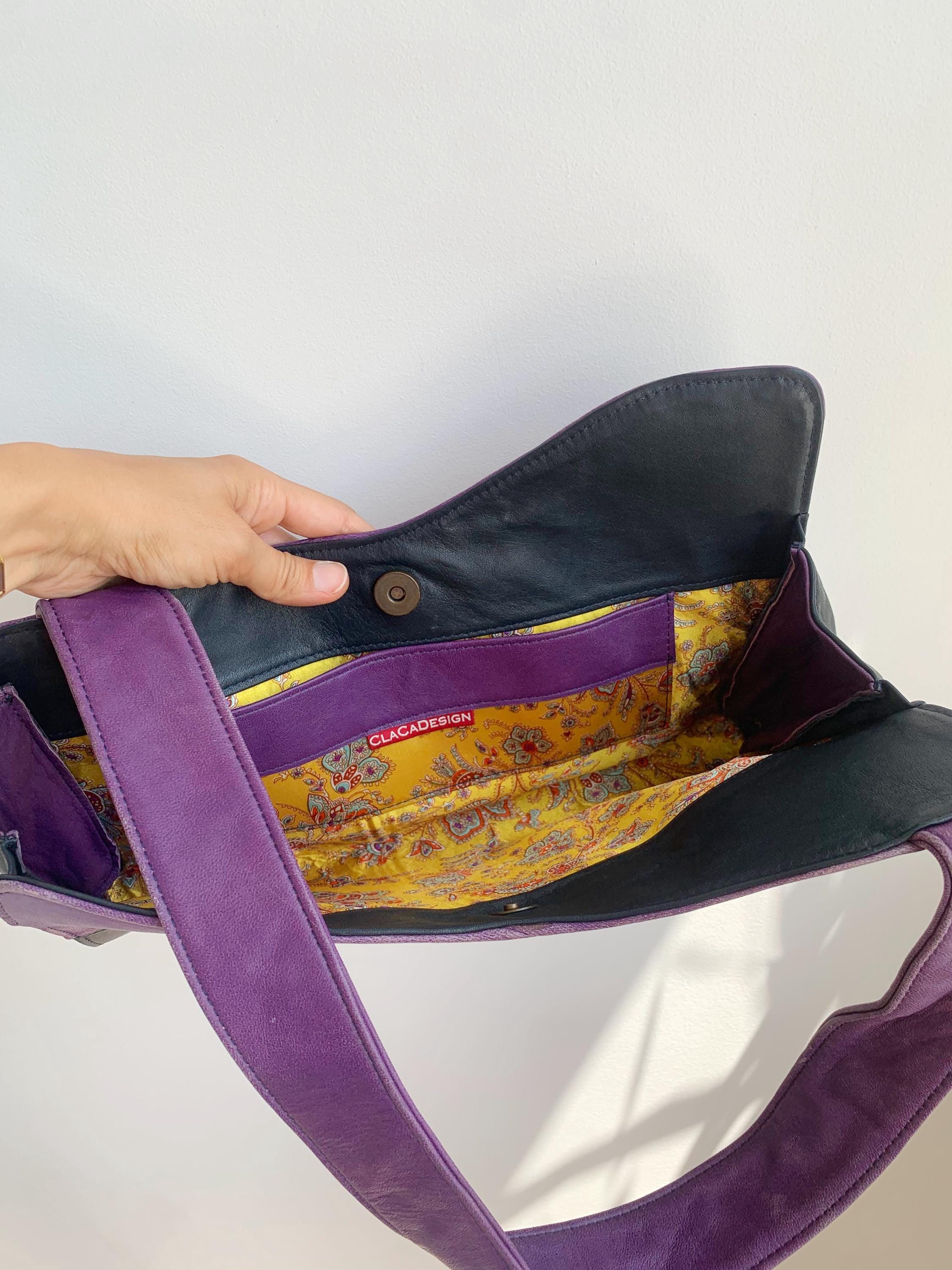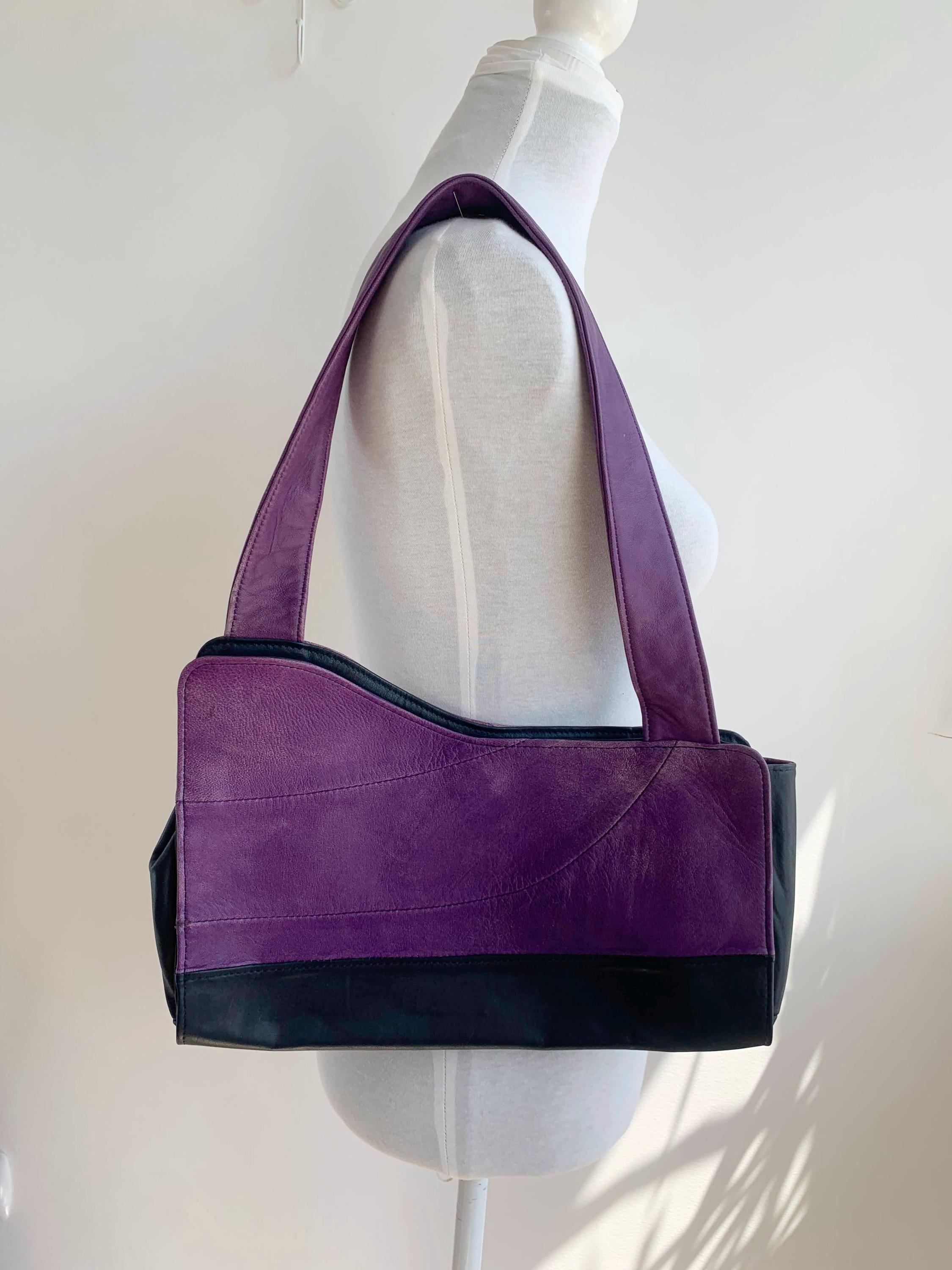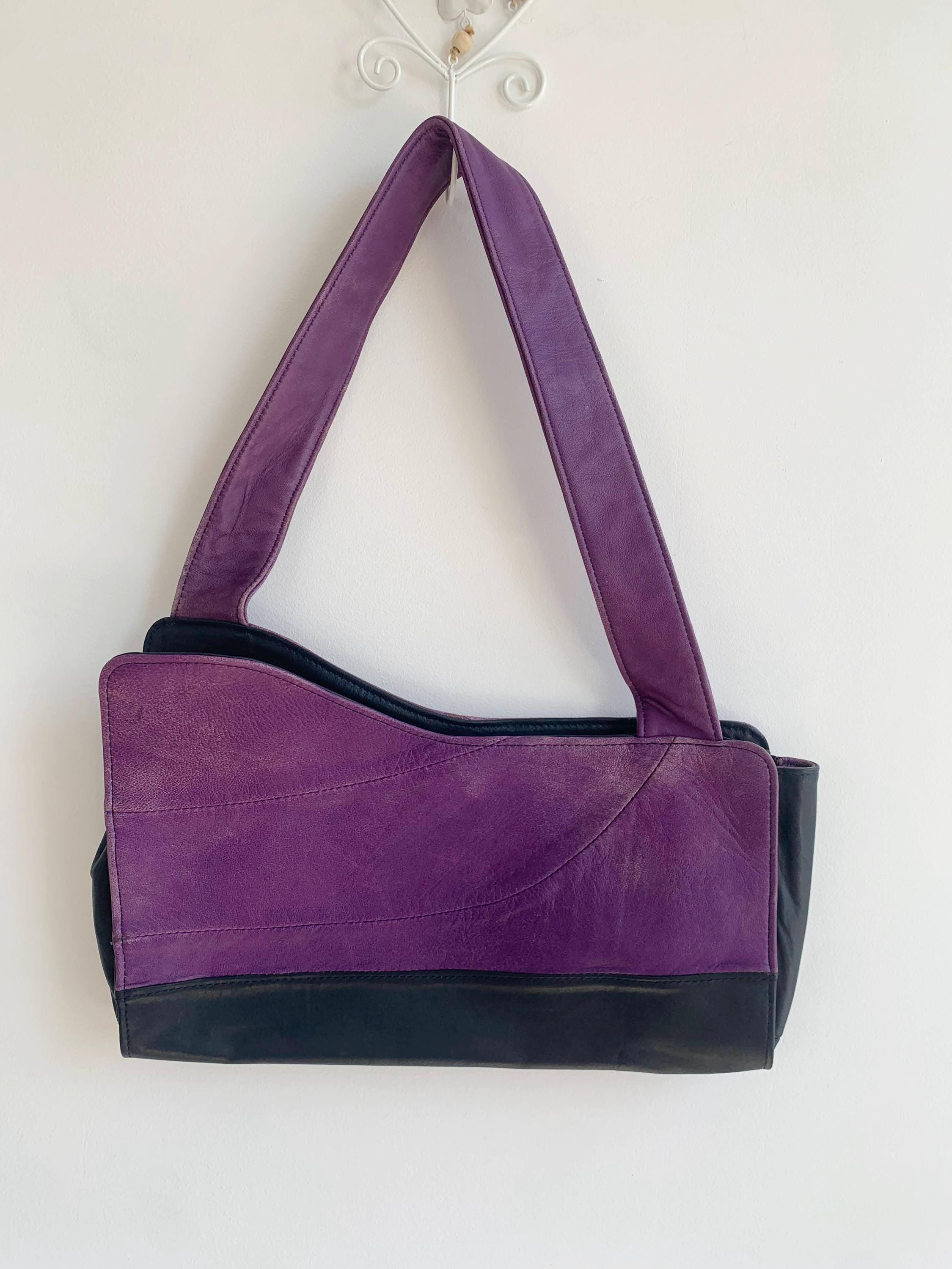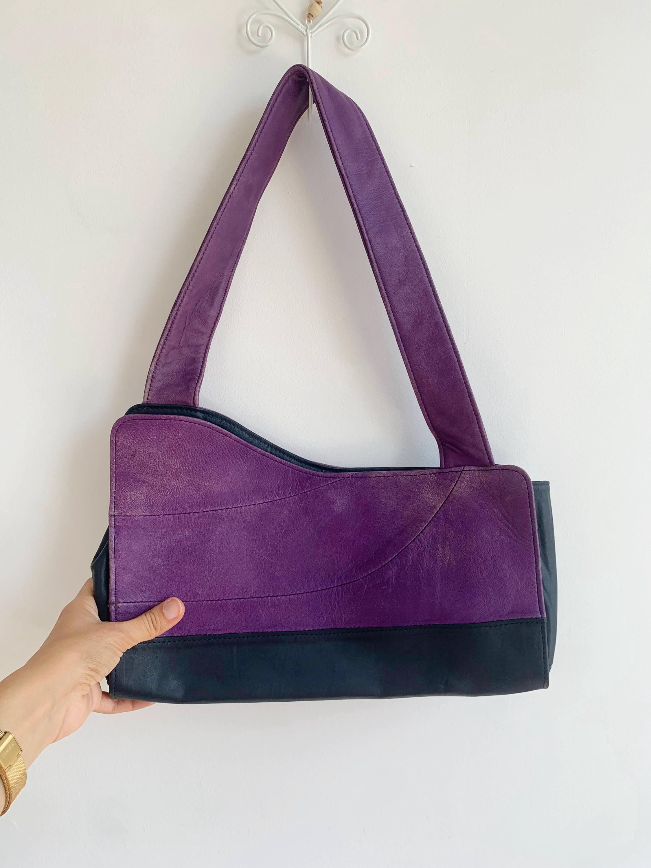 This is a lgorgeous vintage Y2K genuine leather tote bag made of soft genuine leather in rich purple and black color and asymmetrical shape. This vintage leather hobo bag has a single strap and open top with magnetic closure. The interior is lined in beautiful yellow polyester fabric. There is one compartment and one slip pocket.