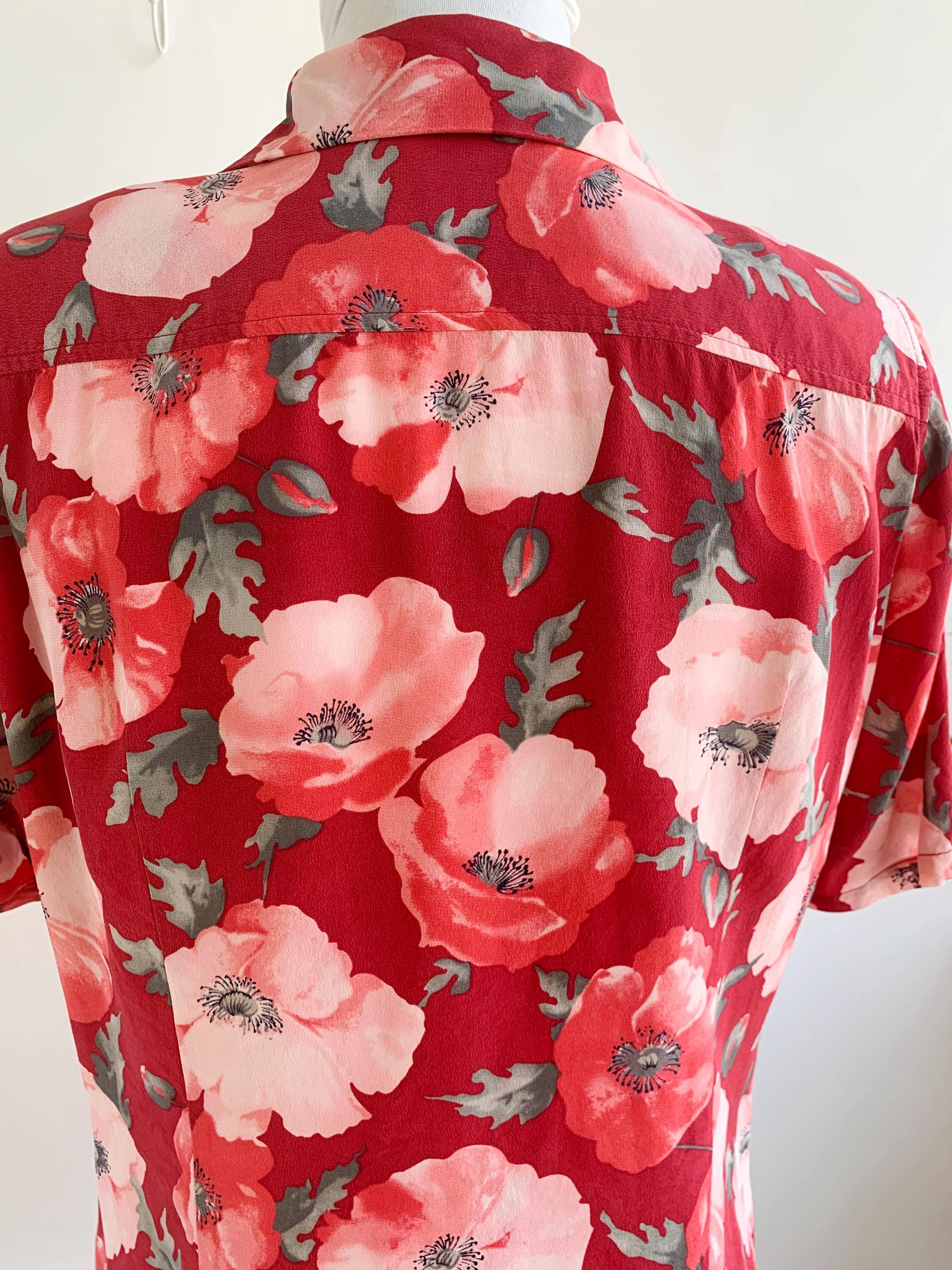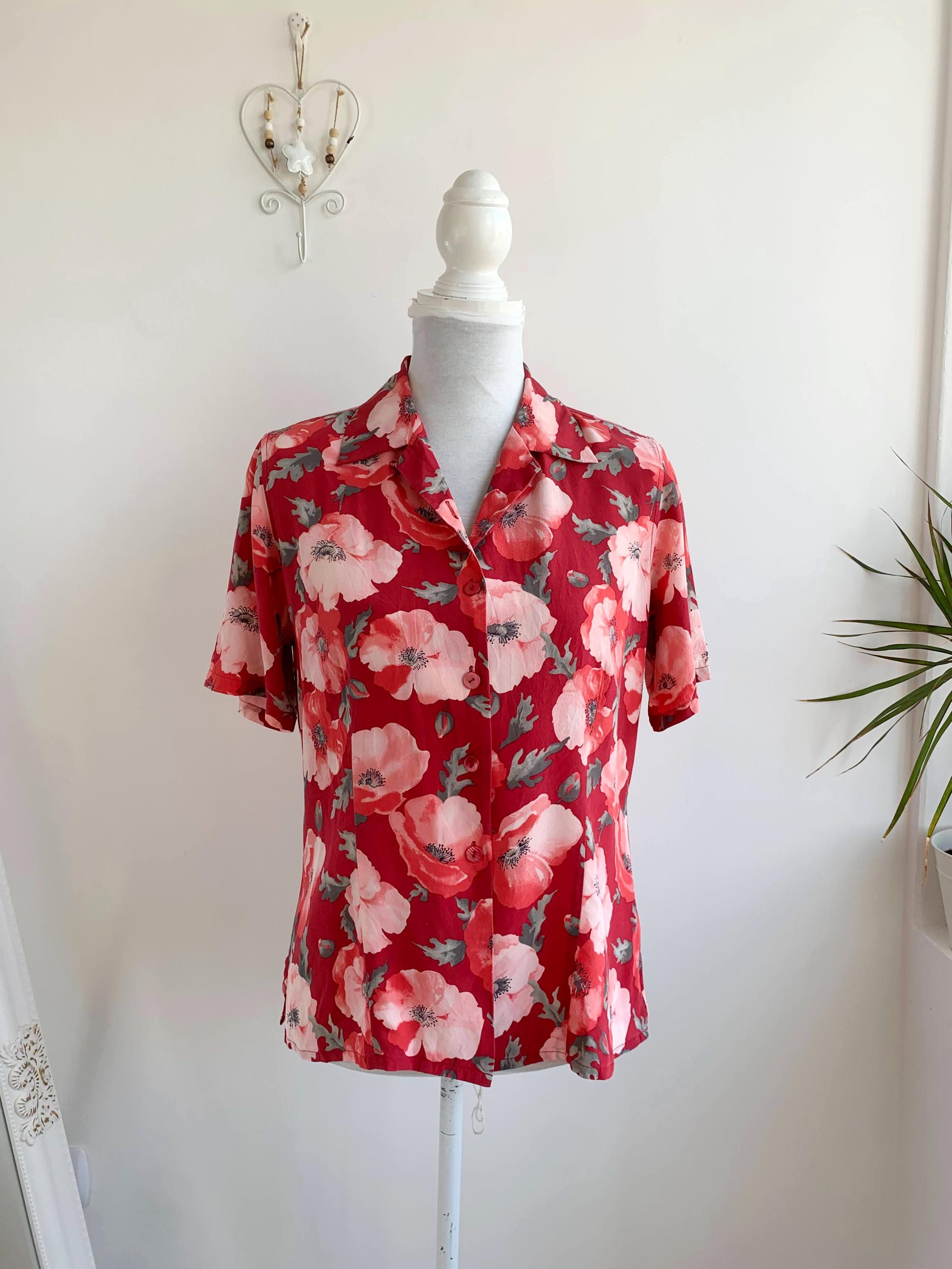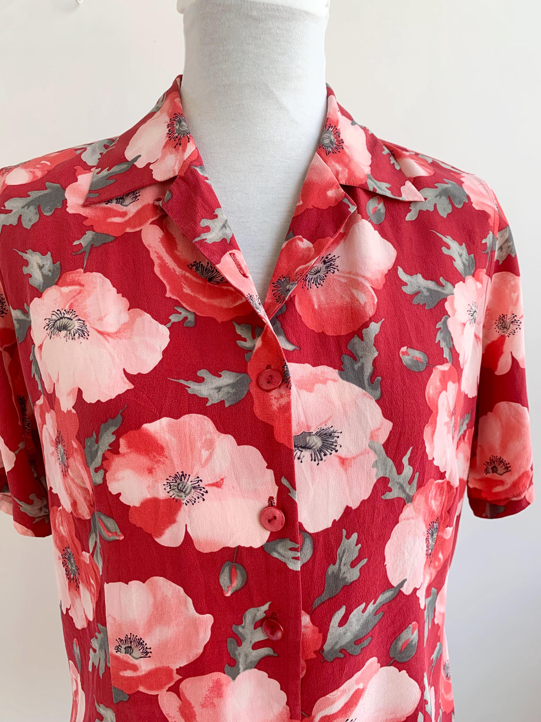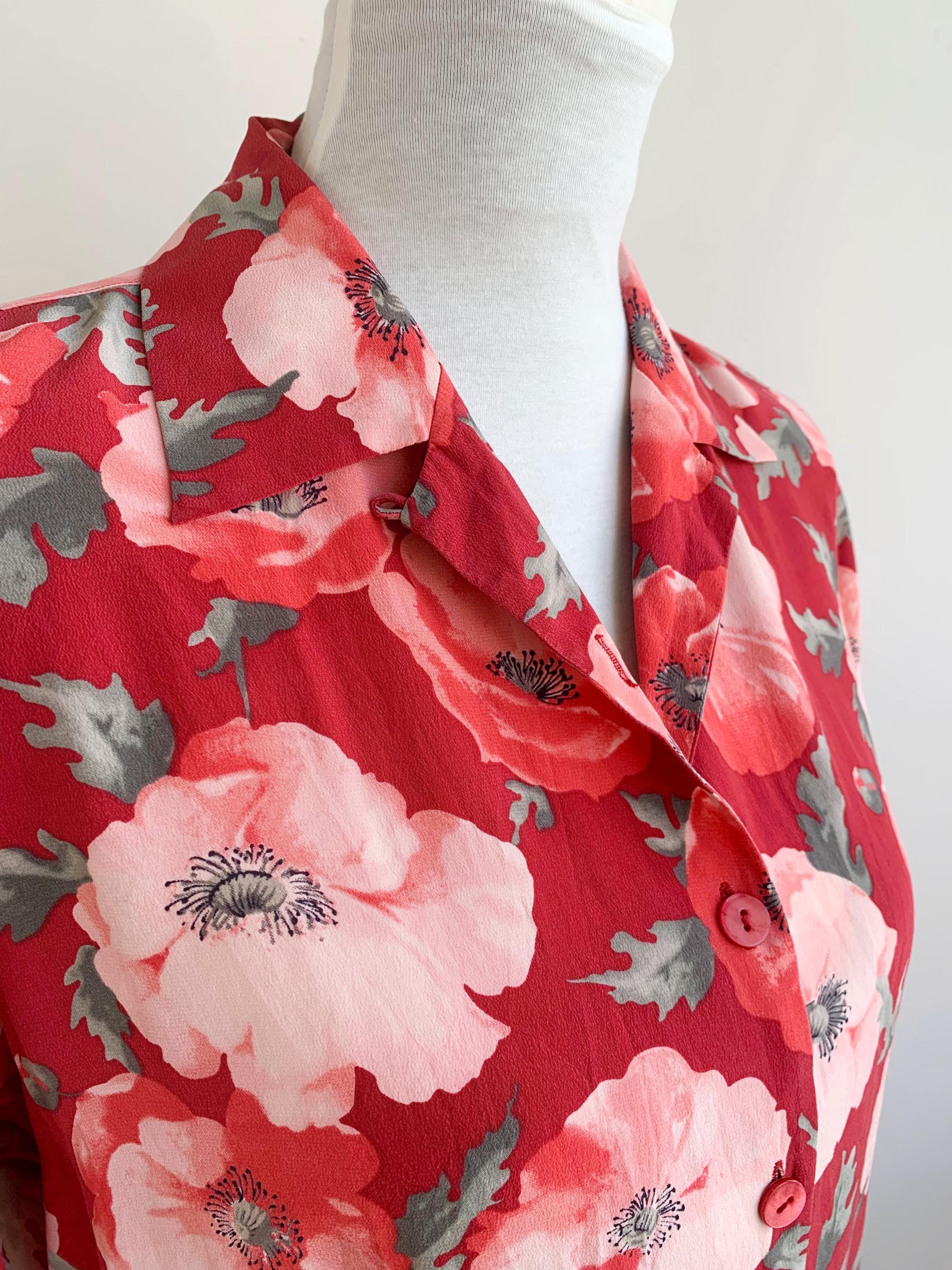 This is an amazing vintage 90s BLUNAURA pure silk blouse for women in size S, made of 100% natural silk fabric. This vintage putton up shirt has gorgeous poppy floeer print in shades of muted red, salmon pink and sage green. This cute vintage shirt has button front closure and strylish collar. This retro collared top is perfect for the office for the spring and summer season