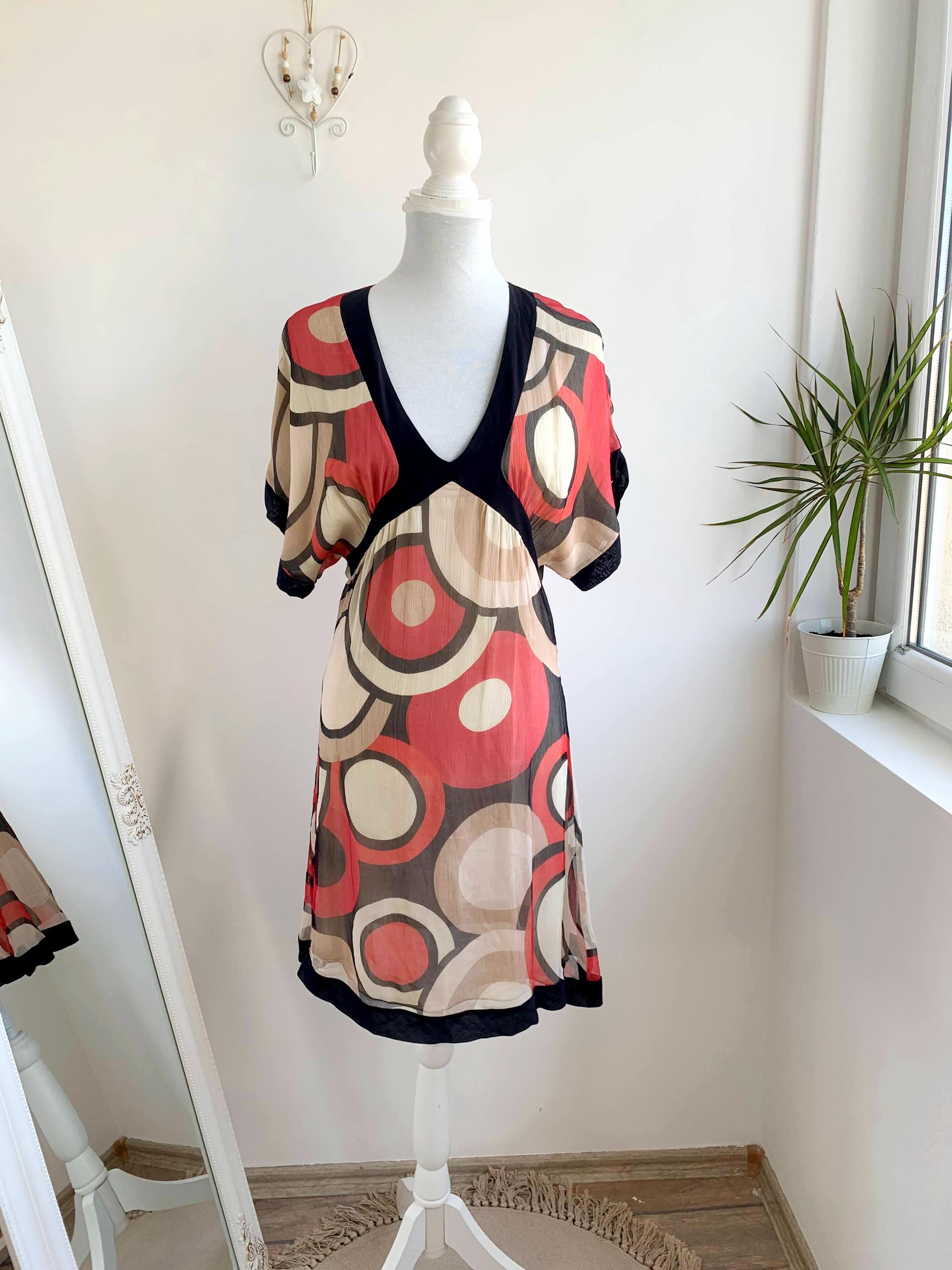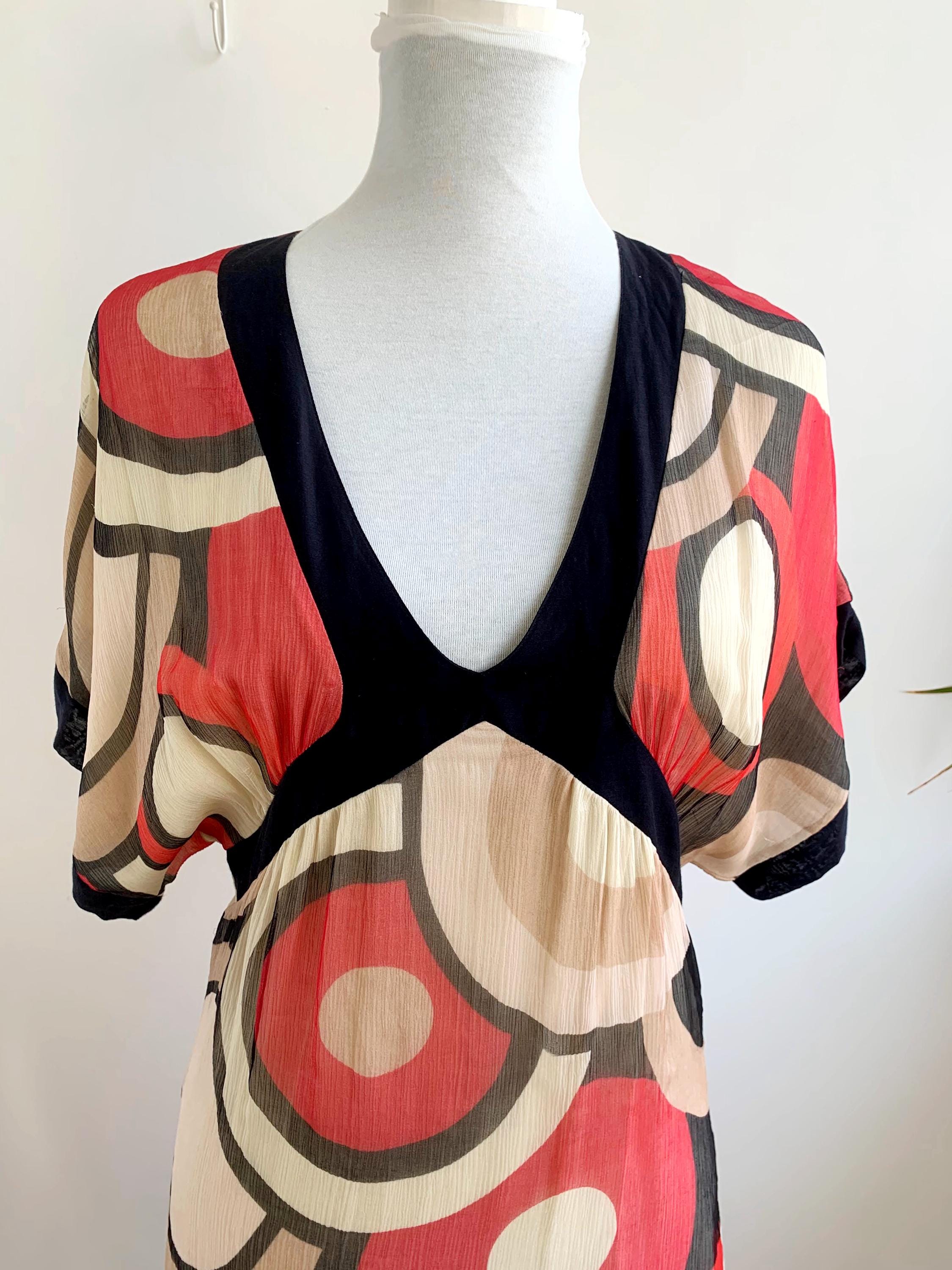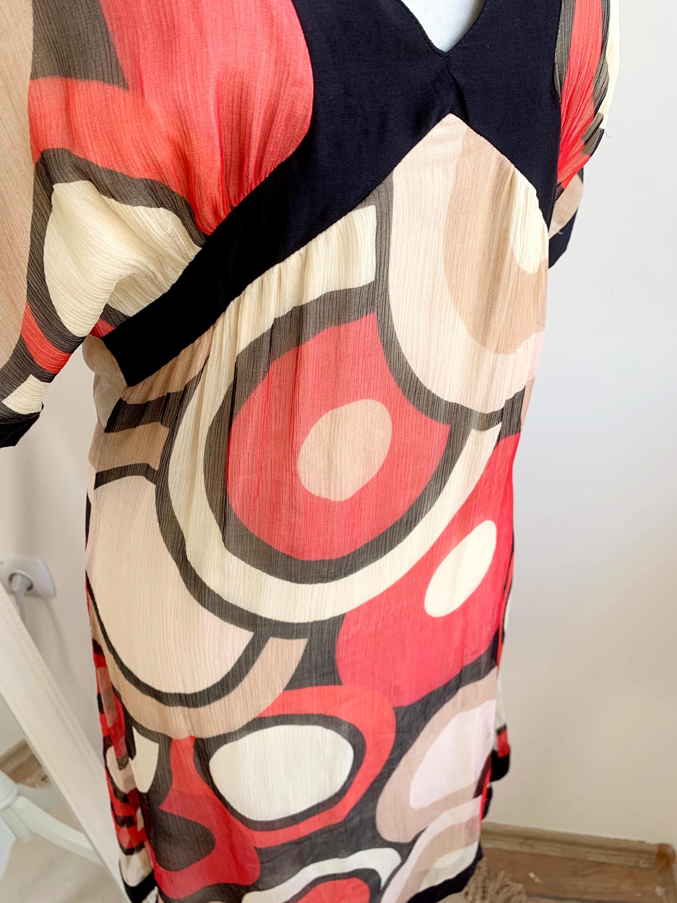 This is a beautiful vintage 90s Italian cotton silk dress by Patrizia Pepe, made of silk and cotton blend fabric in size S. This vintage sheer dress has deep V neck and short kimono sleeves. This A line tranparent dress has light lining underneath. This novelty print see through dress has pretty circle geometric print in shades of beige, red and black.