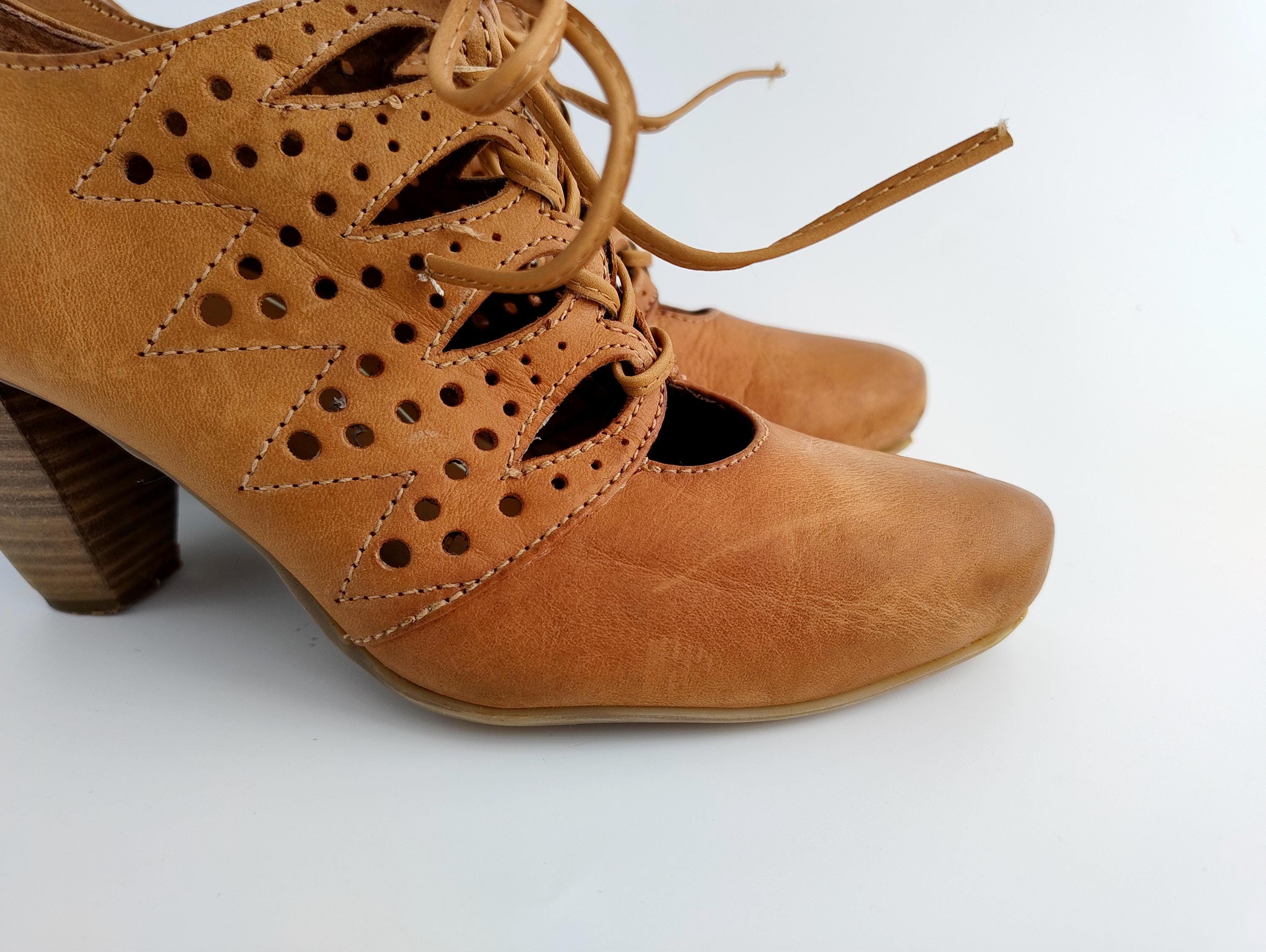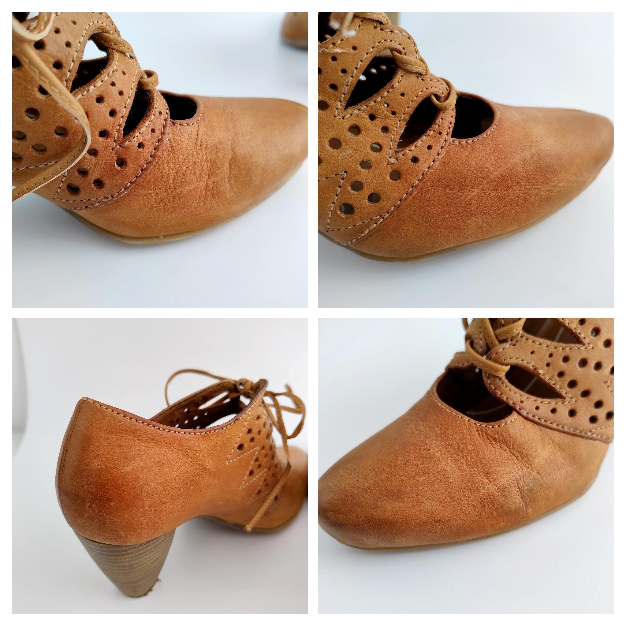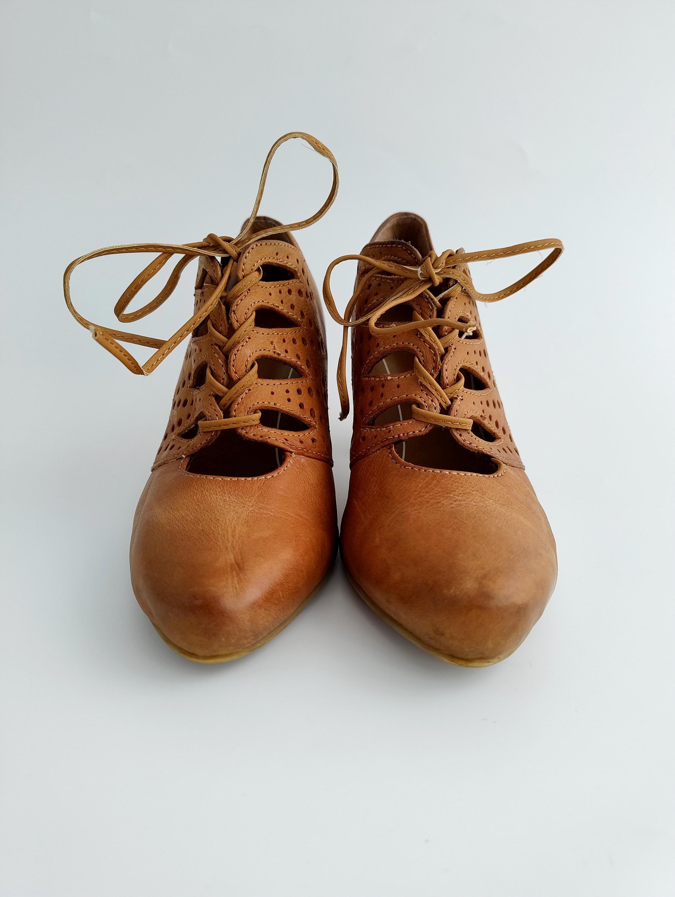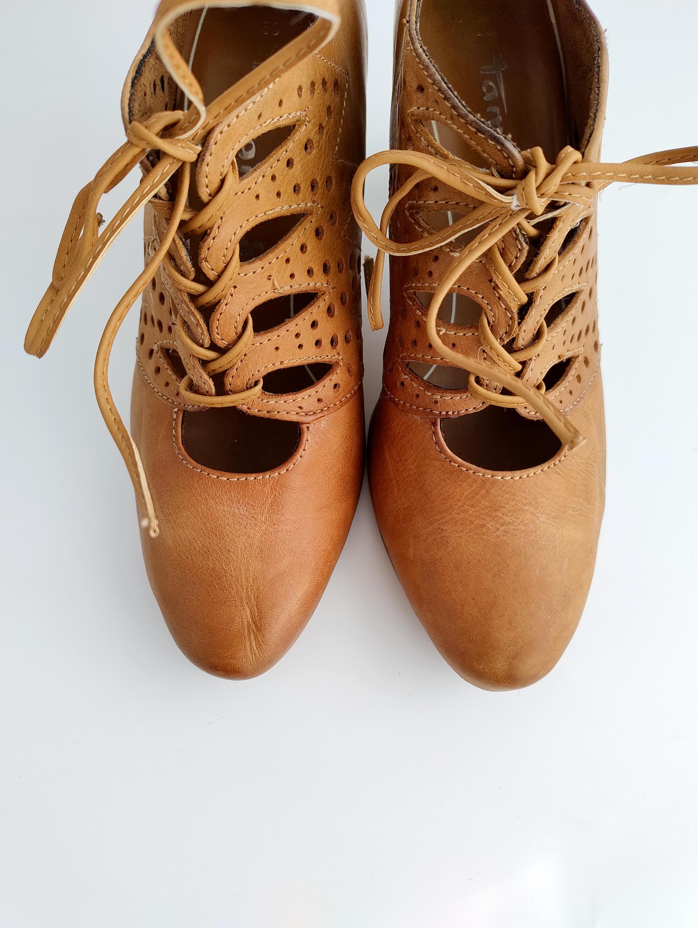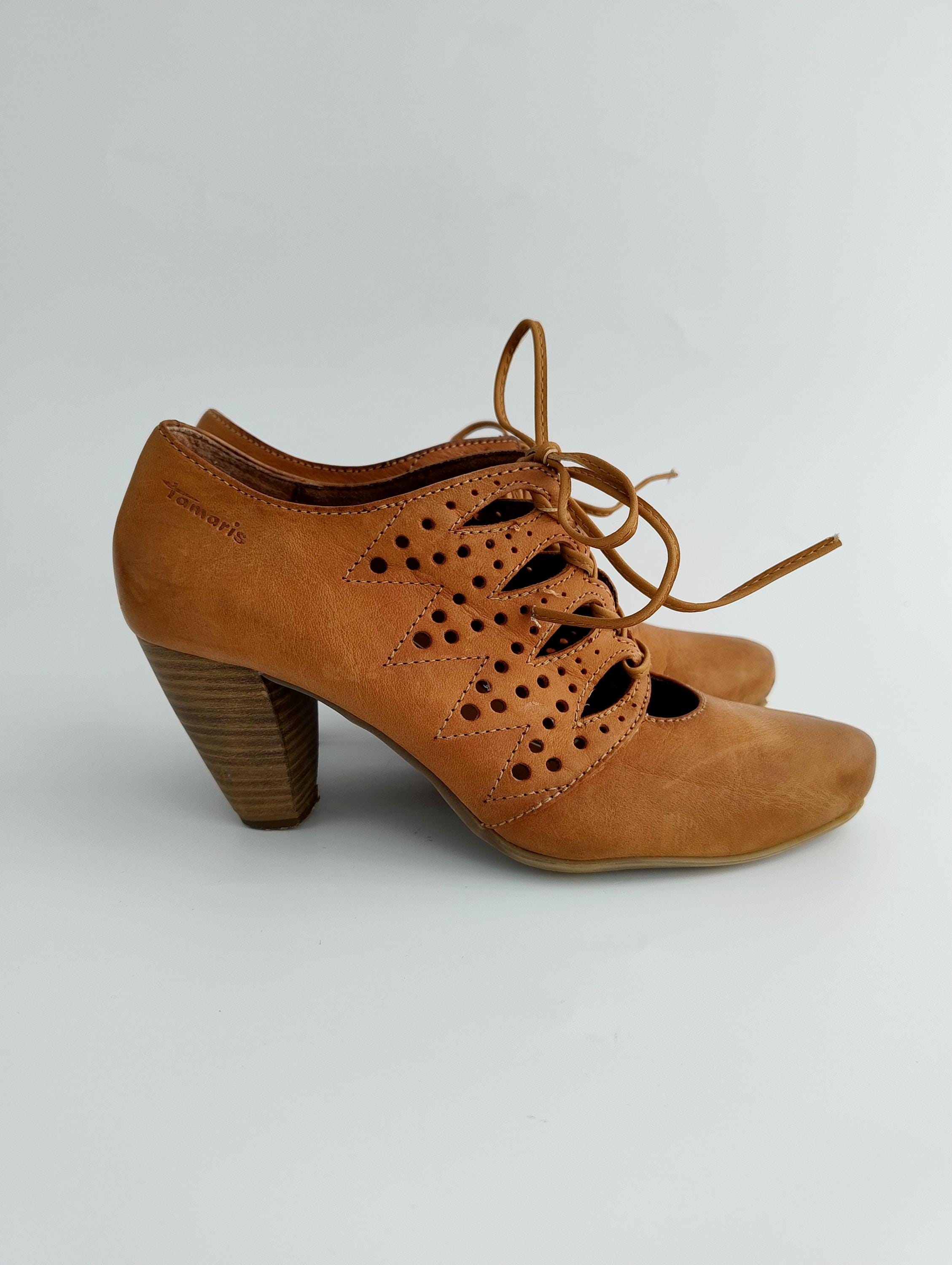 These are vintage Y2K Lace Up Pumps by the brand Tamaris. These camel brown high heel pumps are made of genuine leather in camel brown color. These hollow out shoes have stack kitten heels and pointy toes. Perfect retro style tie up mary janes for your 40s style outfit. These high heel leather oxford shoes are made of all leather in and out with rubber soles and leather ties.