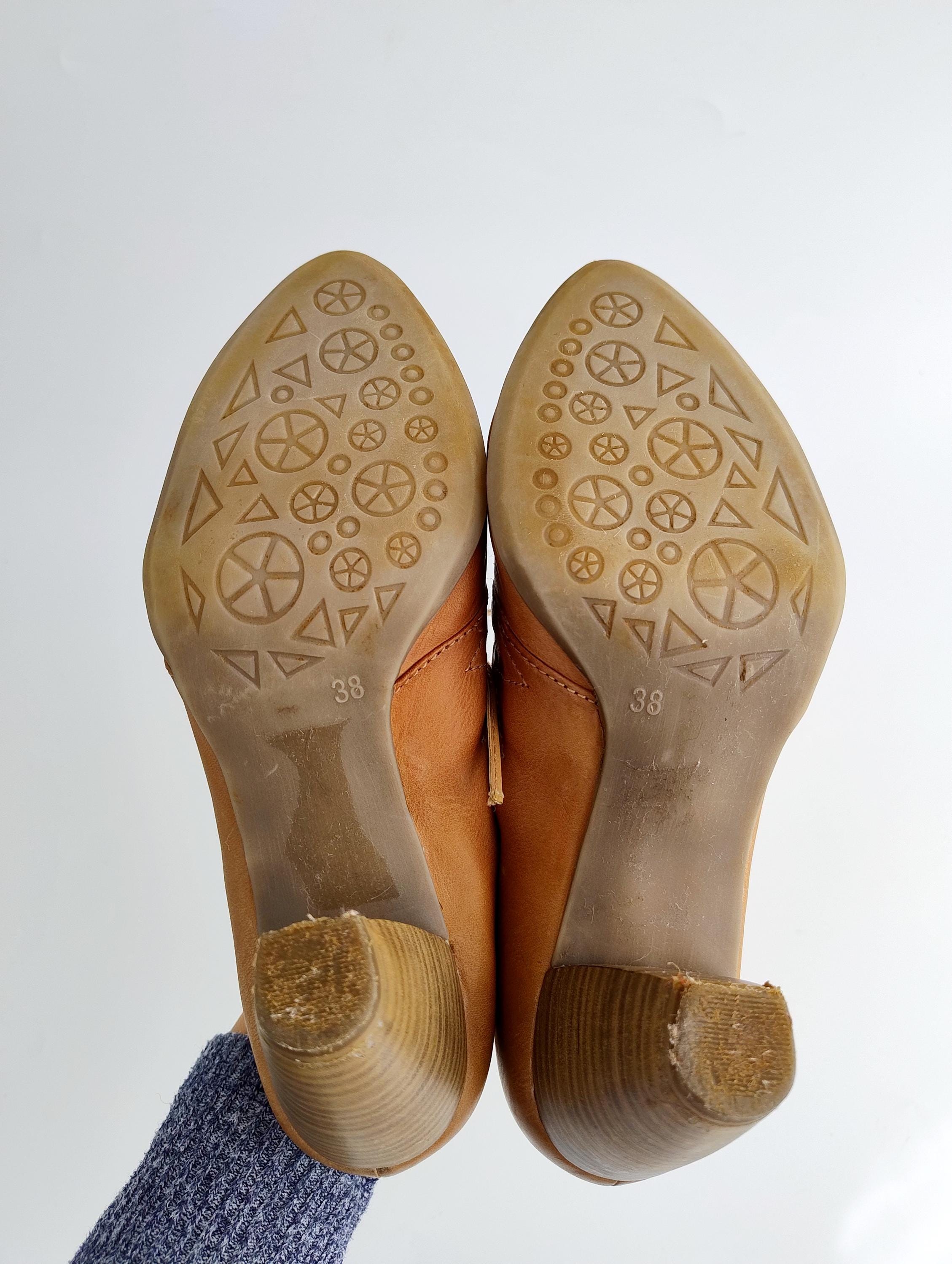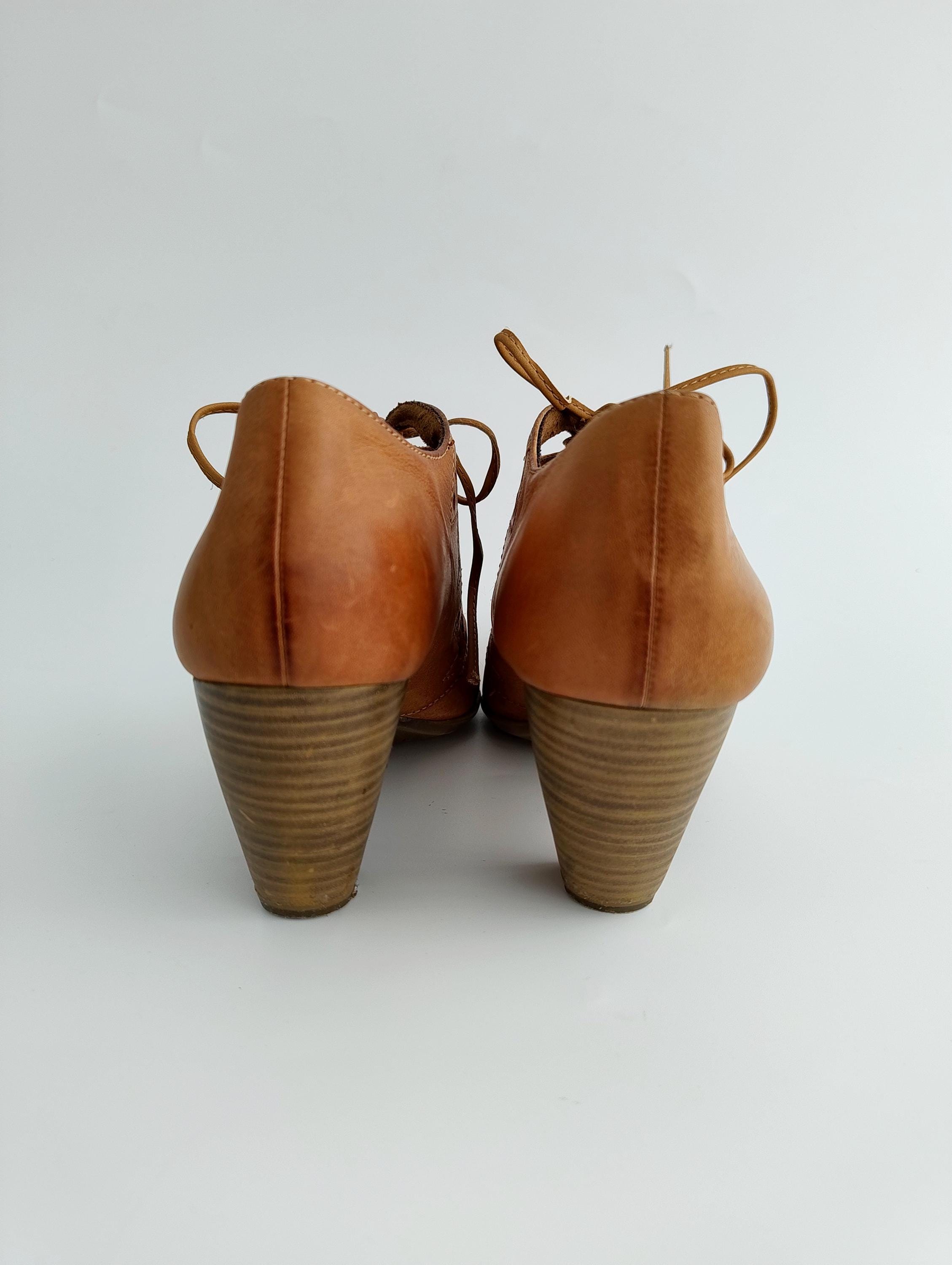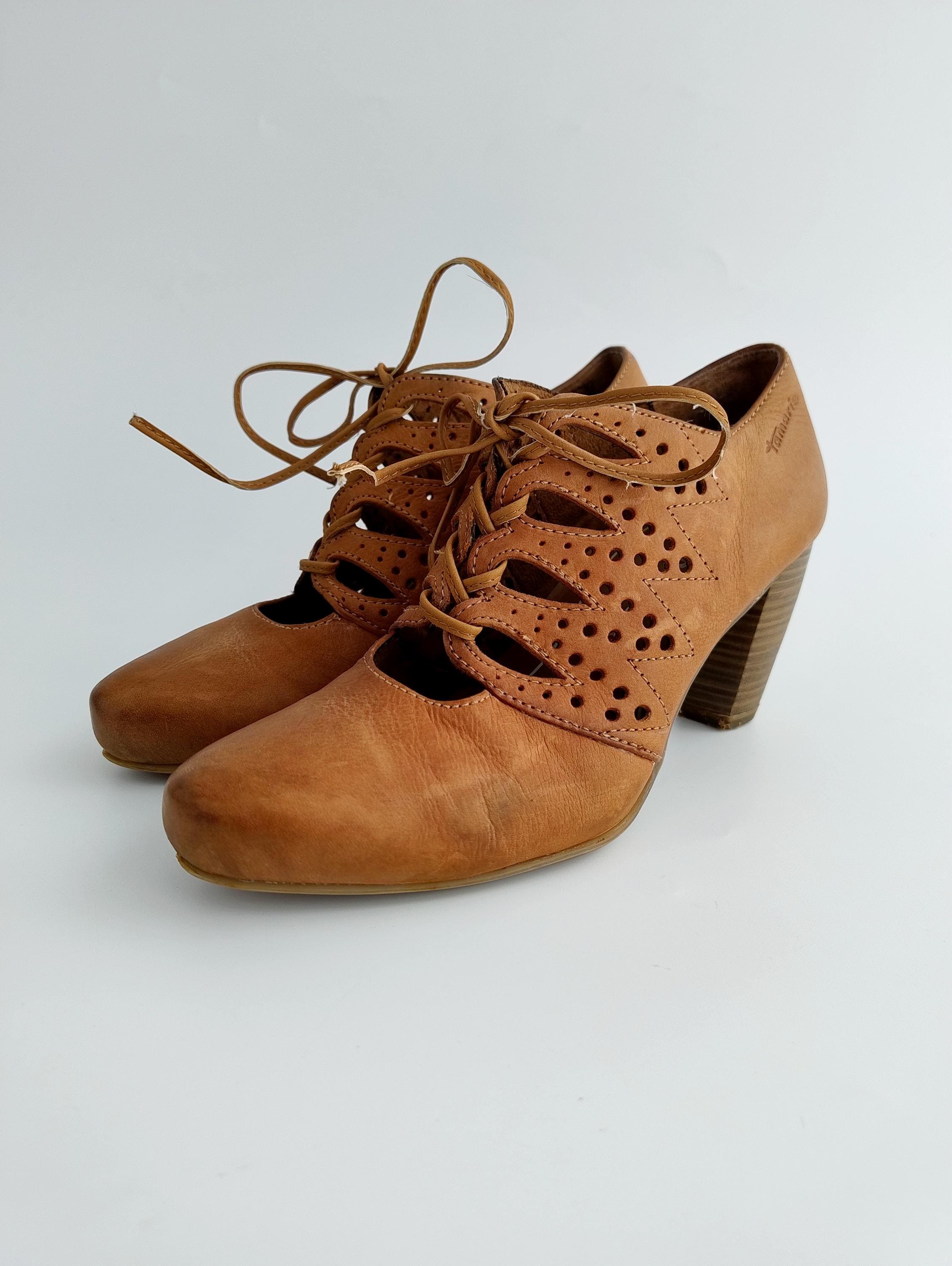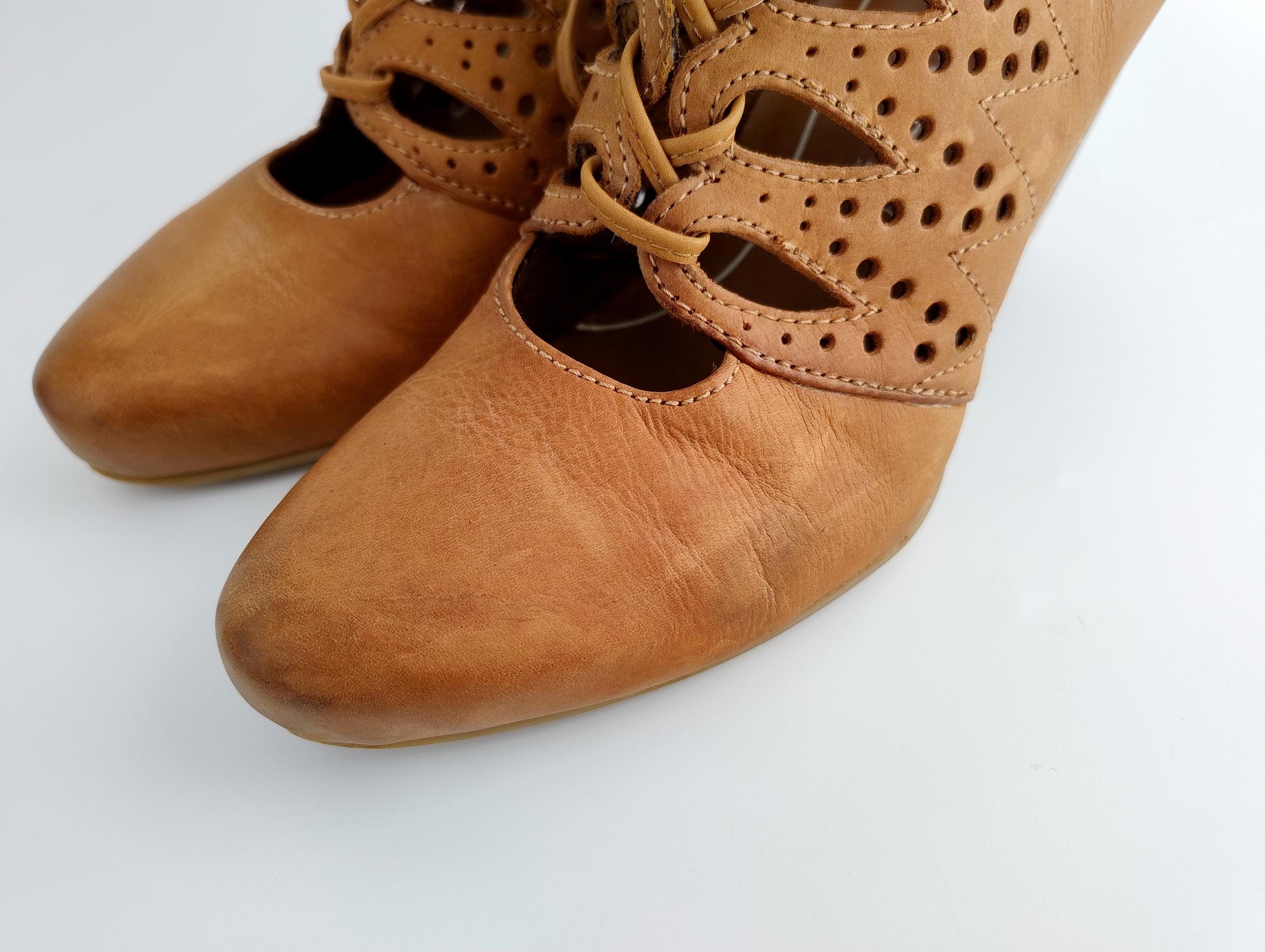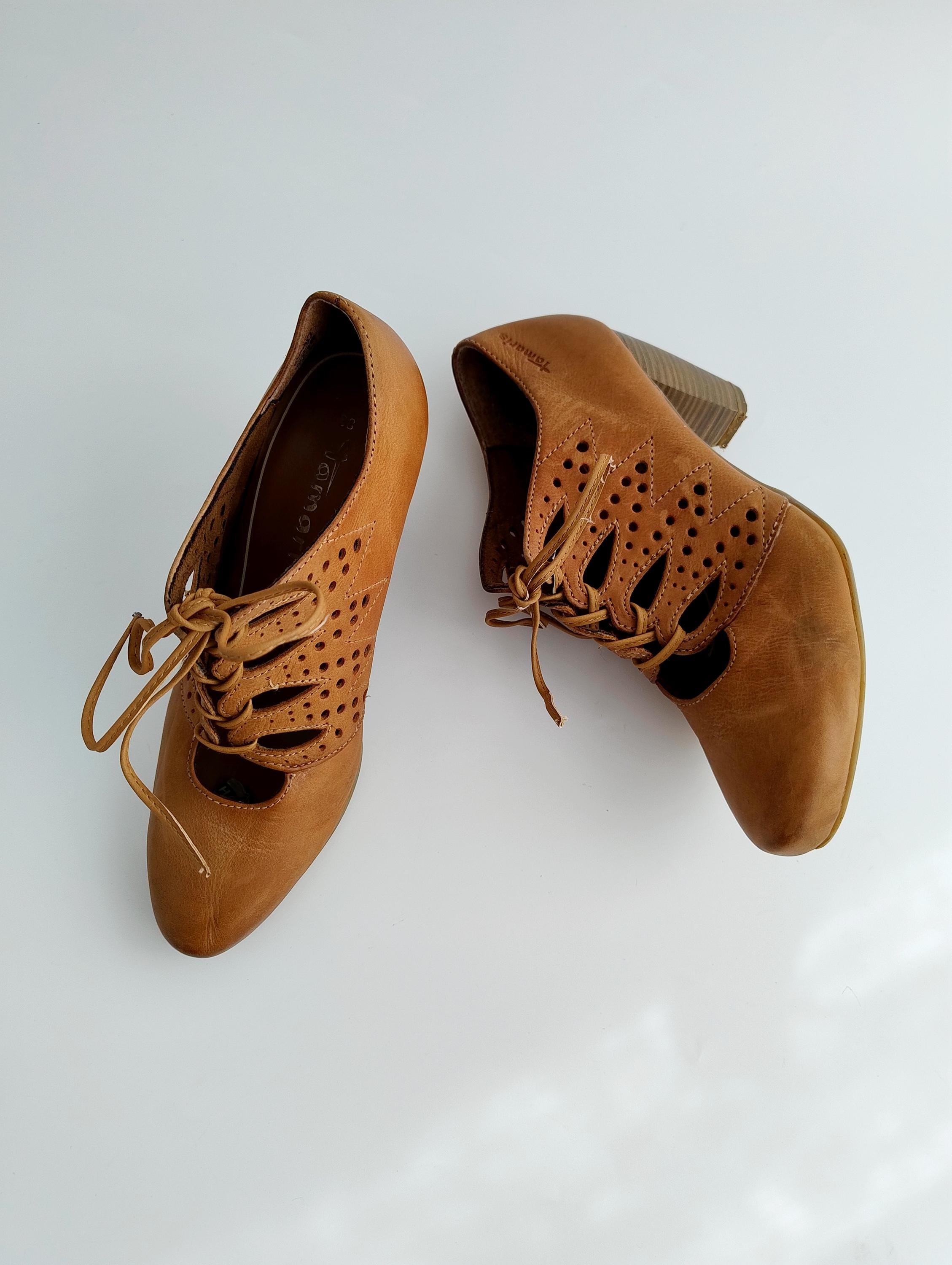 These are vintage Y2K Lace Up Pumps by the brand Tamaris. These camel brown high heel pumps are made of genuine leather in camel brown color. These hollow out shoes have stack kitten heels and pointy toes. Perfect retro style tie up mary janes for your 40s style outfit. These high heel leather oxford shoes are made of all leather in and out with rubber soles and leather ties.