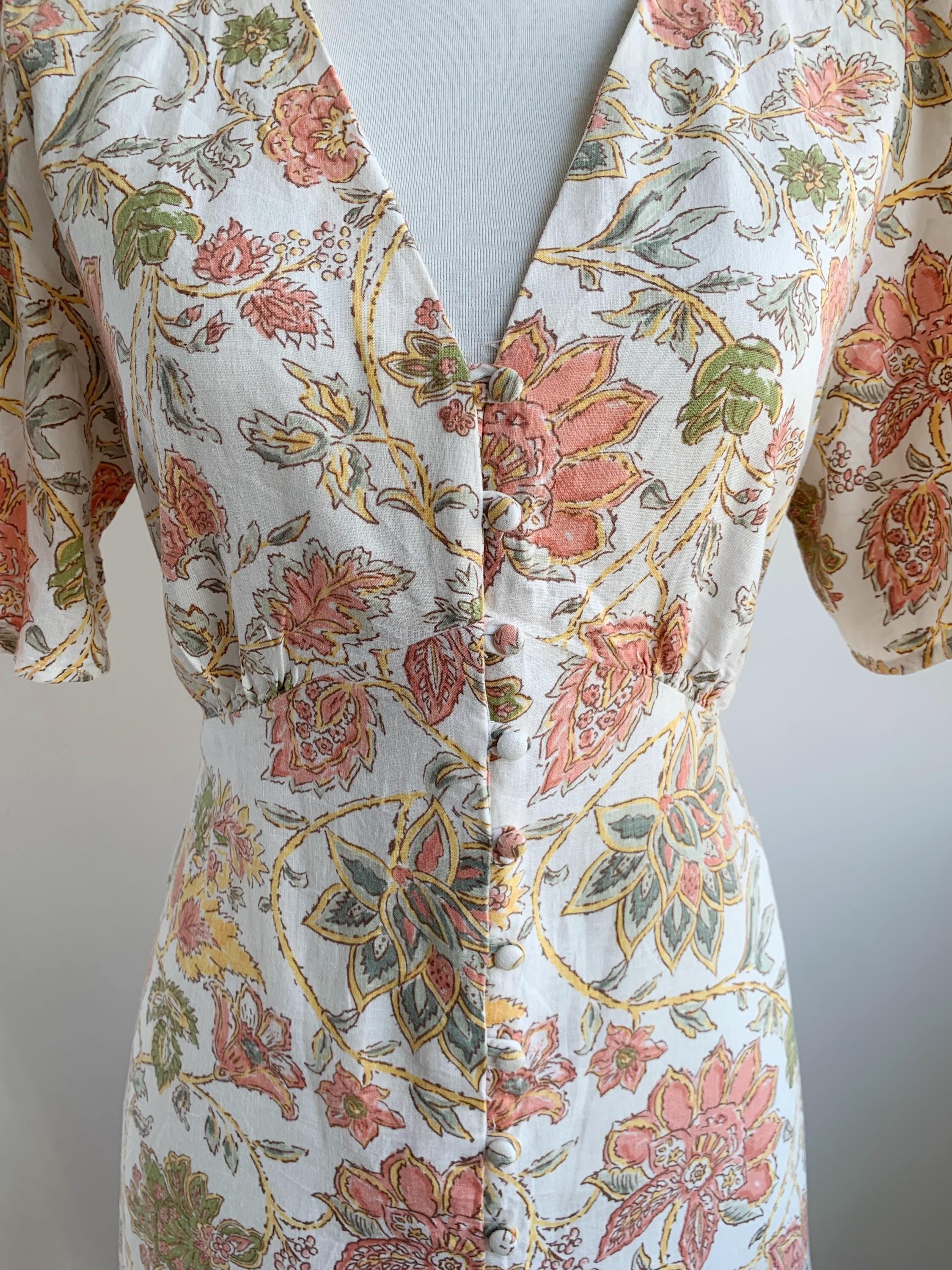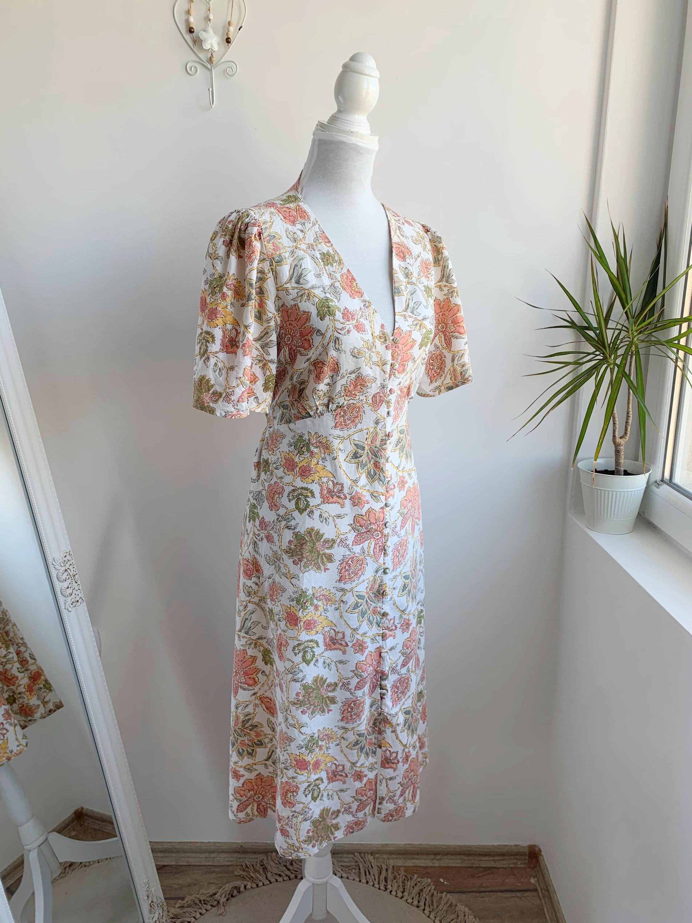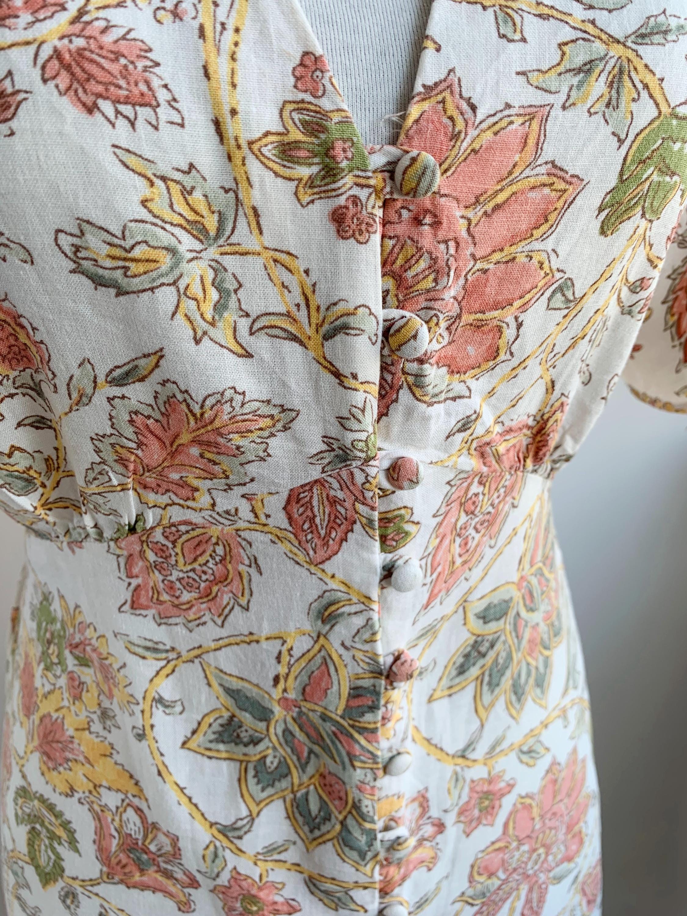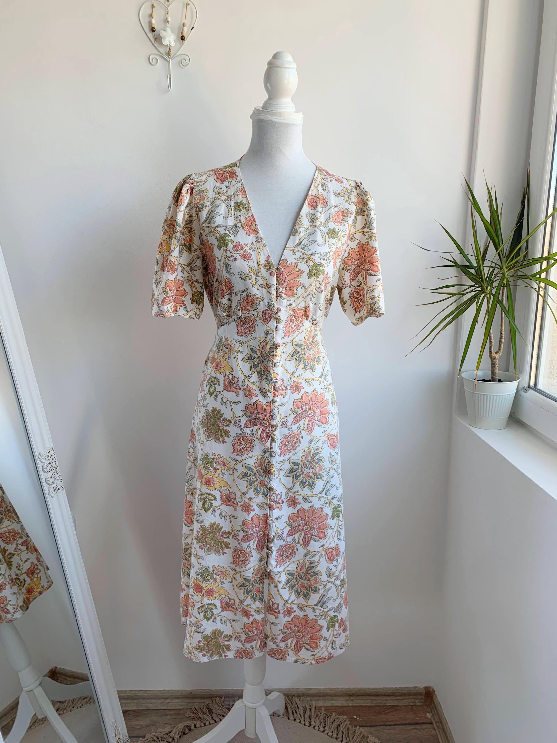 This is a wonderful pre-loved vintage 90s midi dress made of soft cotton linen fabric. This cottagecore dress is in beautiful off white color with lovely soft peach floral print with sage green leaves. This summer cotton linen dress has a fit and flare silhouette and ties at the back cinch up your waist. This 90s grunge dress has a V neck, button front closure and short sleeves. There is no size marked, as there are no tags or labels, it fits like size M. Please check the measurements below.