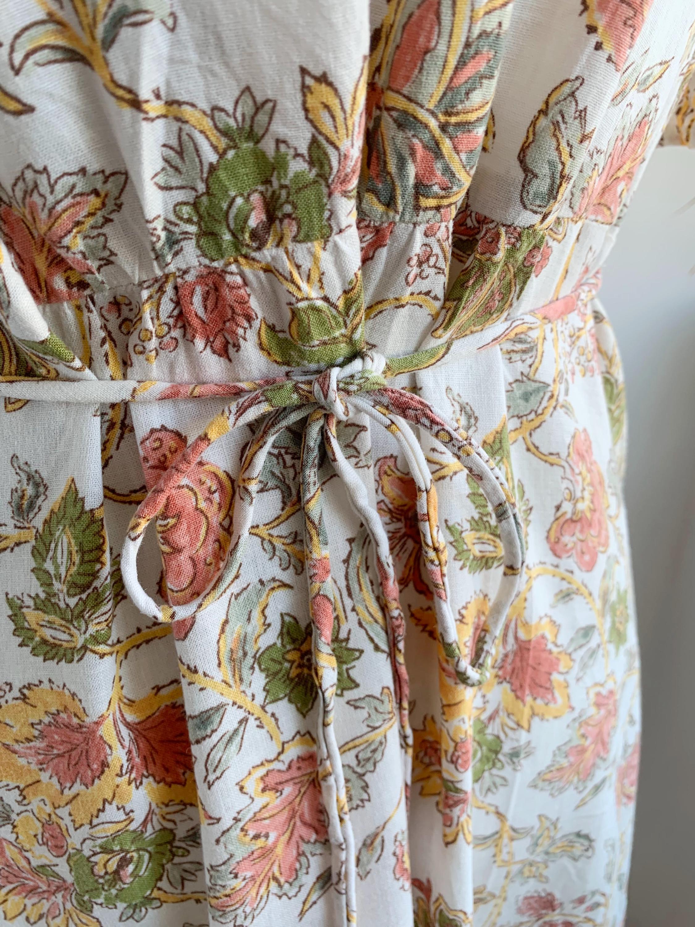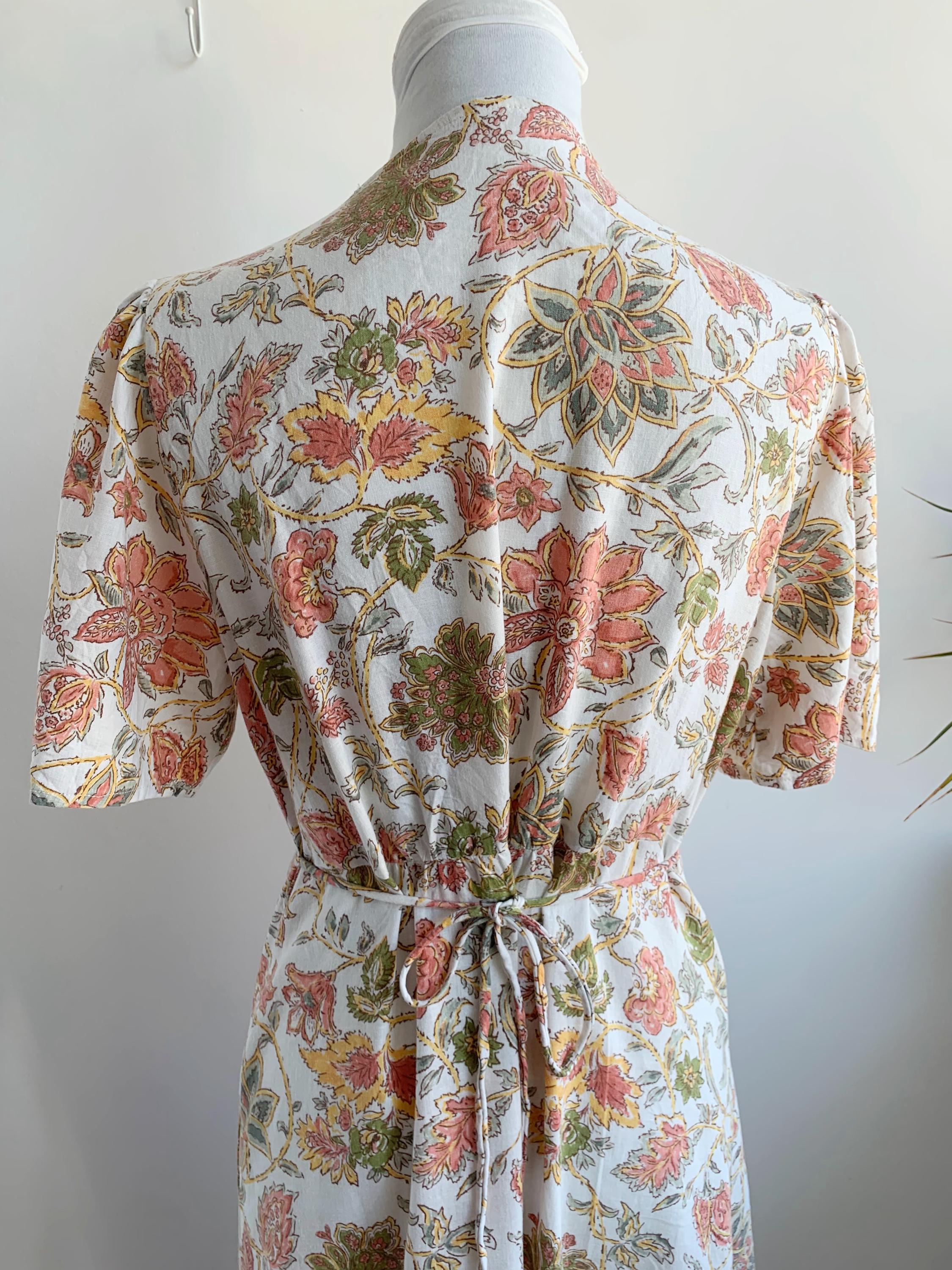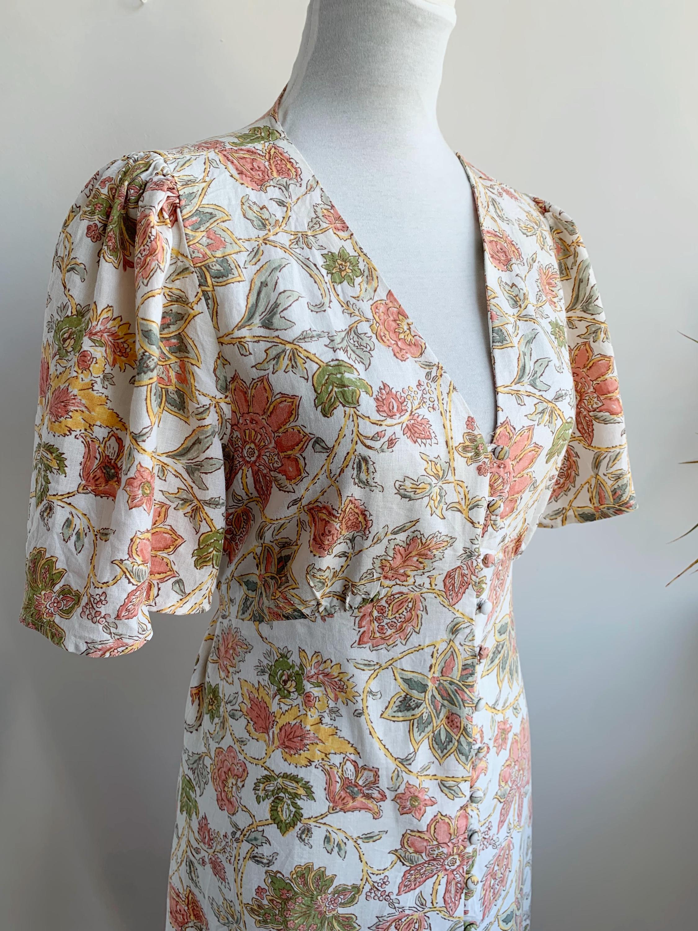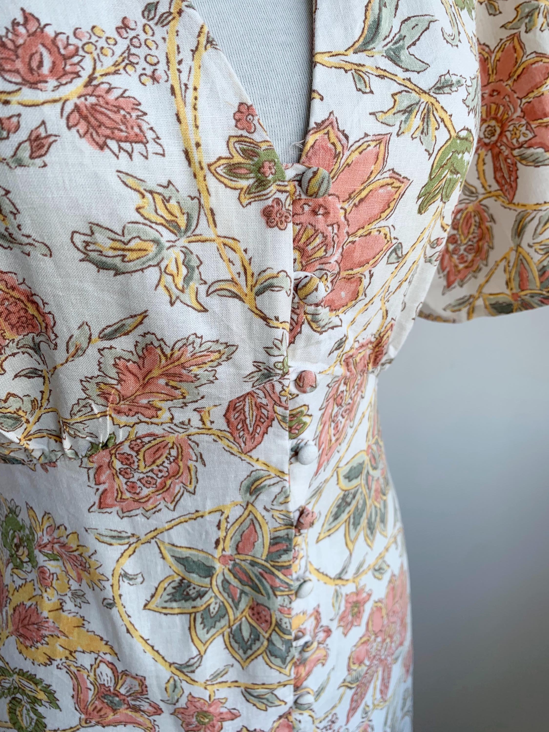 This is a wonderful pre-loved vintage 90s midi dress made of soft cotton linen fabric. This cottagecore dress is in beautiful off white color with lovely soft peach floral print with sage green leaves. This summer cotton linen dress has a fit and flare silhouette and ties at the back cinch up your waist. This 90s grunge dress has a V neck, button front closure and short sleeves. There is no size marked, as there are no tags or labels, it fits like size M. Please check the measurements below.