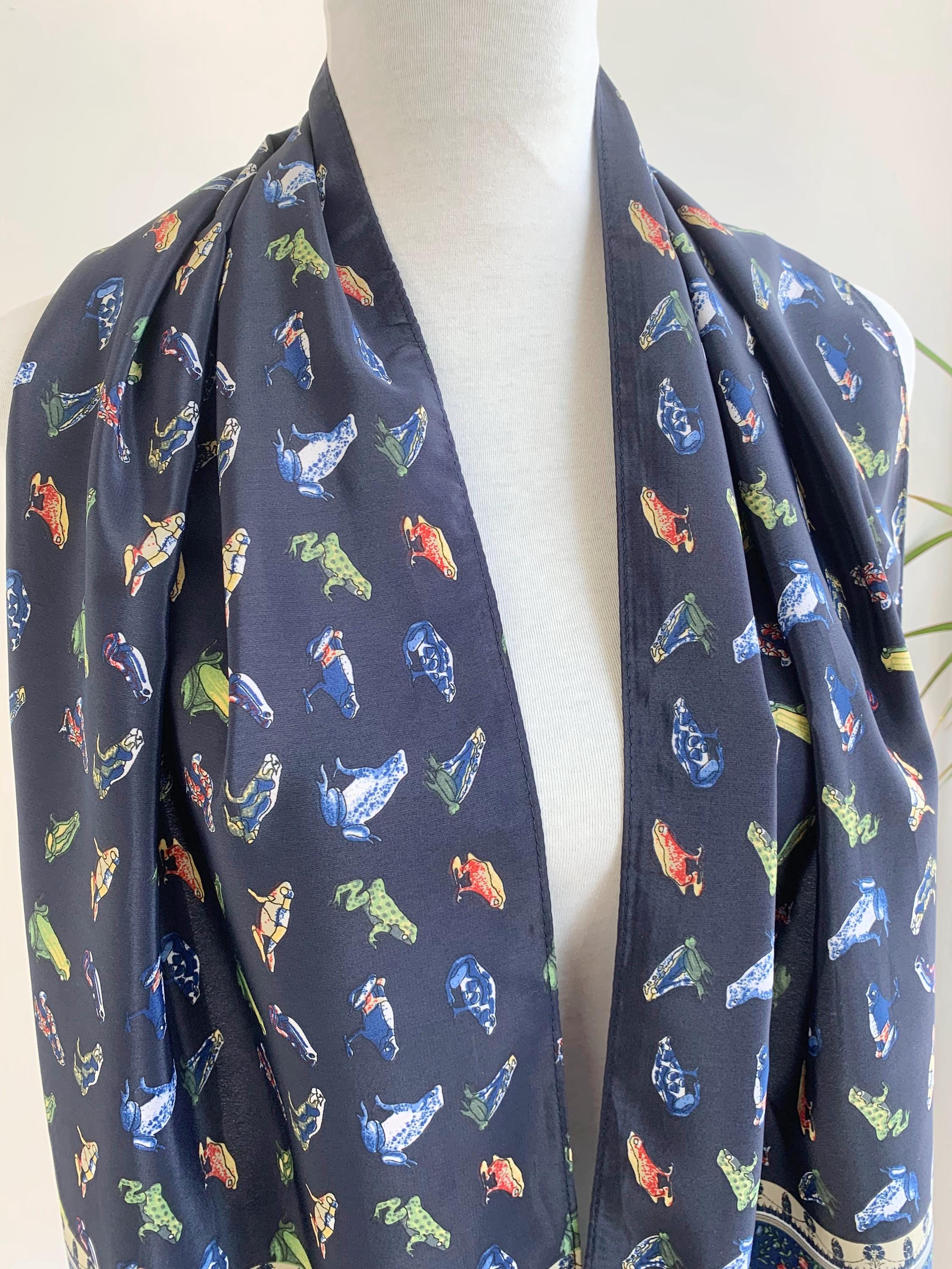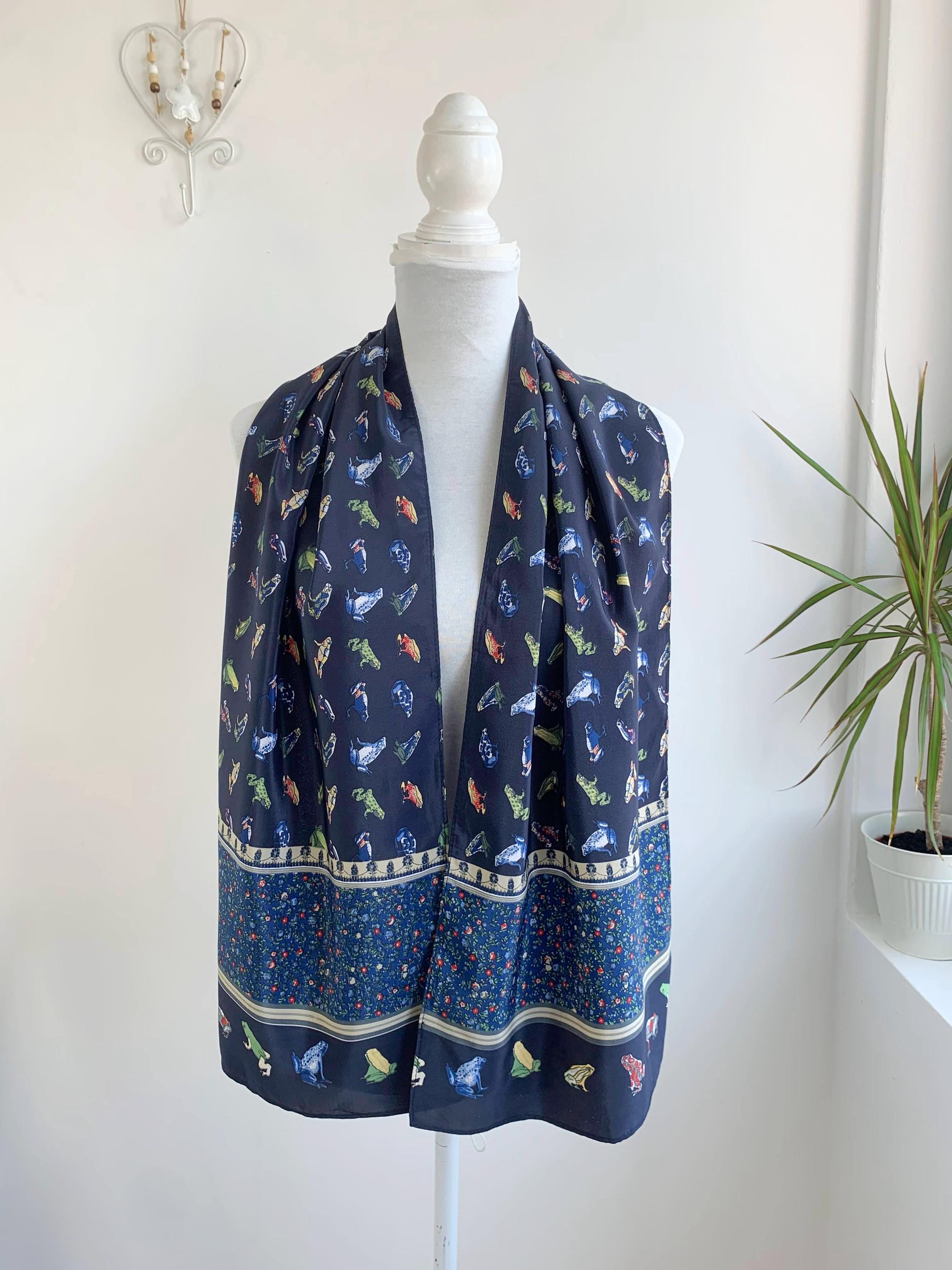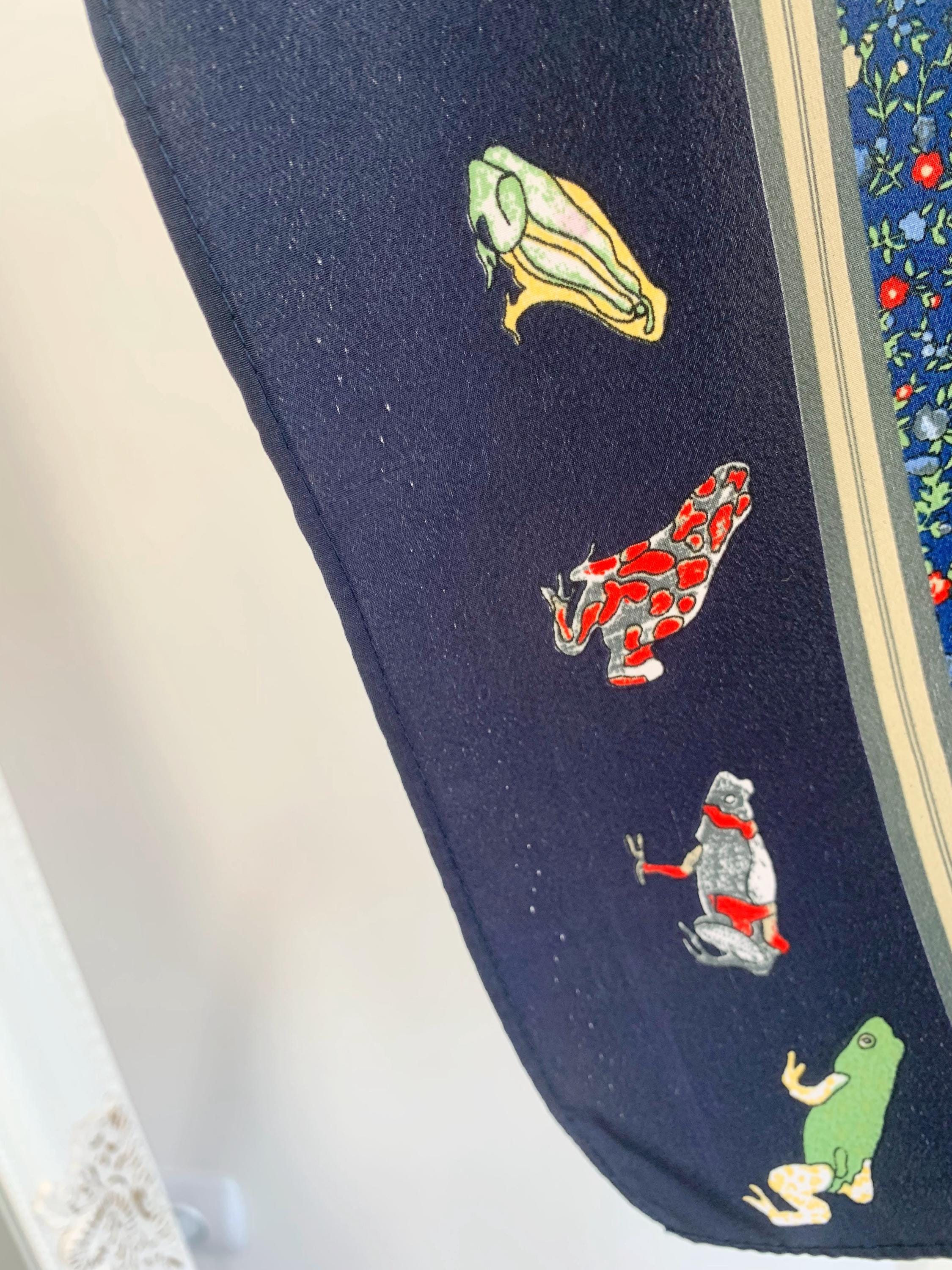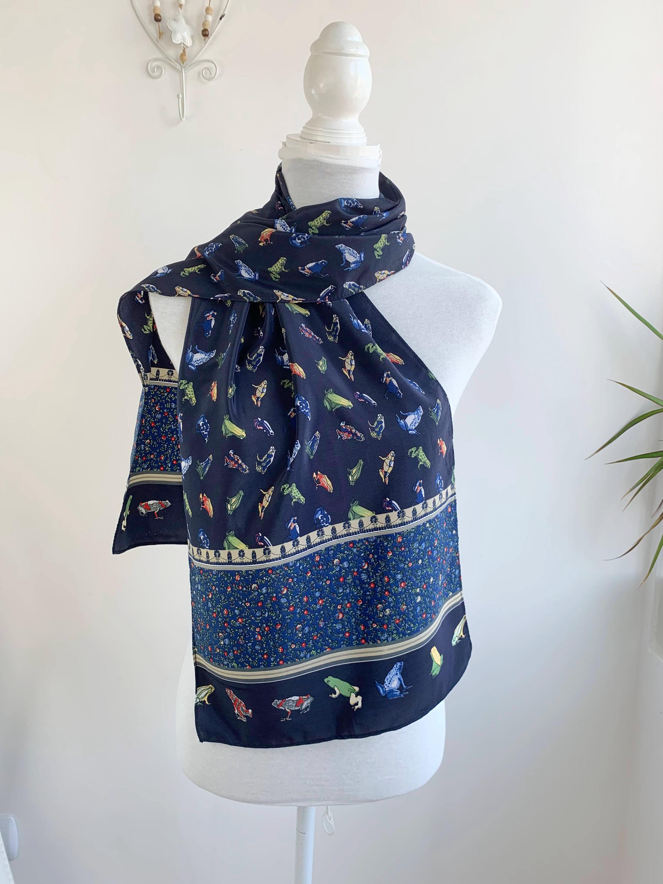Lovely vintage Y2K ore-loved quirky frog print neck scarf, made of 100% polyester. This navy blue frog colorful scarf has an abstract animal print. Great frog lover gift idea.