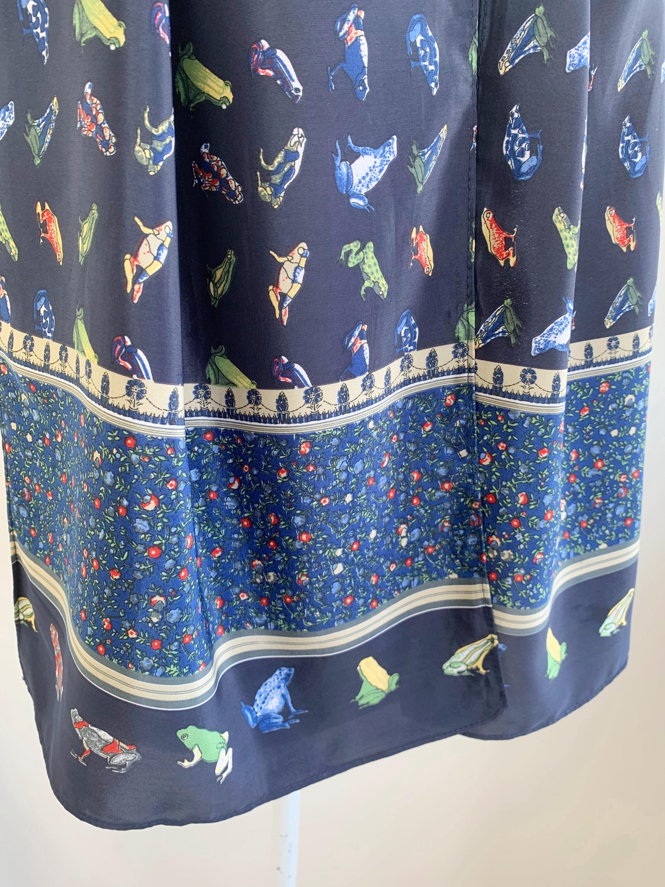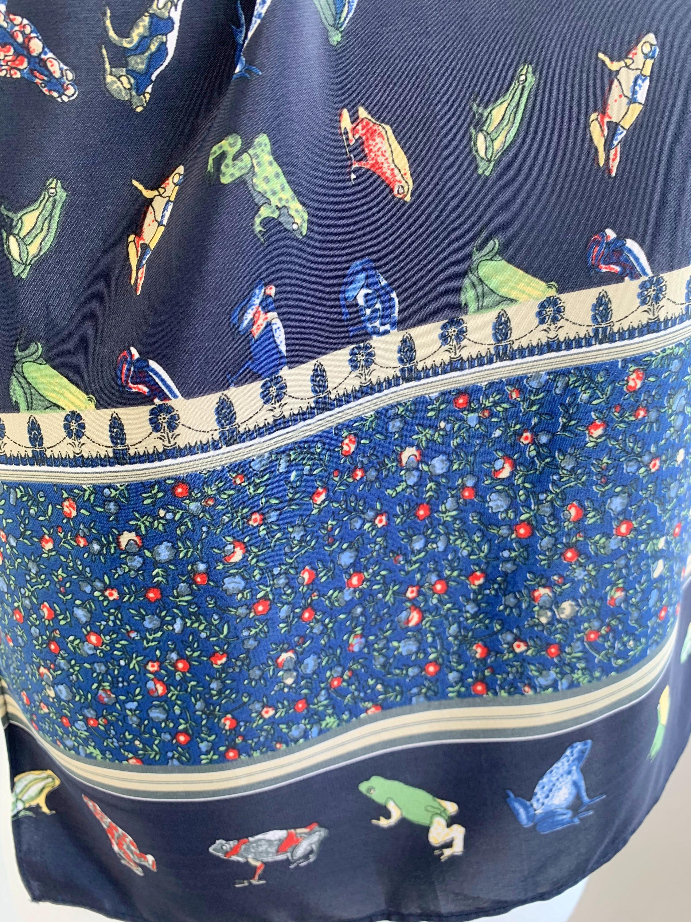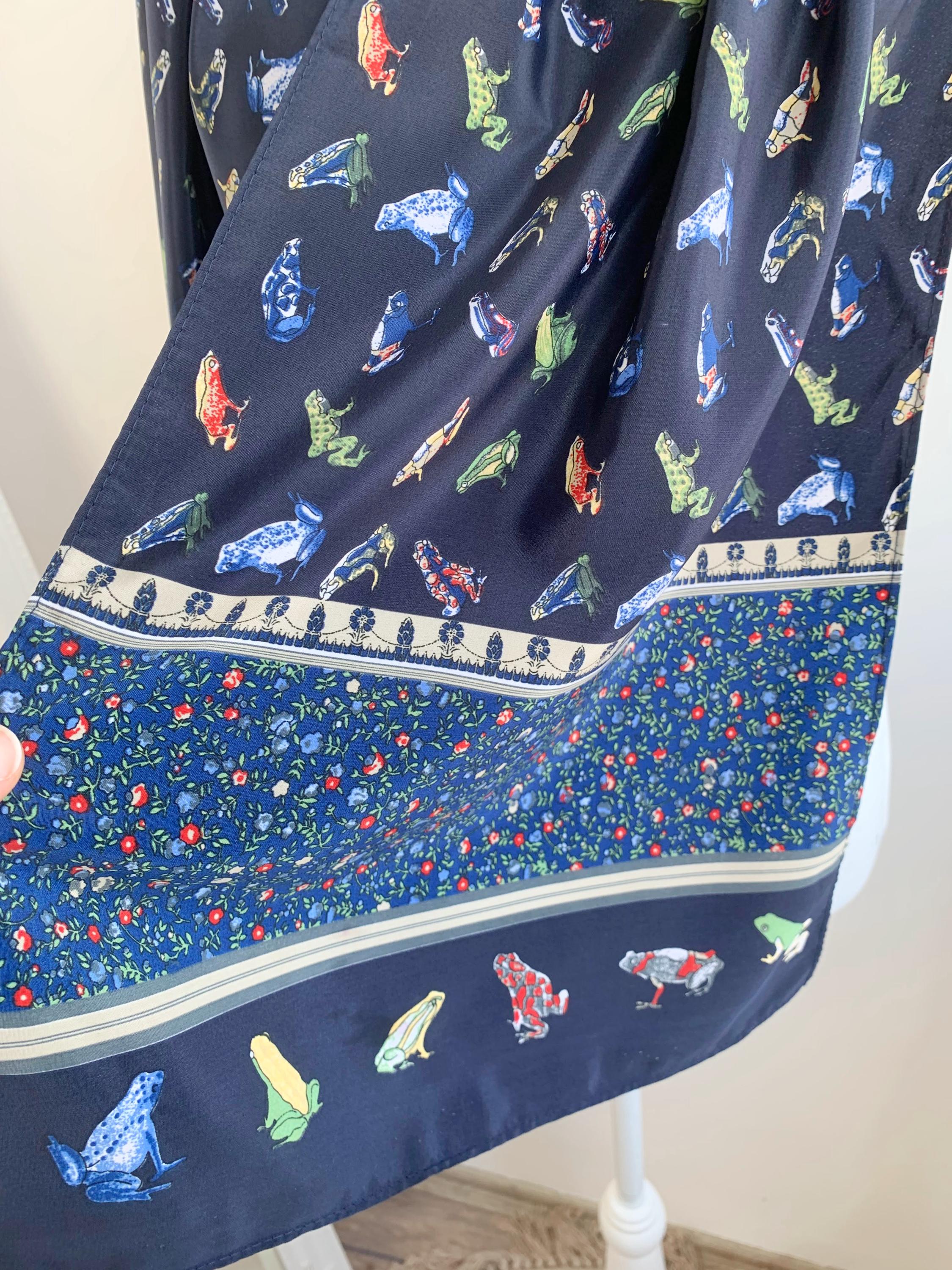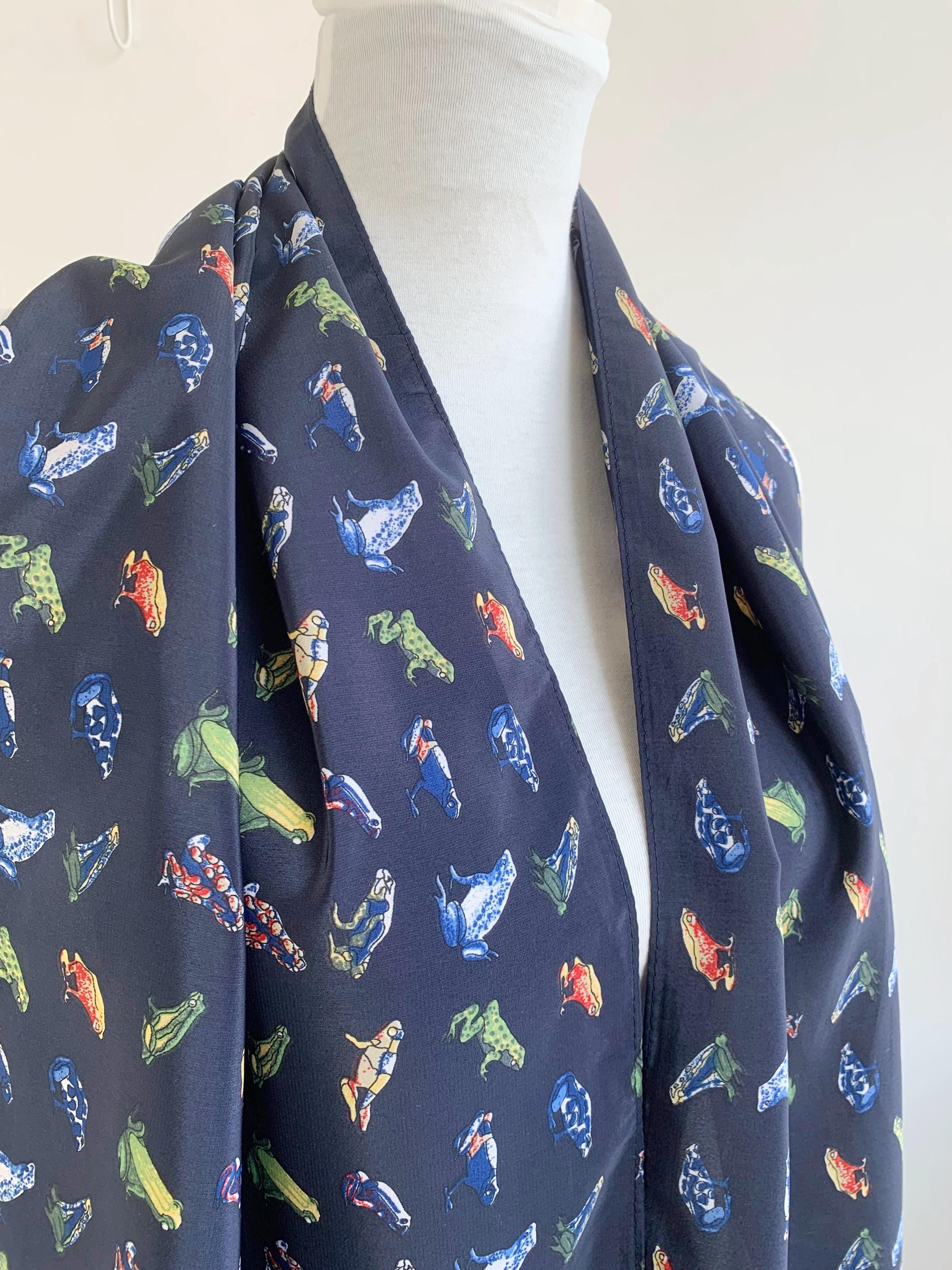 Lovely vintage Y2K ore-loved quirky frog print neck scarf, made of 100% polyester. This navy blue frog colorful scarf has an abstract animal print. Great frog lover gift idea.