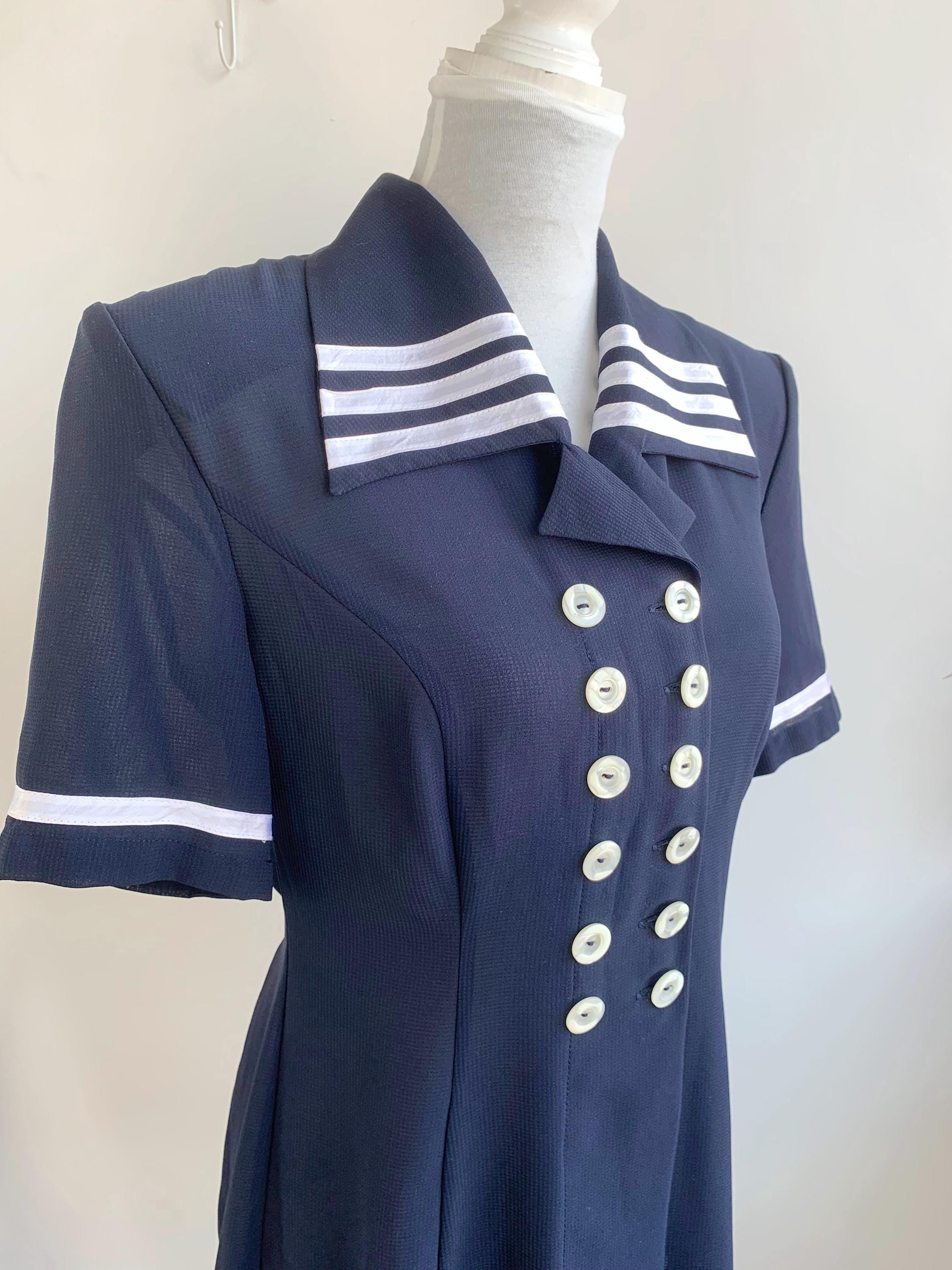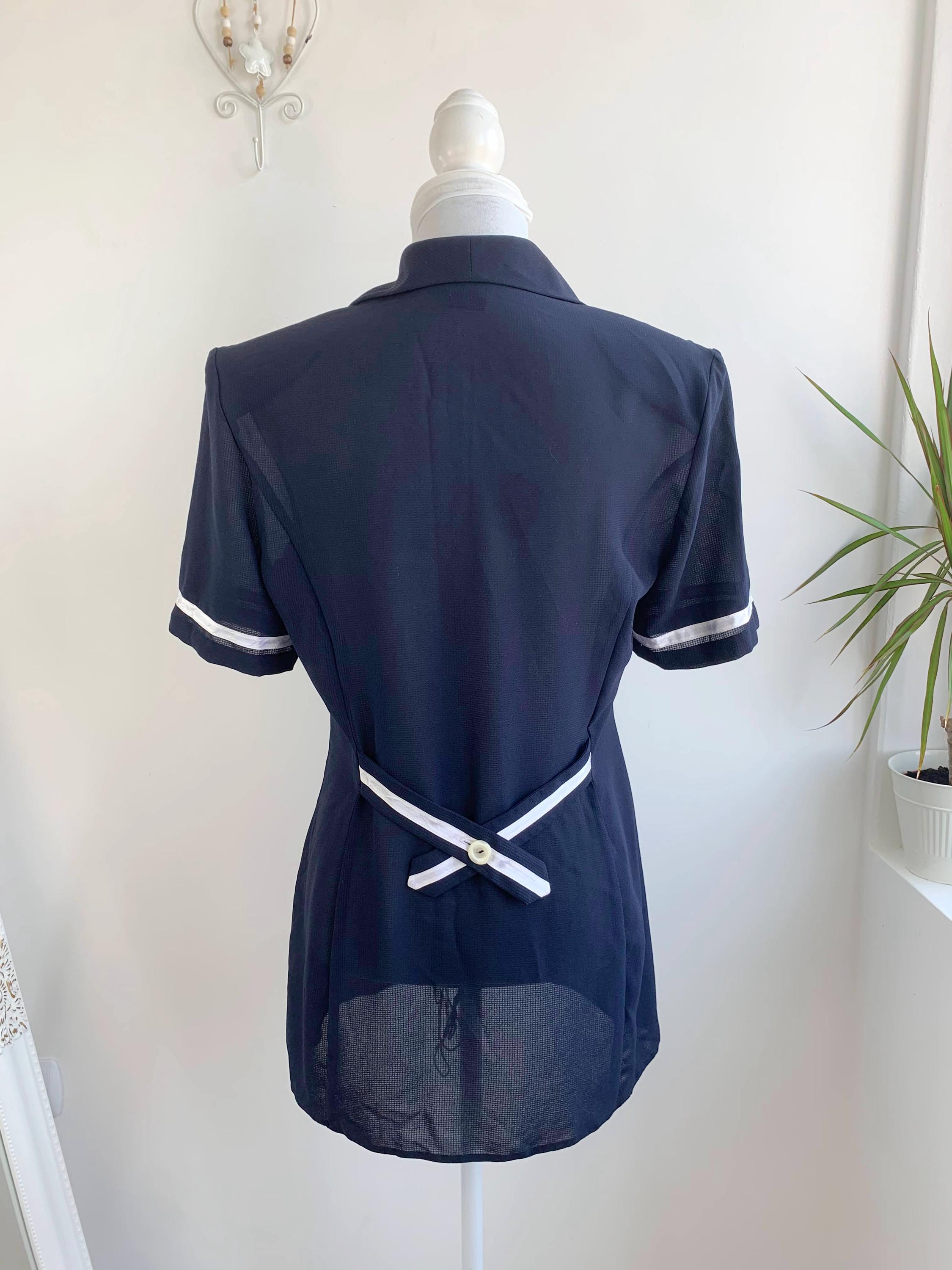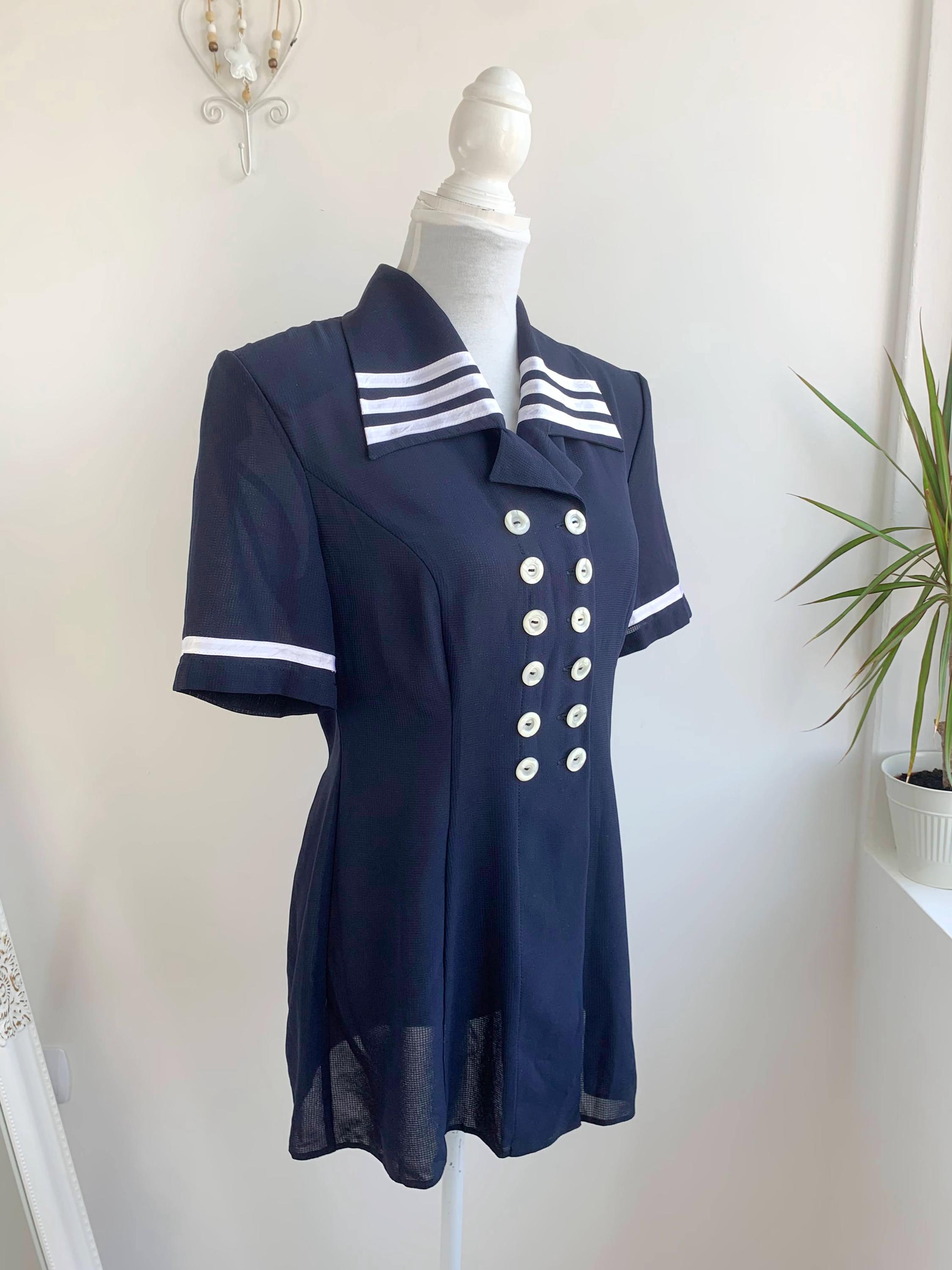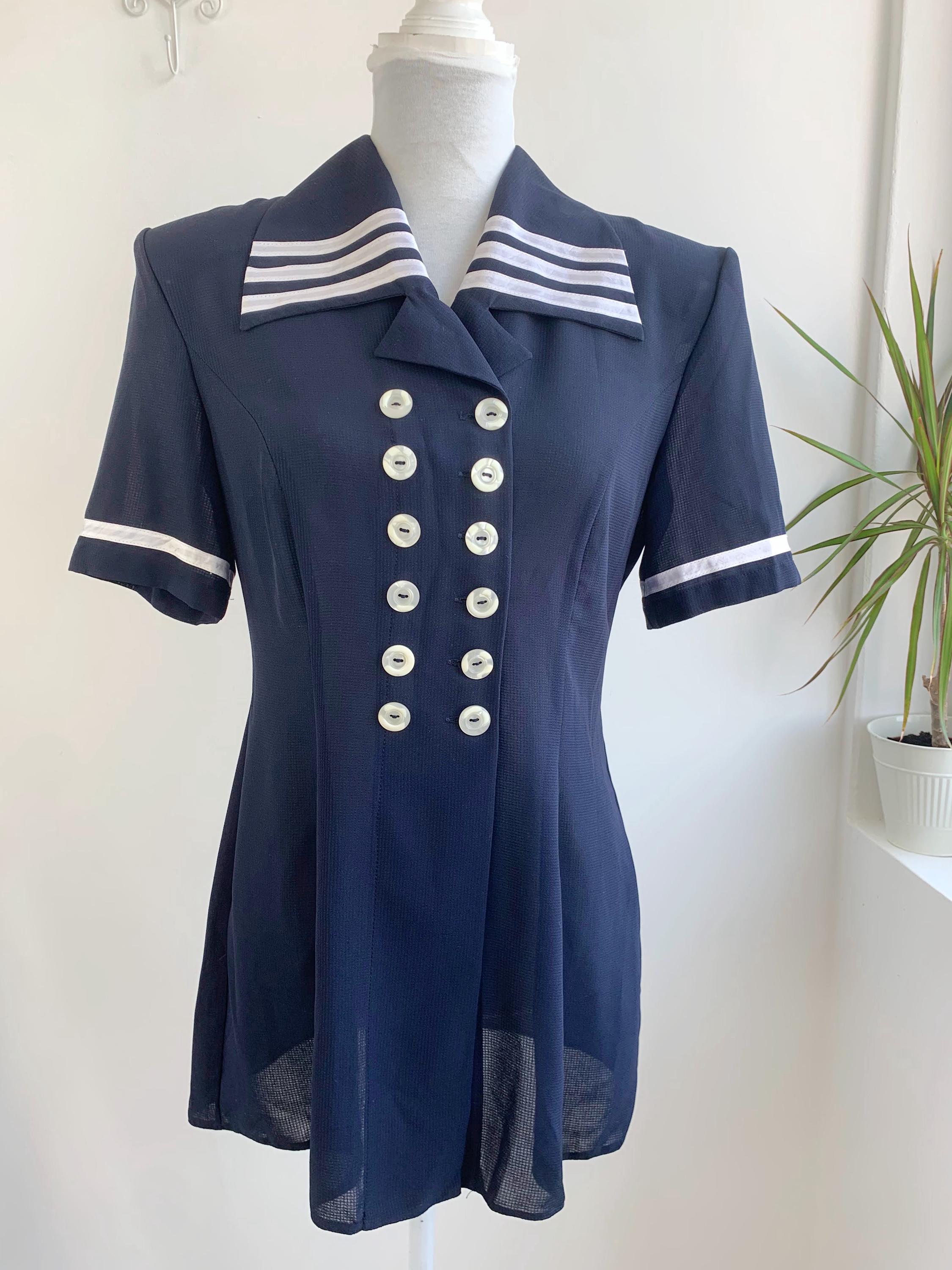 This is s beautiful vintage 80s navy blue sailor blazer for women in Size M by the Bulgarian brand Mesalina Rousse. This light summer nautical blazer is made of semi sheer light and breathable fabric, which is unmarked, however it feels like either polyester or viscose. This summer yacht coat features a statement sailor collar, short sleeves and stylish double breasted closure with light shoulder pads to define the shoulders. This marine style summer jacket frings the 40s style back with it's fitted elongated silhouette and back button belt.