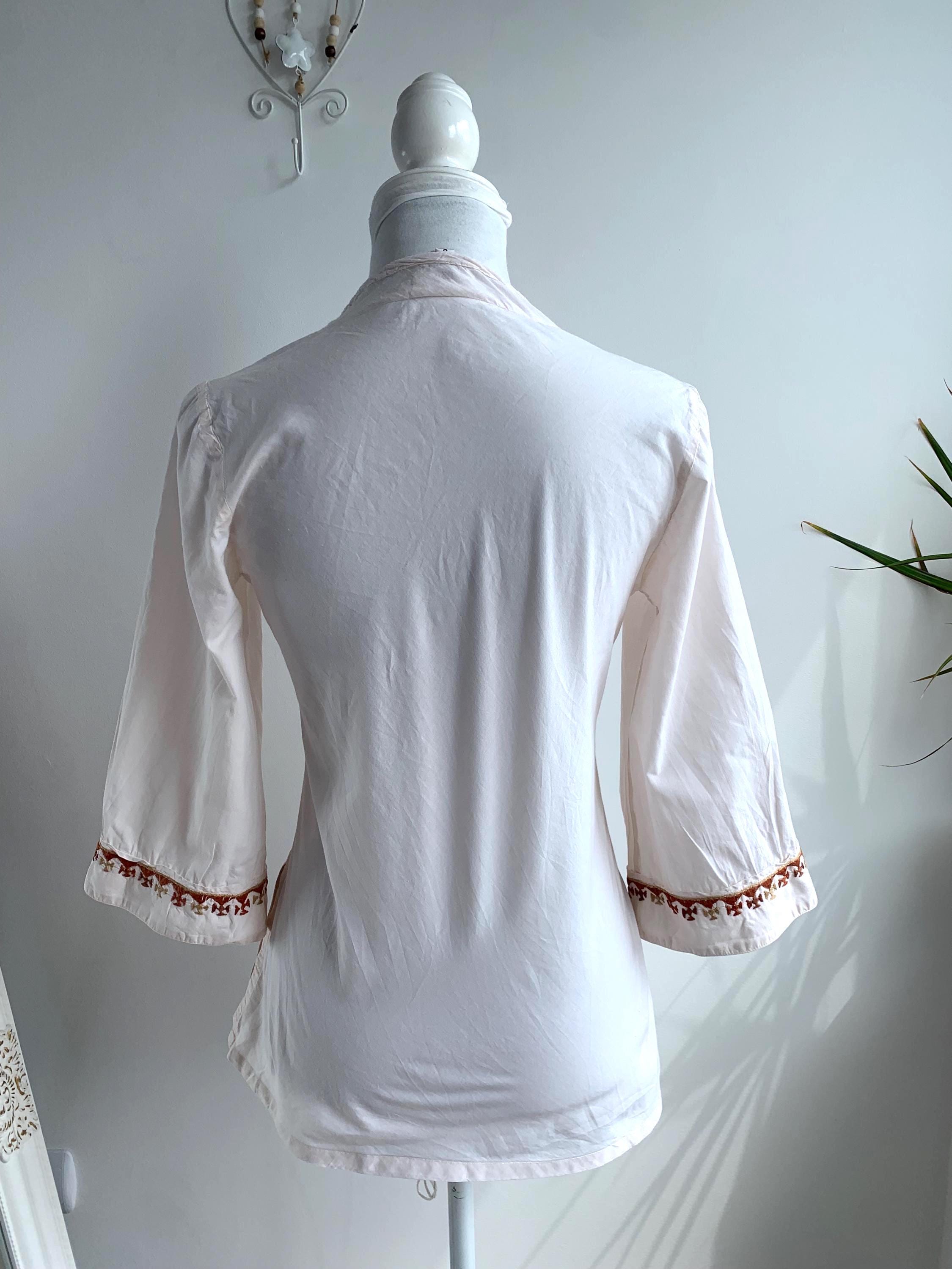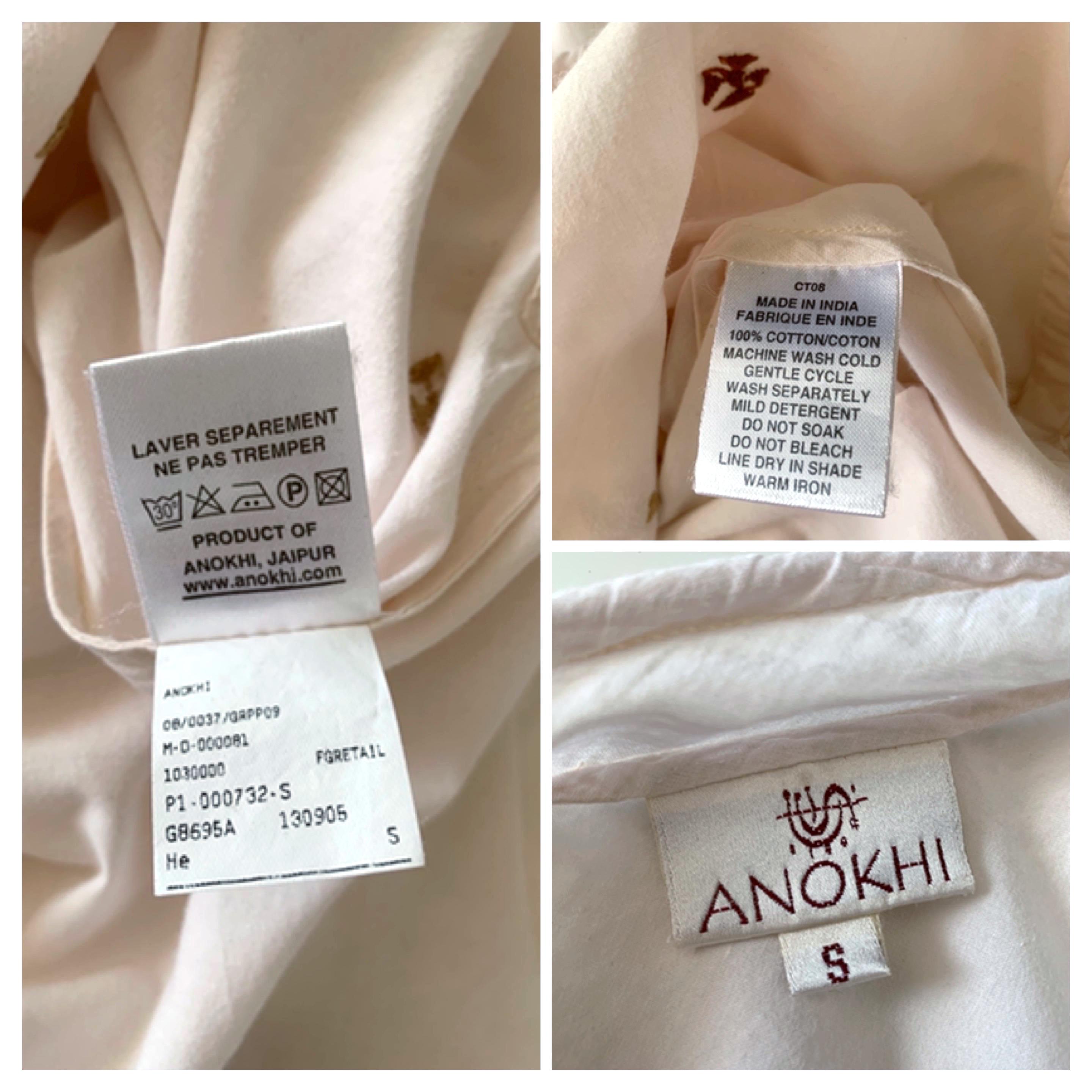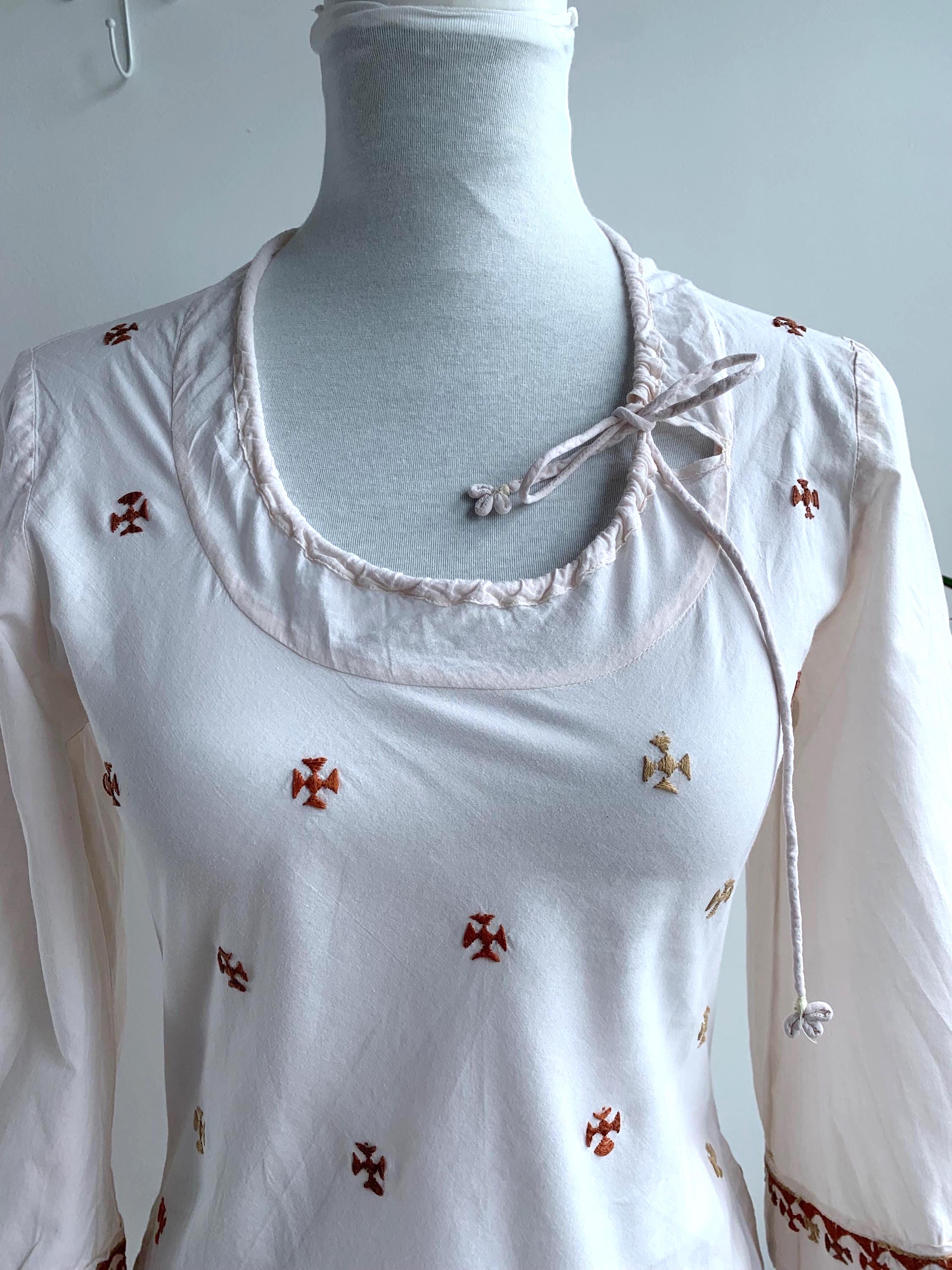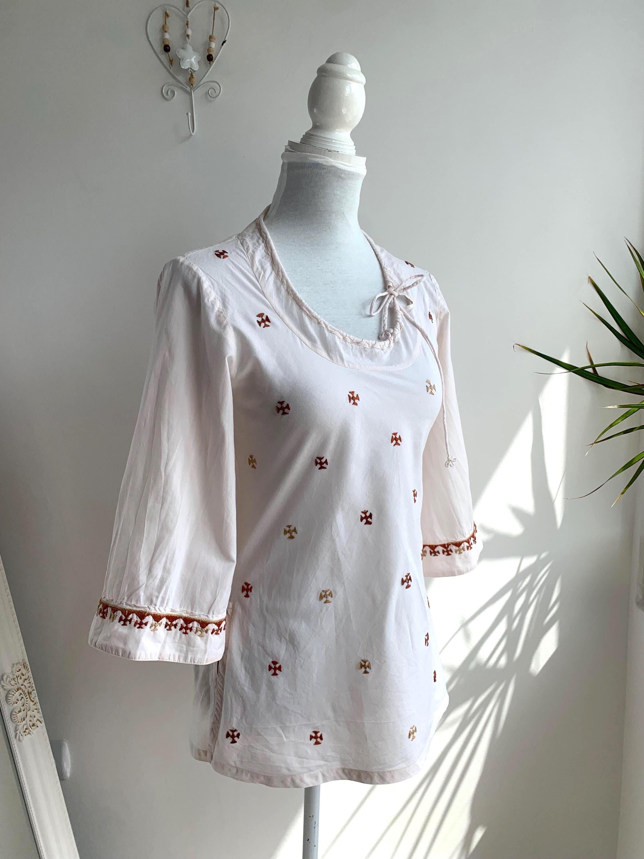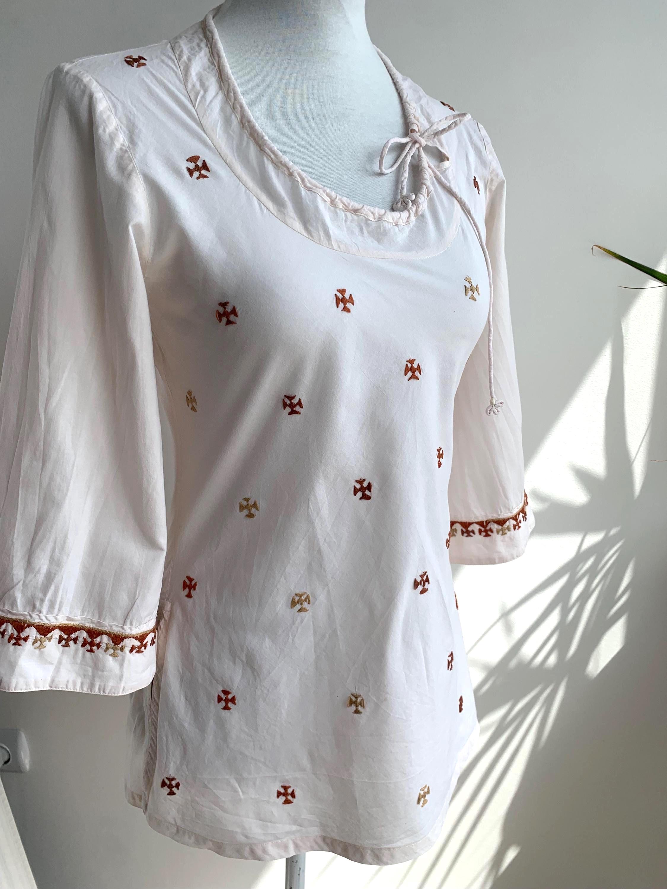 This is a vintage Y2K pre-loved ANOKHI pure cotton half sleeve summer blouse for women in cream beige with loose fit silhouette and gorgeous embroidery. This boho chic summer cotton shirt for women has 3.4 sleeves and drawstring neck with tie front accent. The size marked is S.