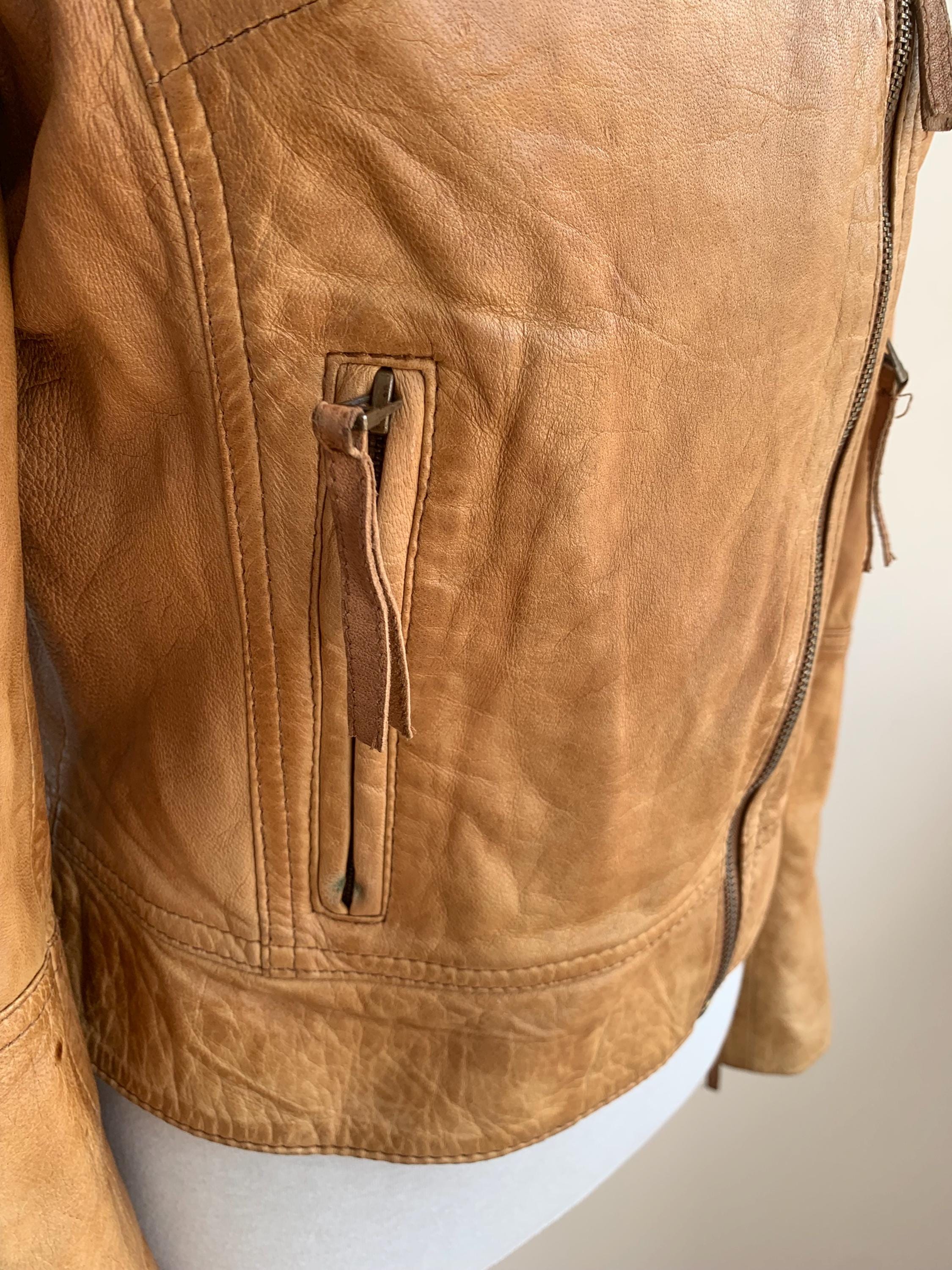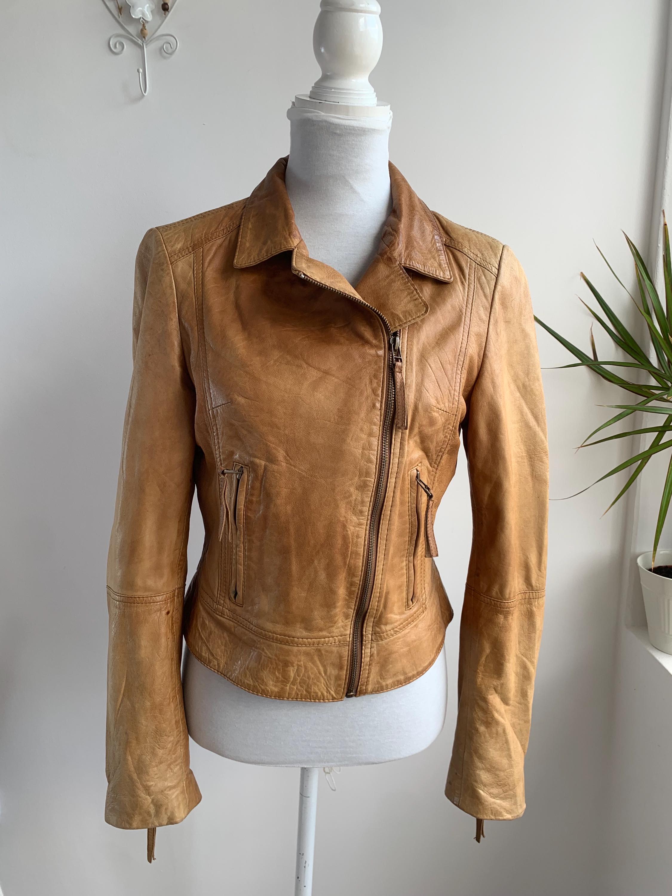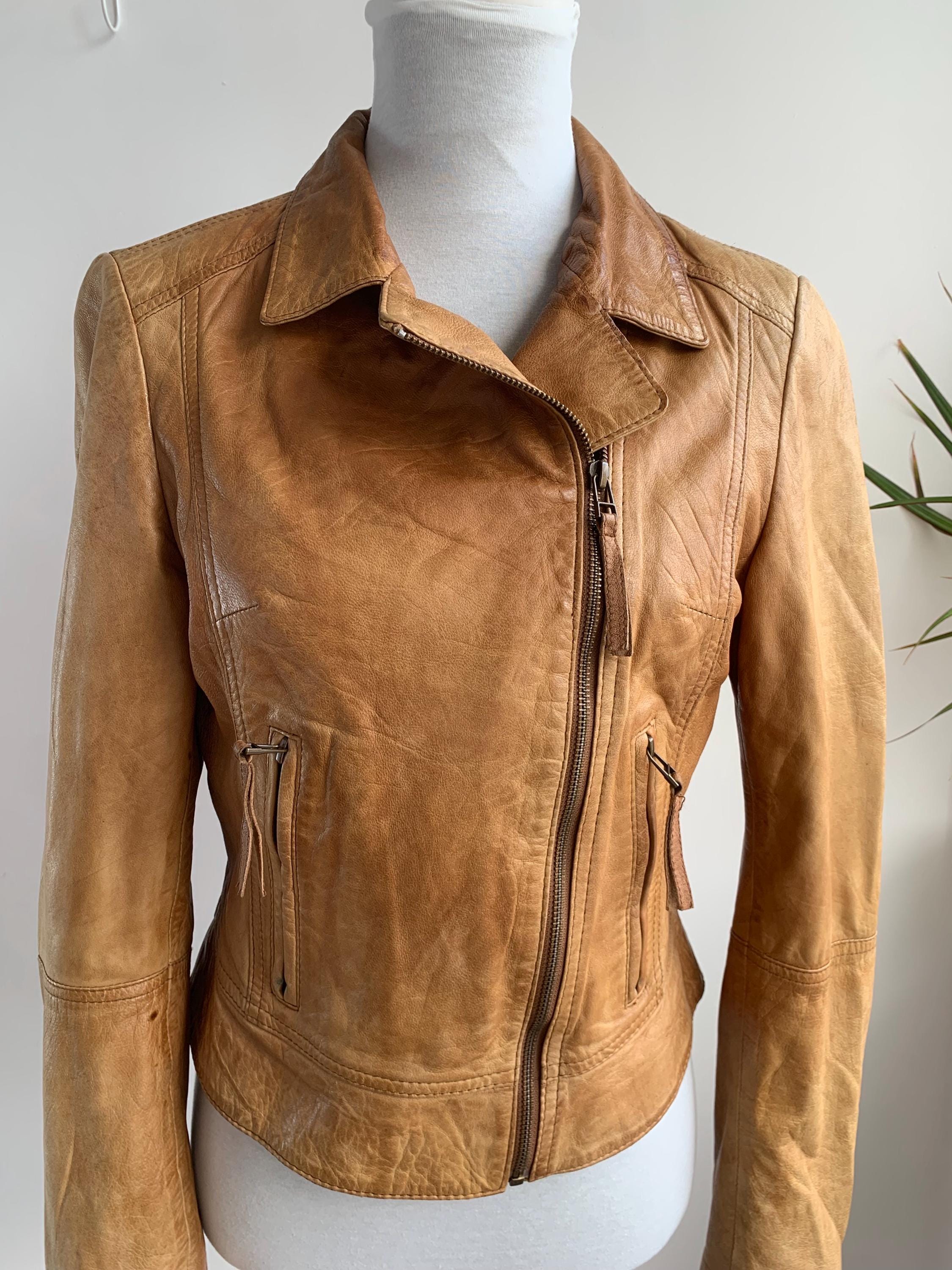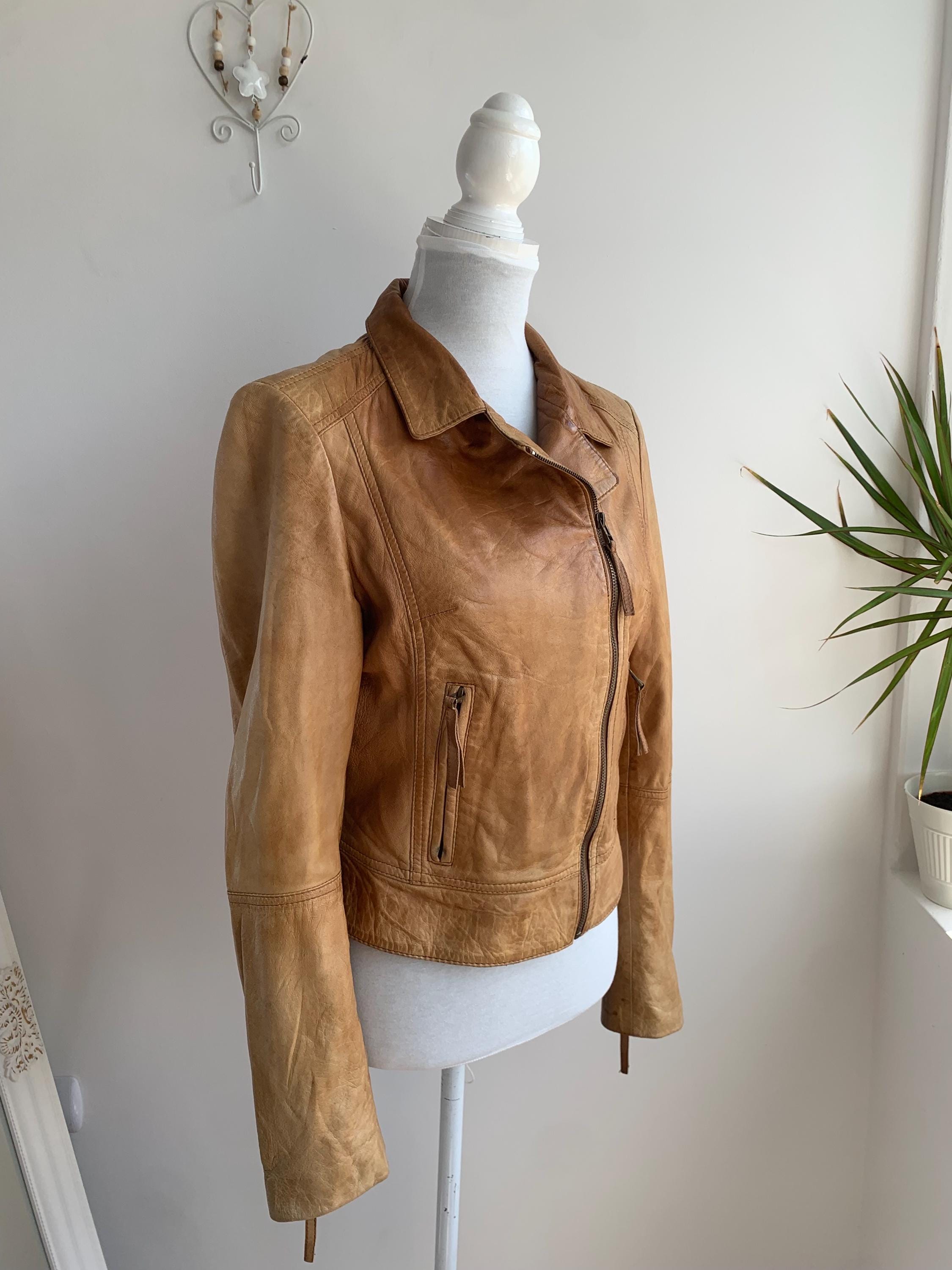 Condition: this brown leather jacket was pre- loved and has a heavily distressed look with numerous scratches and marks on the genuine leather surface.