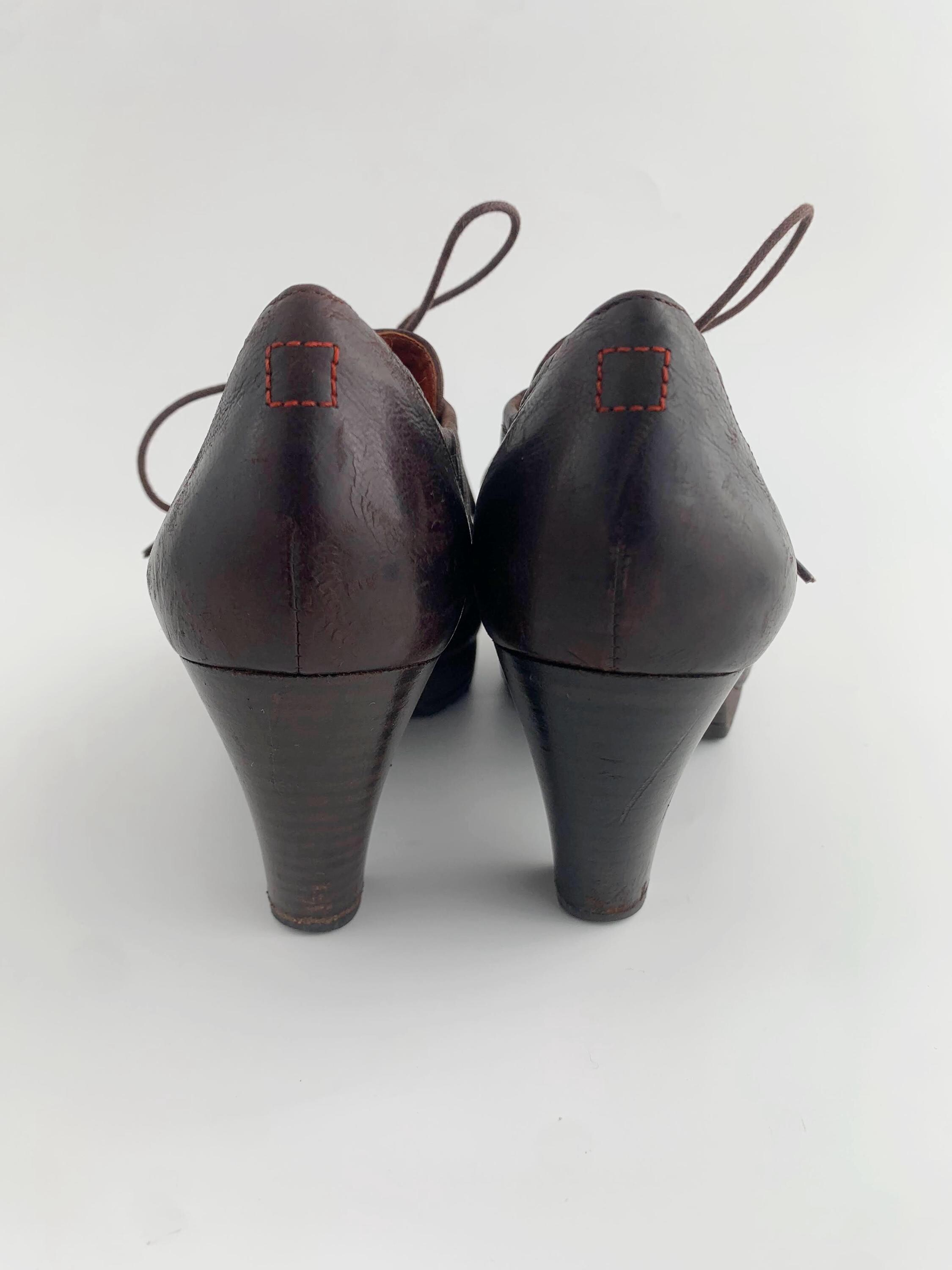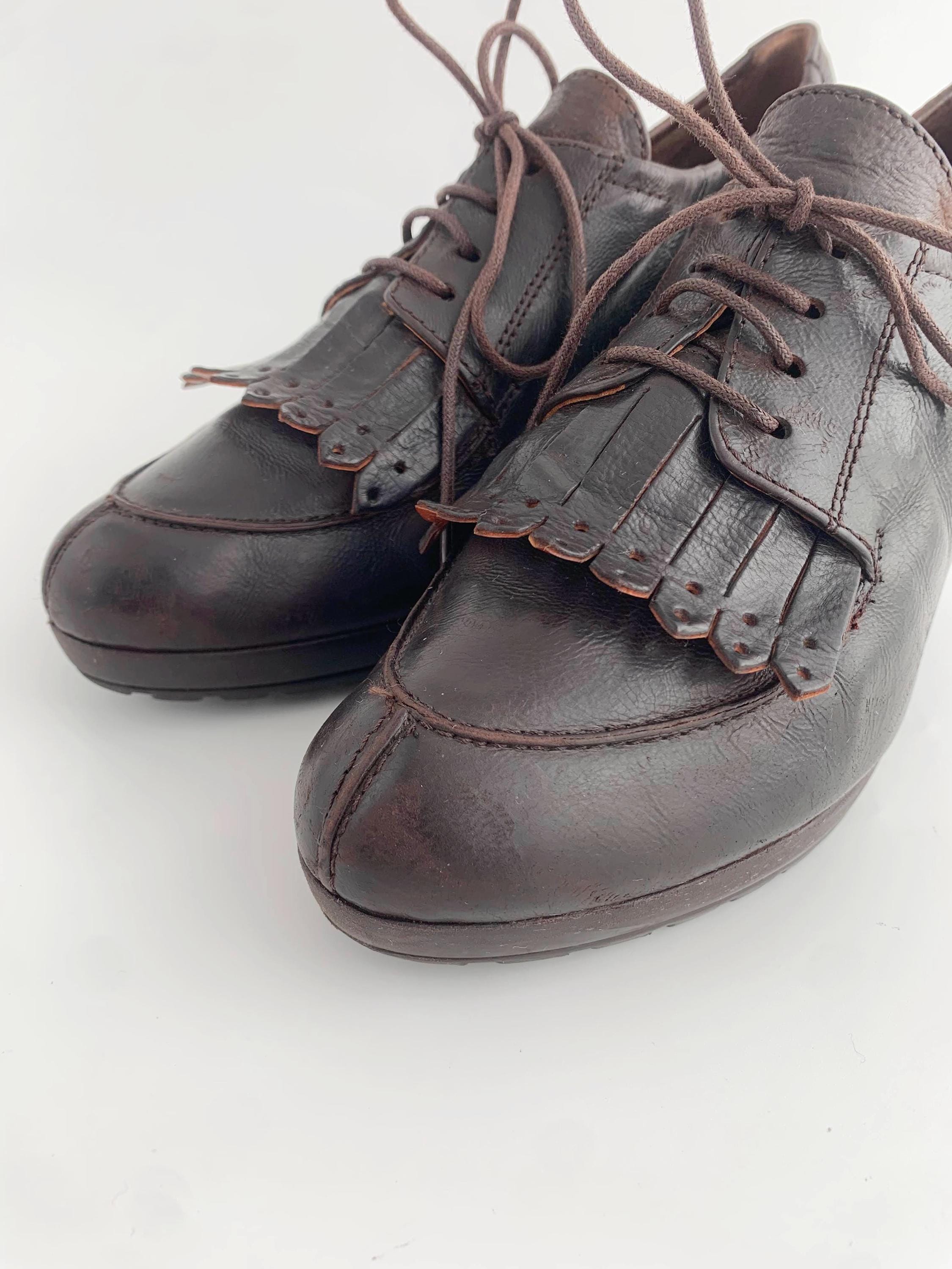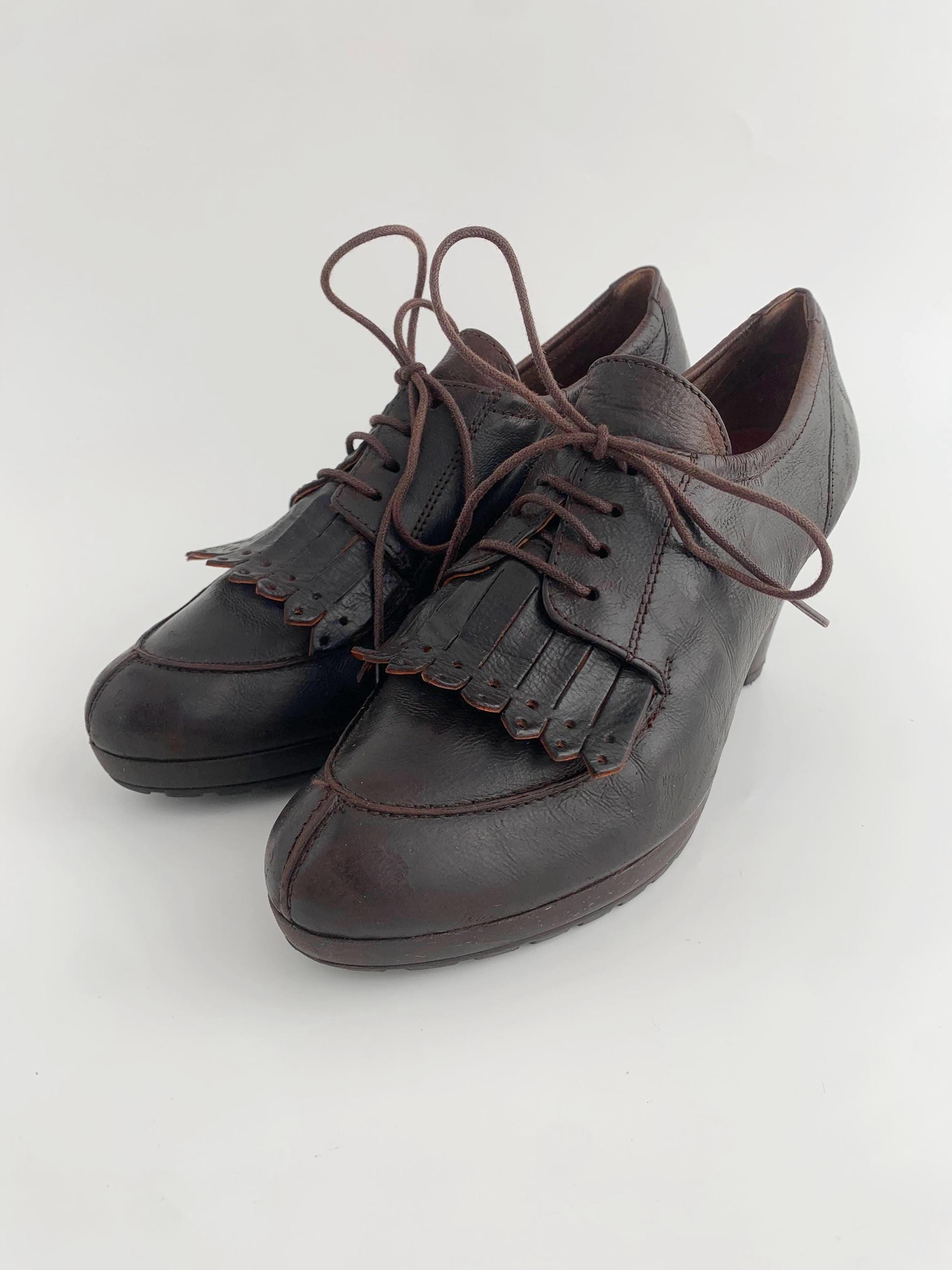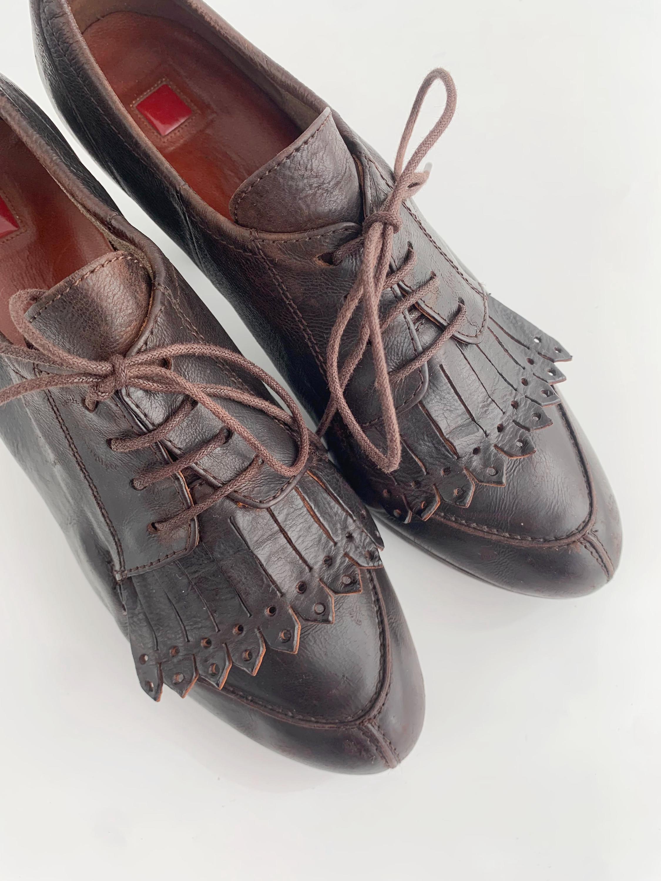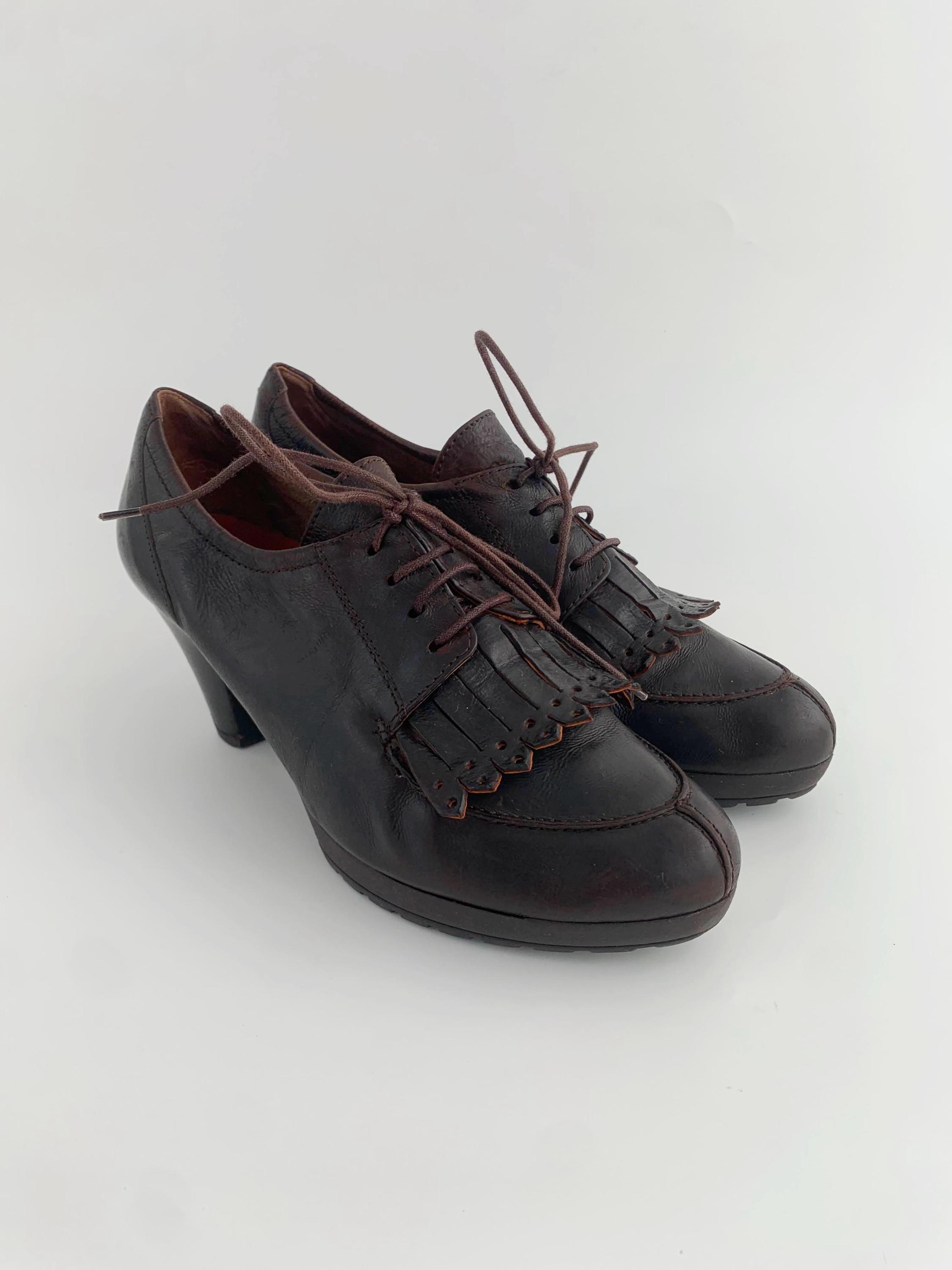 These are vintage pre-loved 90s HOGL fringed lace up oxford shoes for women in size UK 4 1/2/ US 7/ EUR 37 1/2. These classic oxford pumps are made of chocolate brown genuine leather, rubber soles and leather interior. These kitten heel shoes are perfect for the spring/ fall season. These lace up shoes are perfect for the office or just pair them with your 40s style outfit and you are ready to rock.
