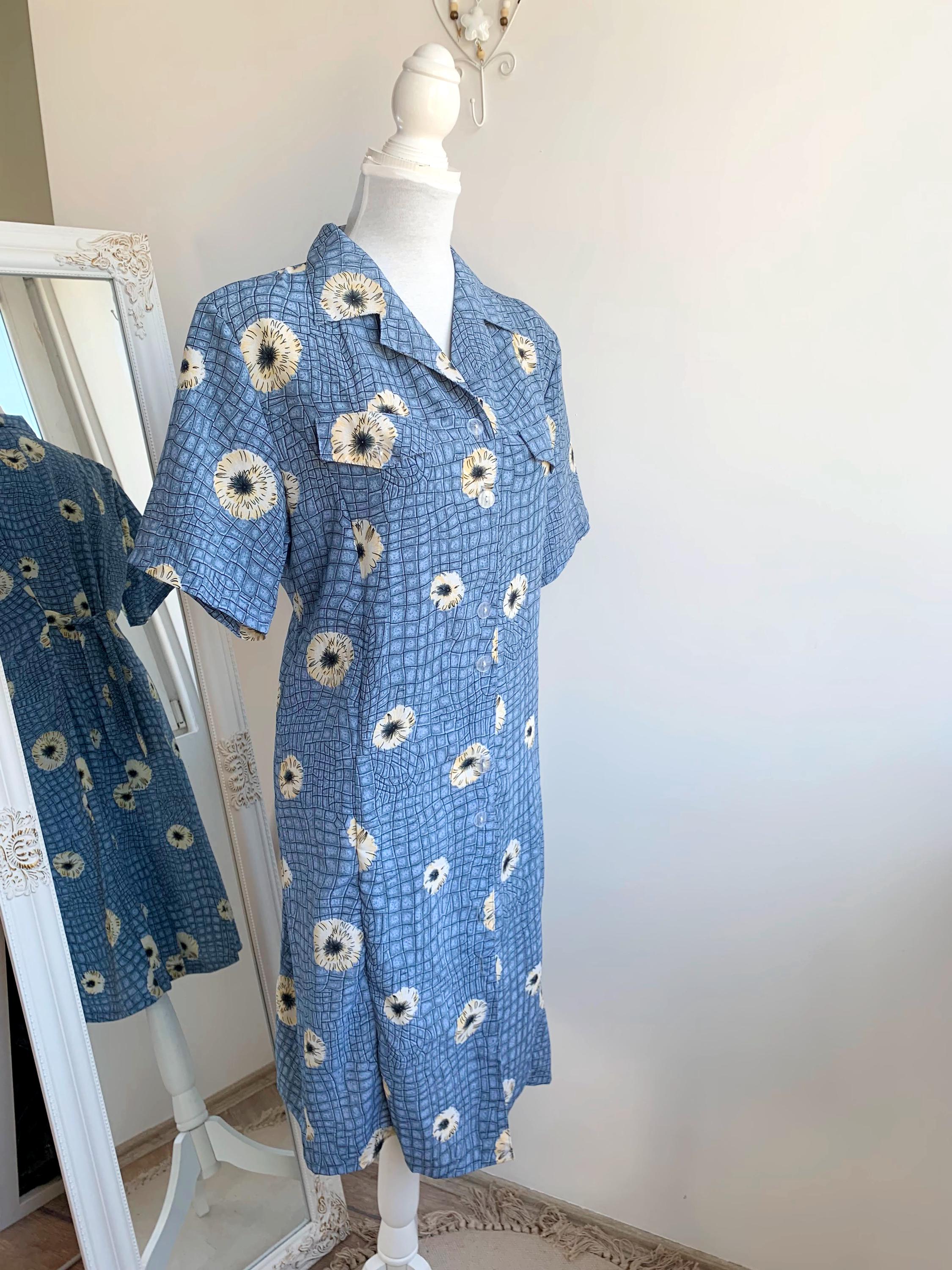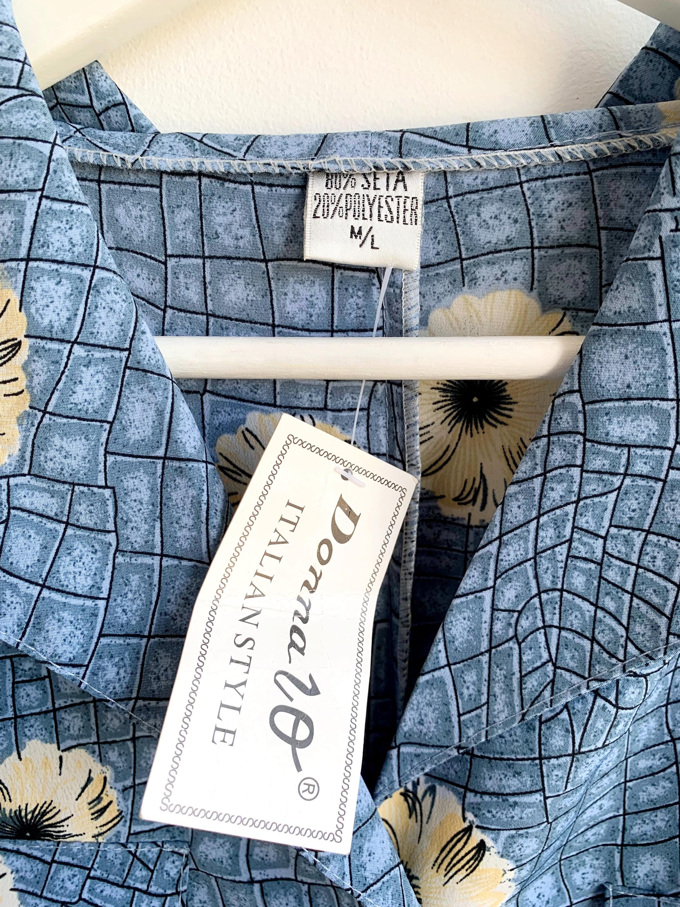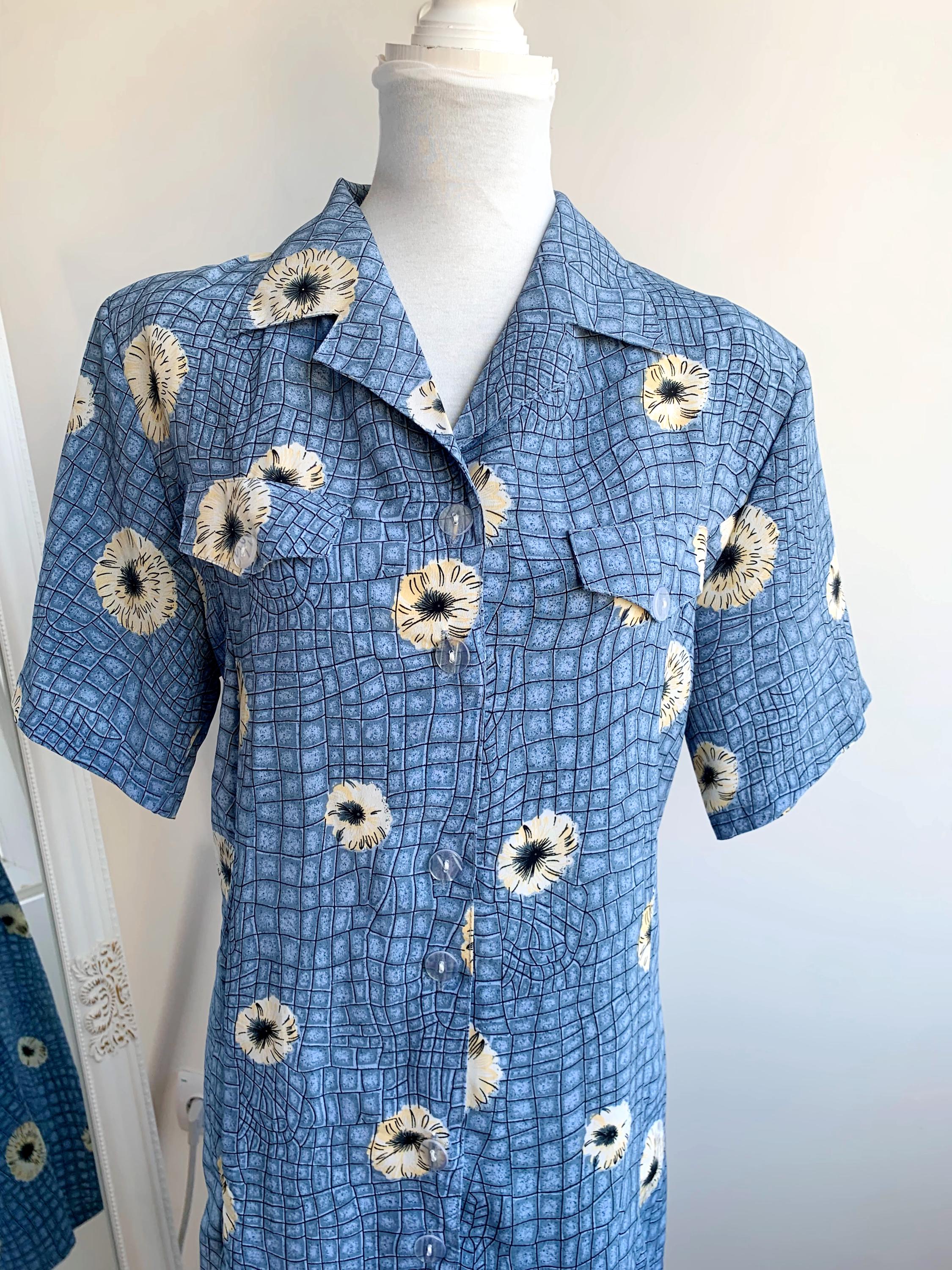 This is a wonderful vintage 90s blue silk shirt dress made of light 80% silk / 20% polyester fabric in size M/L. This button up midi dress has a loose fit silhouette with tie back and immitation chest pockets.
