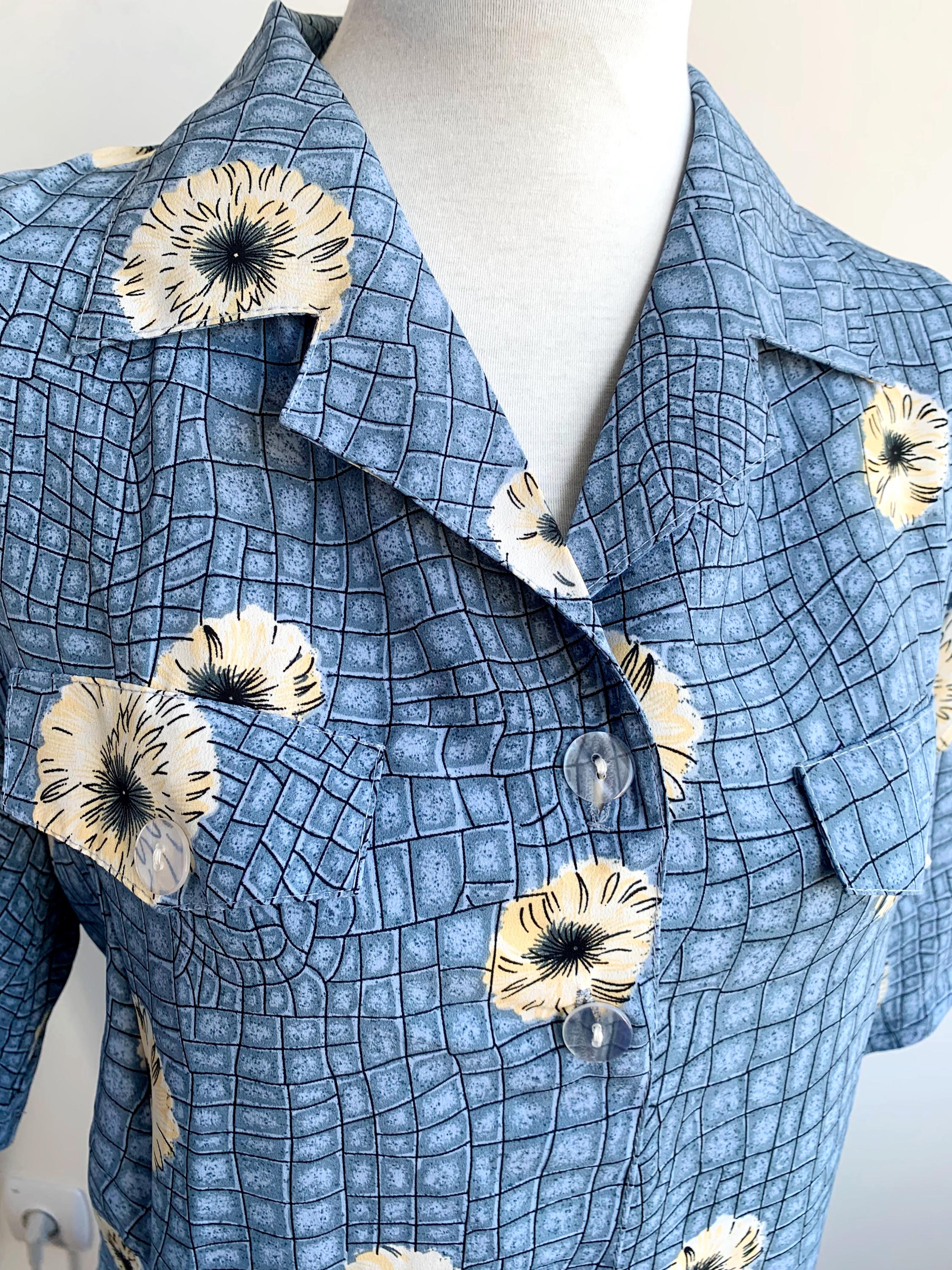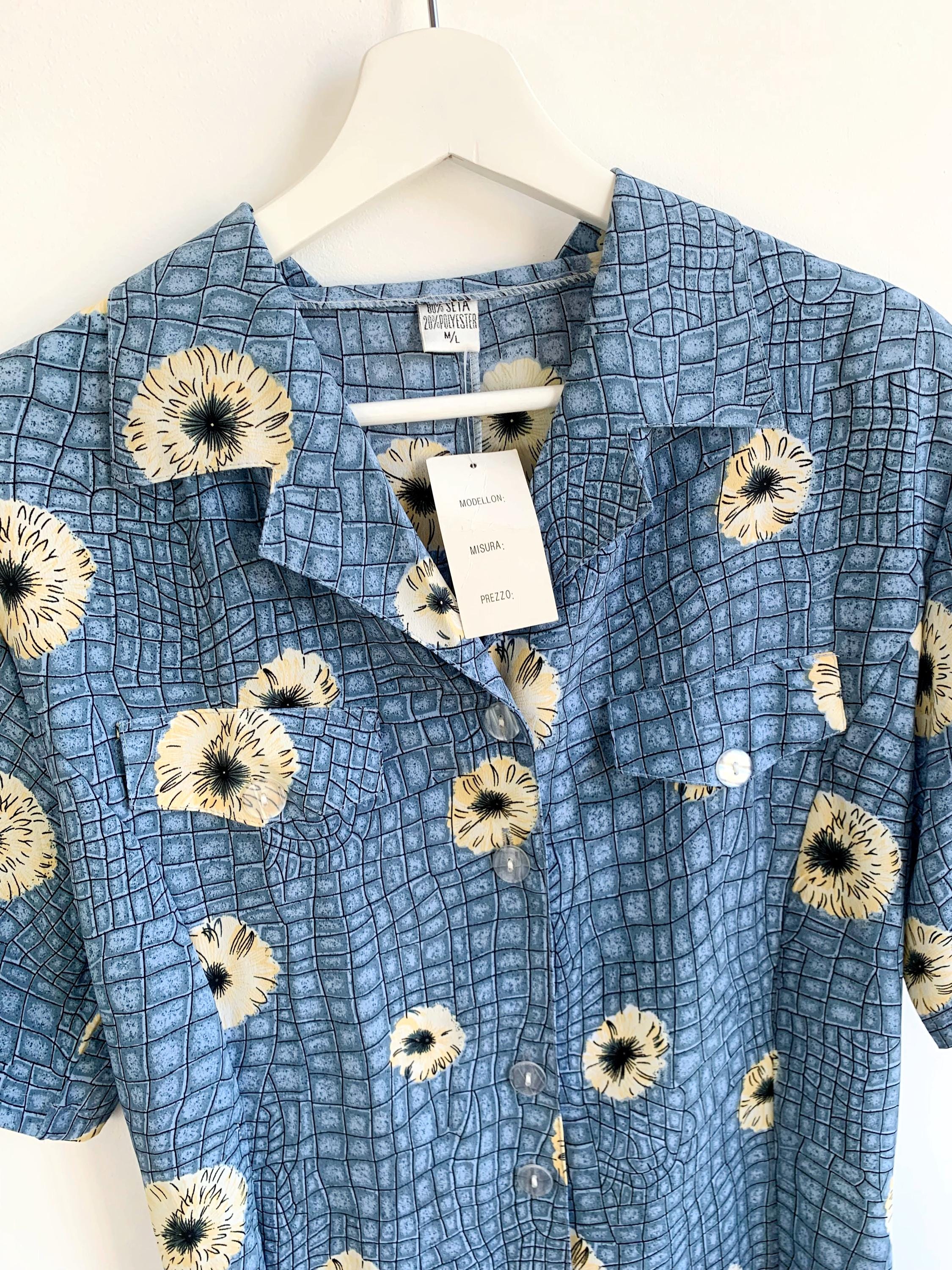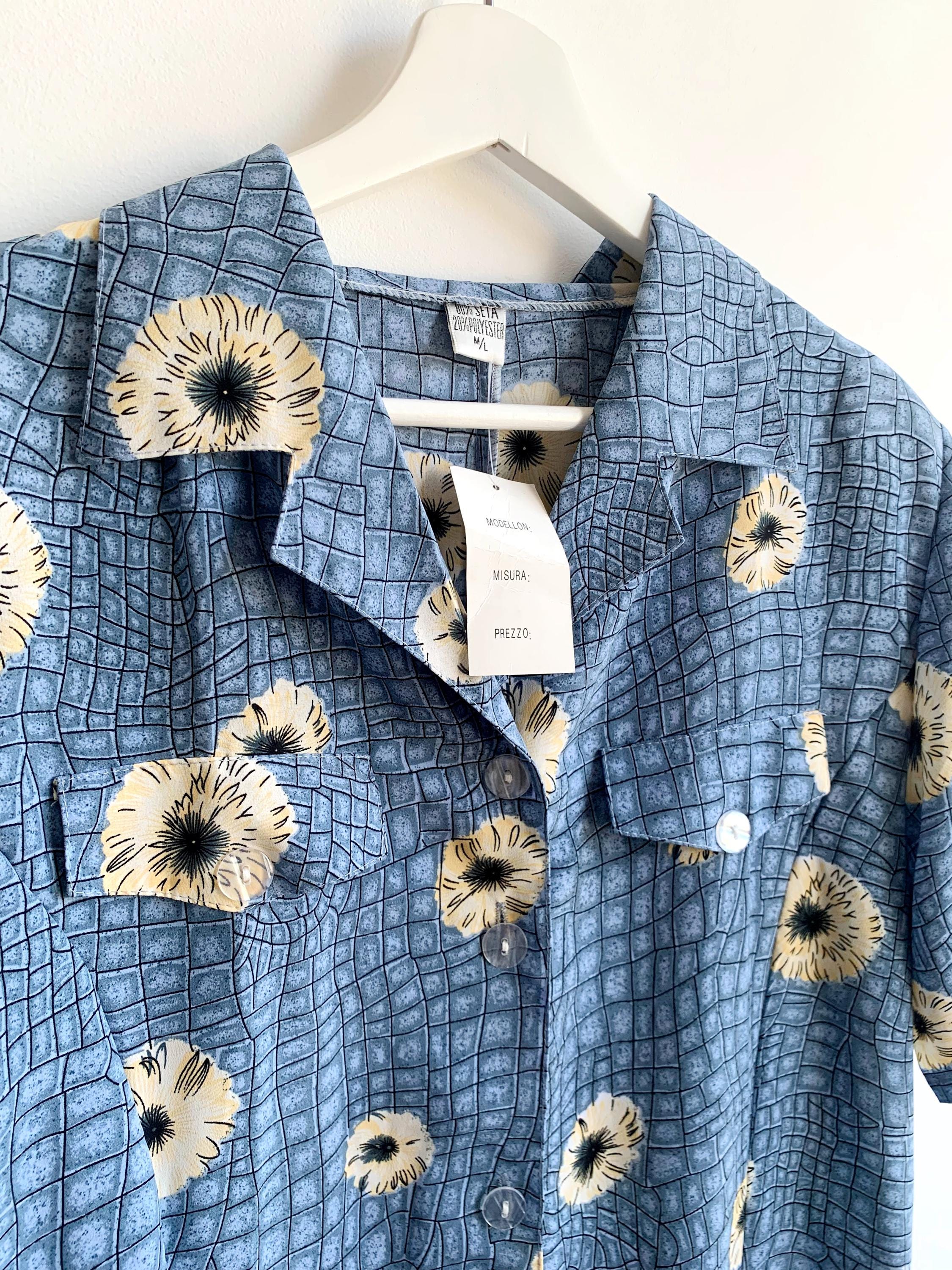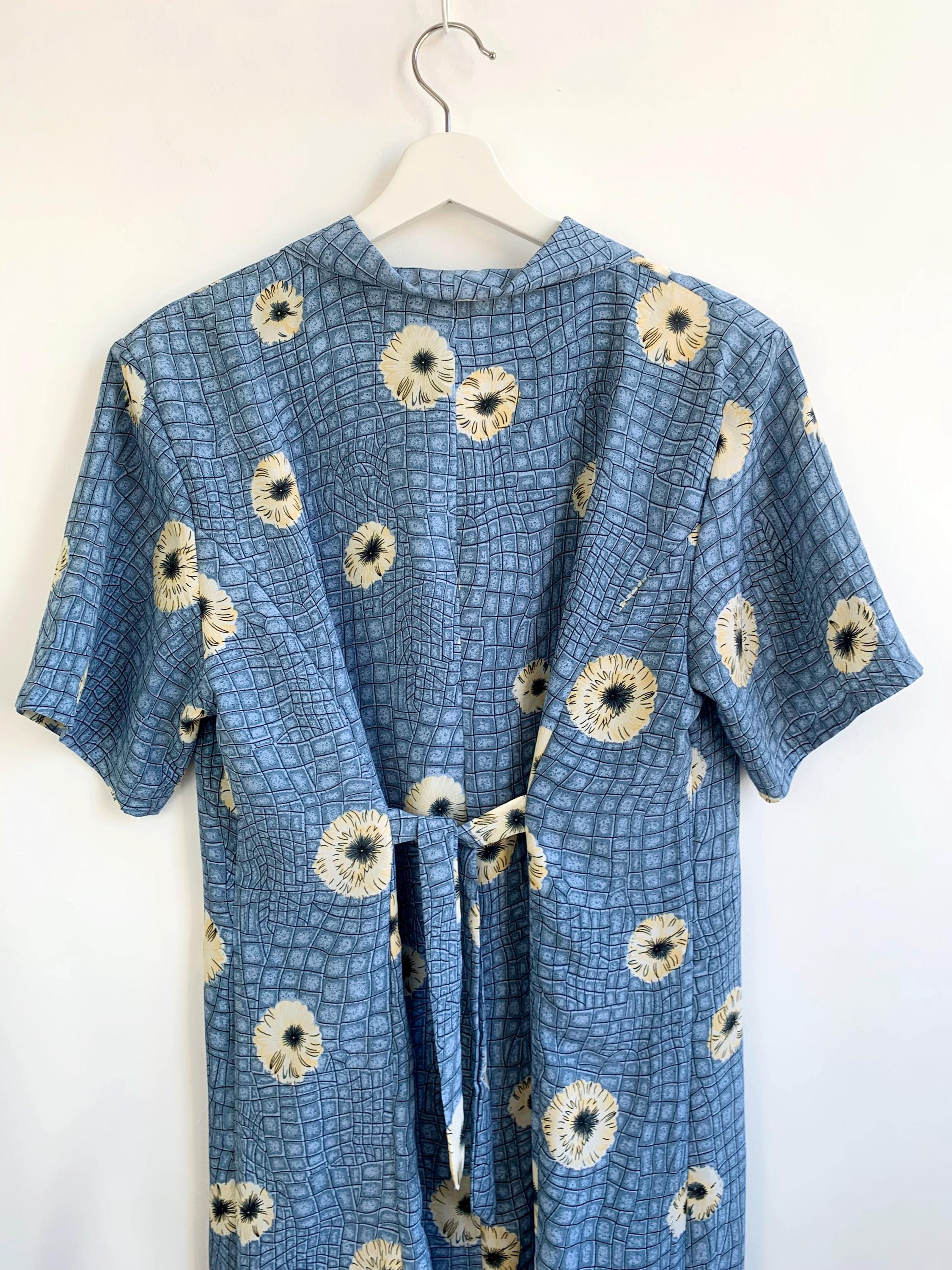 This is a wonderful vintage 90s blue silk shirt dress made of light 80% silk / 20% polyester fabric in size M/L. This button up midi dress has a loose fit silhouette with tie back and immitation chest pockets.