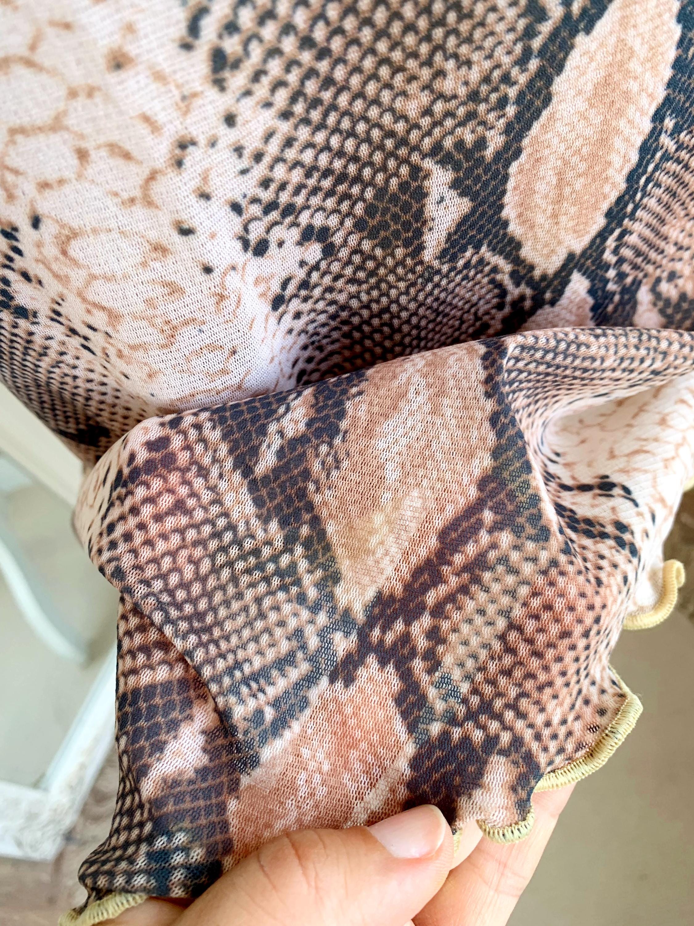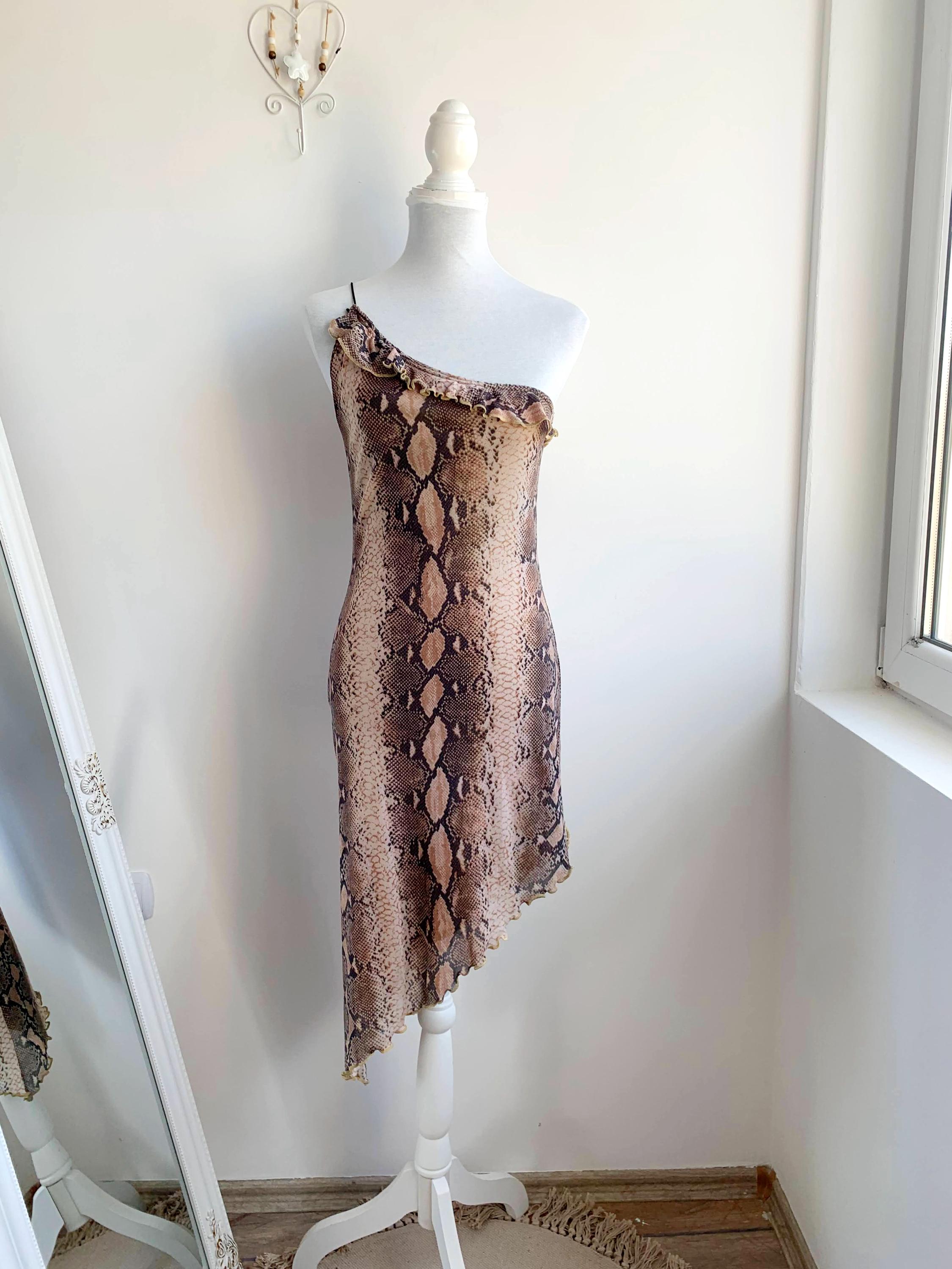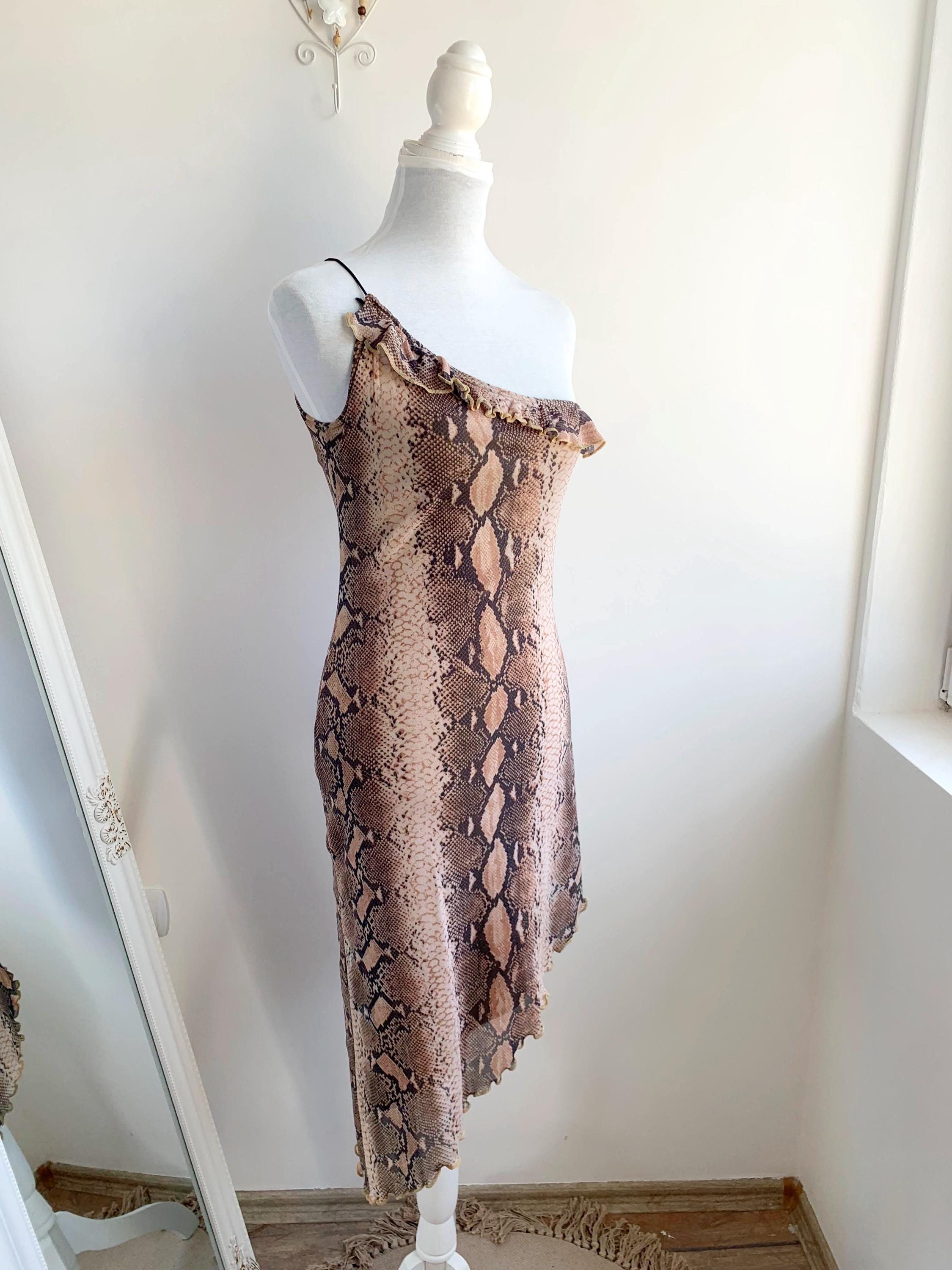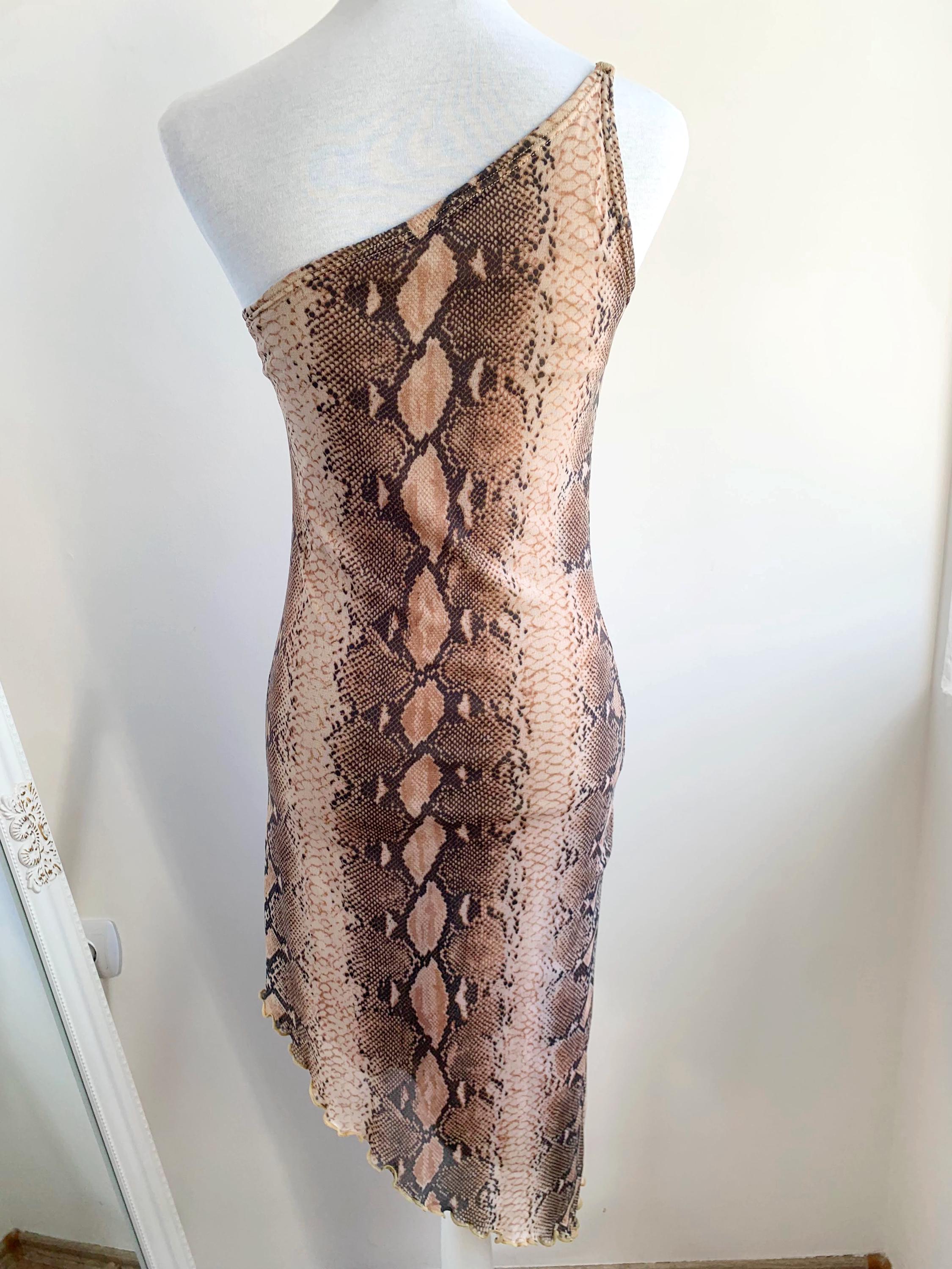 This is a beautiful vintage 2000s stretchy nylon bodycon dress made of 100% nylon fabric with mesh top layer and solid lining. This slim fit snakeskin print dress is made of elastic fabric in camel beige, light brown and khaki green shades. This going out party dress has asymmetrical hemline. It fits like size XS.