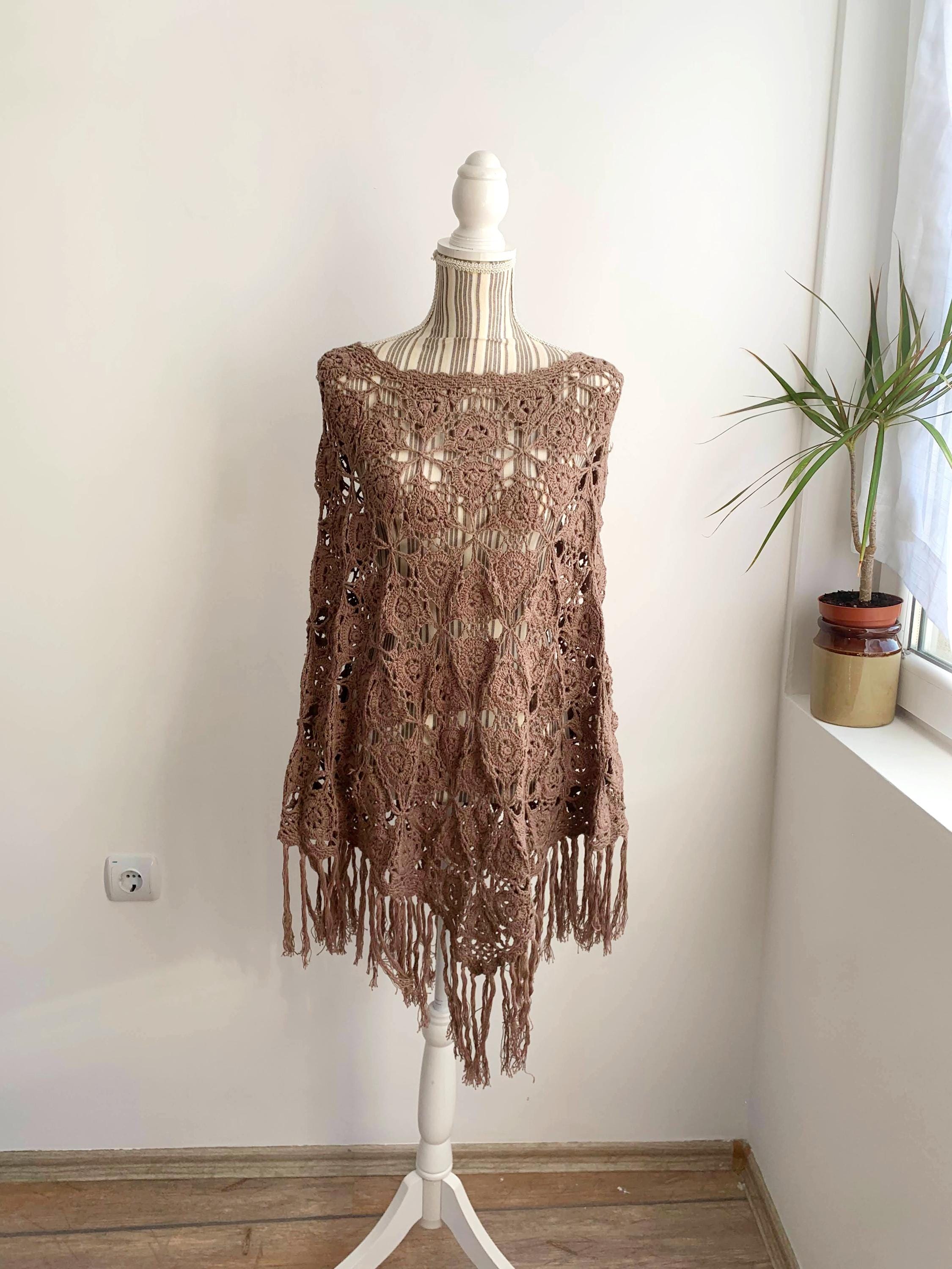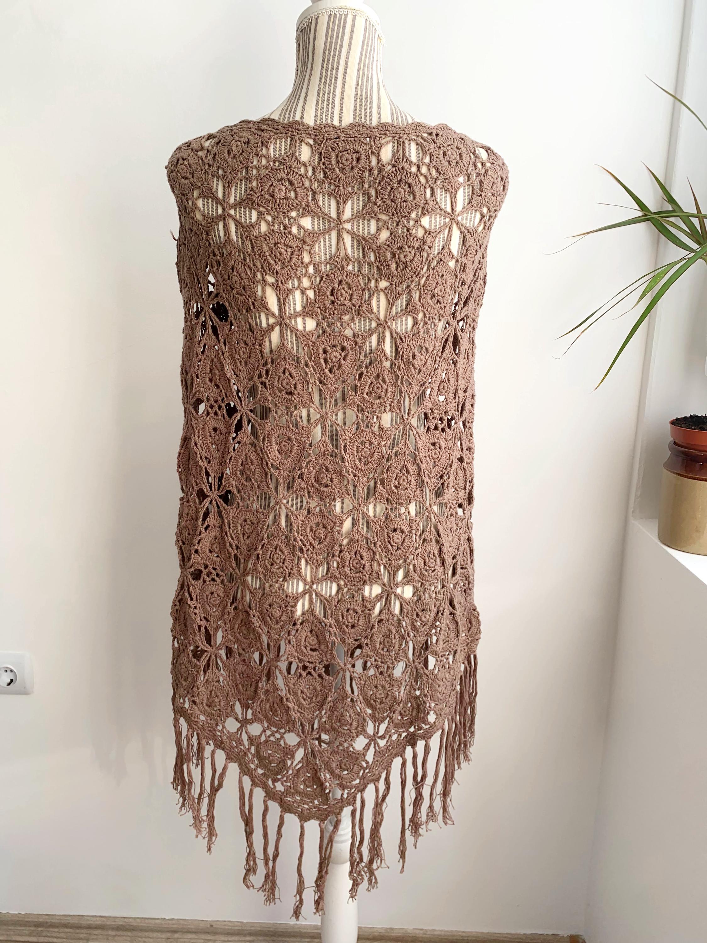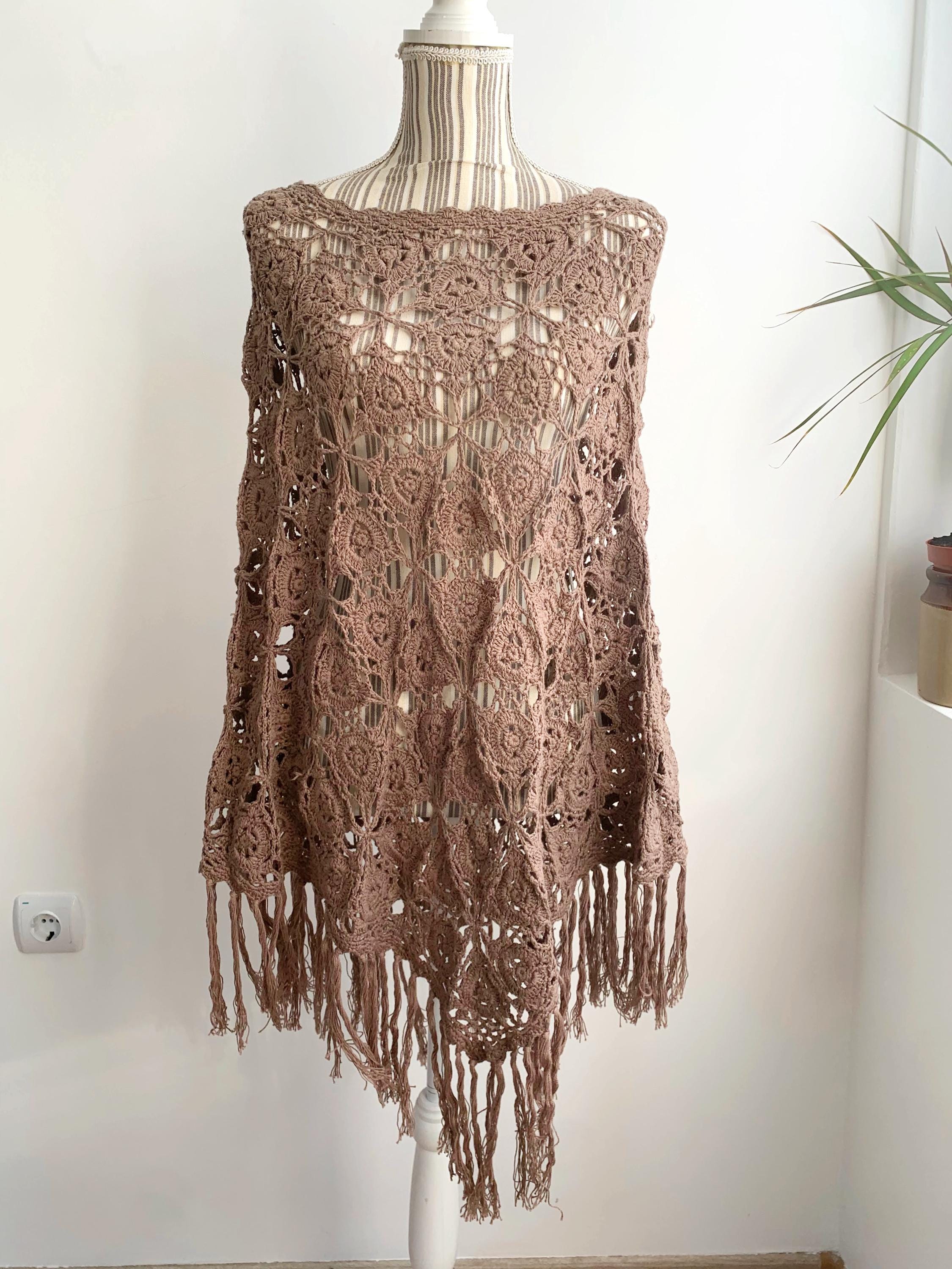 This is a beautiful vintage Y2K crochet lace convertible shawl, which can be worn in so many different ways. This soft fluffy versatile poncho can be worn as a shawl, as a shoulder shrug, as a warm neck scarf, or as a poncho. A wonderful piece of clothing that you can wear in numerous ways and always look different. Enjoy this cozy lace crochet poncho in the fall or winter days to keep you cozy and warm. Enjoy it in the summer as a festival outfit or as a cute ebach cover up. This taupe brown crochet scarf is made of 100% cotton yarn. This knit wrap shawl will also make a wonderful gift for your mom or grandma.
