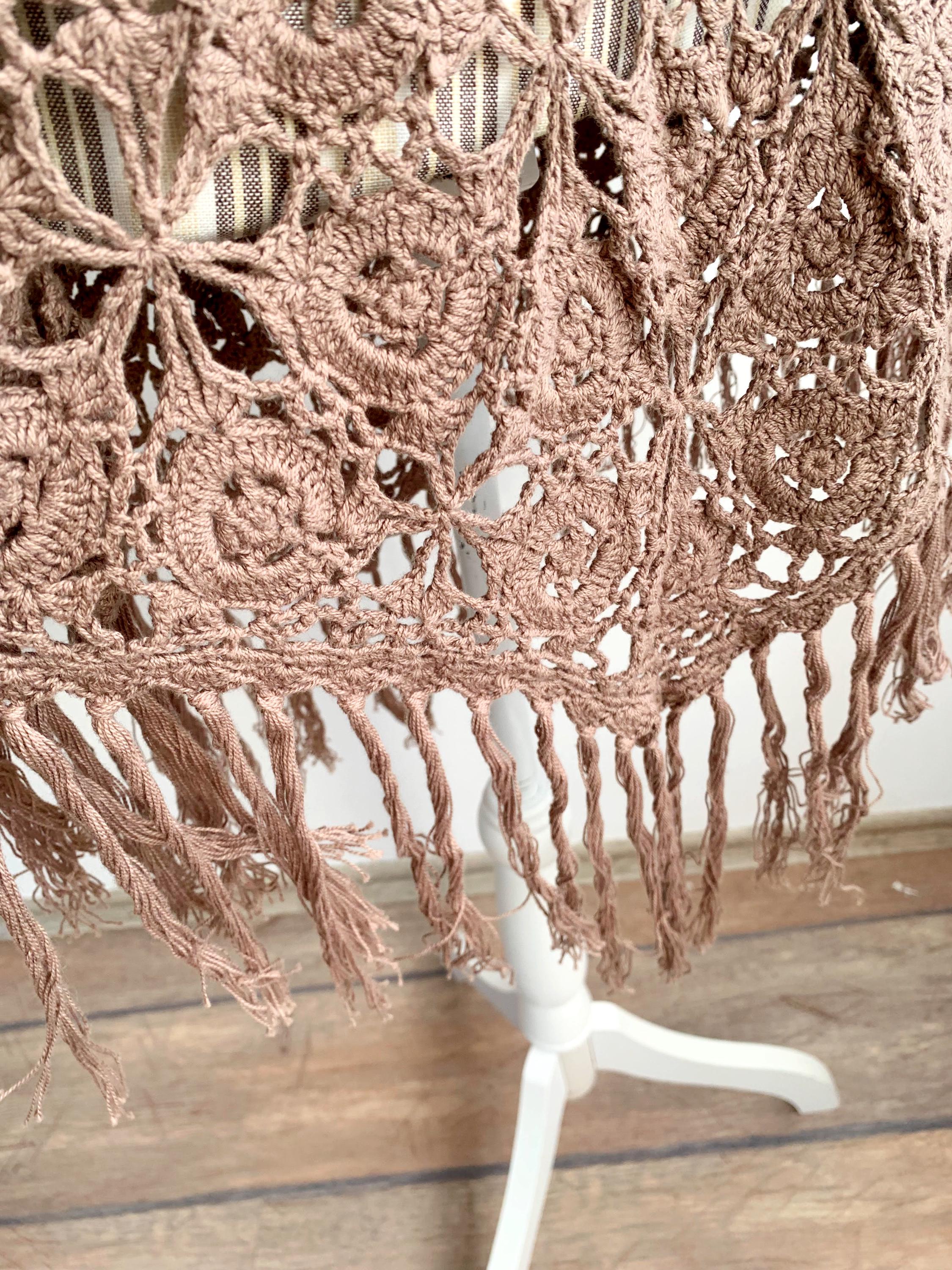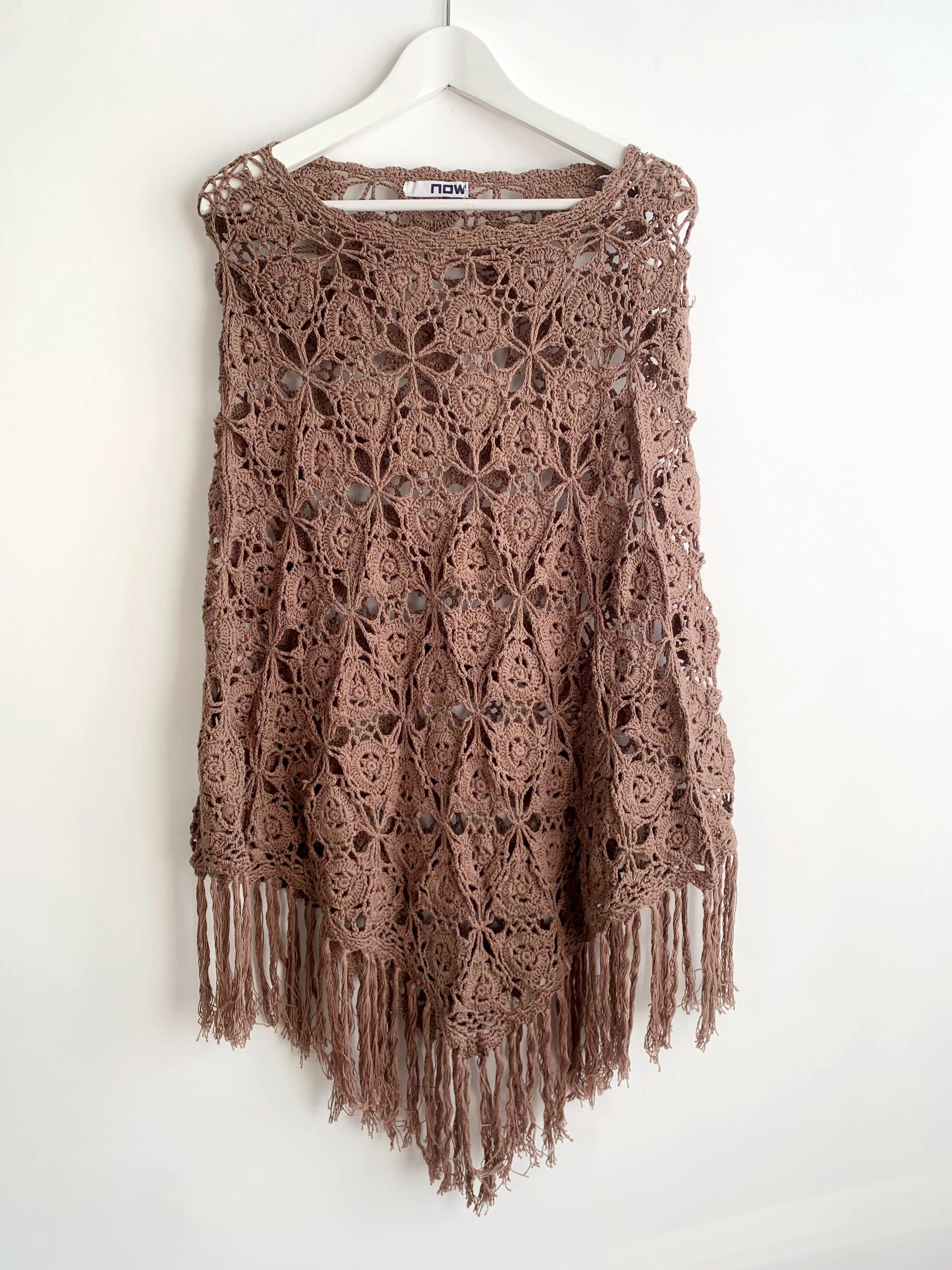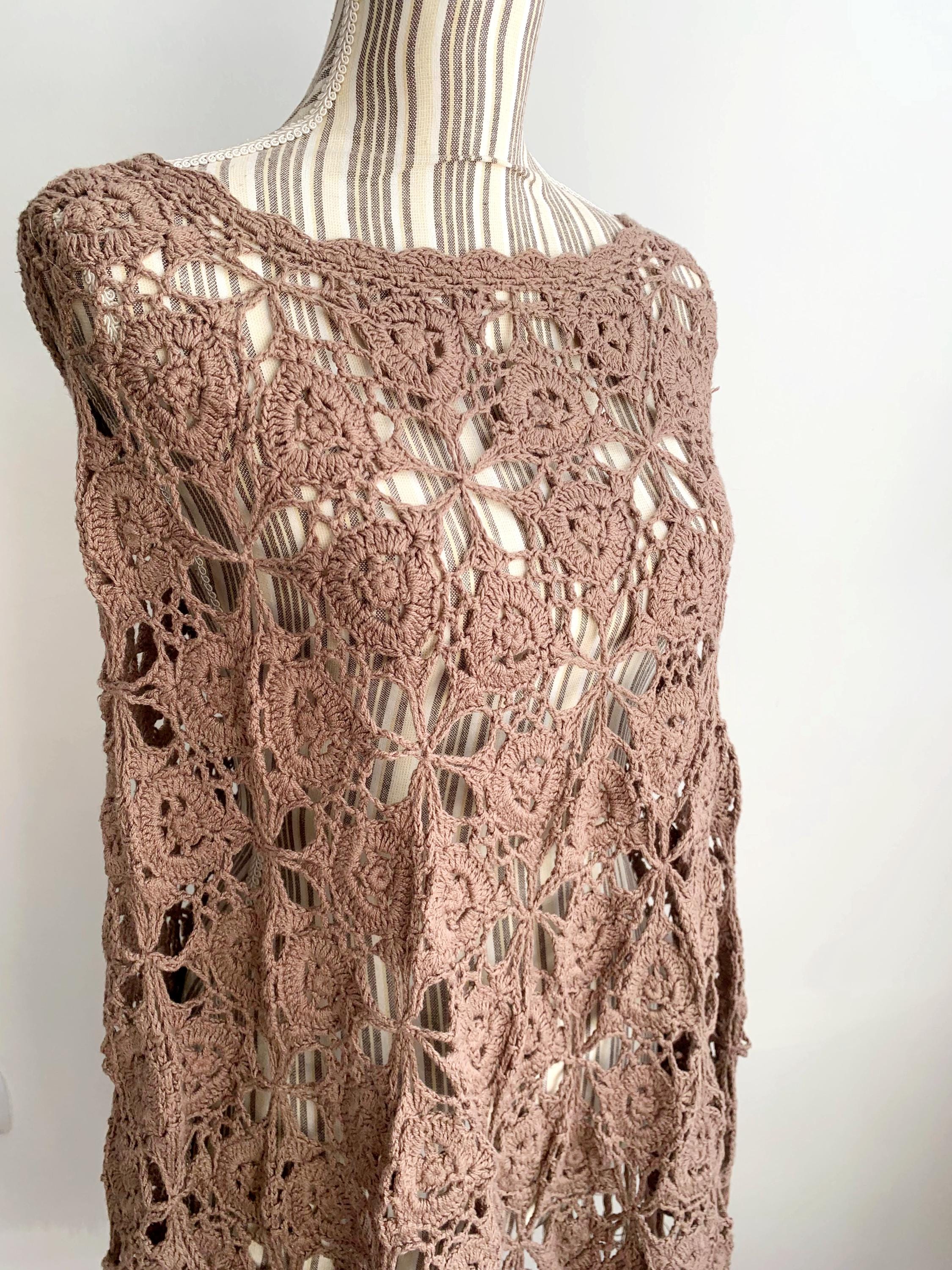 This is a beautiful vintage Y2K crochet lace convertible shawl, which can be worn in so many different ways. This soft fluffy versatile poncho can be worn as a shawl, as a shoulder shrug, as a warm neck scarf, or as a poncho. A wonderful piece of clothing that you can wear in numerous ways and always look different. Enjoy this cozy lace crochet poncho in the fall or winter days to keep you cozy and warm. Enjoy it in the summer as a festival outfit or as a cute ebach cover up. This taupe brown crochet scarf is made of 100% cotton yarn. This knit wrap shawl will also make a wonderful gift for your mom or grandma.