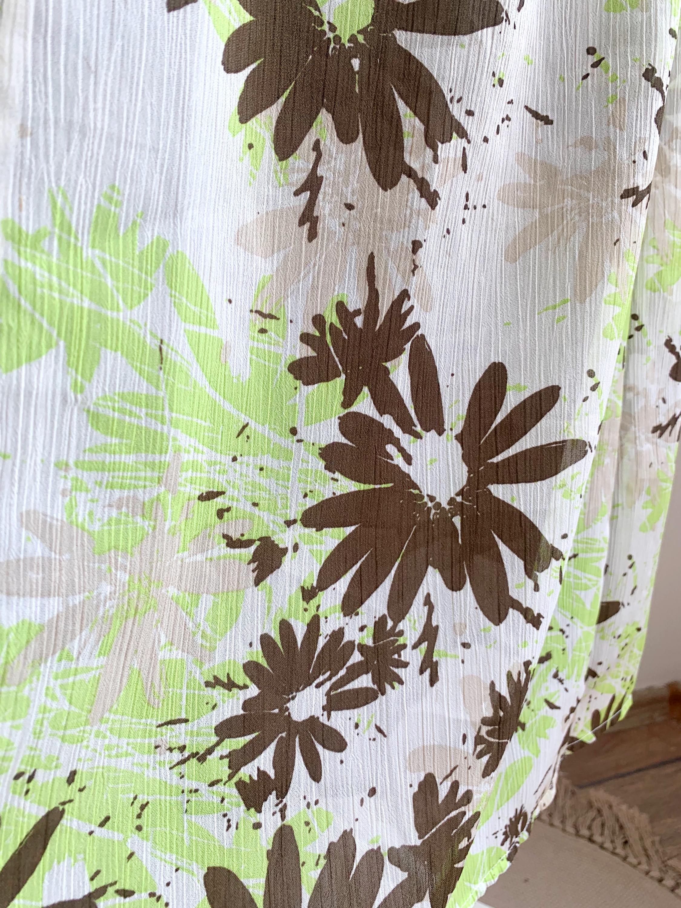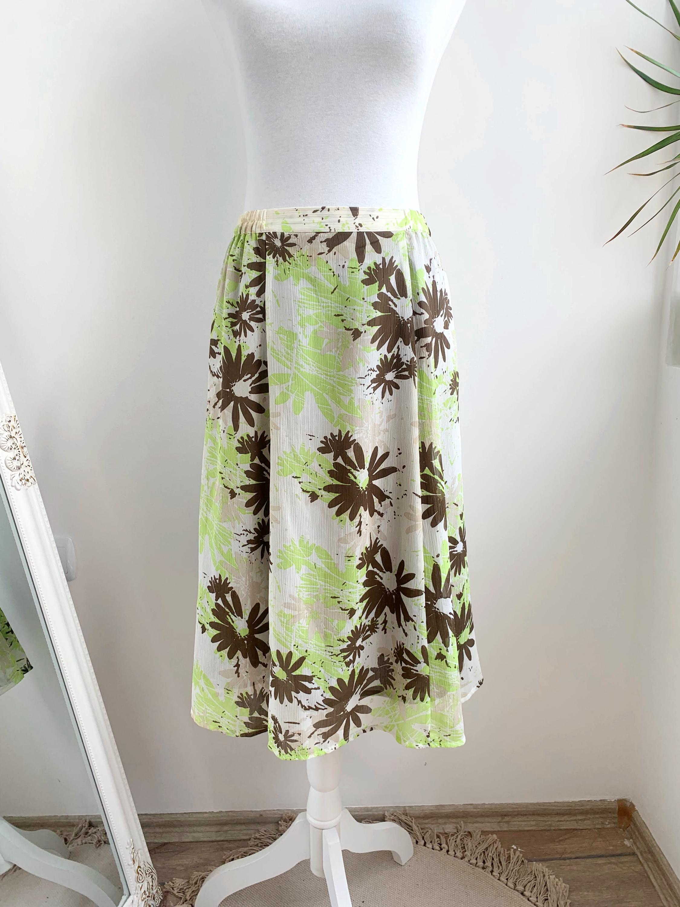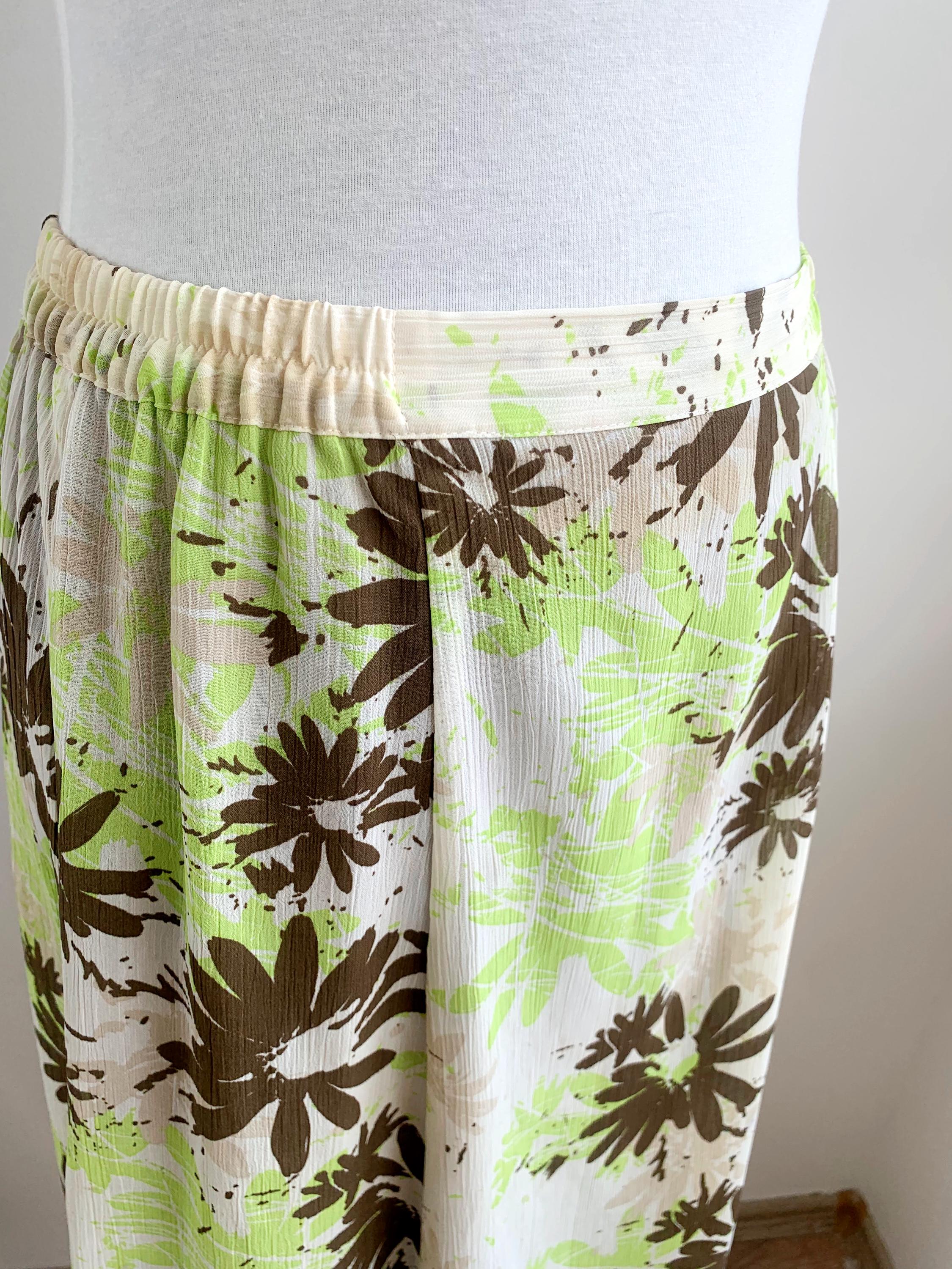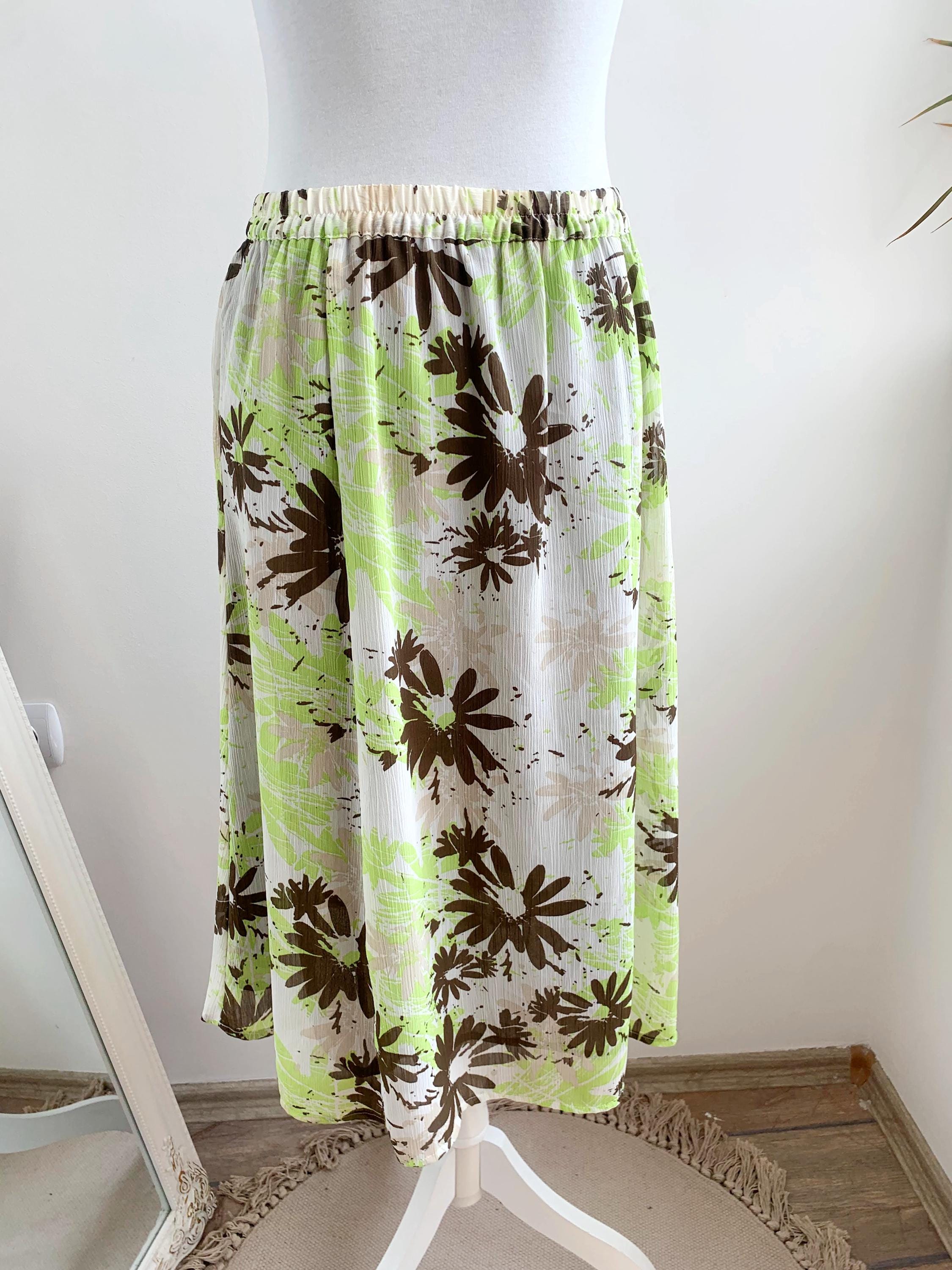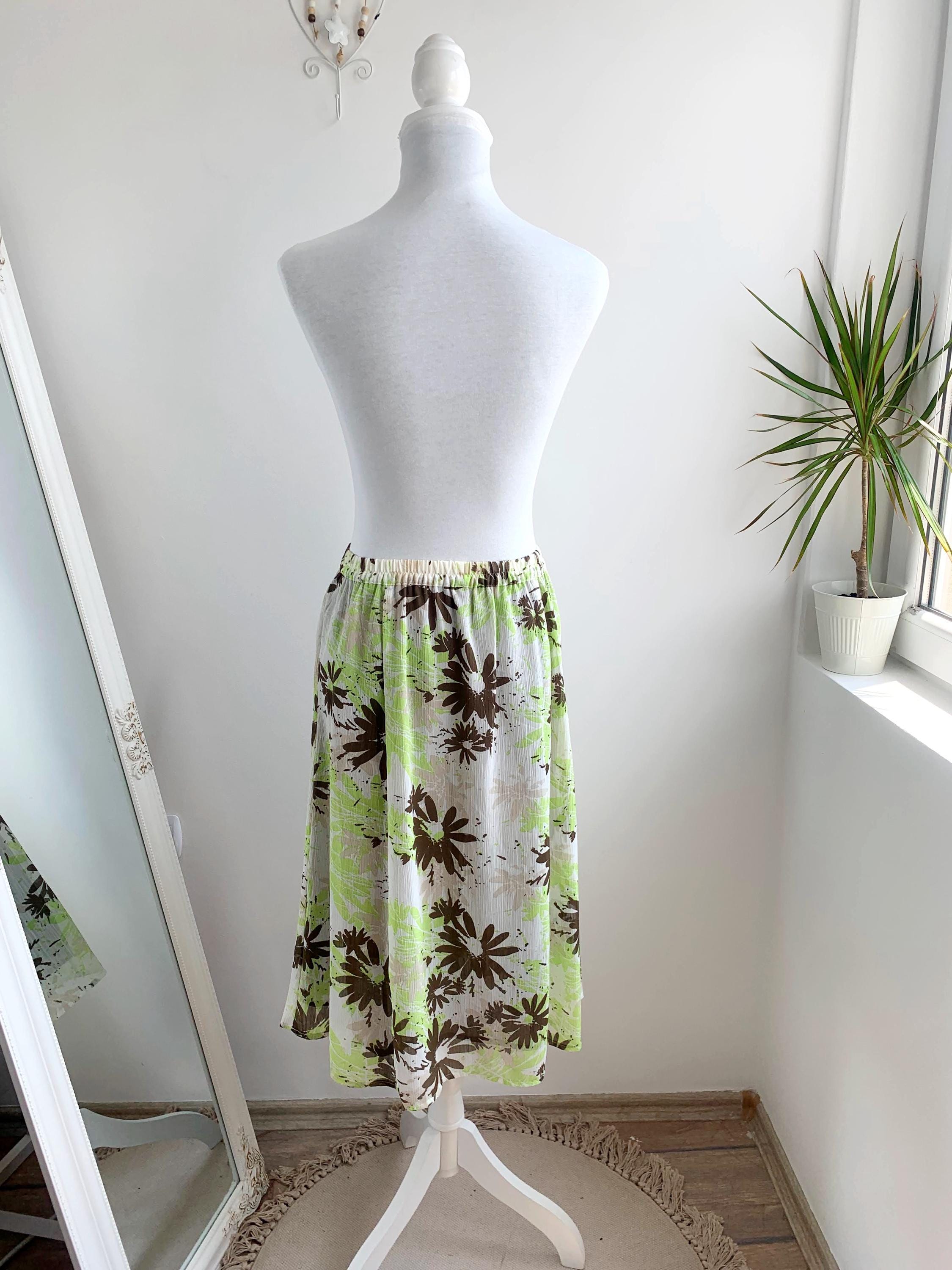 This charming skirt features a comfortable elasticated waistband and a flowing A-line silhouette, making it an easy and breezy addition to your vintage collection. It's adorned with a abstract floral pattern in a lively palette of lime green and rich brown against off-white background. The scattered, painterly style of the print gives it a modern, artistic touch.