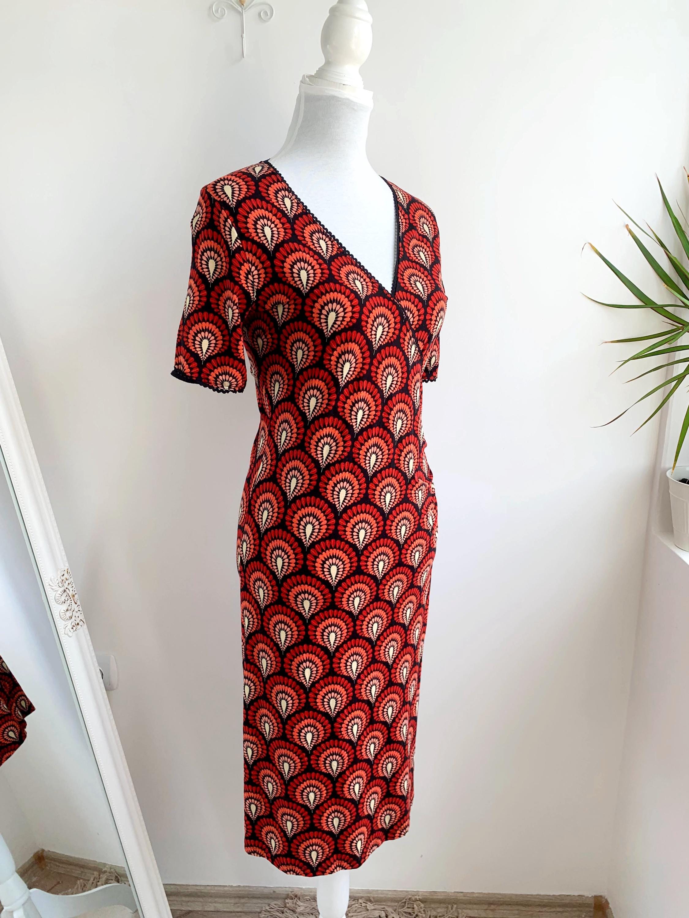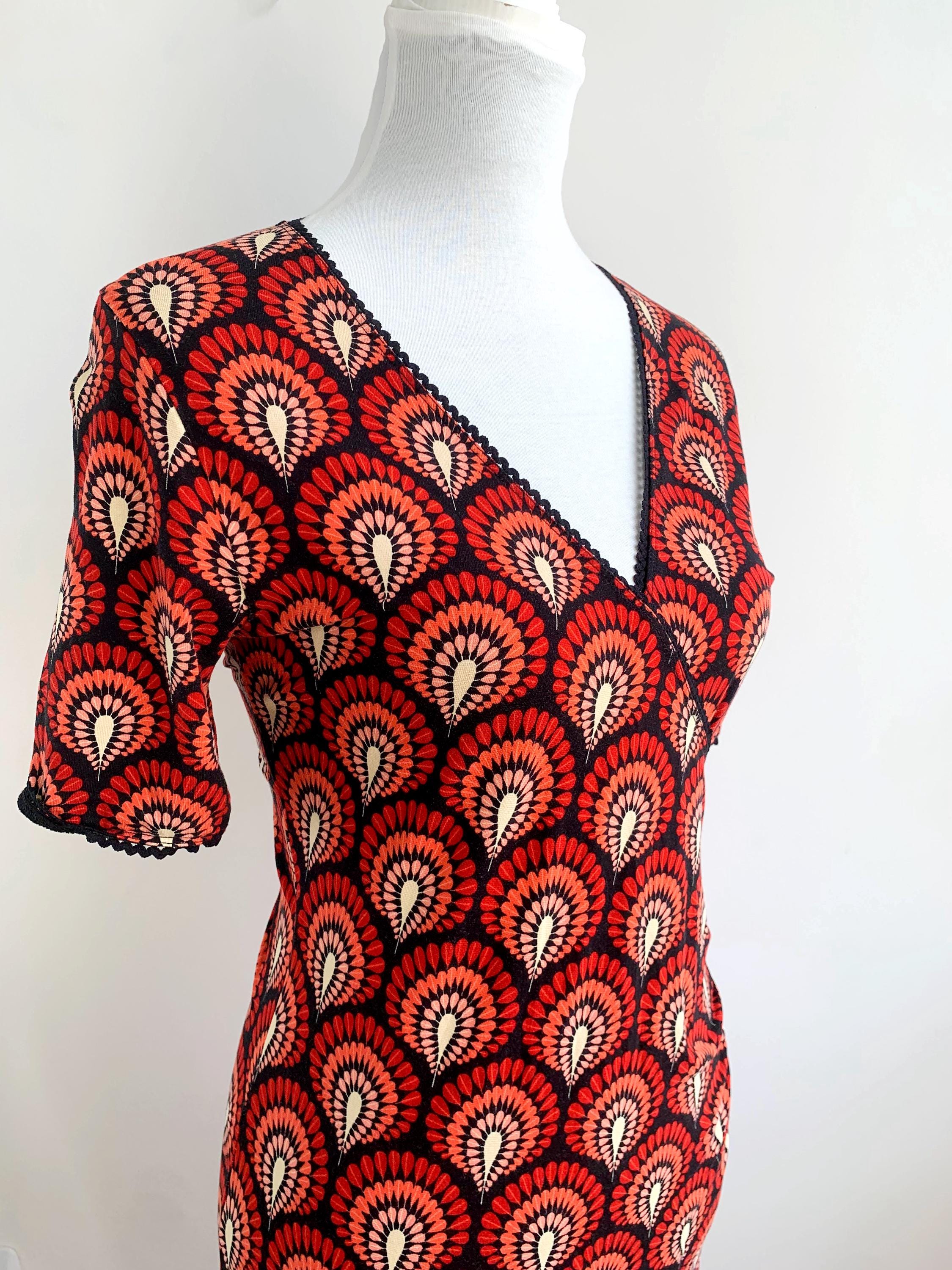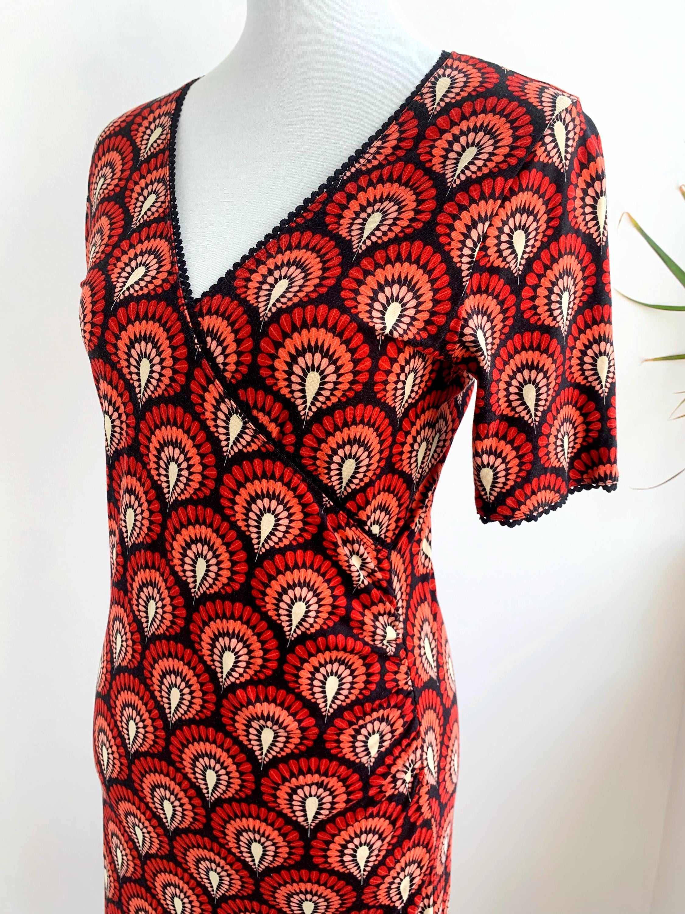 Step back in time with this stunning vintage 90s/ Y2K King Louie retro-inspired mock wrap dress in size S/M! This vibrant piece features a captivating all-over fan or peacock feather print in shades of red, coral, peach, and cream against a deep black background. The repeating pattern creates a mesmerizing effect, reminiscent of Art Deco aesthetics or bohemian motifs.