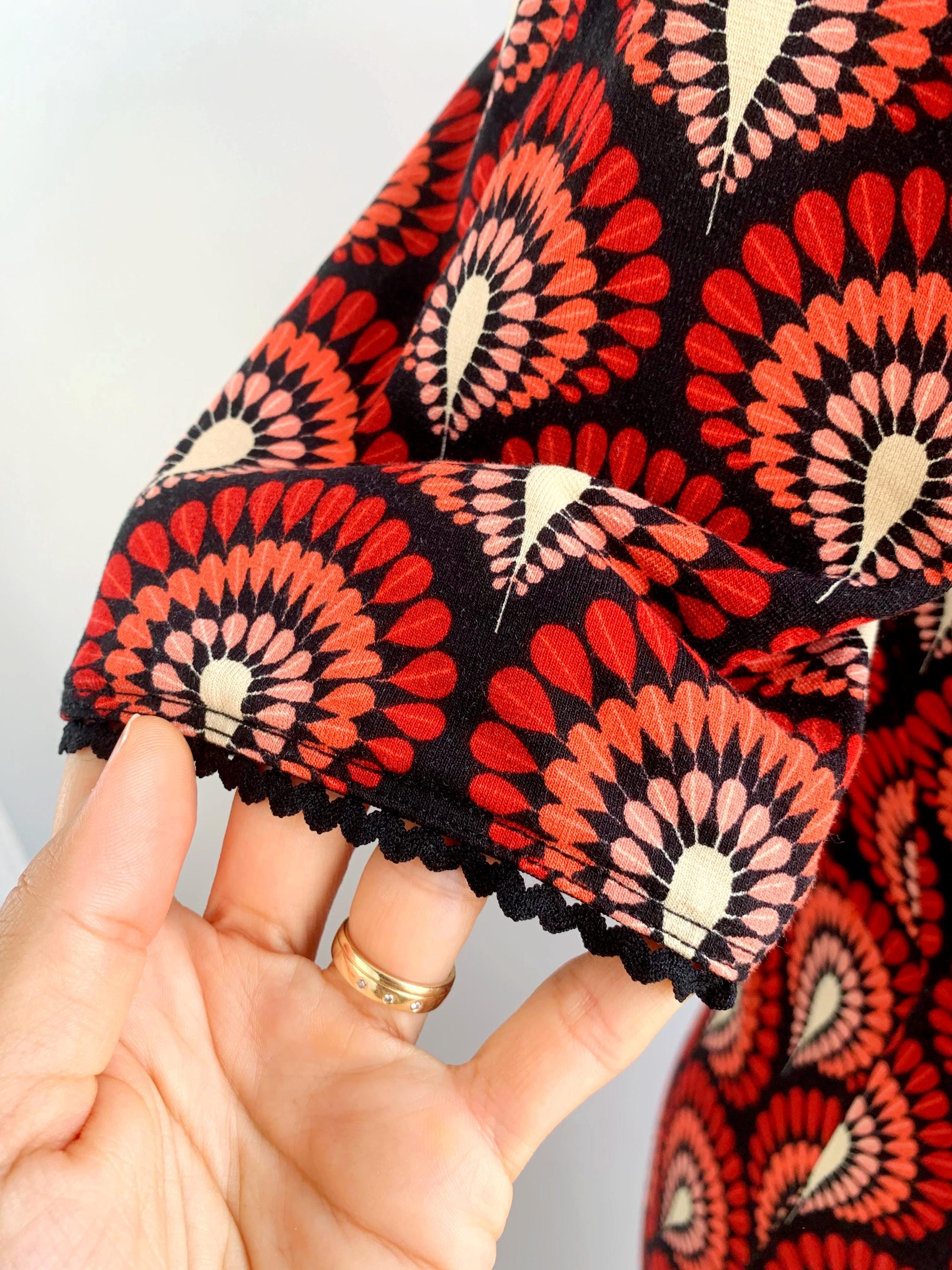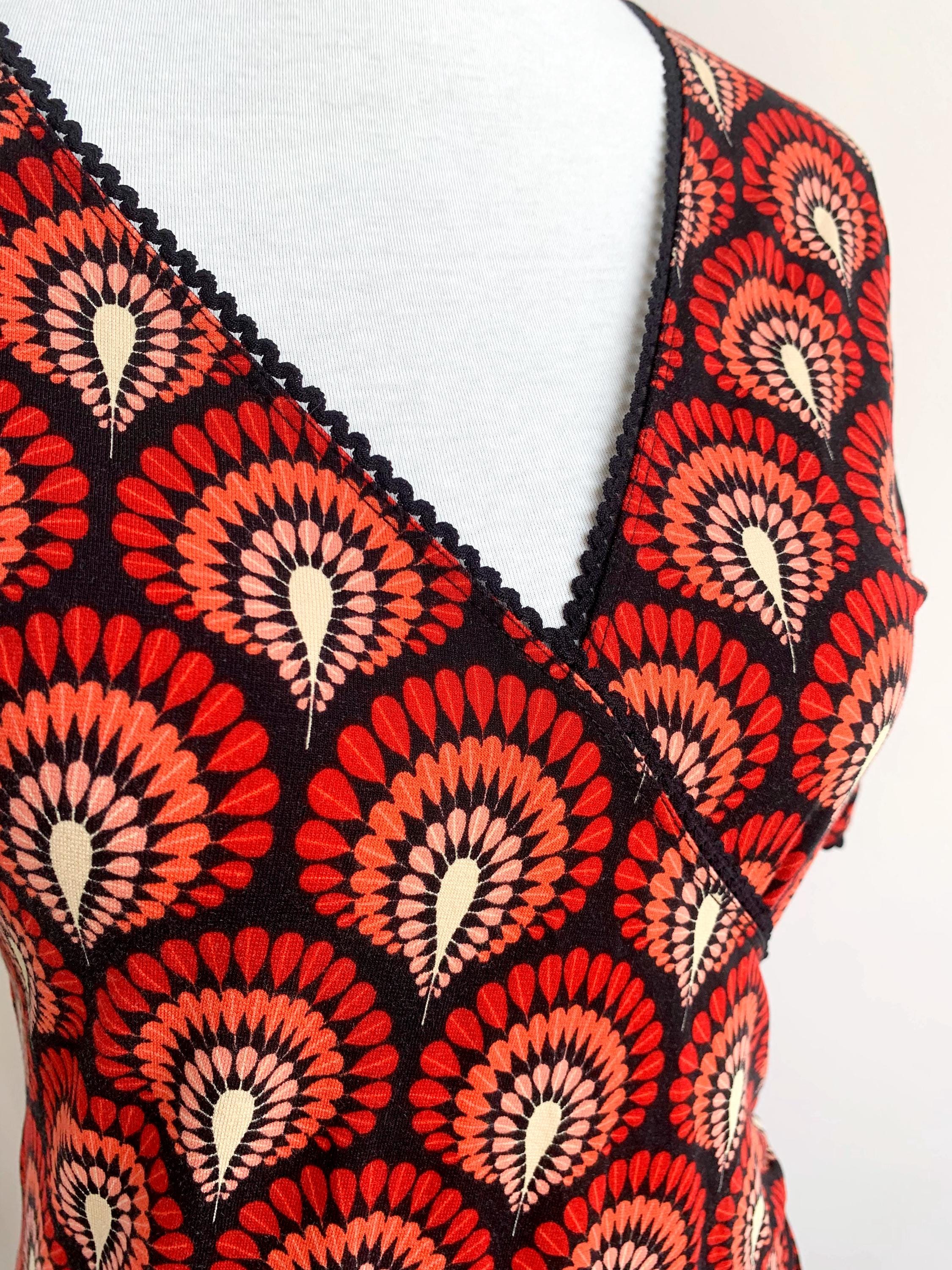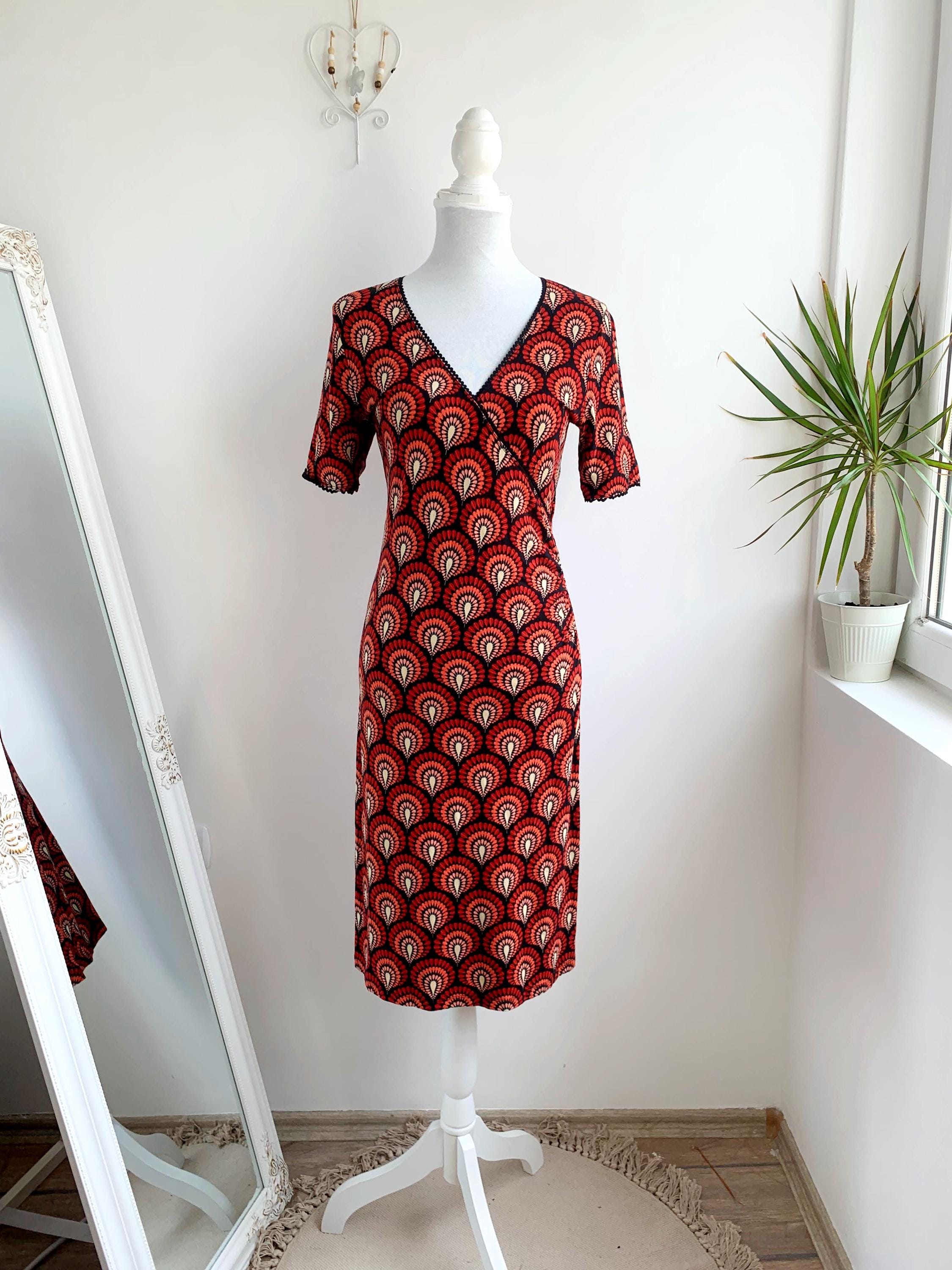 Step back in time with this stunning vintage 90s/ Y2K King Louie retro-inspired mock wrap dress in size S/M! This vibrant piece features a captivating all-over fan or peacock feather print in shades of red, coral, peach, and cream against a deep black background. The repeating pattern creates a mesmerizing effect, reminiscent of Art Deco aesthetics or bohemian motifs.