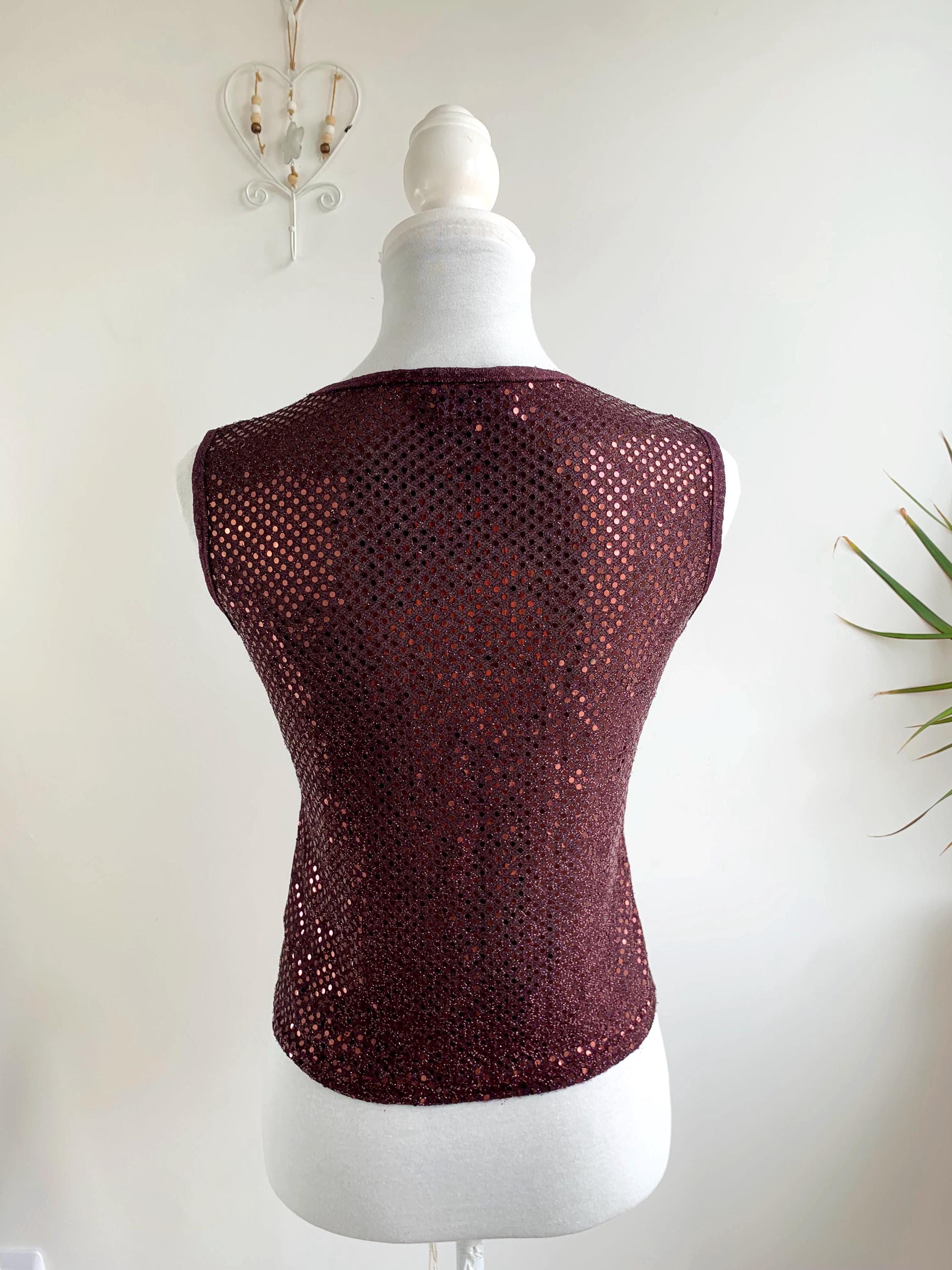 This top is a true throwback to 90s and Y2K clubwear and party fashion, radiating undeniable disco glam. It's perfect for a night out, a festival, a costume, or simply adding a touch of bold sparkle to your everyday look. Layer it under a blazer for a more subtle shimmer, or let it shine on its own!