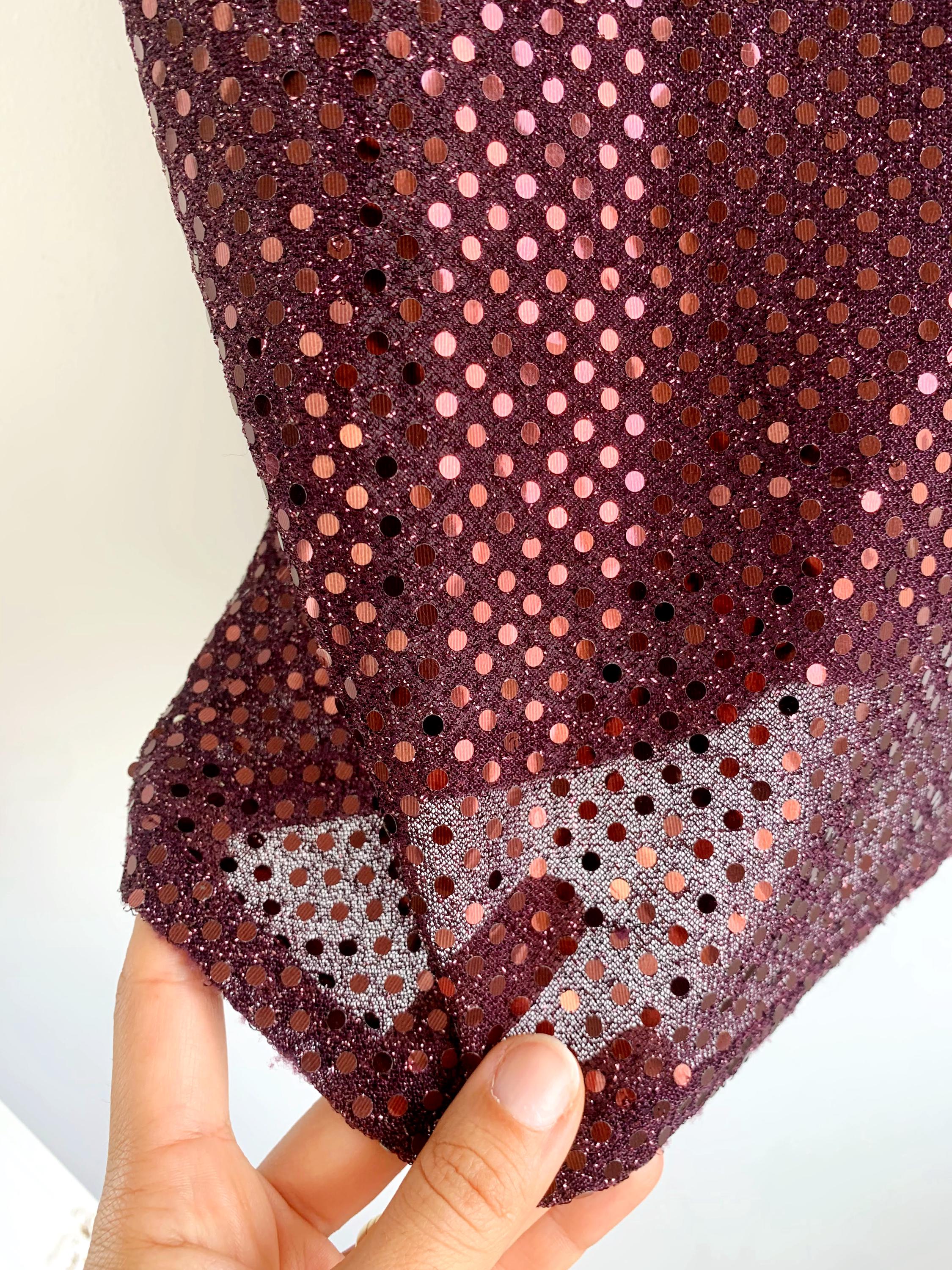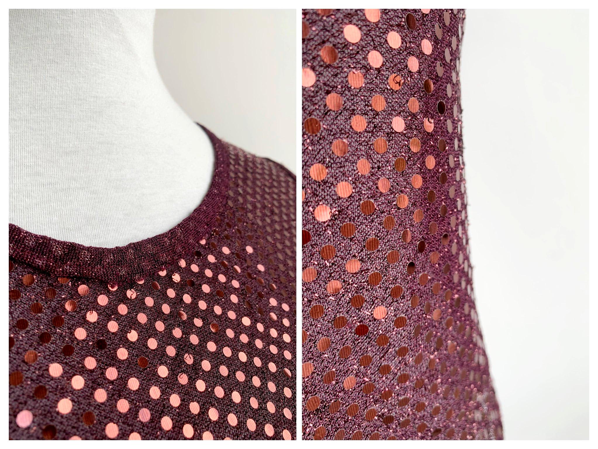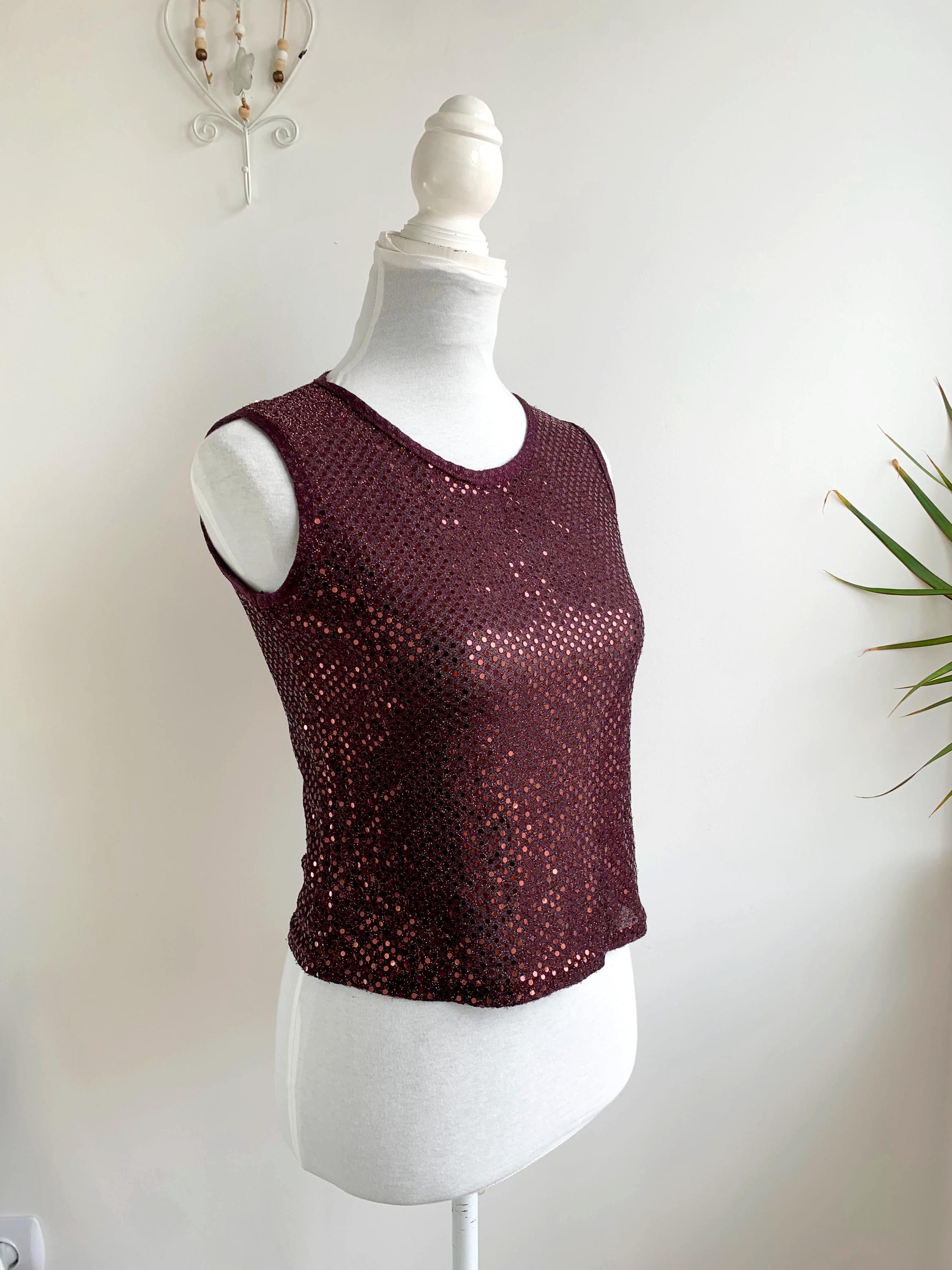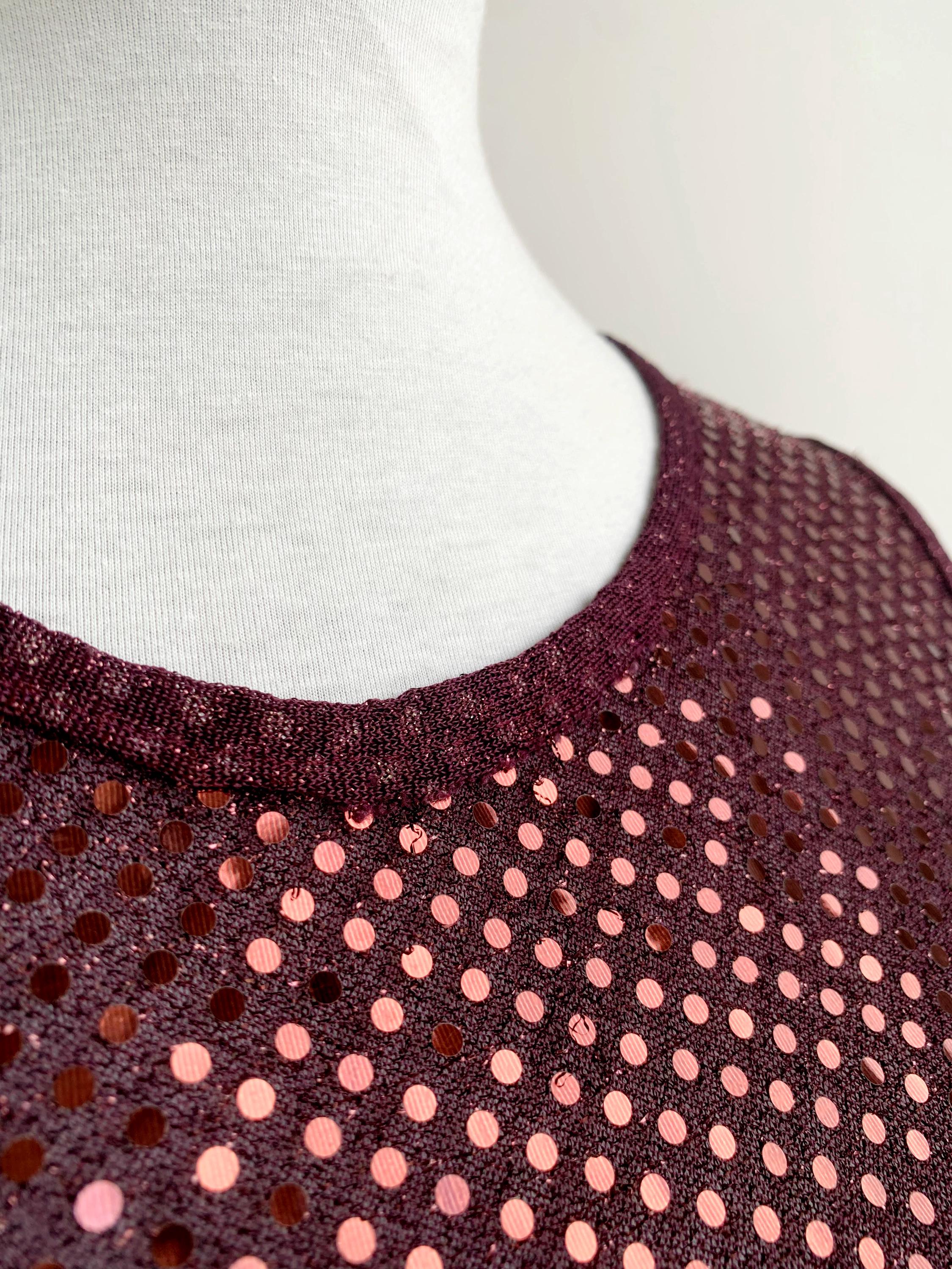 This eye-catching sleeveless top features a classic scoop neckline and a comfortable, figure-flattering cropped fit, perfect for making an entrance. It's adorned with countless small, shimmering rose gold or reddish-copper sequins against a rich maroon/burgundy sheer base, creating an all-over dazzling effect that catches the light beautifully.