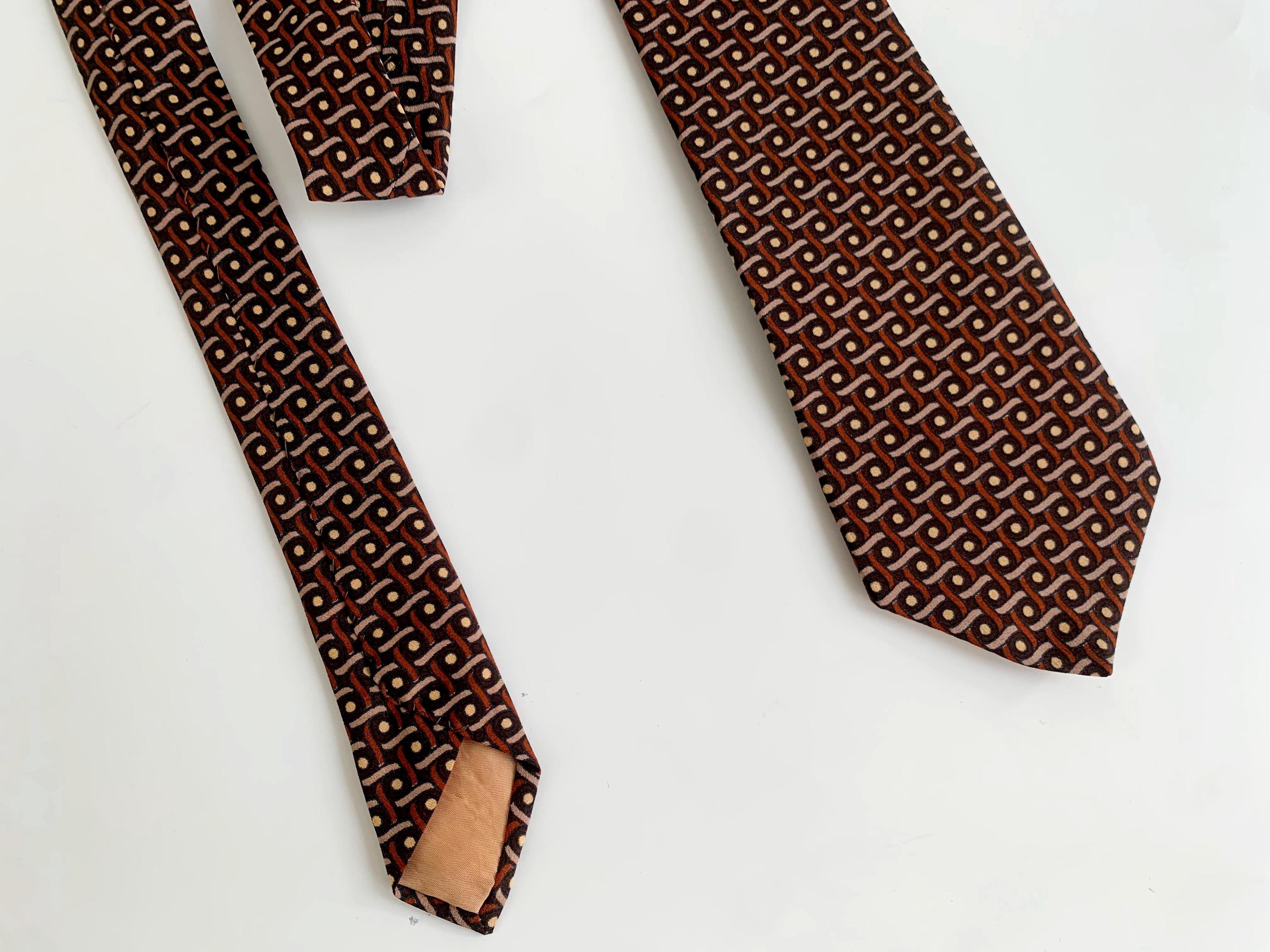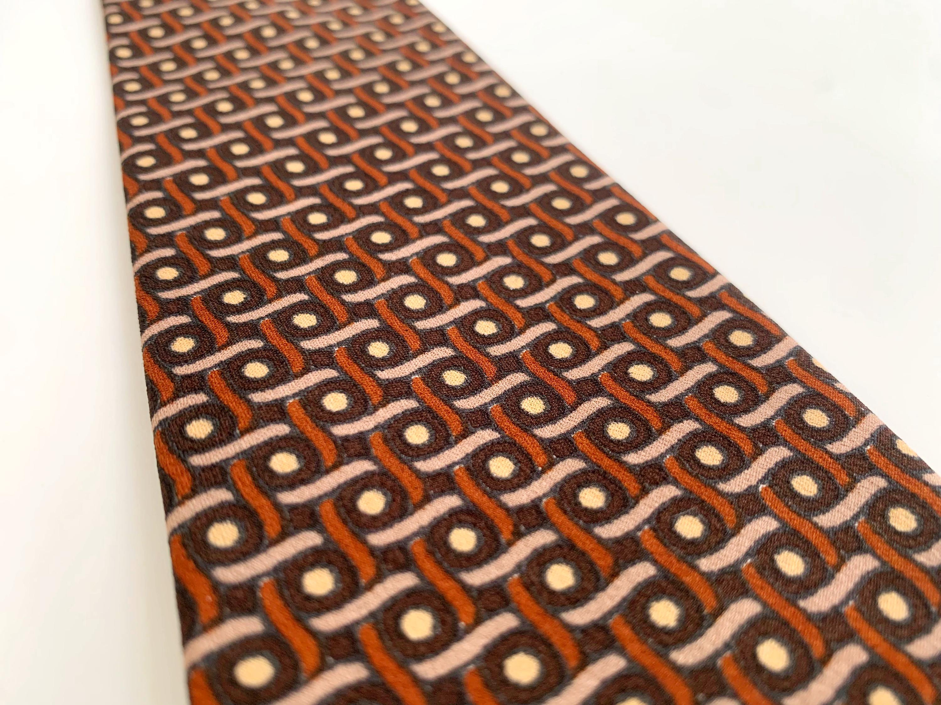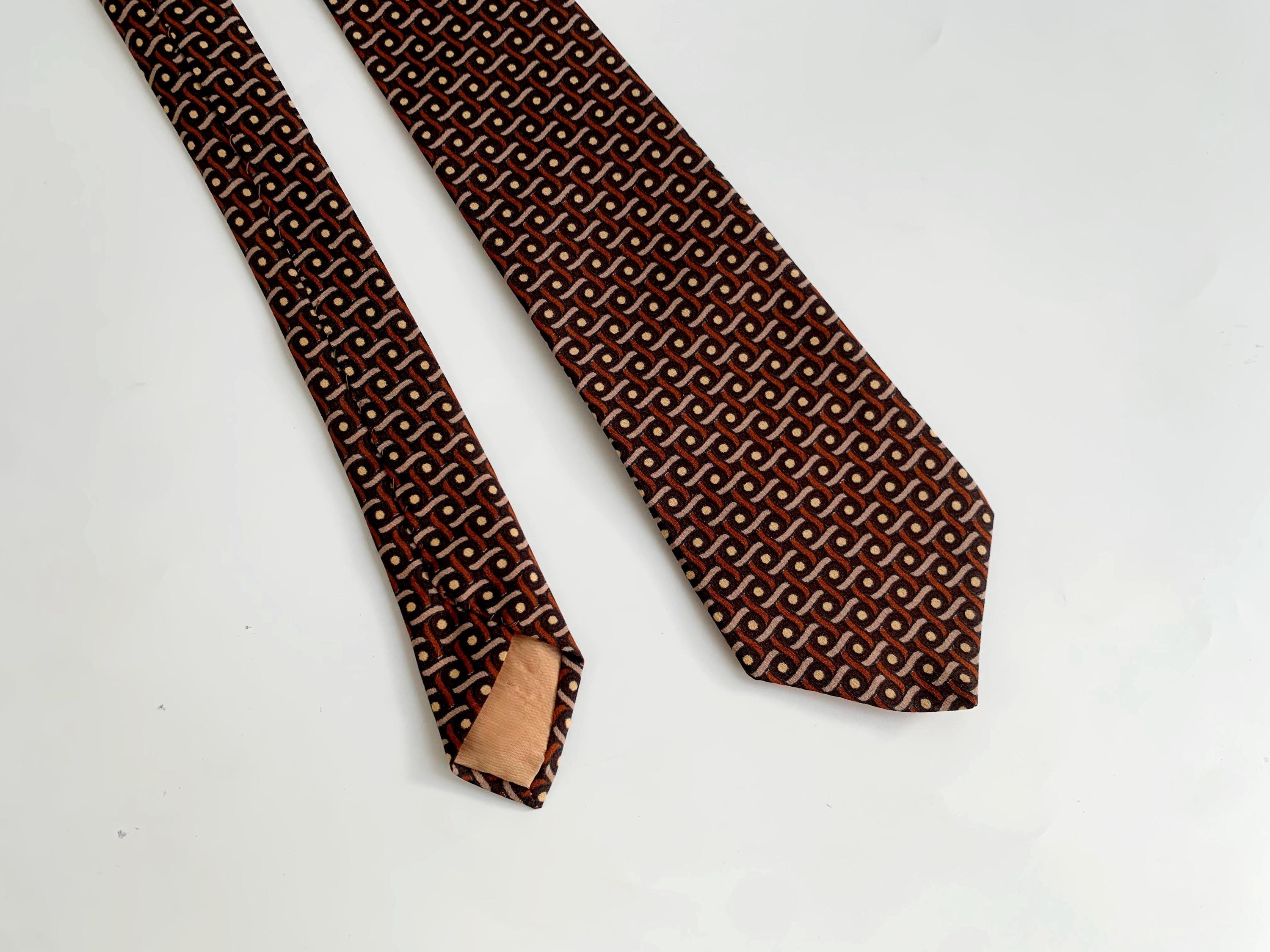 Add a touch of refined vintage style to your wardrobe with this sophisticated necktie, dating from the 1970s or early 1980s. This tie features a captivating, all-over geometric pattern of interlocking wave-like shapes and small circles or dots, creating a subtle yet interesting visual texture.