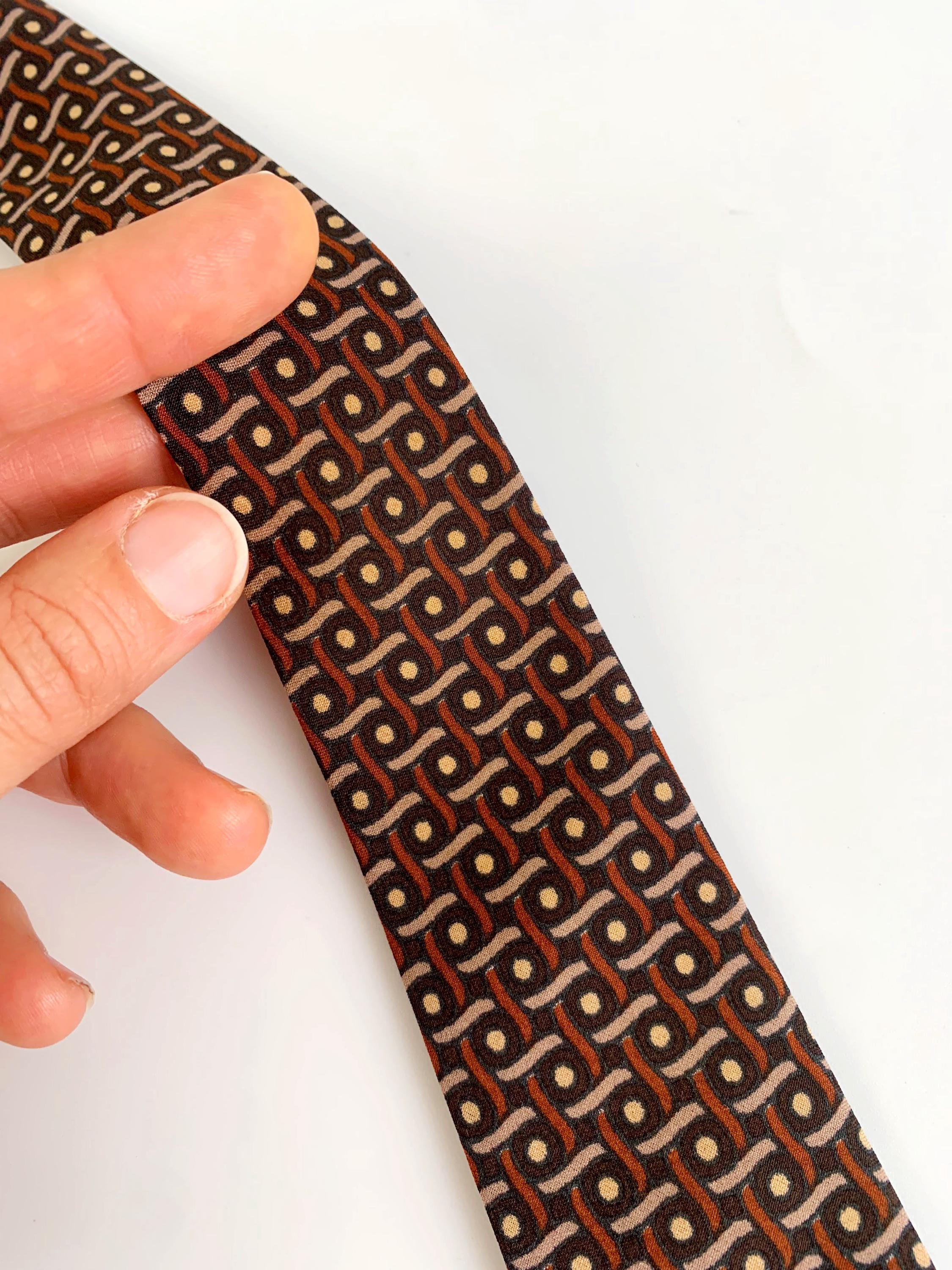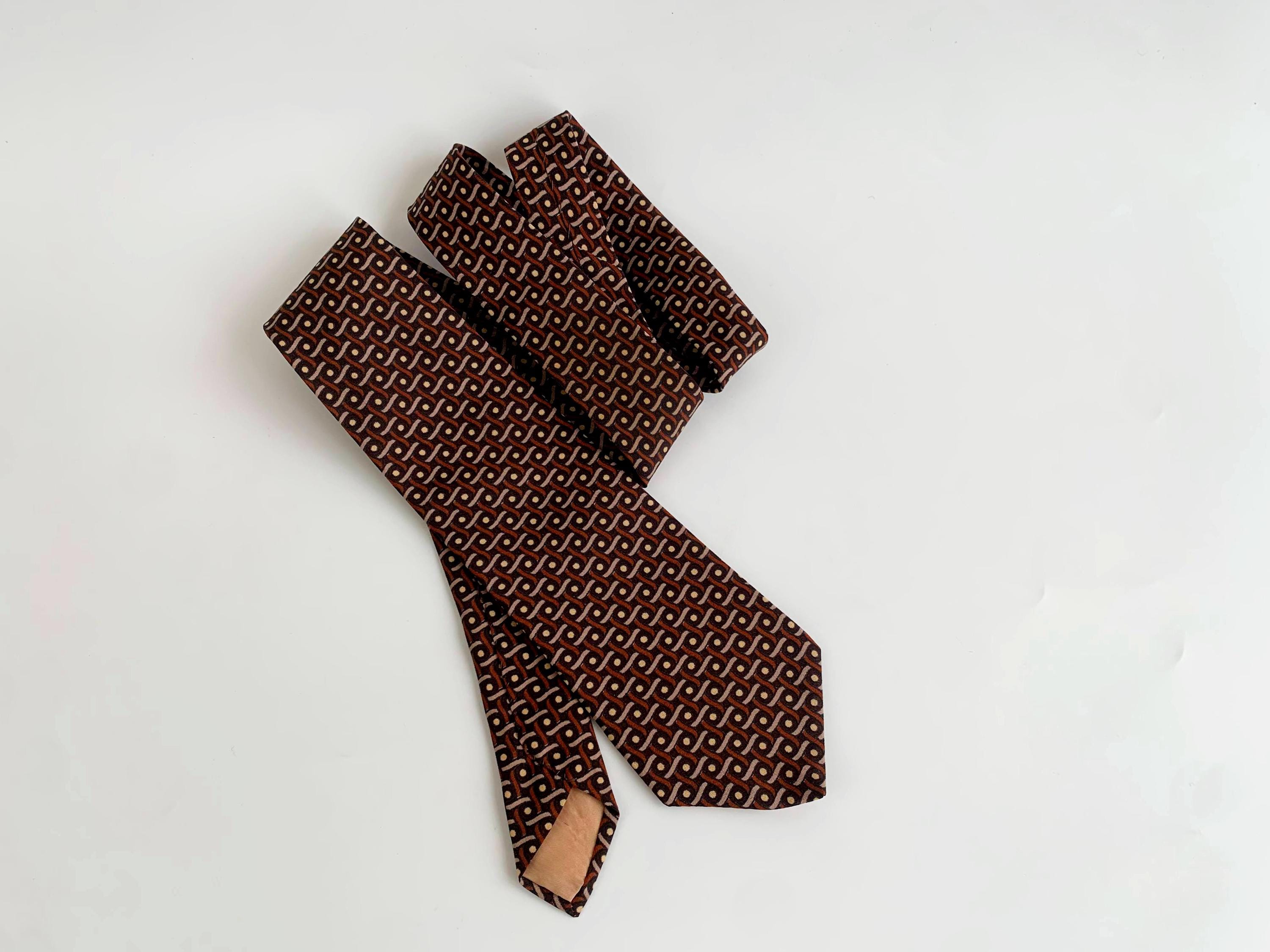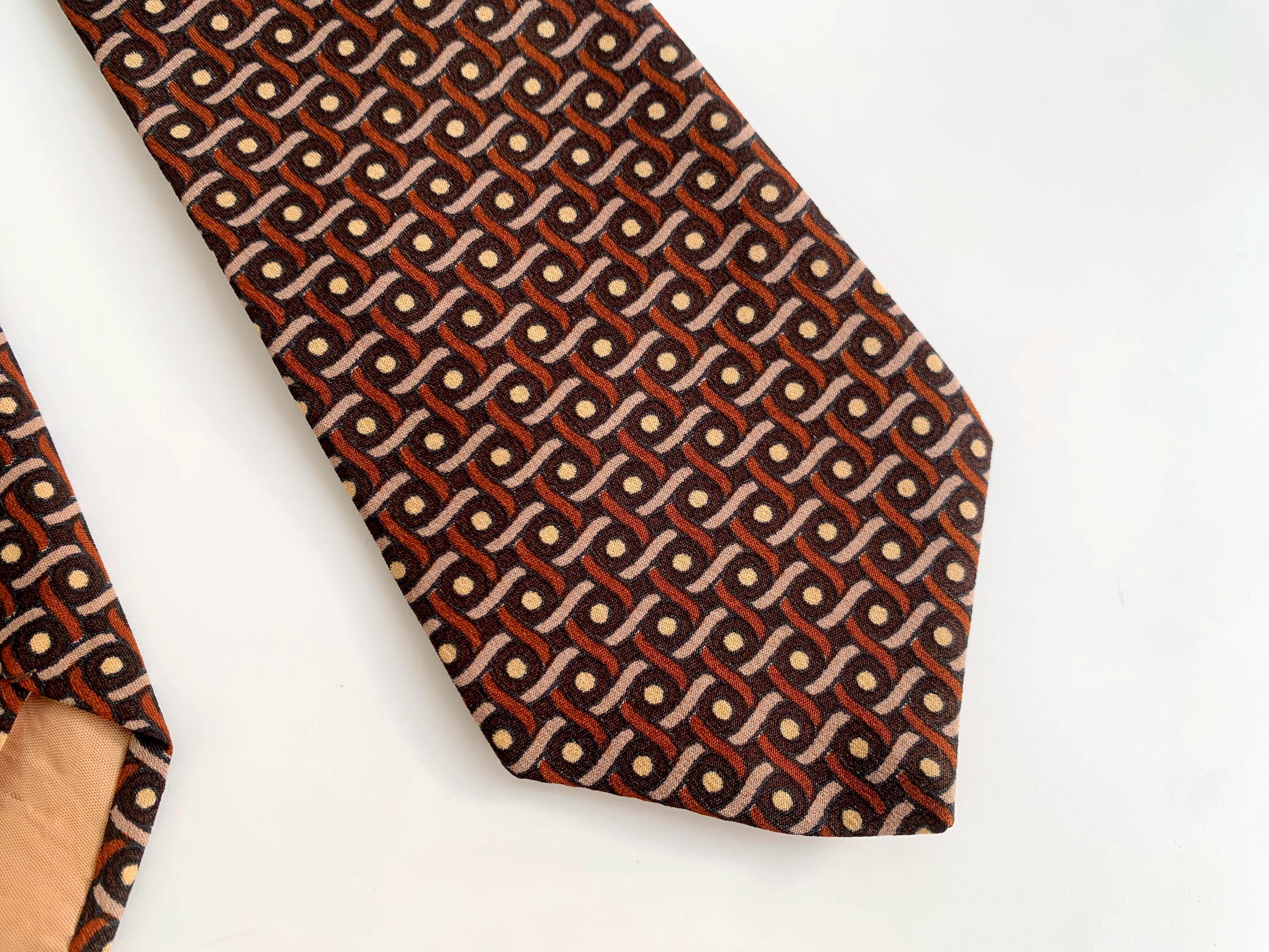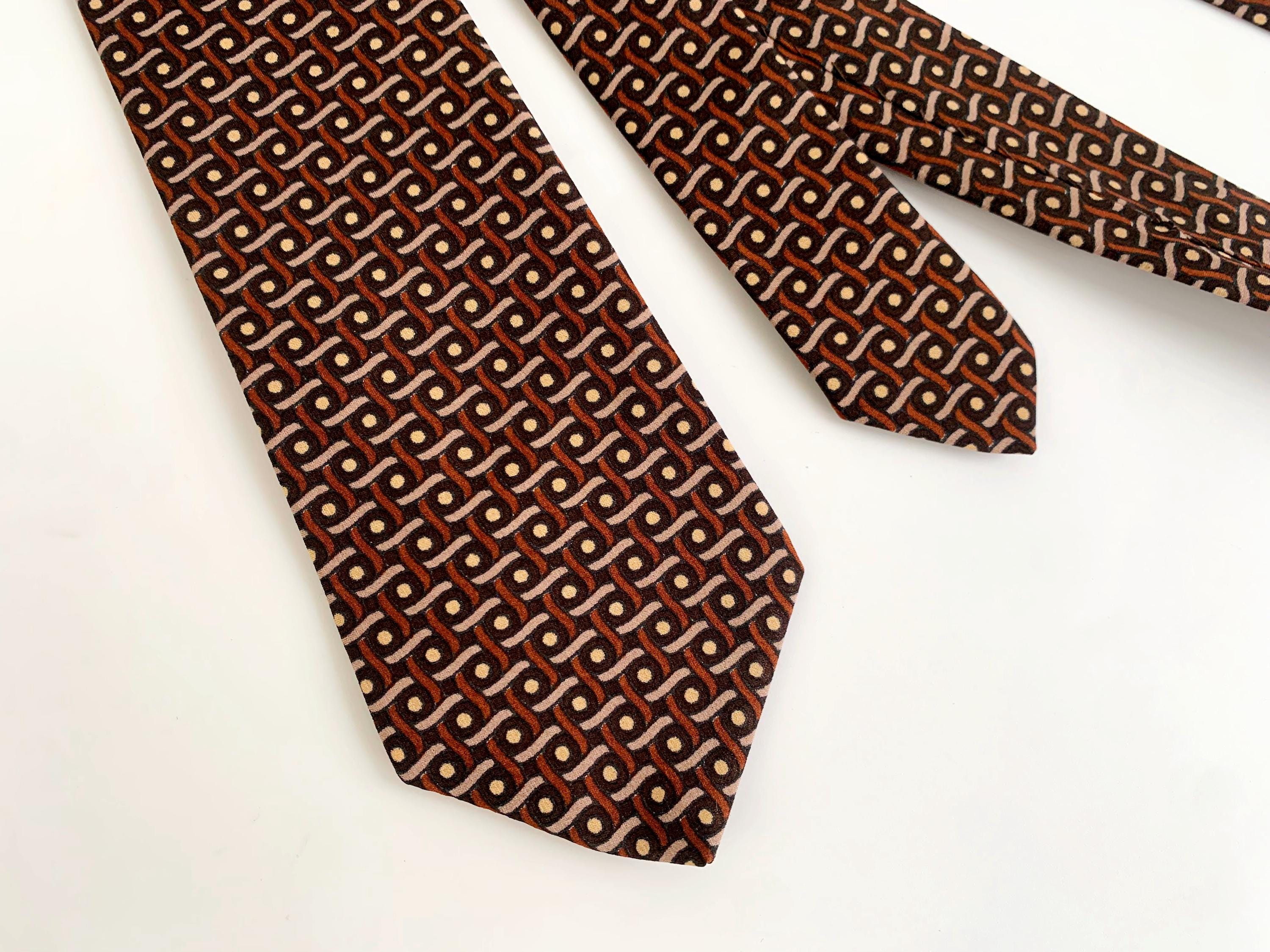 Add a touch of refined vintage style to your wardrobe with this sophisticated necktie, dating from the 1970s or early 1980s. This tie features a captivating, all-over geometric pattern of interlocking wave-like shapes and small circles or dots, creating a subtle yet interesting visual texture.