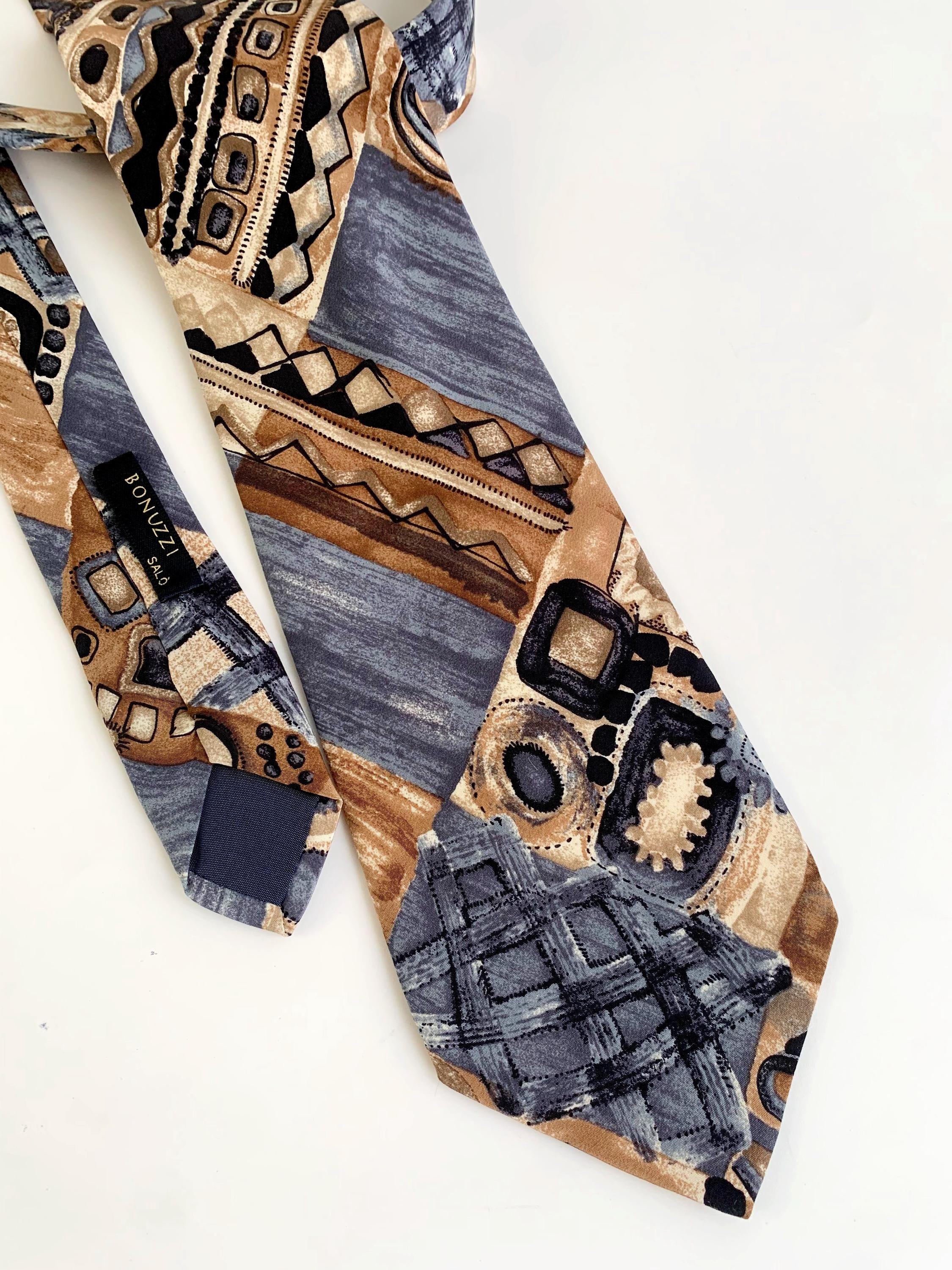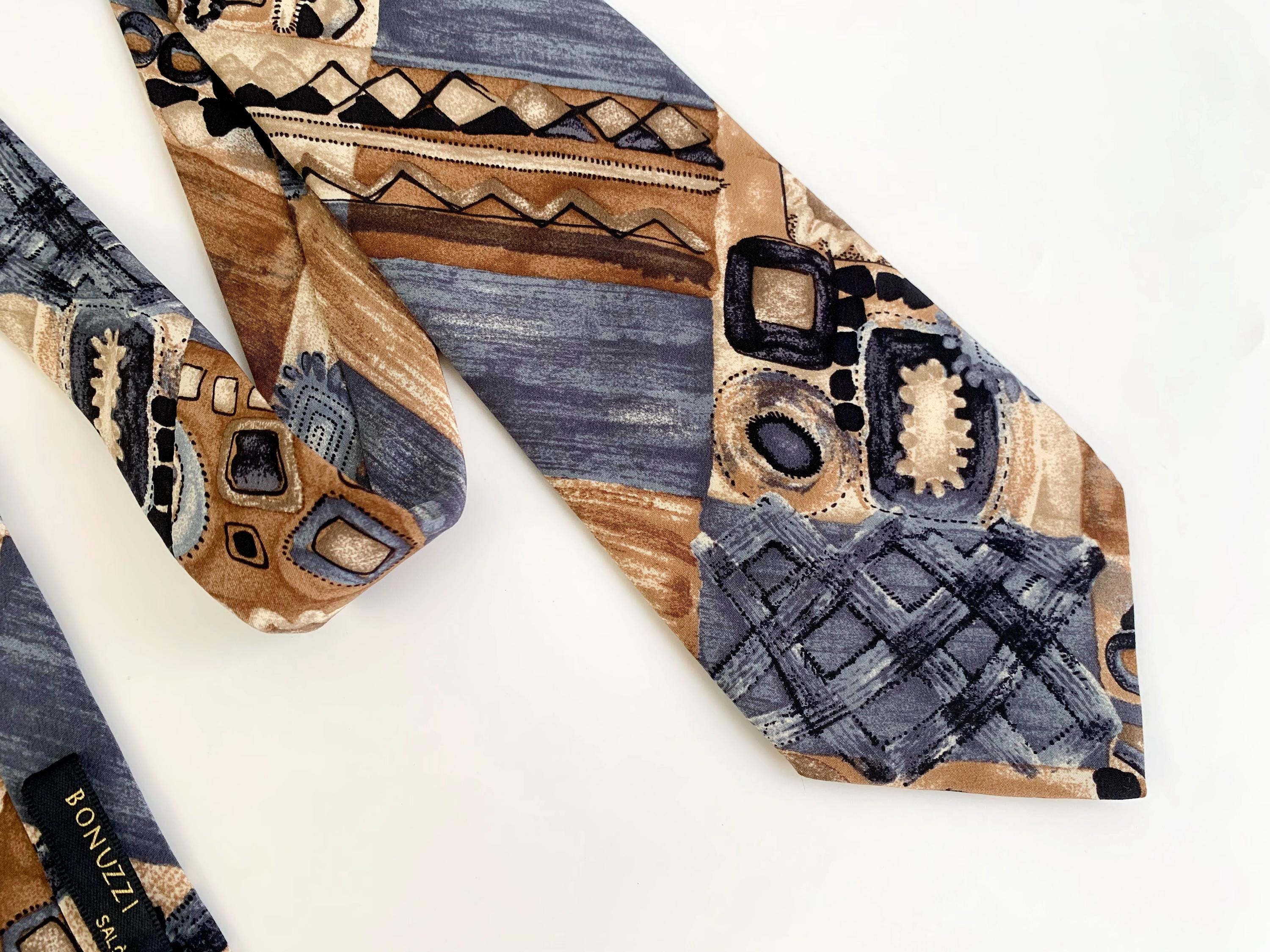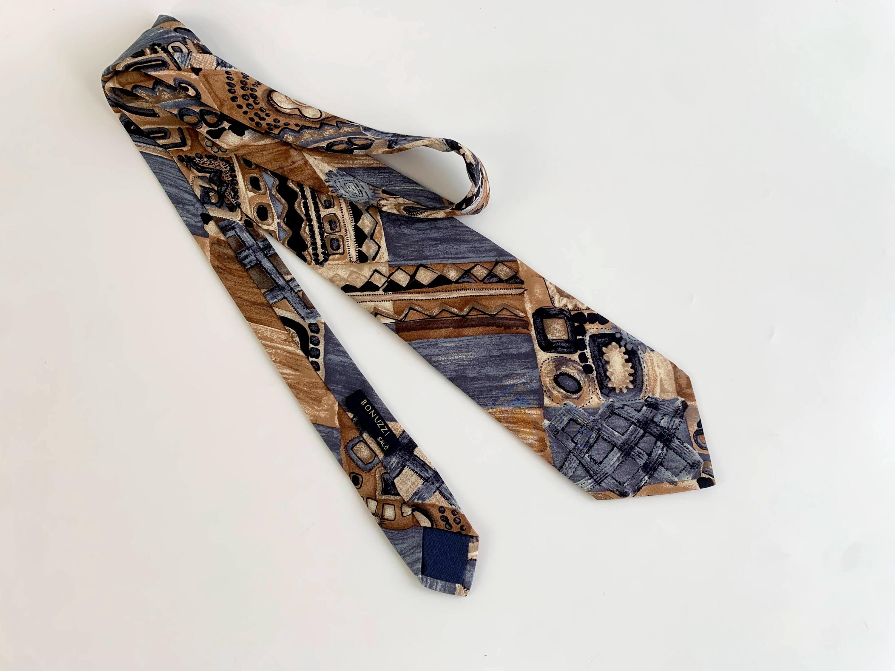 Make a sophisticated statement with this distinctive vintage silk necktie, a testament to Italian design and craftsmanship! This tie features an intriguing abstract geometric pattern, reminiscent of postmodern art, combining various shapes, textures, and lines. The design creates a unique visual flow across the fabric.