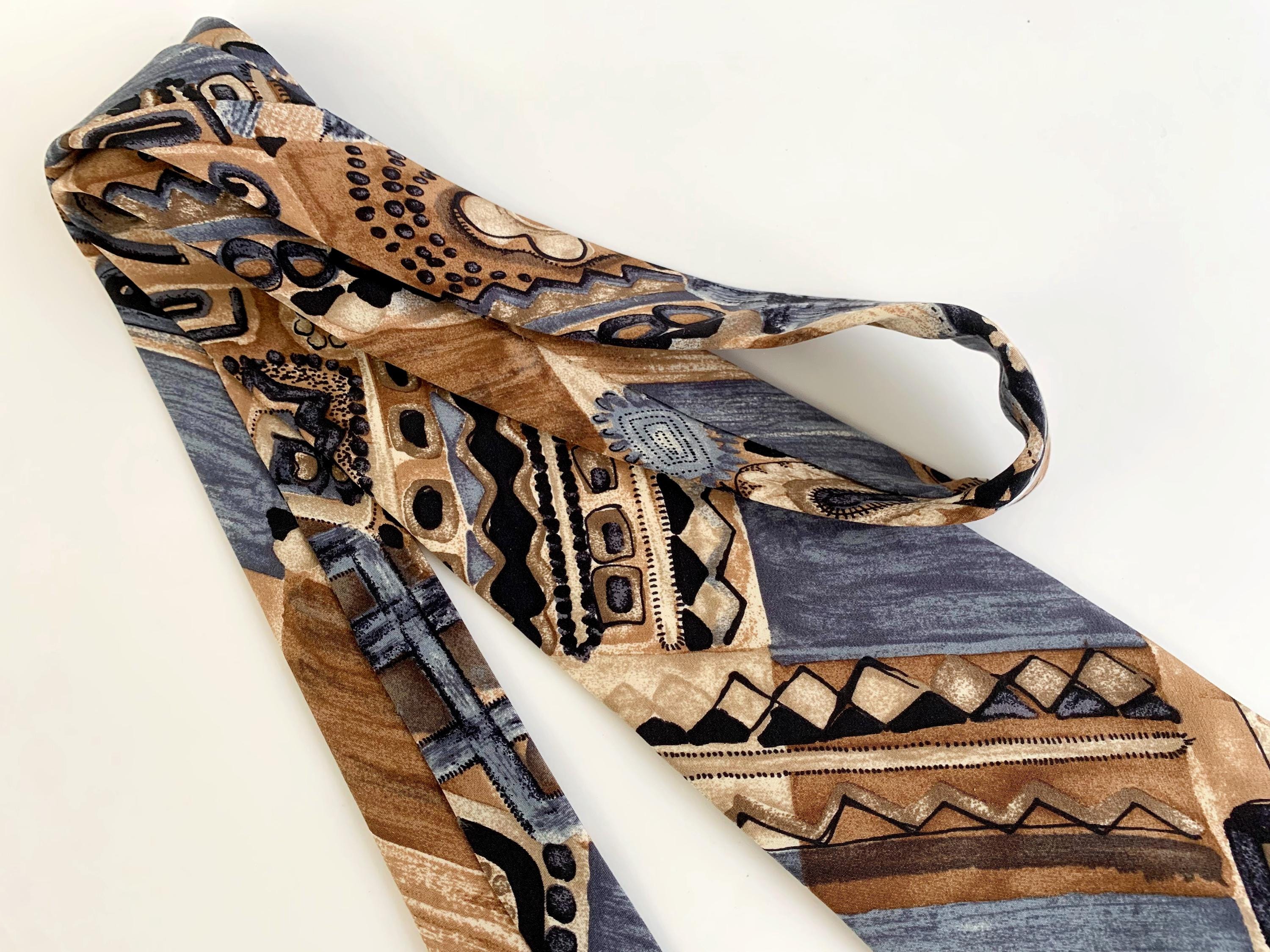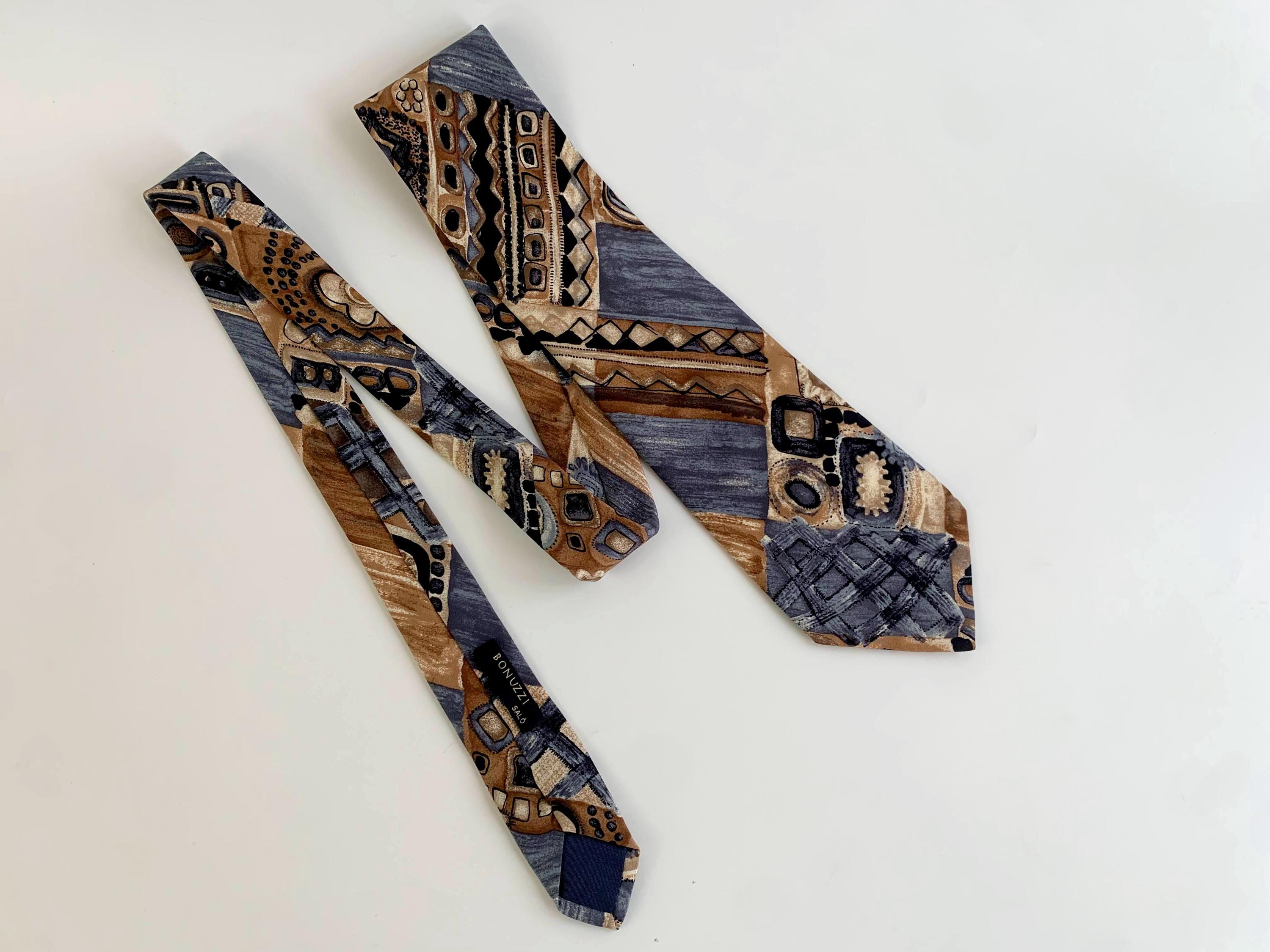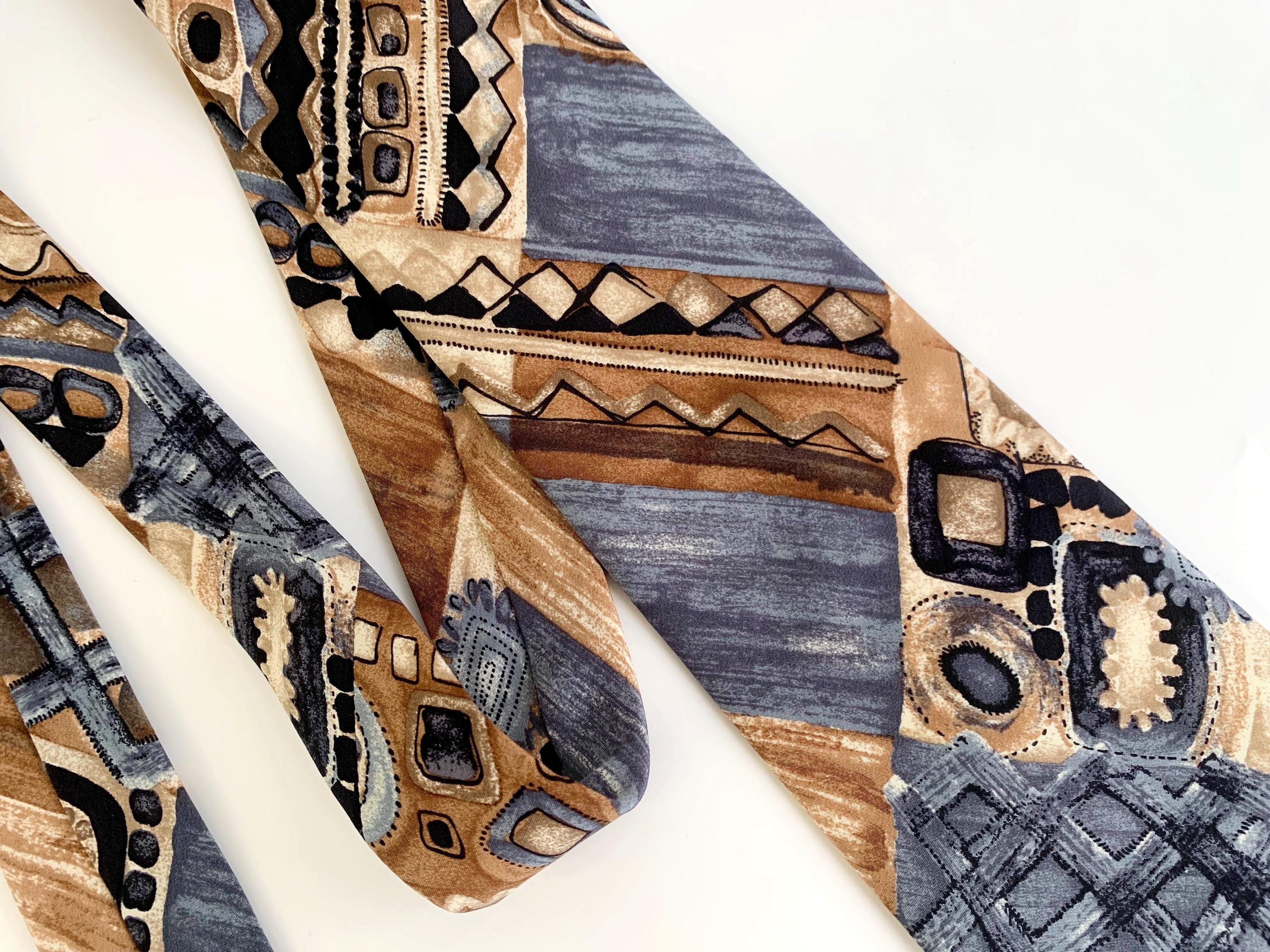 Make a sophisticated statement with this distinctive vintage silk necktie, a testament to Italian design and craftsmanship! This tie features an intriguing abstract geometric pattern, reminiscent of postmodern art, combining various shapes, textures, and lines. The design creates a unique visual flow across the fabric.
