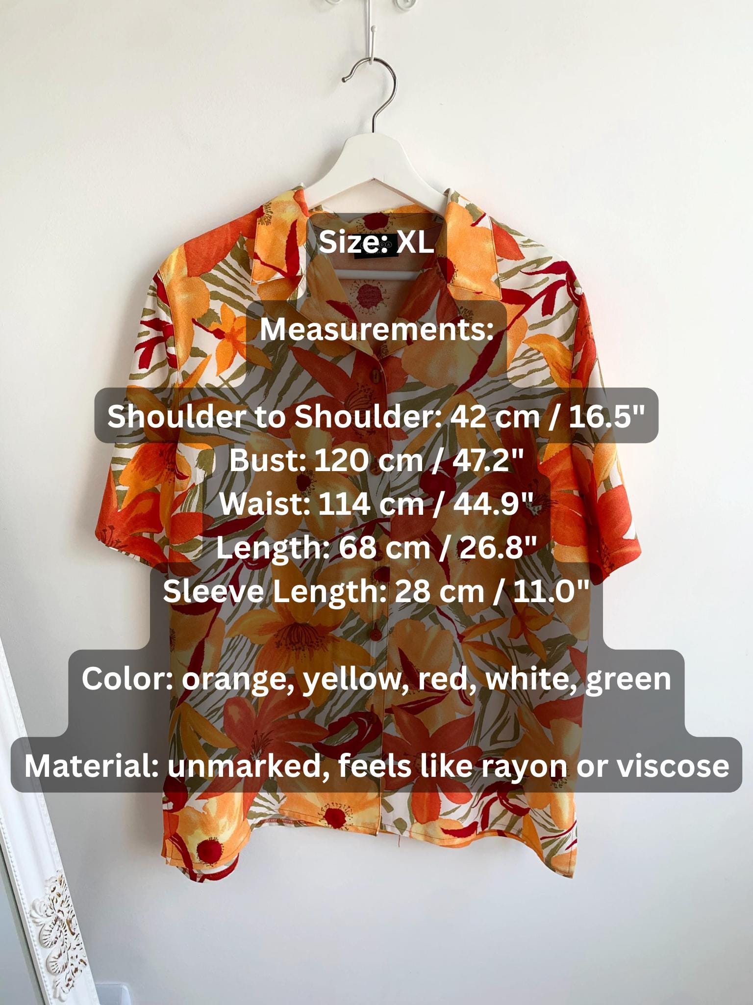 Step into summer with this vibrant and eye-catching vintage 90s tropical button-up shirt for women in size XL! This short-sleeve top features a bold, all-over tropical print that radiates sunshine and good vibes.