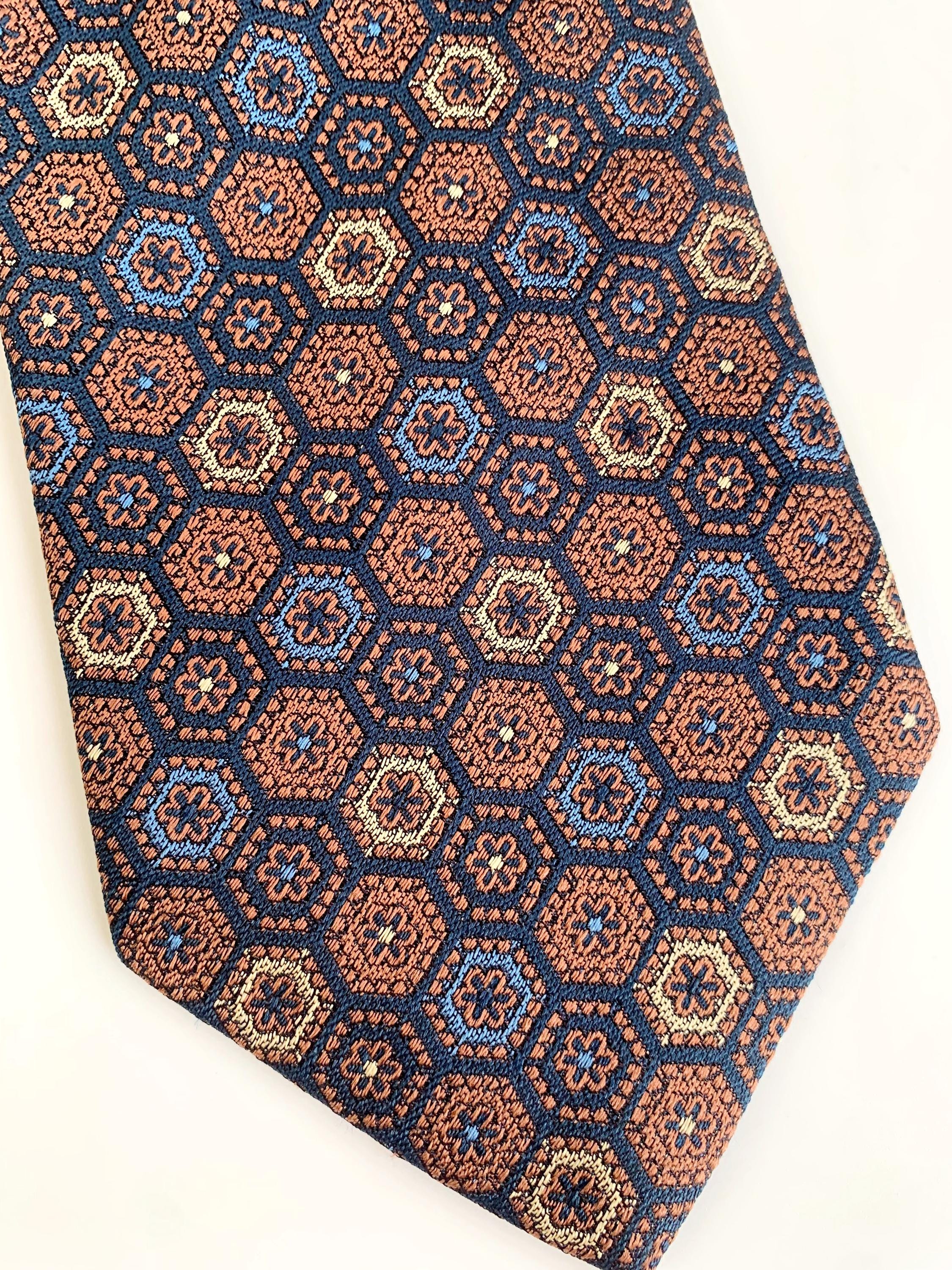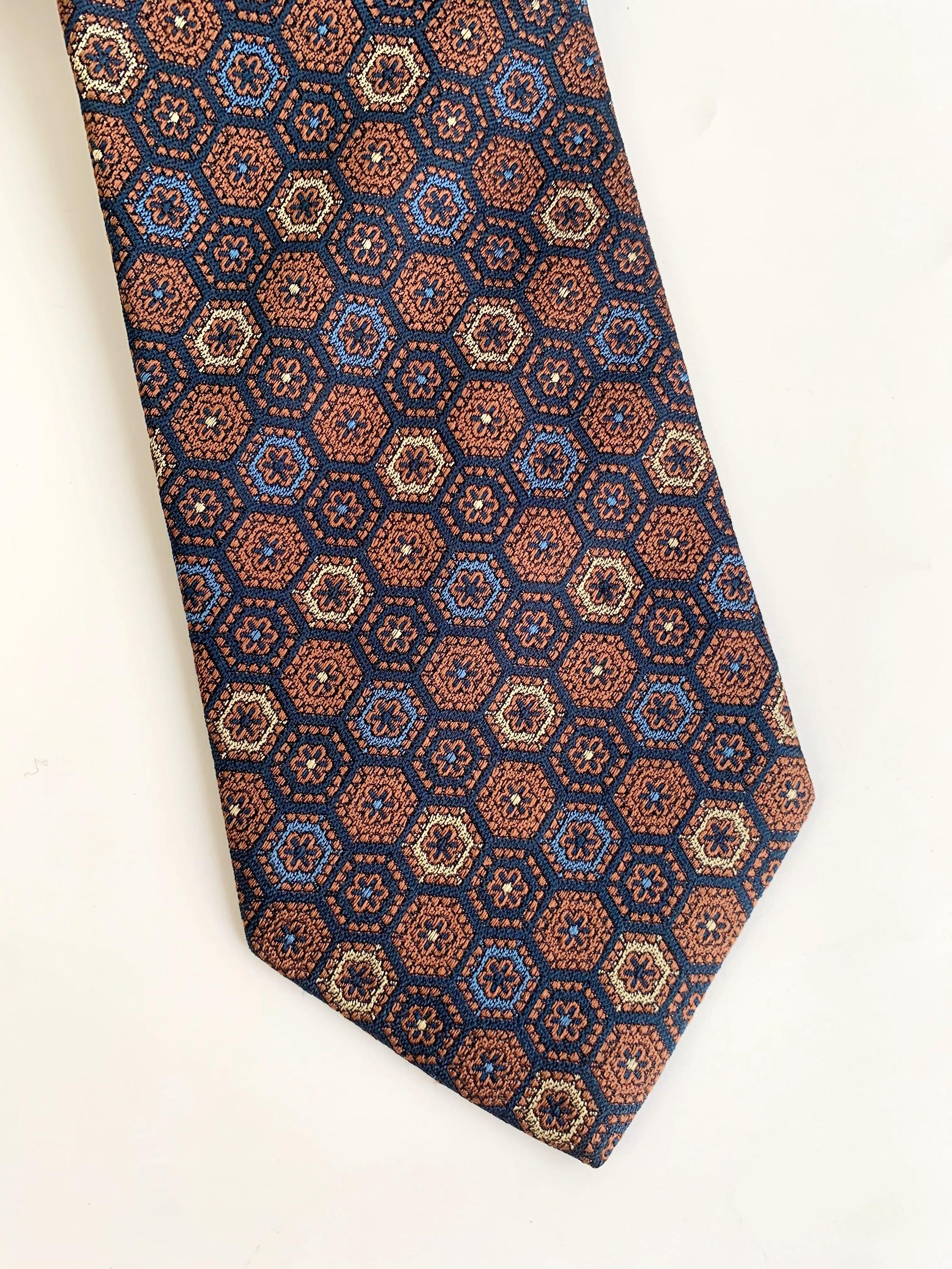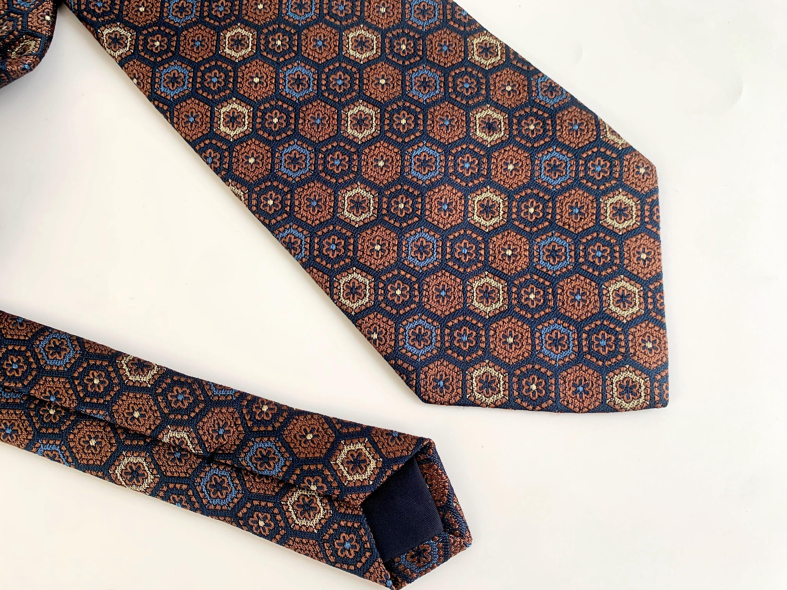 The sophisticated color palette includes shades of deep navy blue, rich rust terracotta brown, subtle gold, and hints of lighter blue, creating a refined yet dynamic look. Made from 100% silk, the tie boasts a luxurious feel, a beautiful drape, and a subtle sheen that catches the light beautifully.