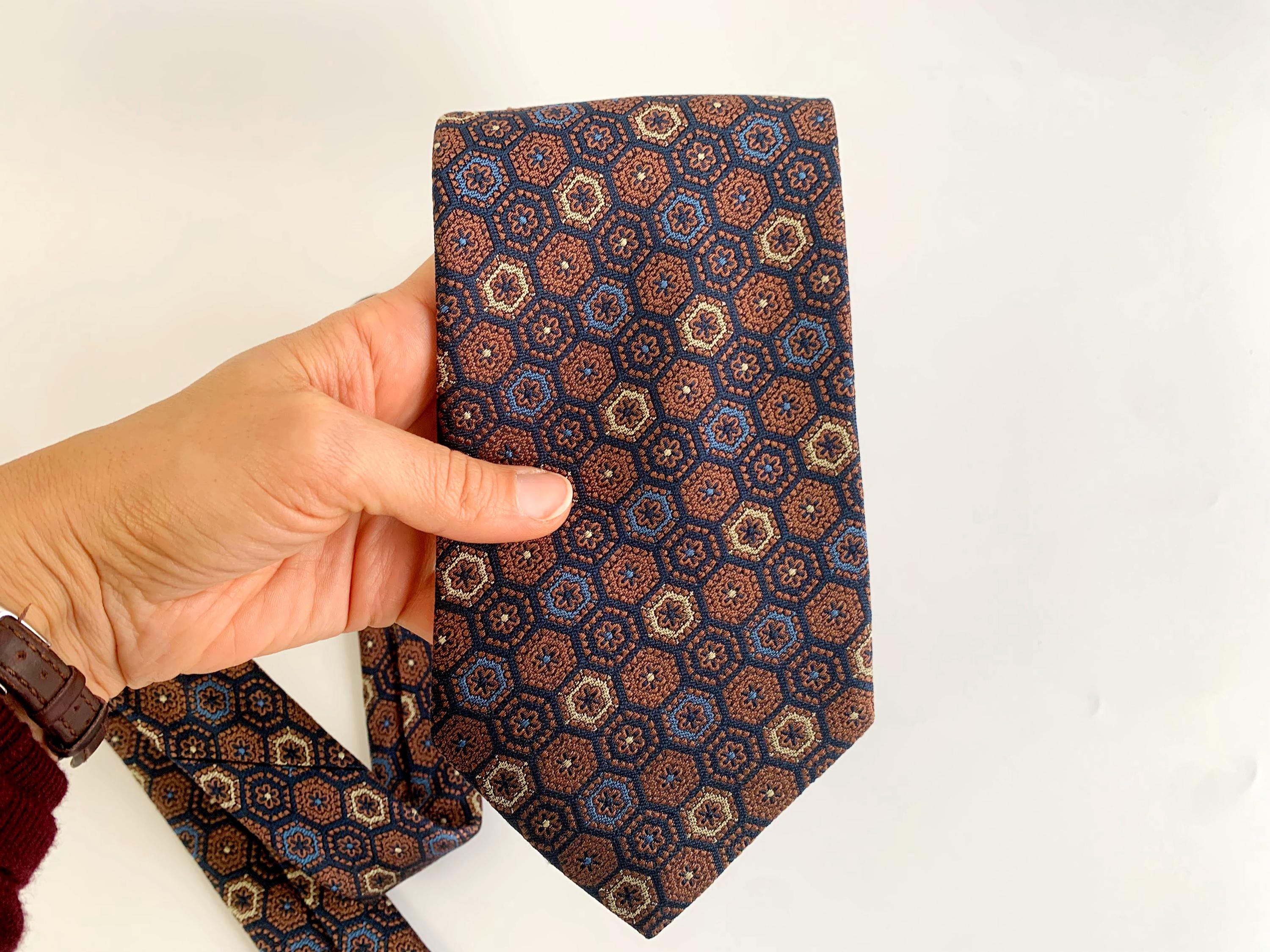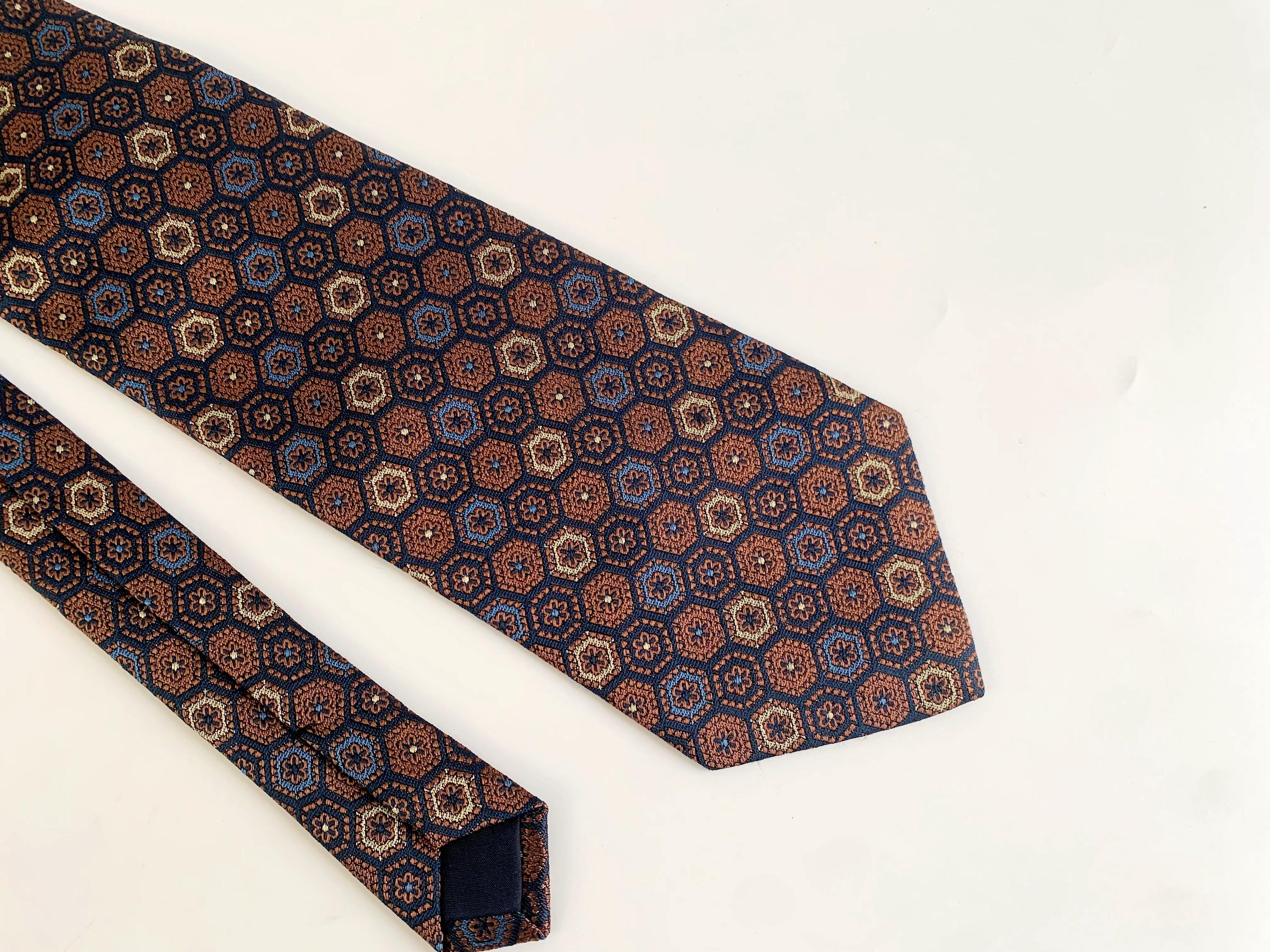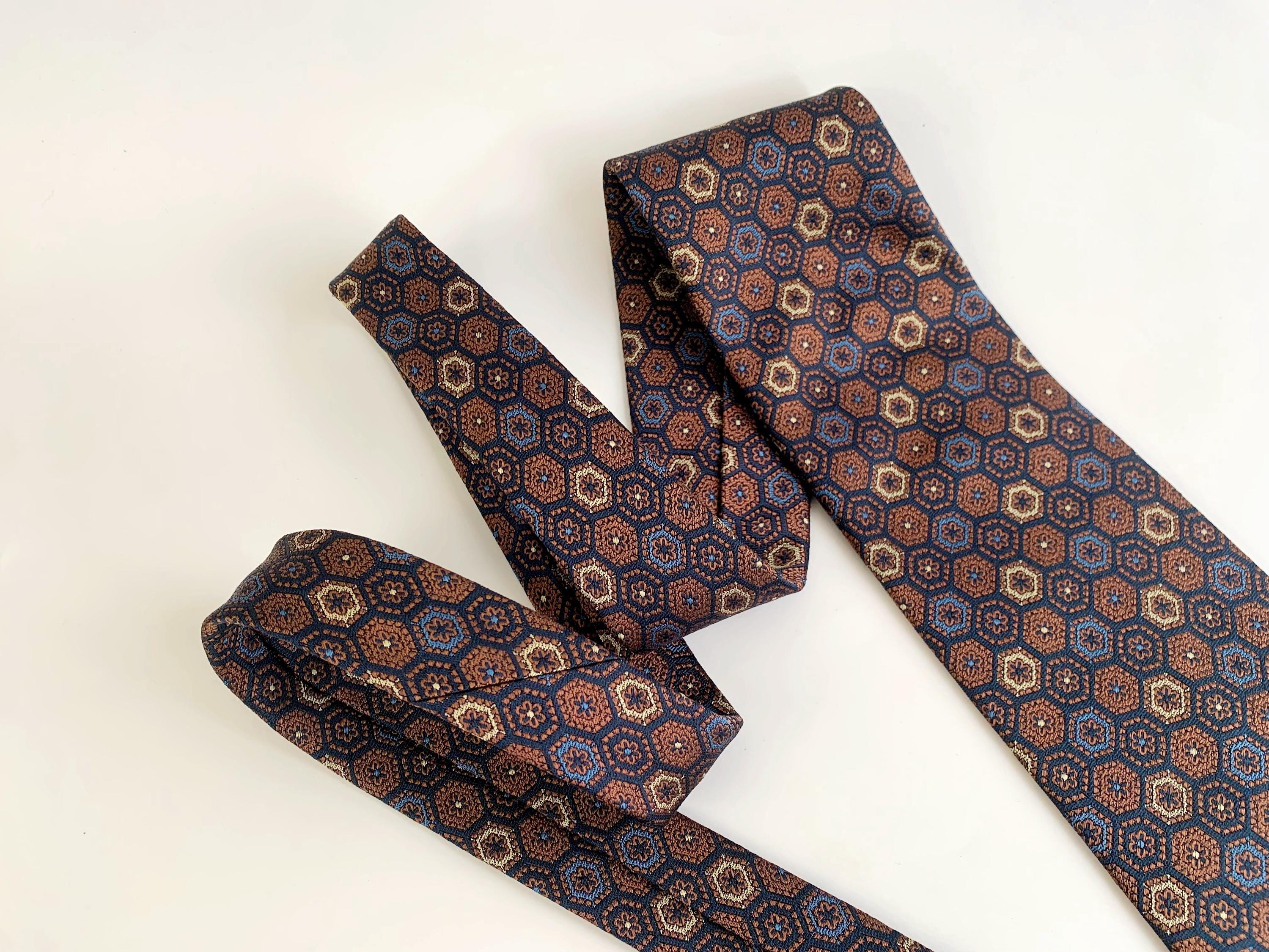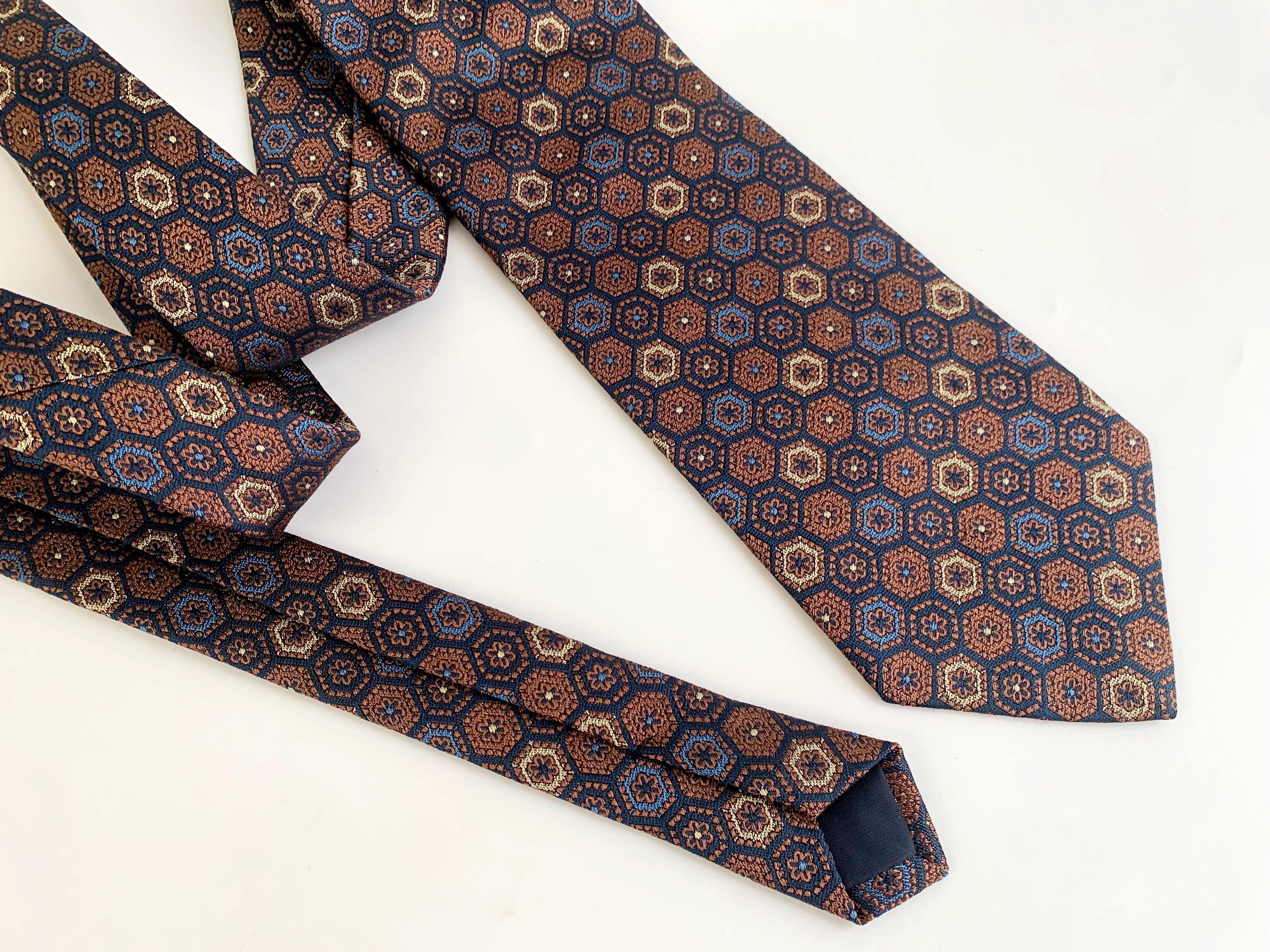Elevate your wardrobe with this exquisite vintage silk necktie from "Riders Men by William Como," proudly "Hand Made in Italy" of luxurious 100% silk fabric! This silk tie is a testament to timeless Italian craftsmanship and features a captivating, intricate geometric pattern composed of interlocking hexagons and floral-like motifs.