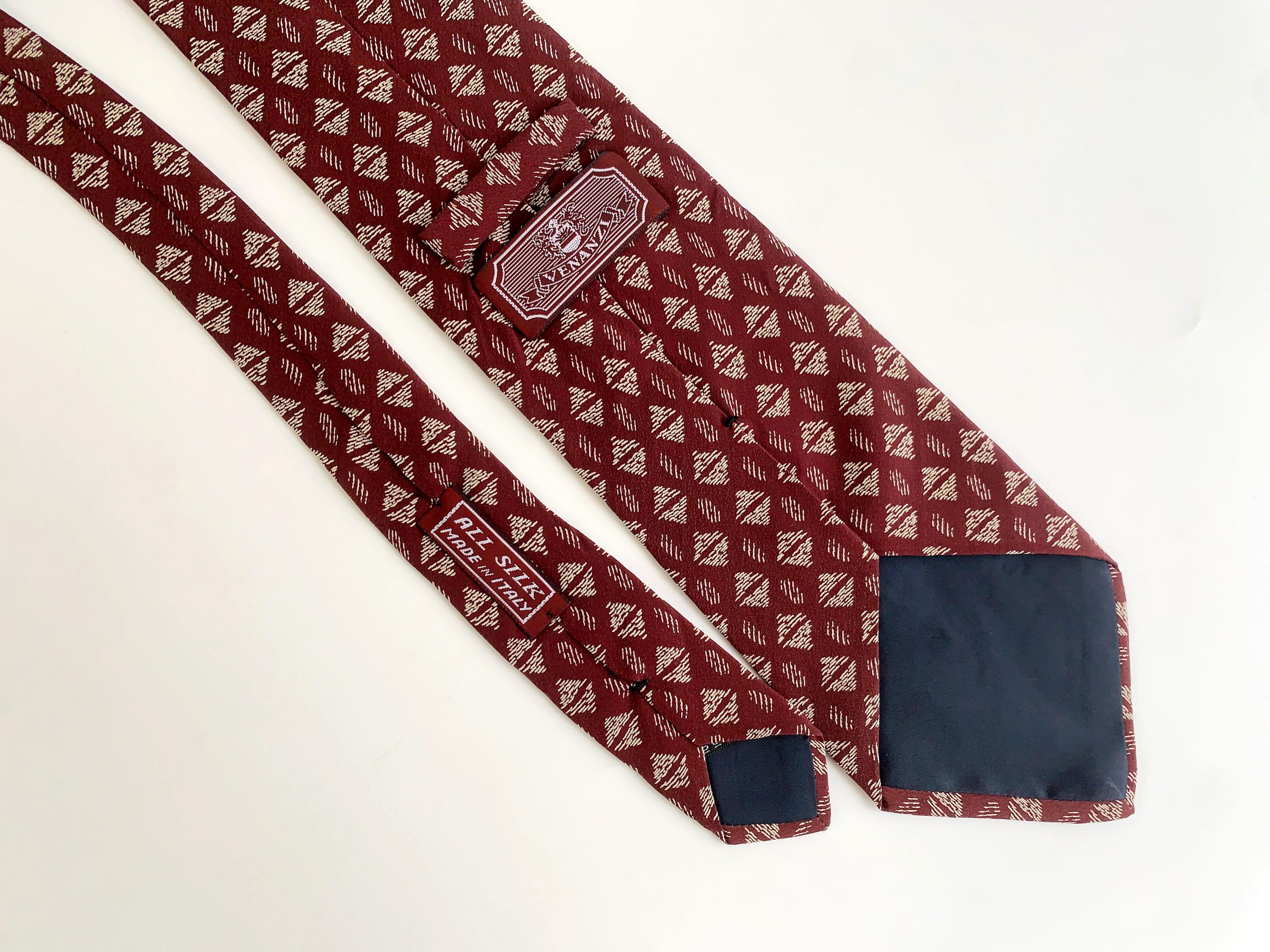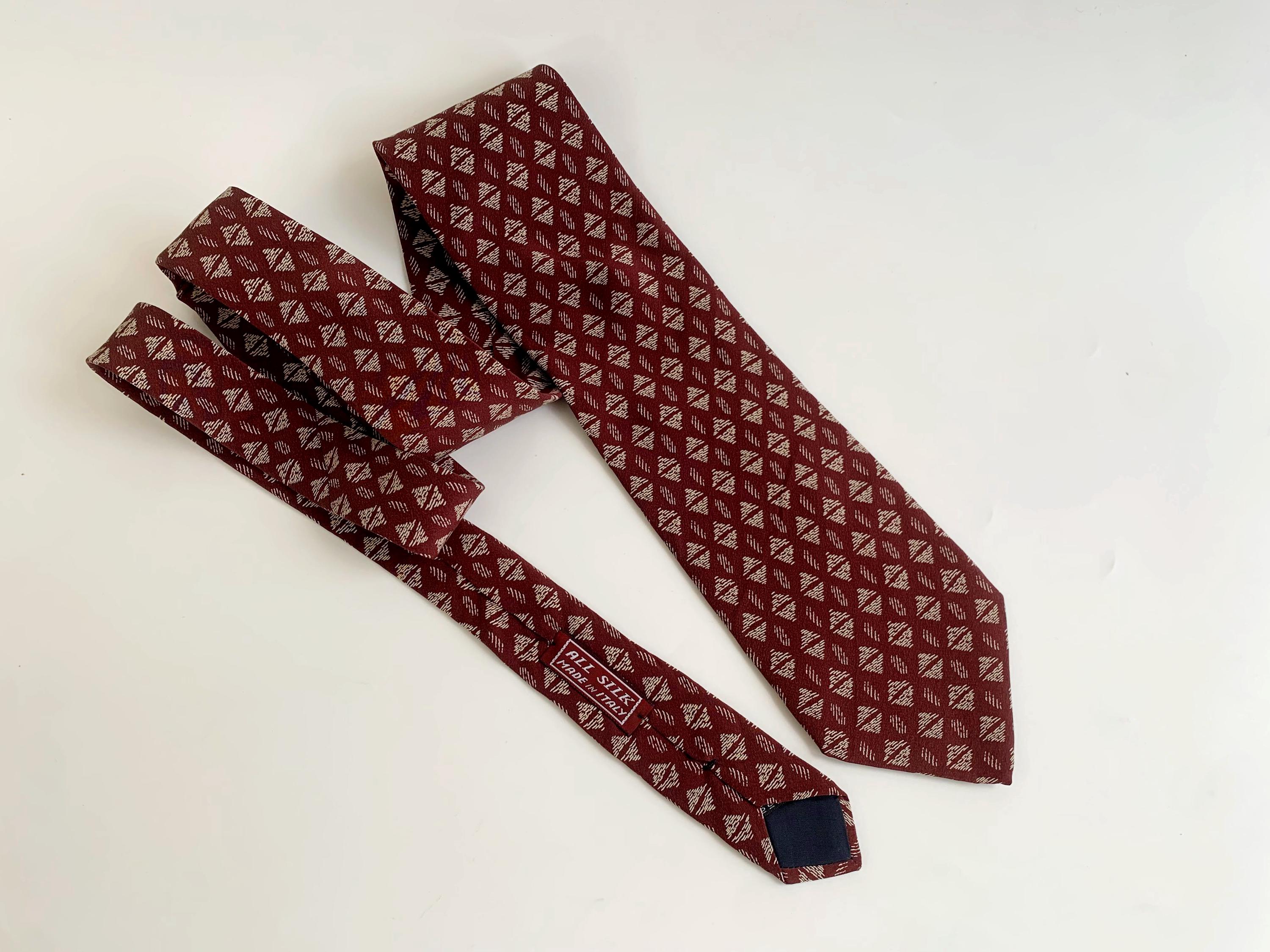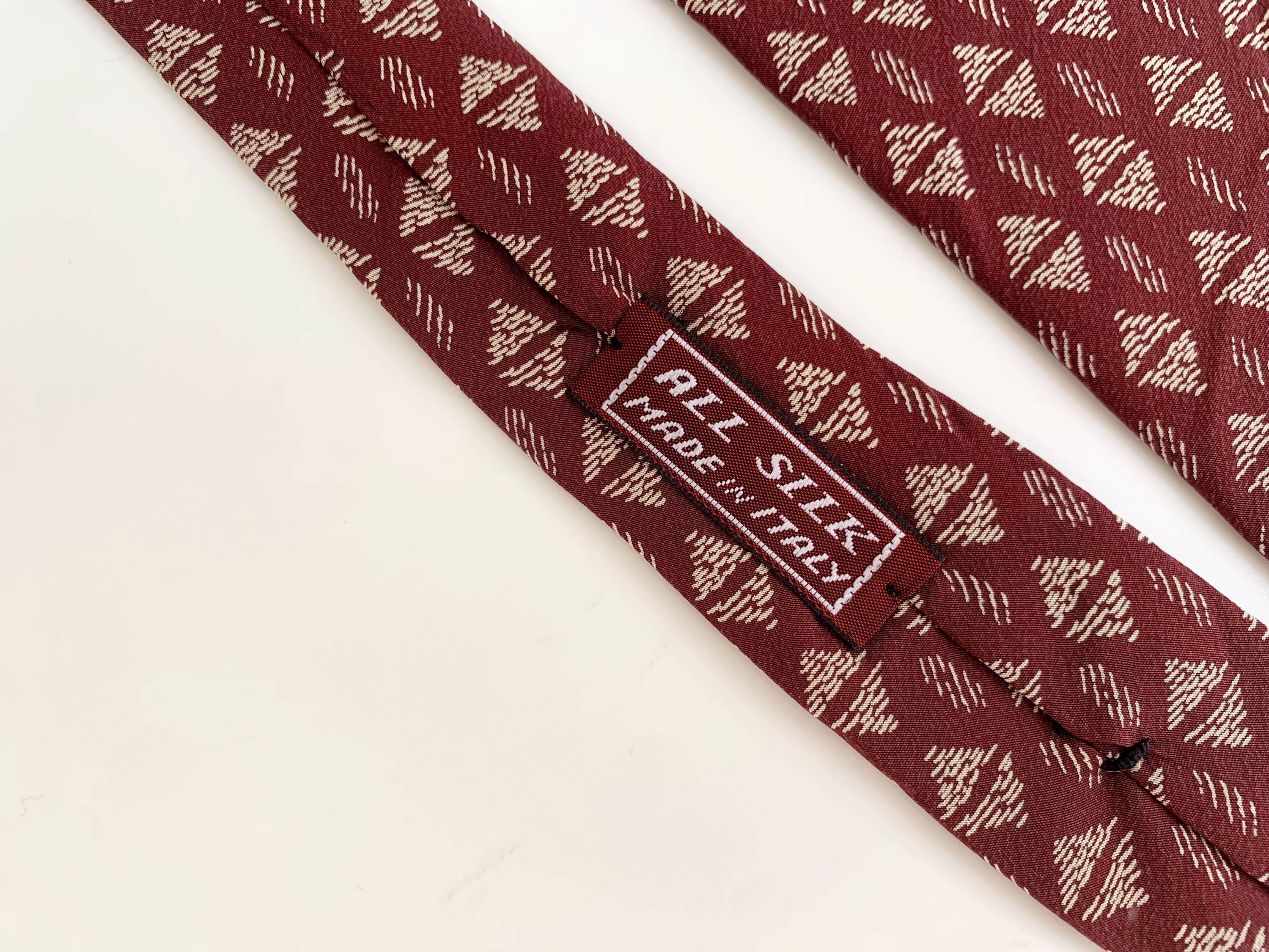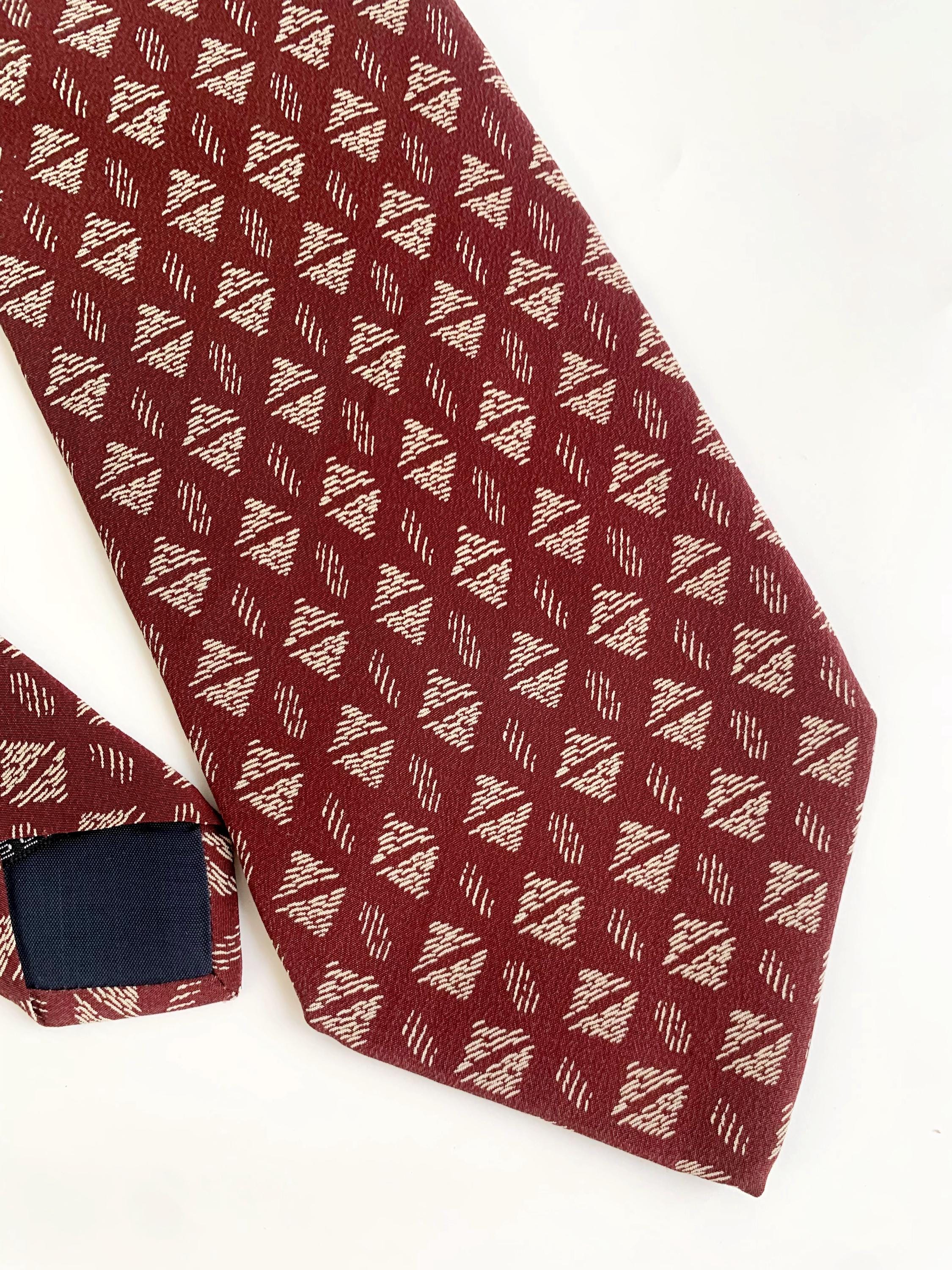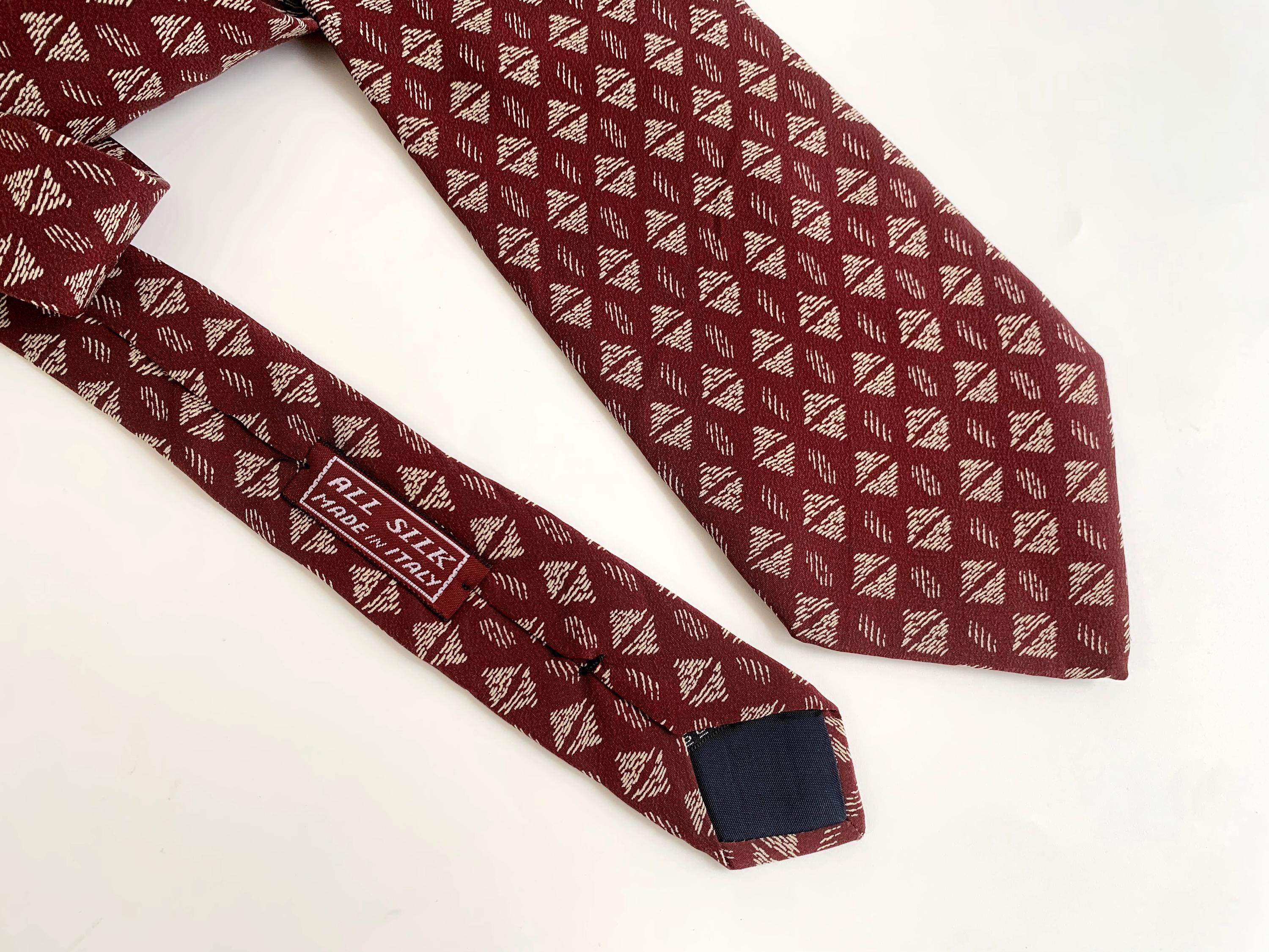Elevate your style with this sophisticated vintage silk tie, crafted in Italy. This timeless accessory features a rich maroon background adorned with a distinctive beige geometric pattern, adding a touch of classic elegance to any ensemble.