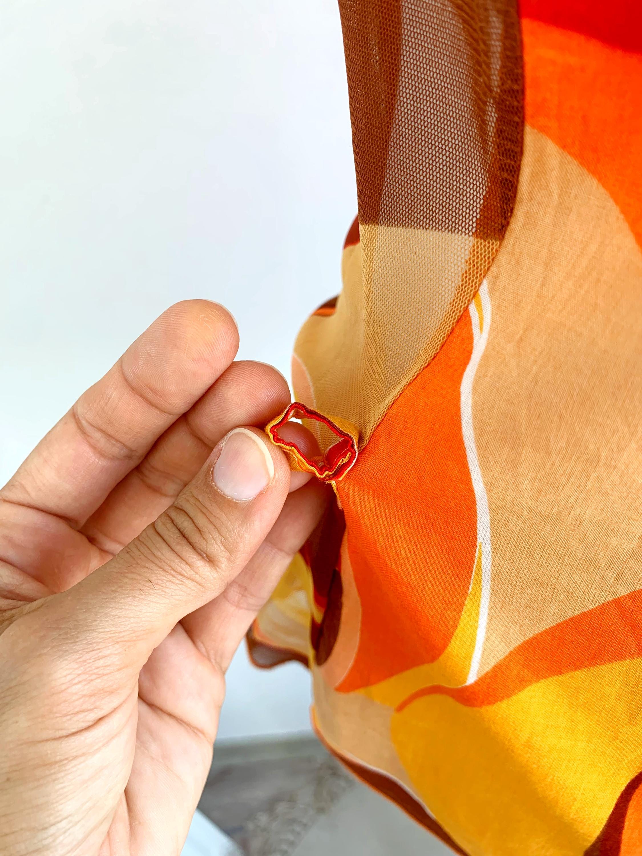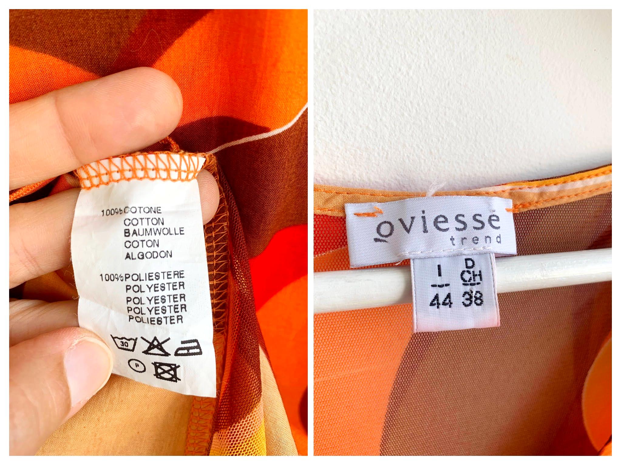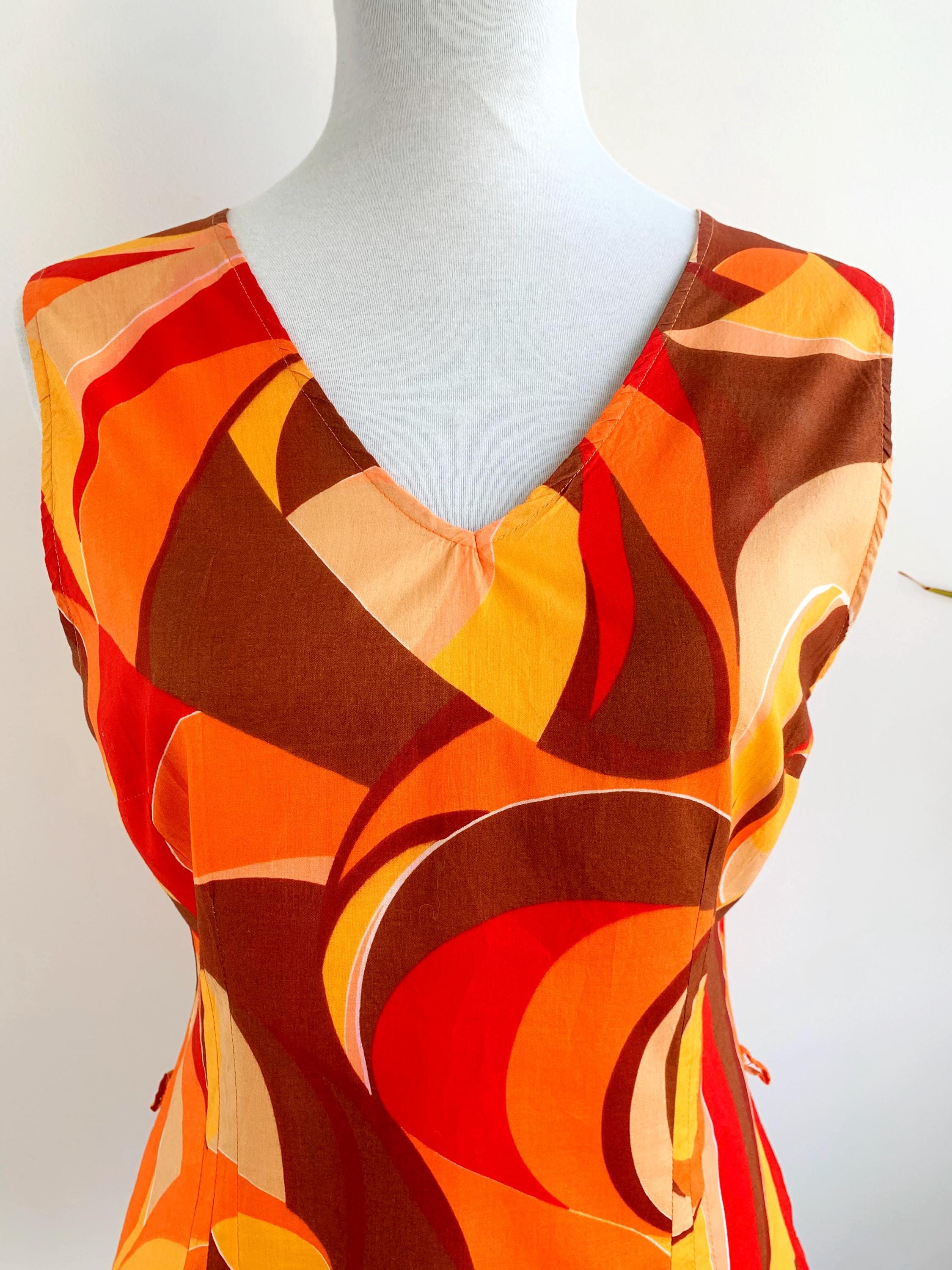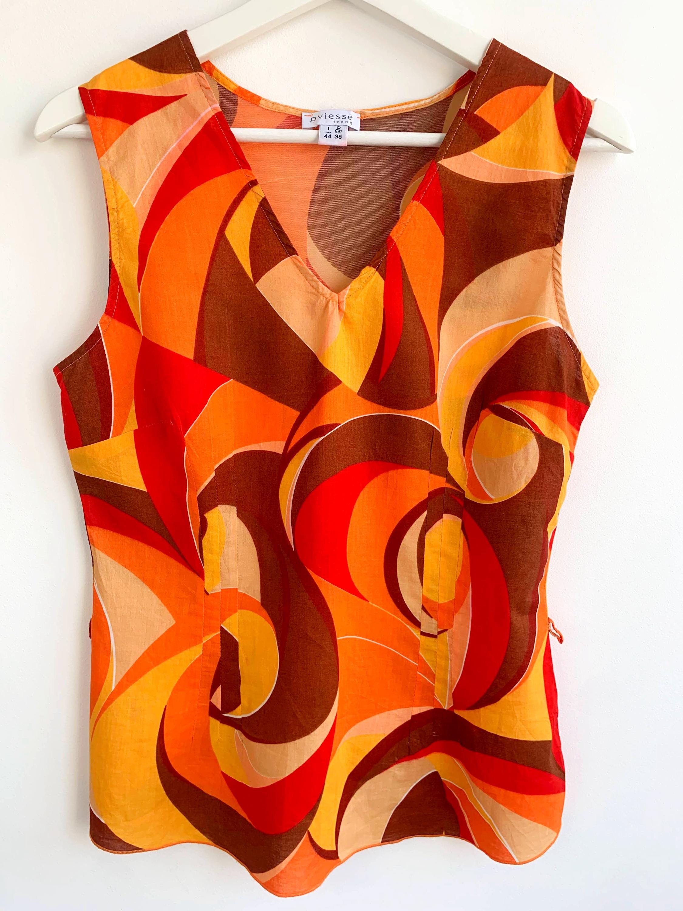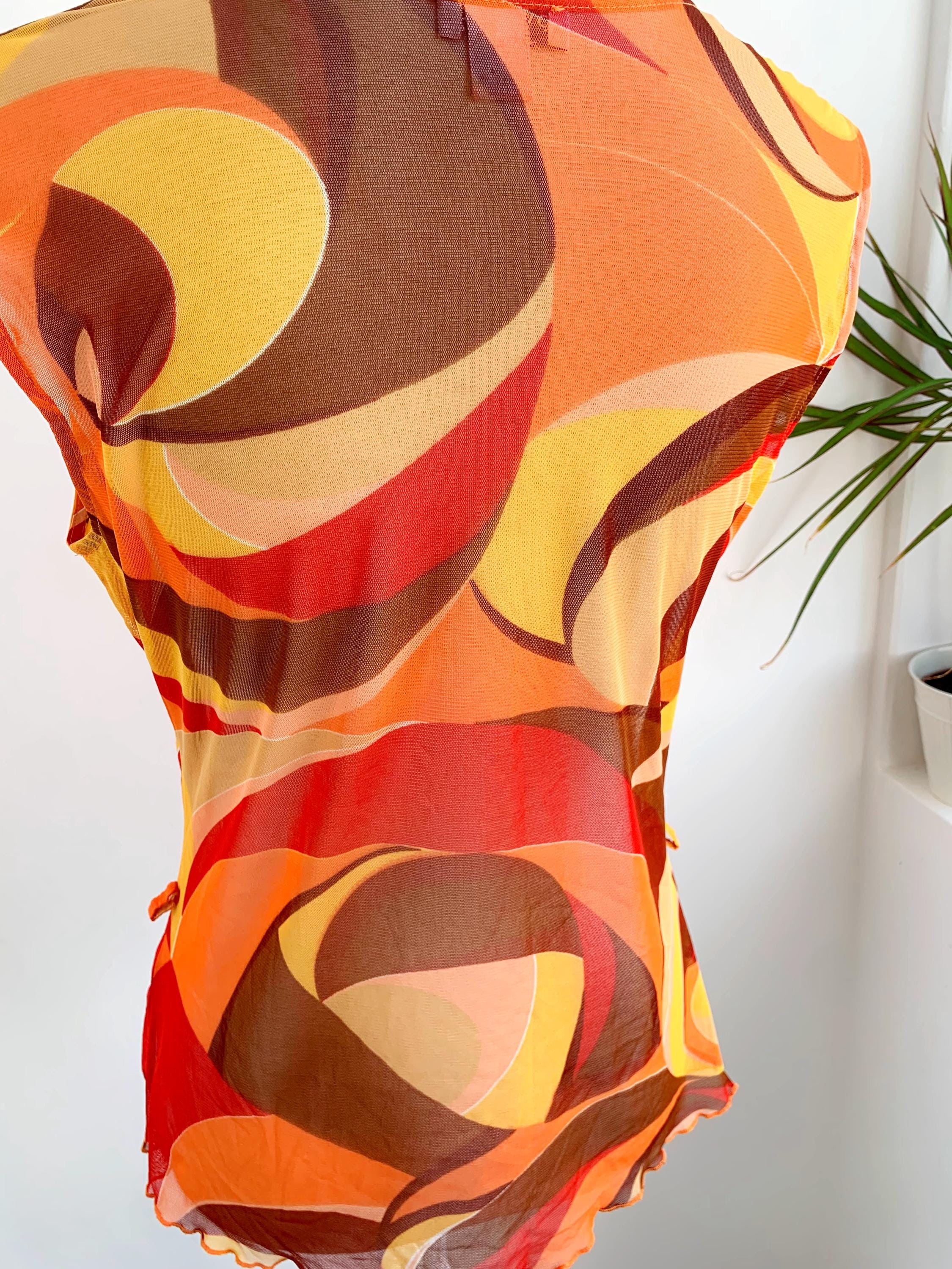 Unleash your inner 90s/Y2K style with this vibrant and unique vintage tank top from OVS Trend! This eye-catching piece features a captivating abstract swirl print in a lively palette of oranges, browns, and yellows. The design incorporates soft solid color front and sheer mesh overlay back, adding depth and a playful texture to the bold print.
