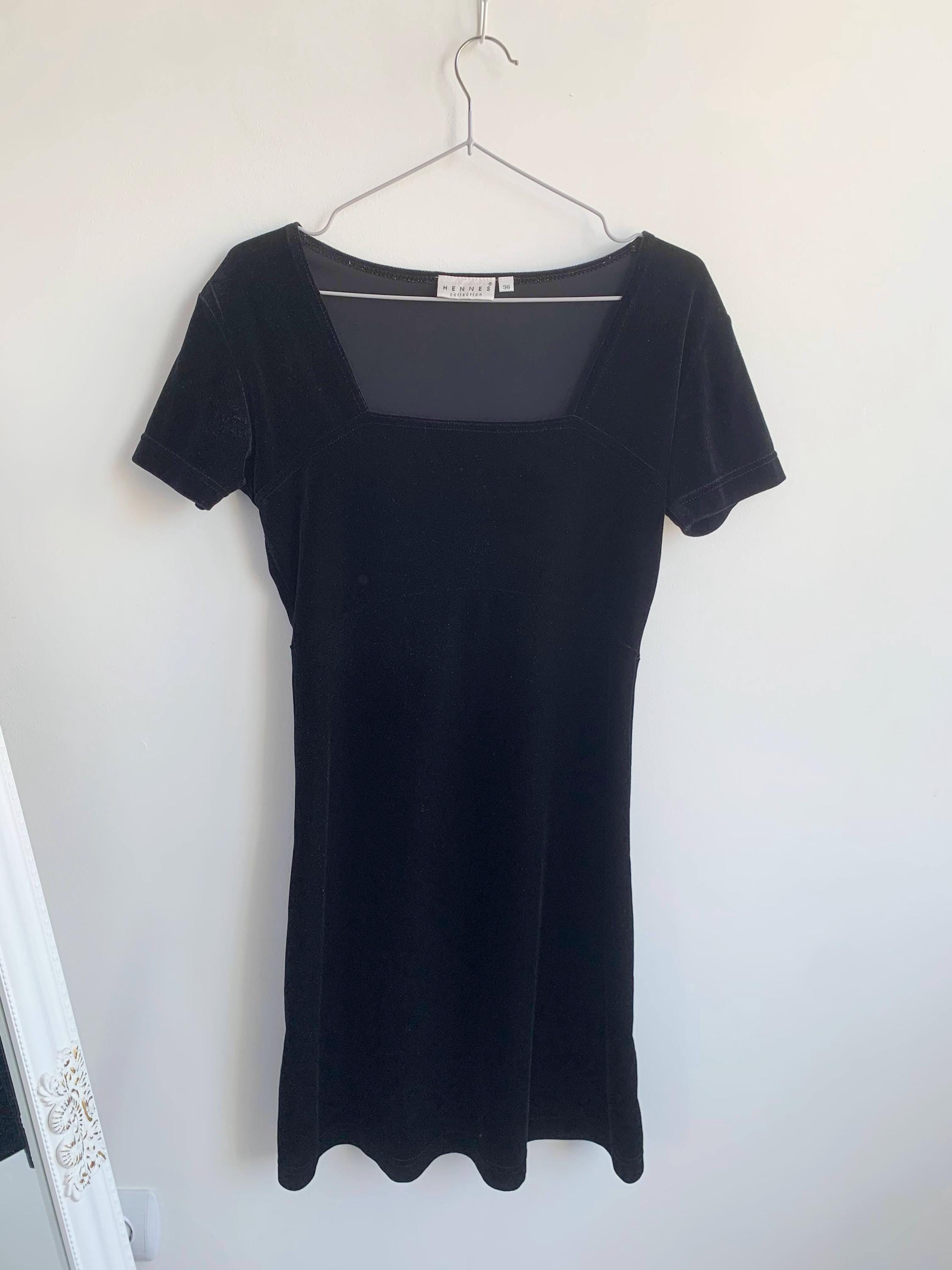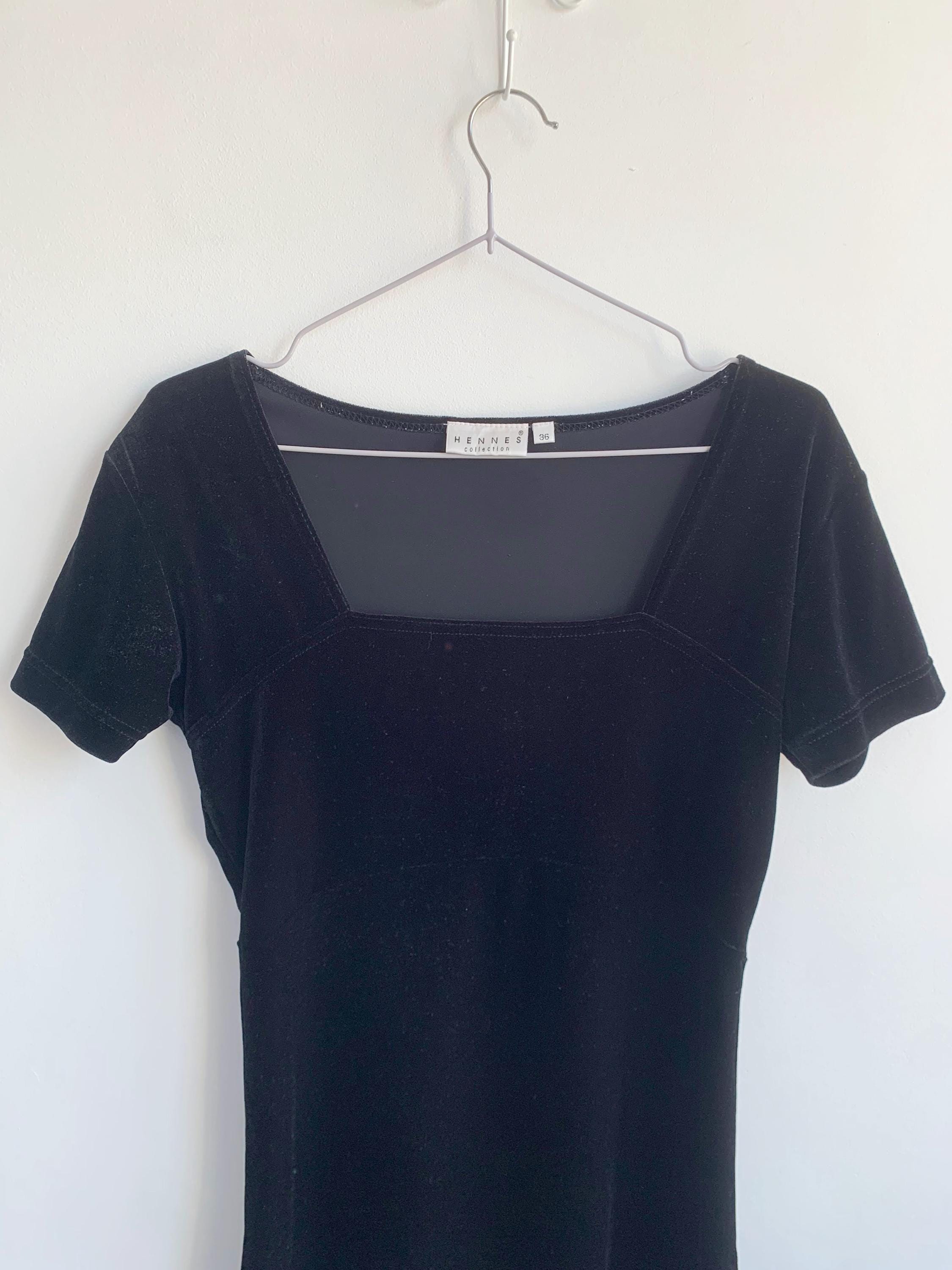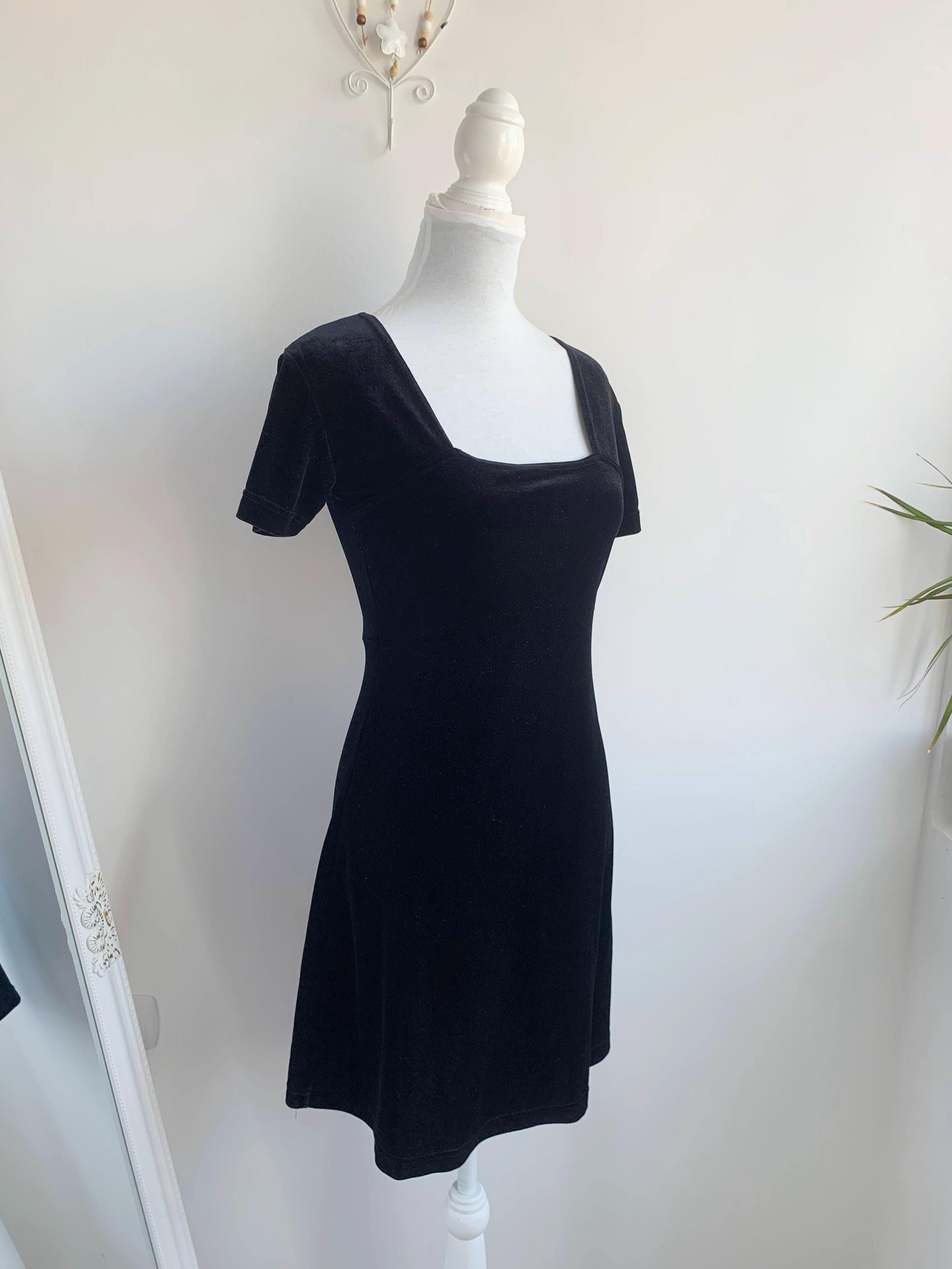Embrace the romantic and edgy aesthetic of the 90s with this stunning vintage Hennes Collection black velvet mini dress in size S. This timeless piece offers a flattering and comfortable fit with its stretchy velvet fabric. The dress features a chic square neckline, a fitted waist, and a gently flared mini-length skirt, creating a beautiful and feminine silhouette. The short sleeves and clean lines make it a versatile piece that can be dressed up with heels for a party or styled with combat boots and a leather jacket for a grungier, Y2K-inspired look. The plush black velvet is perfect for adding a touch of gothic glam and luxury to your wardrobe for any special occasion or a night out.