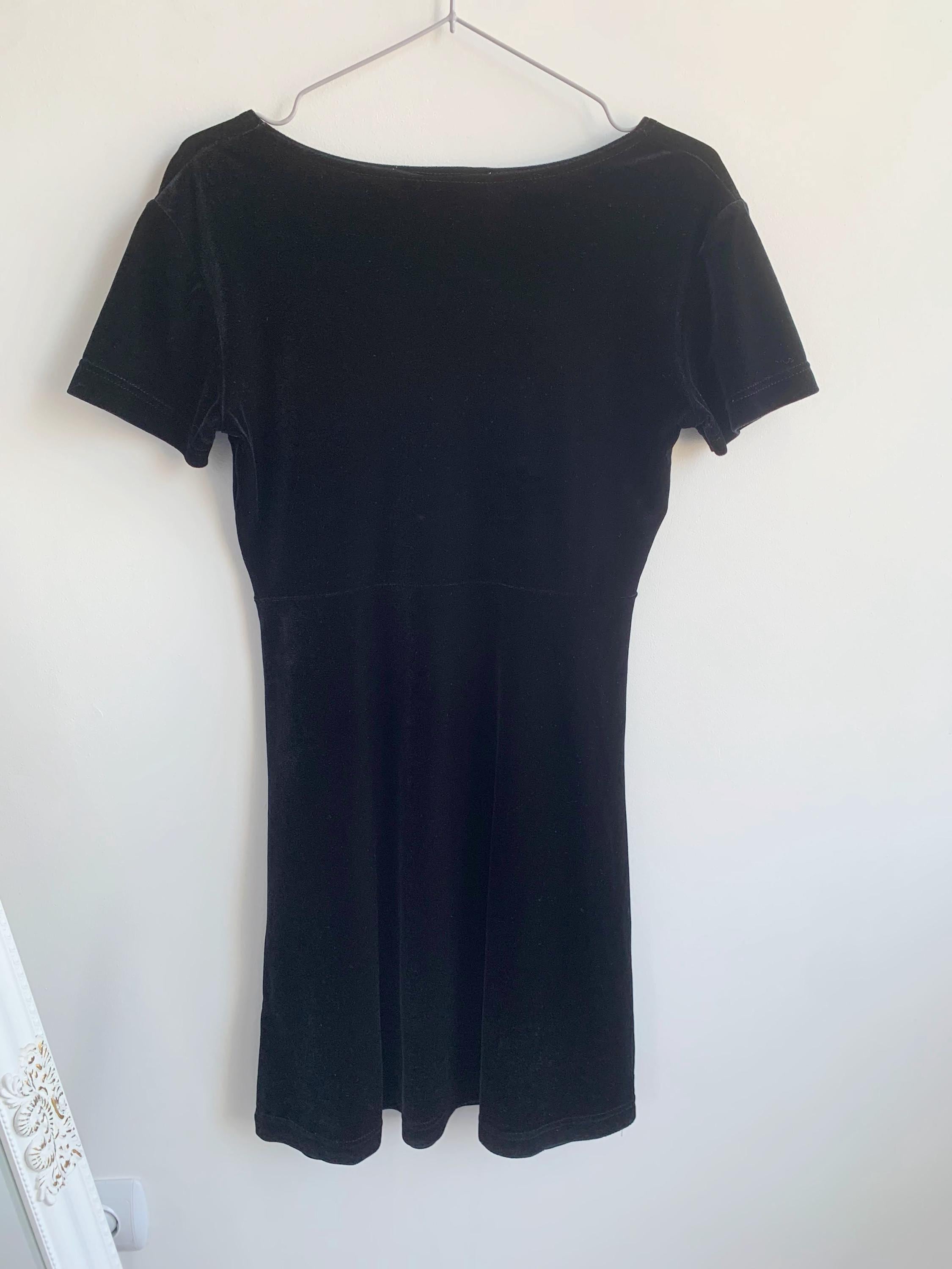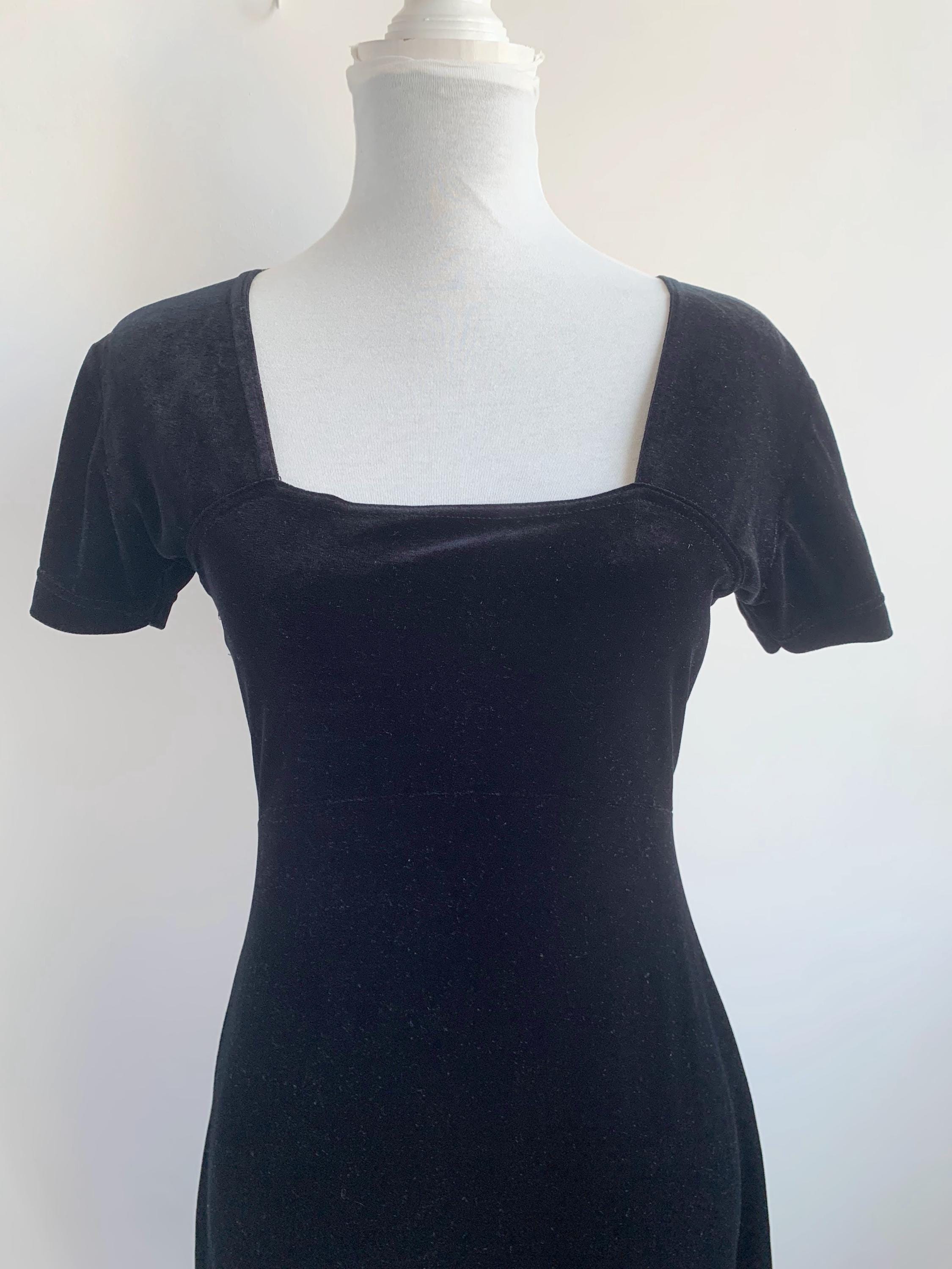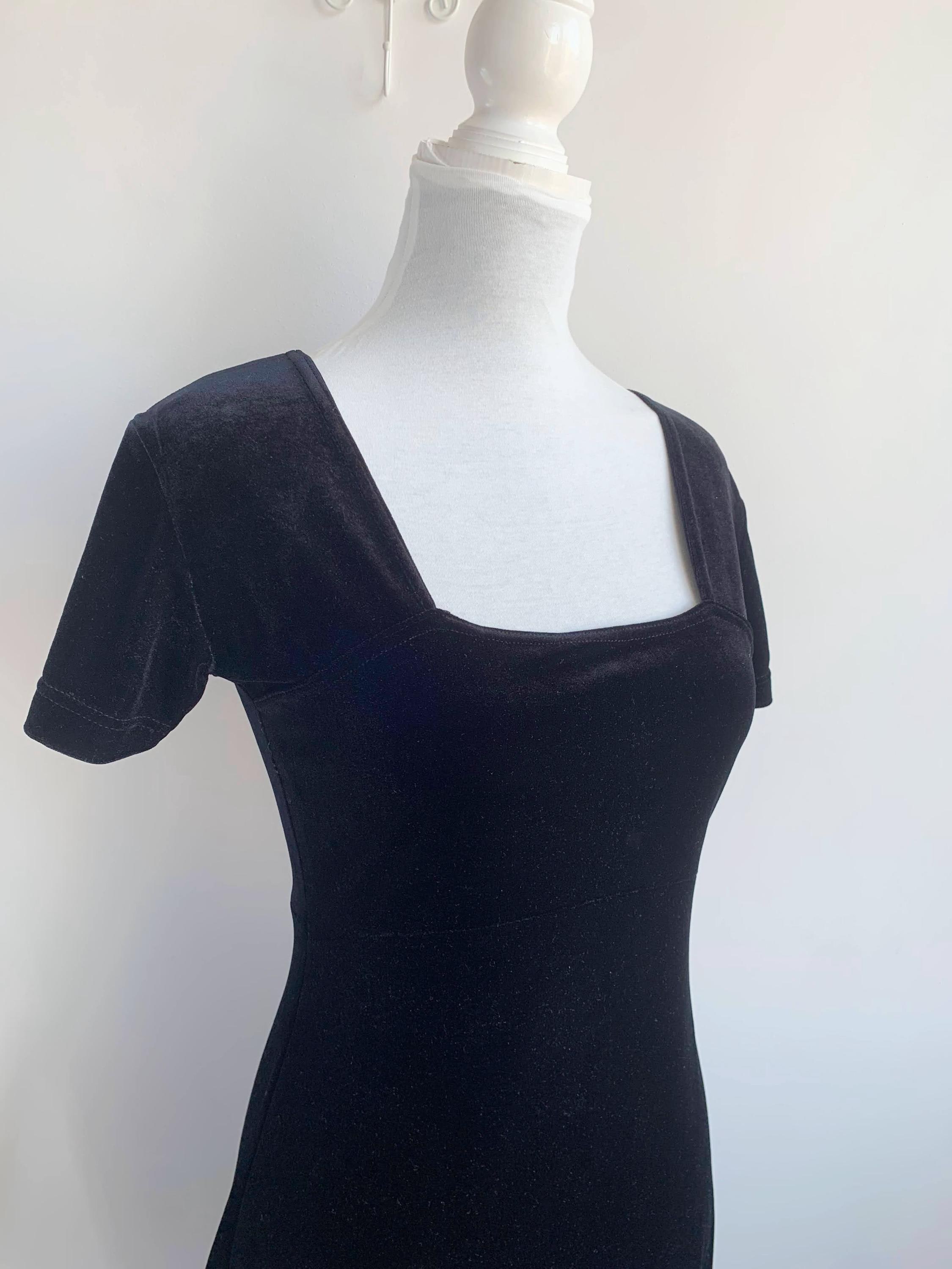 Embrace the romantic and edgy aesthetic of the 90s with this stunning vintage Hennes Collection black velvet mini dress in size S. This timeless piece offers a flattering and comfortable fit with its stretchy velvet fabric. The dress features a chic square neckline, a fitted waist, and a gently flared mini-length skirt, creating a beautiful and feminine silhouette. The short sleeves and clean lines make it a versatile piece that can be dressed up with heels for a party or styled with combat boots and a leather jacket for a grungier, Y2K-inspired look. The plush black velvet is perfect for adding a touch of gothic glam and luxury to your wardrobe for any special occasion or a night out.