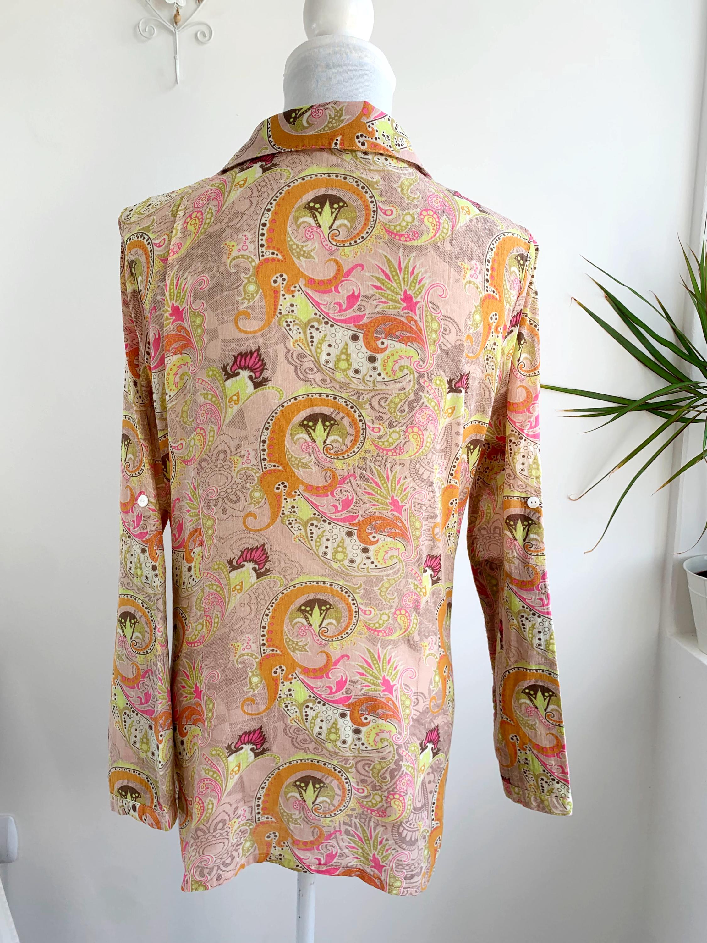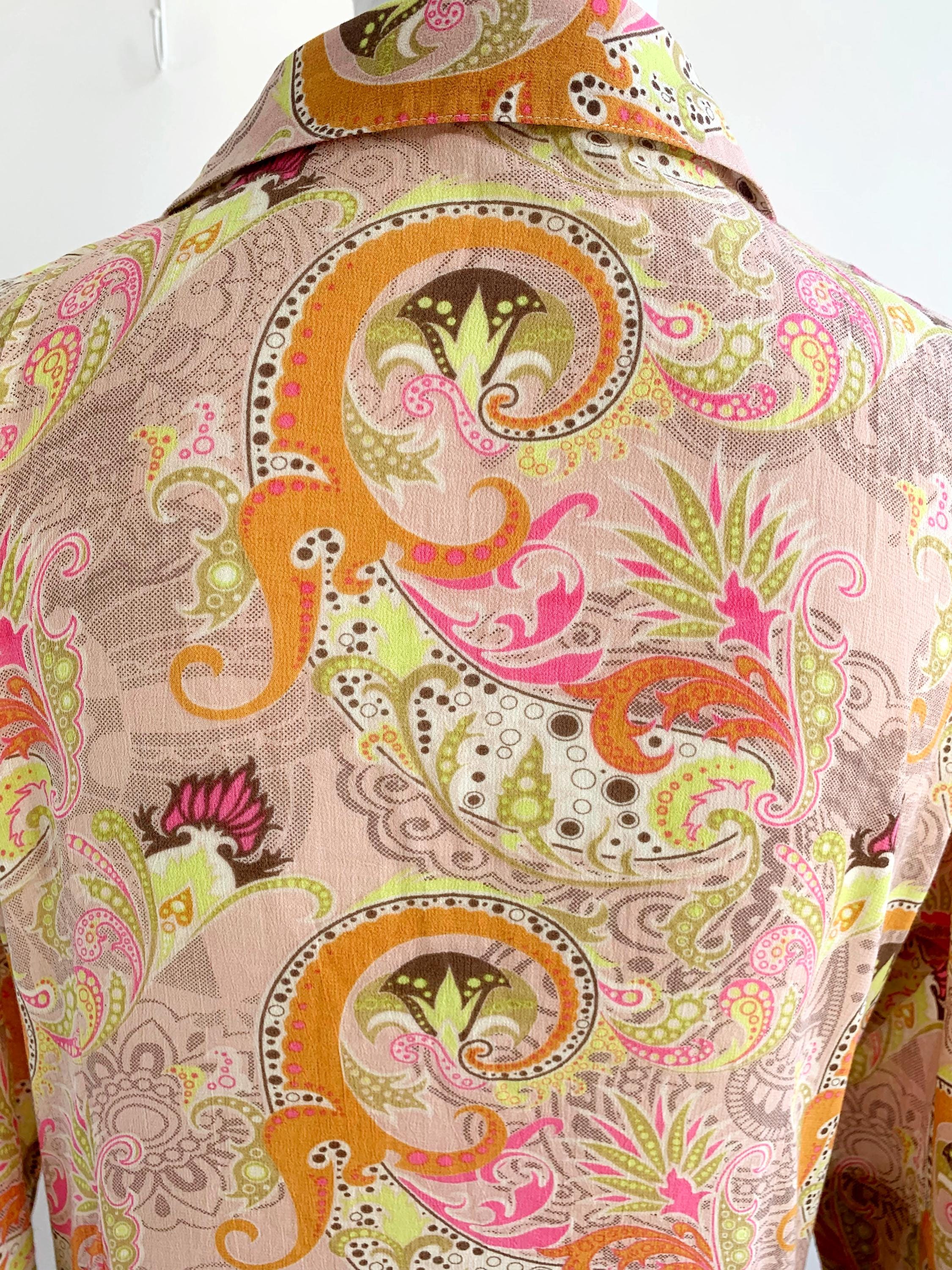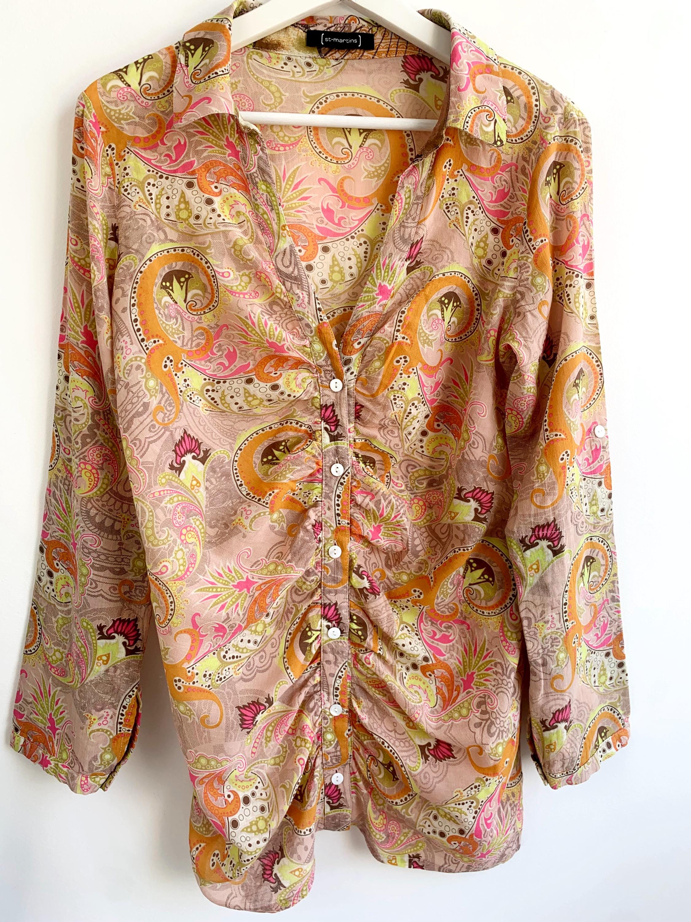 Make a statement with this vibrant and eye-catching vintage blouse from St-Martins in Size L! This unique shirt features a stunning psychedelic paisley print in a delightful palette of beige, bright orange, hot pink, and lime green, exuding major Y2K and boho-chic vibes.