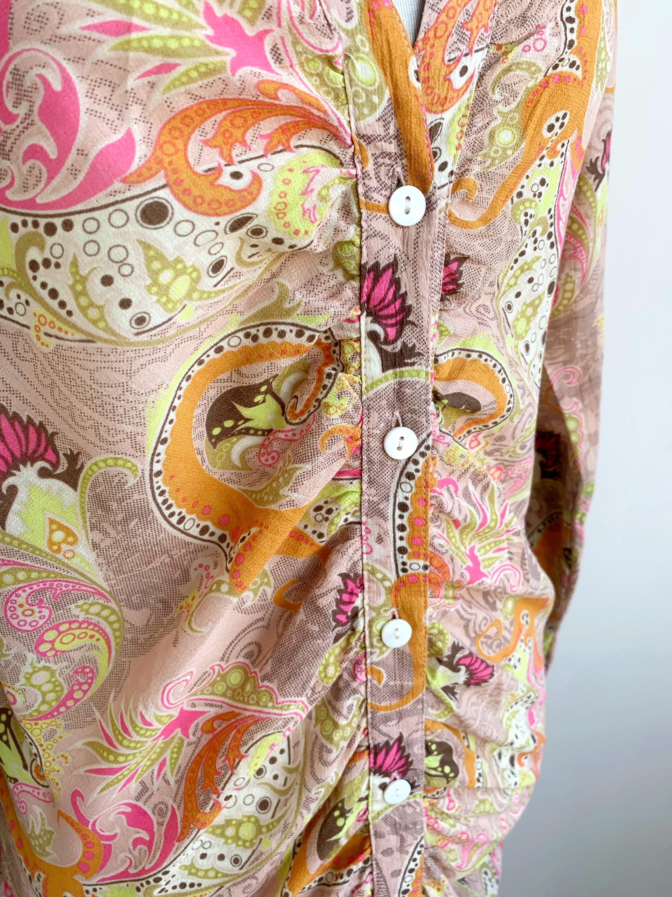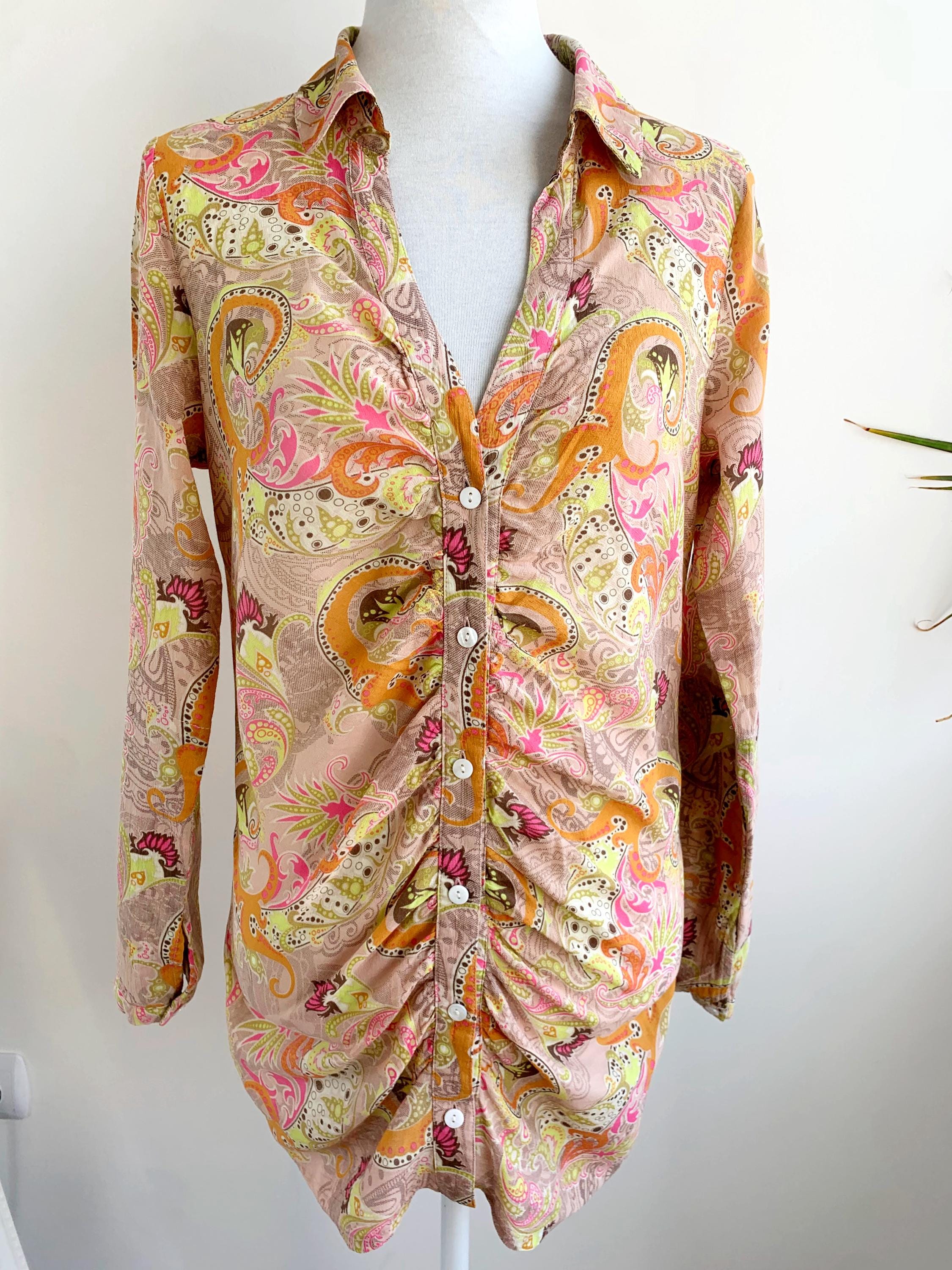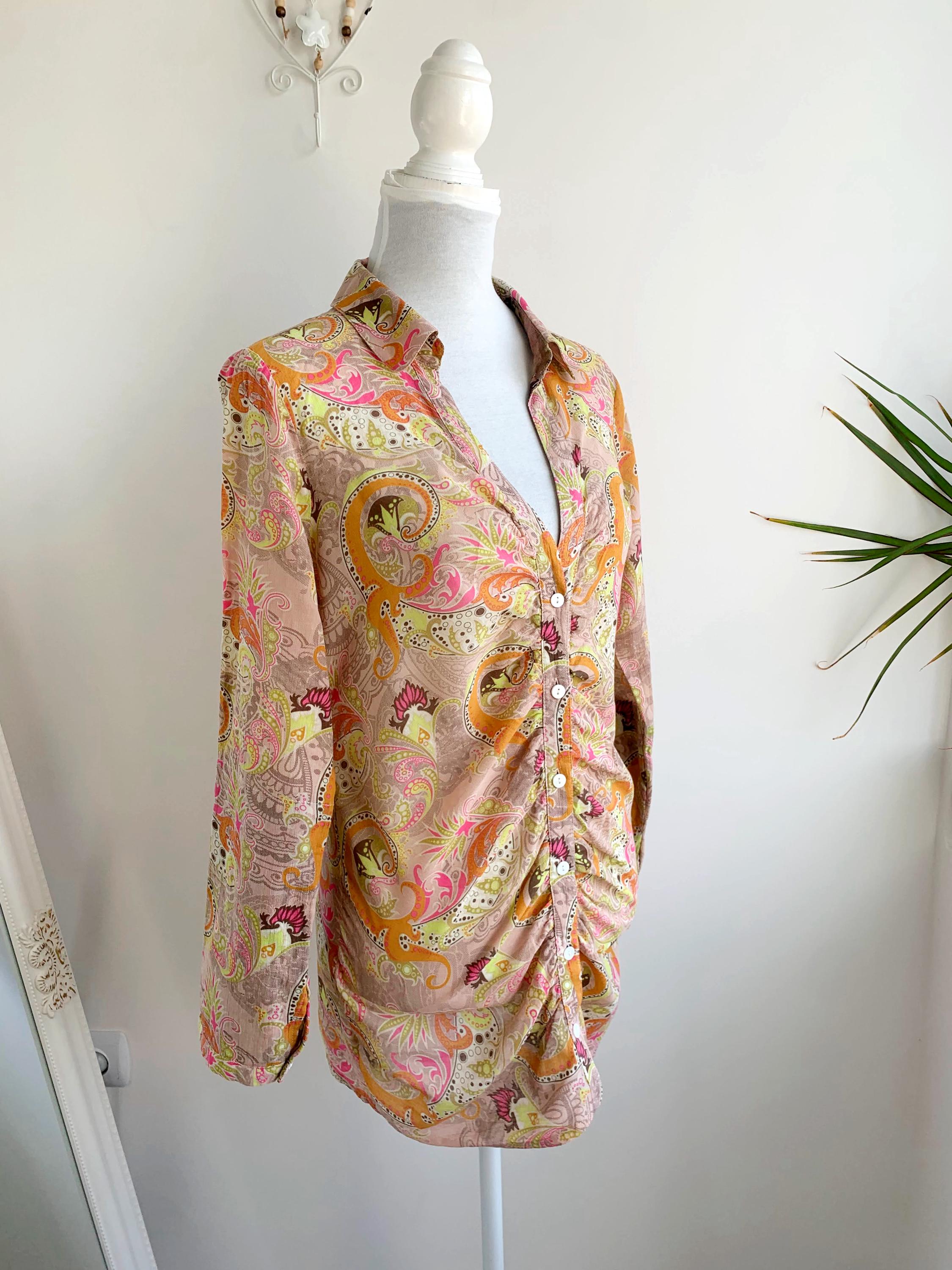 Make a statement with this vibrant and eye-catching vintage blouse from St-Martins in Size L! This unique shirt features a stunning psychedelic paisley print in a delightful palette of beige, bright orange, hot pink, and lime green, exuding major Y2K and boho-chic vibes.