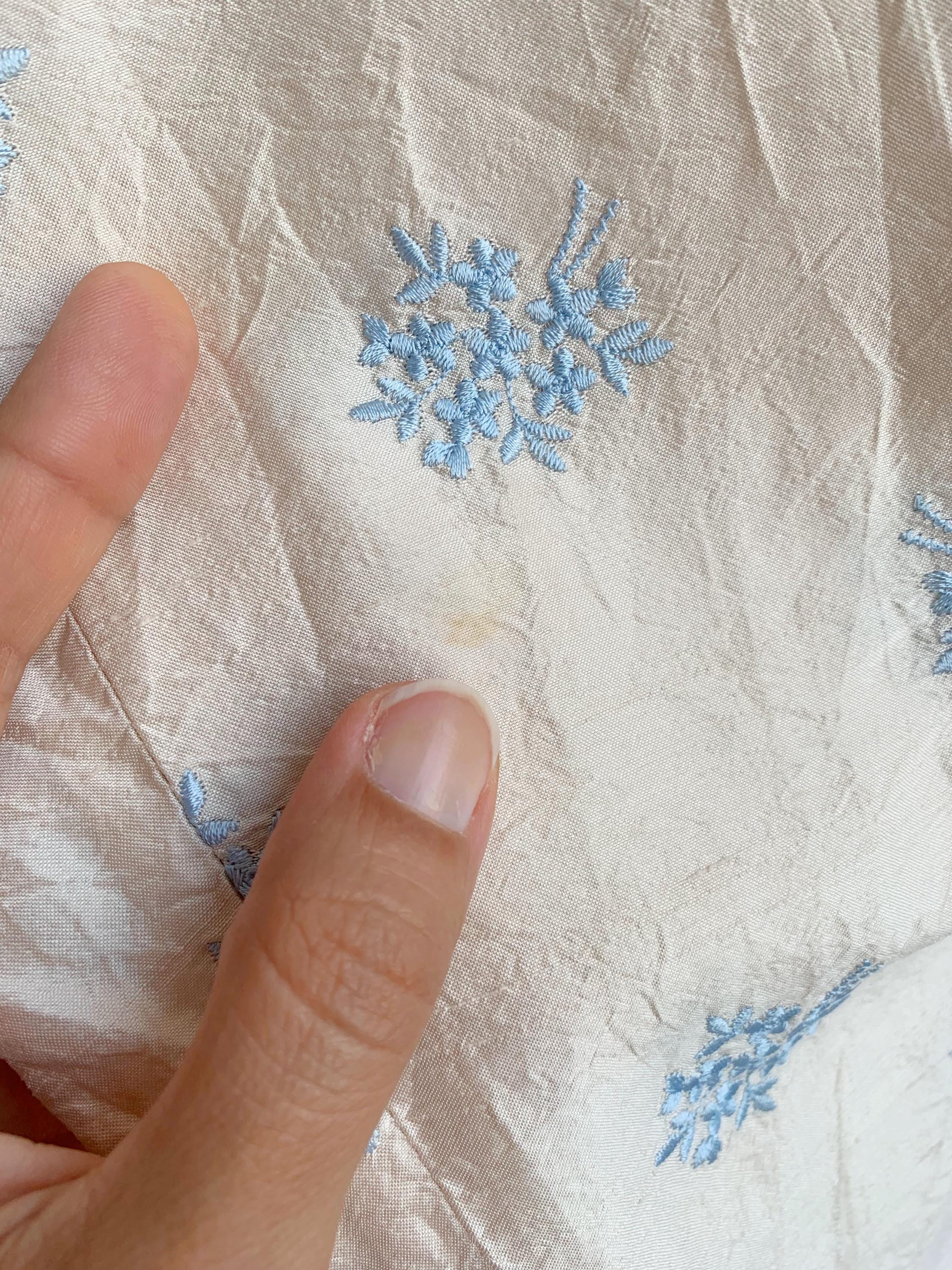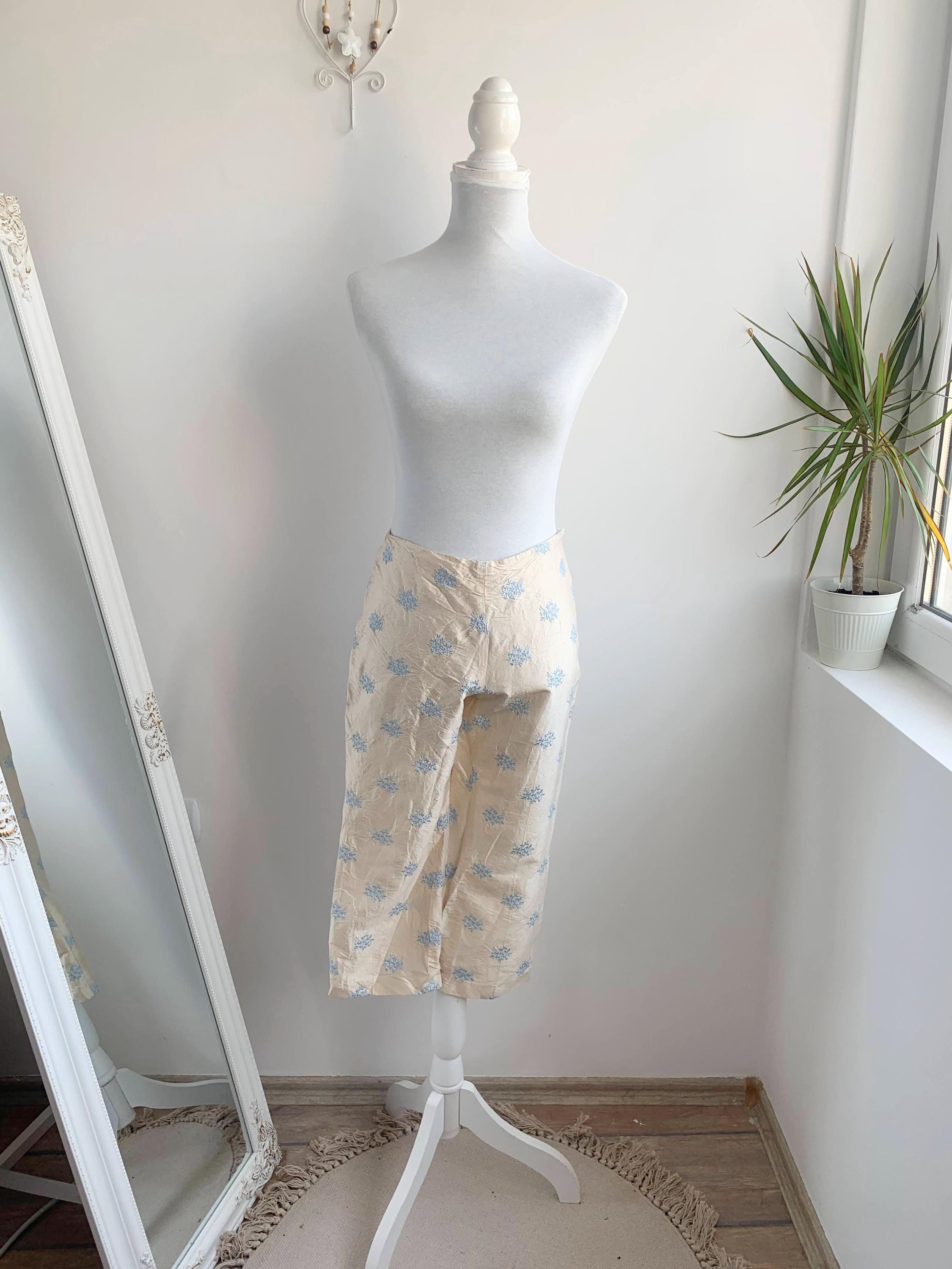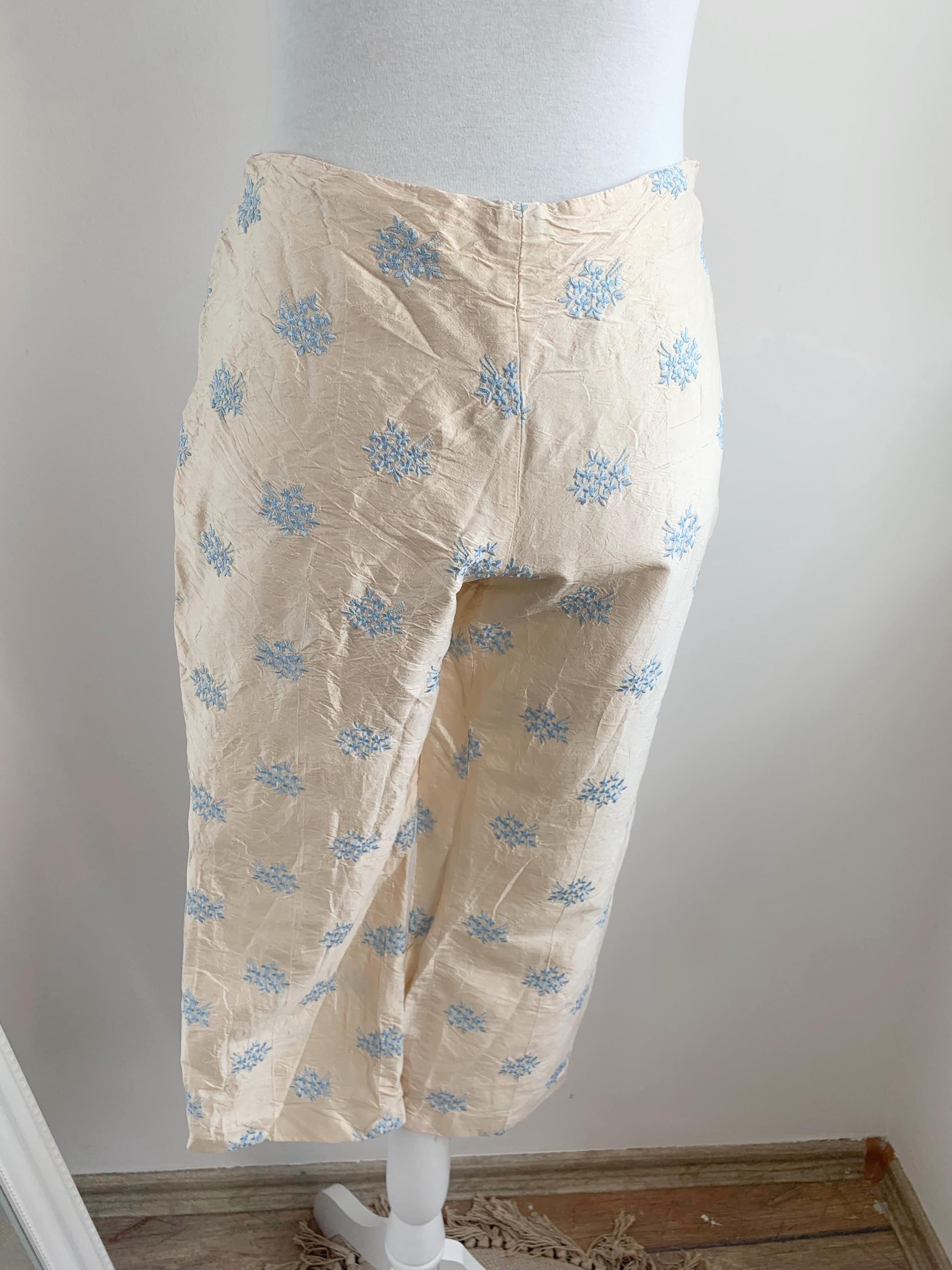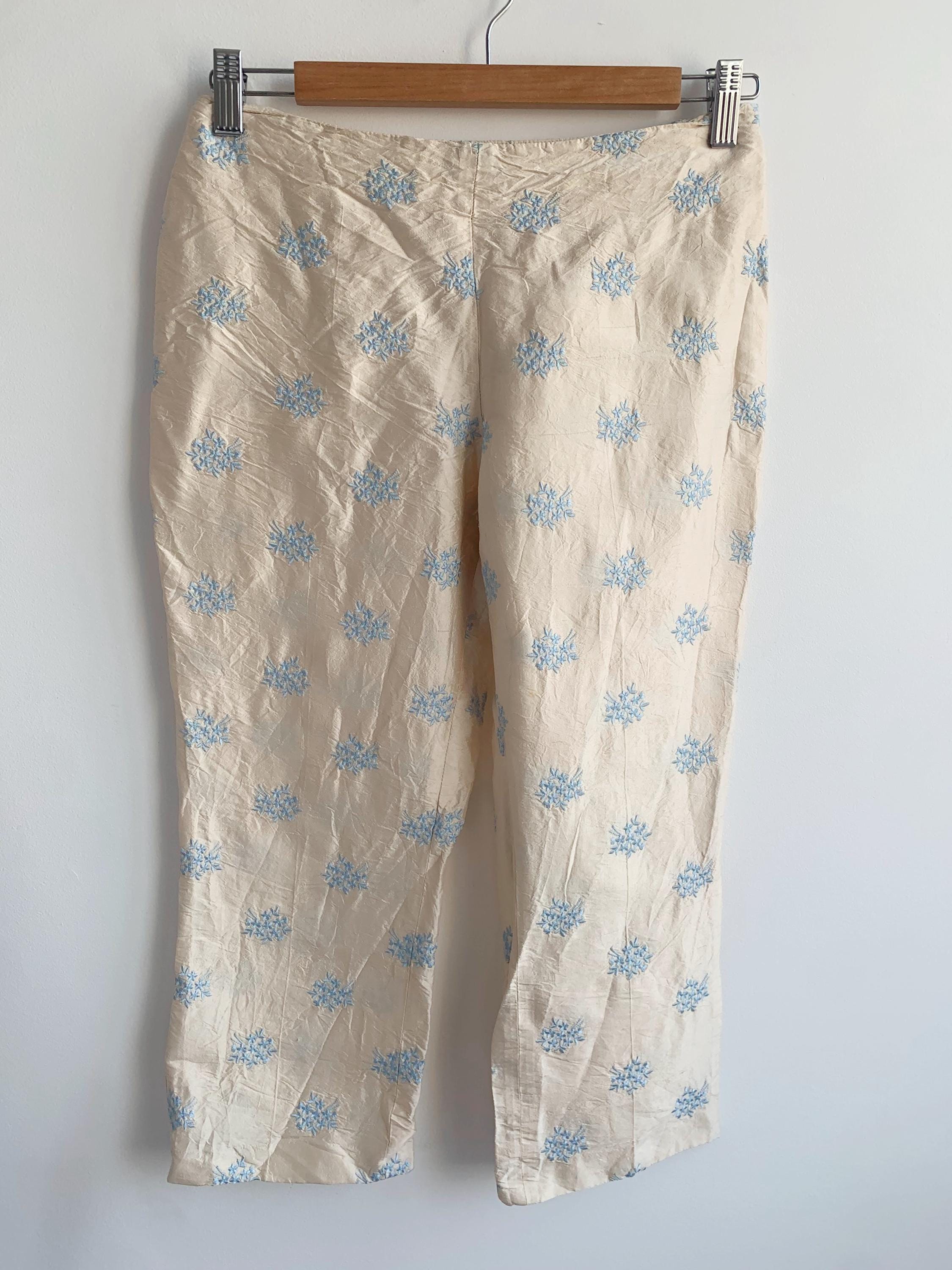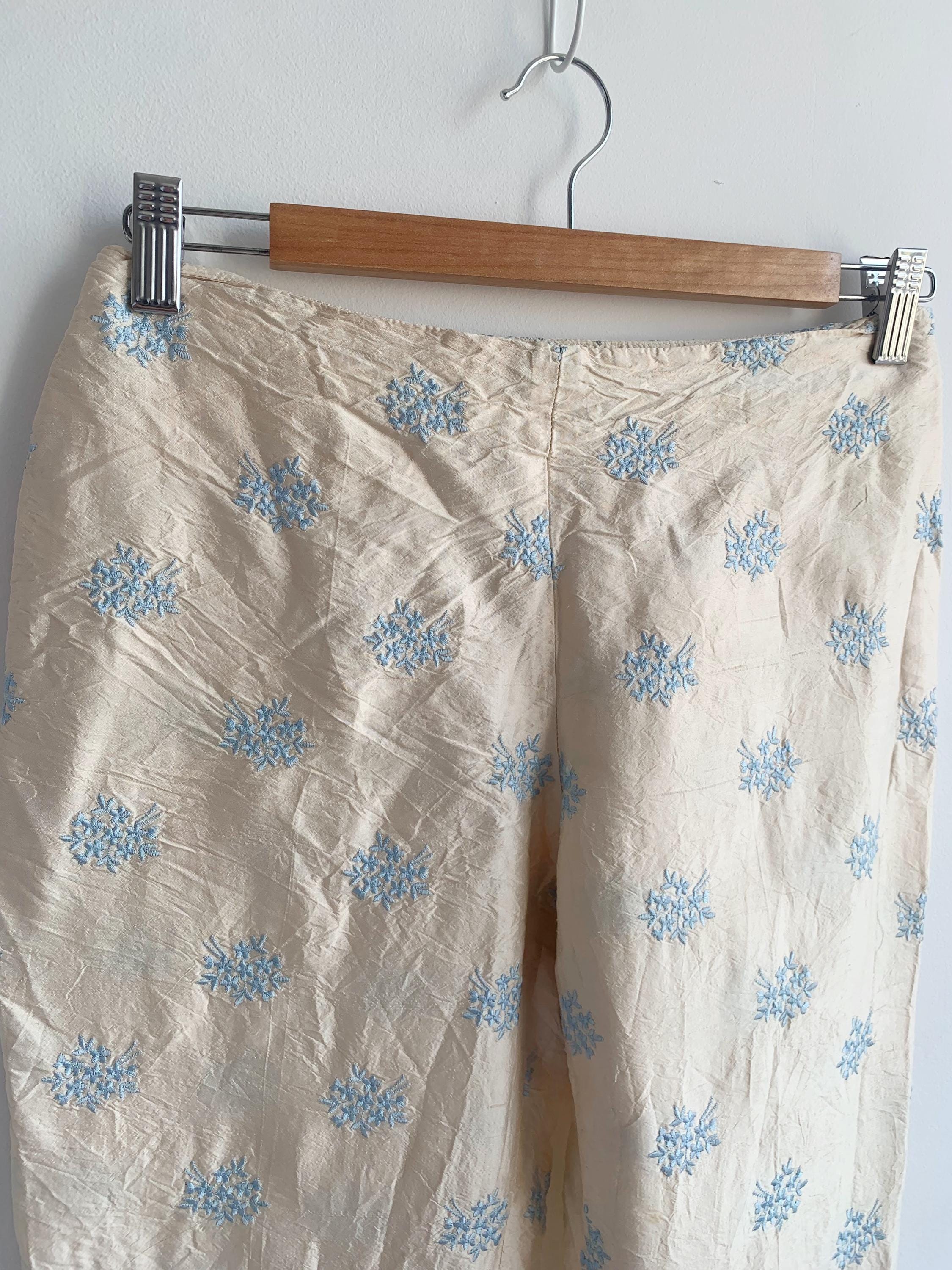 The beautiful cream/champagne hue of the silk serves as a sophisticated canvas for the delicate light blue embroidered flower motifs scattered throughout the fabric. These intricate designs add a unique touch of subtle charm and visual interest, elevating them beyond a simple pair of pants.