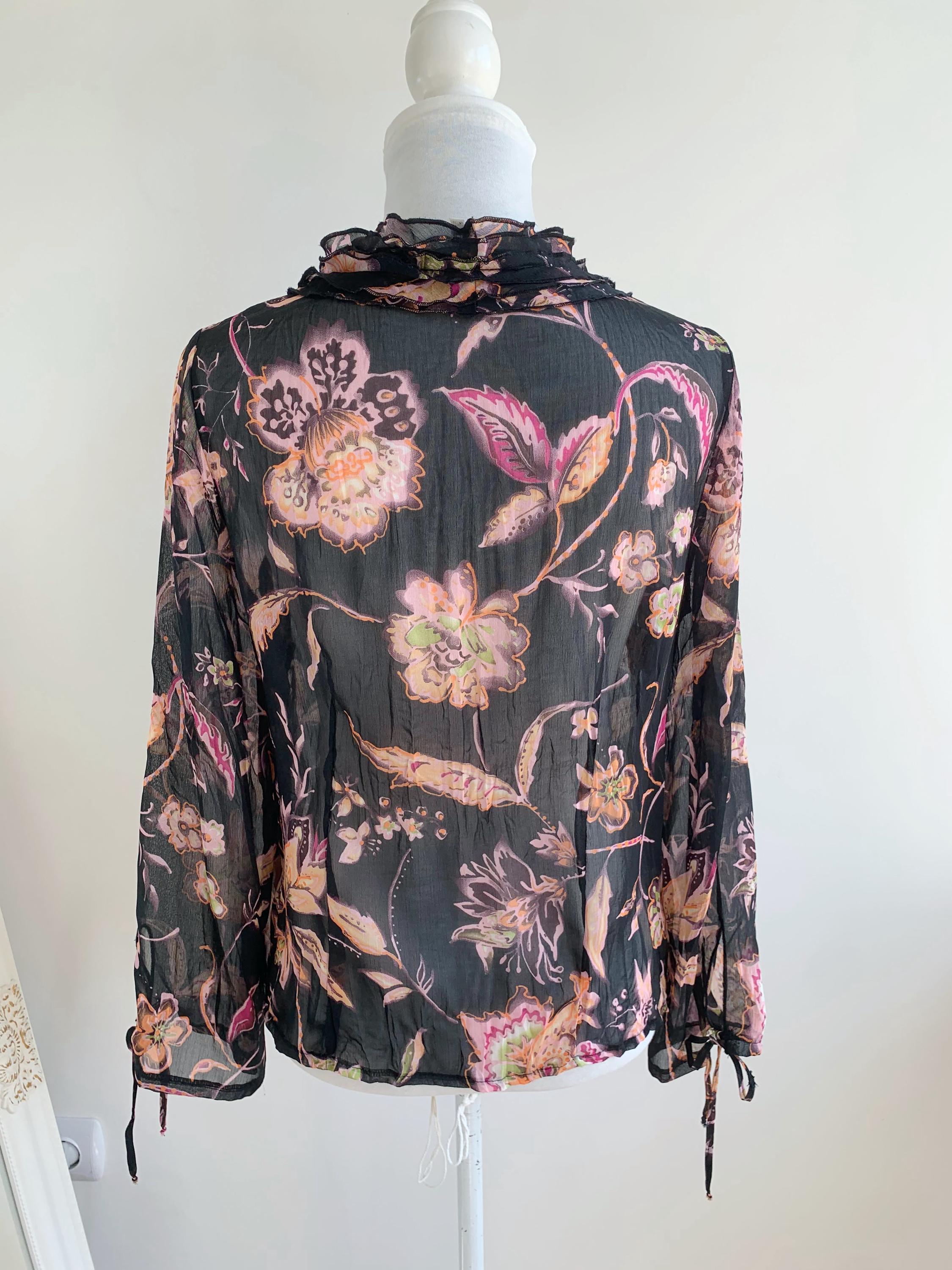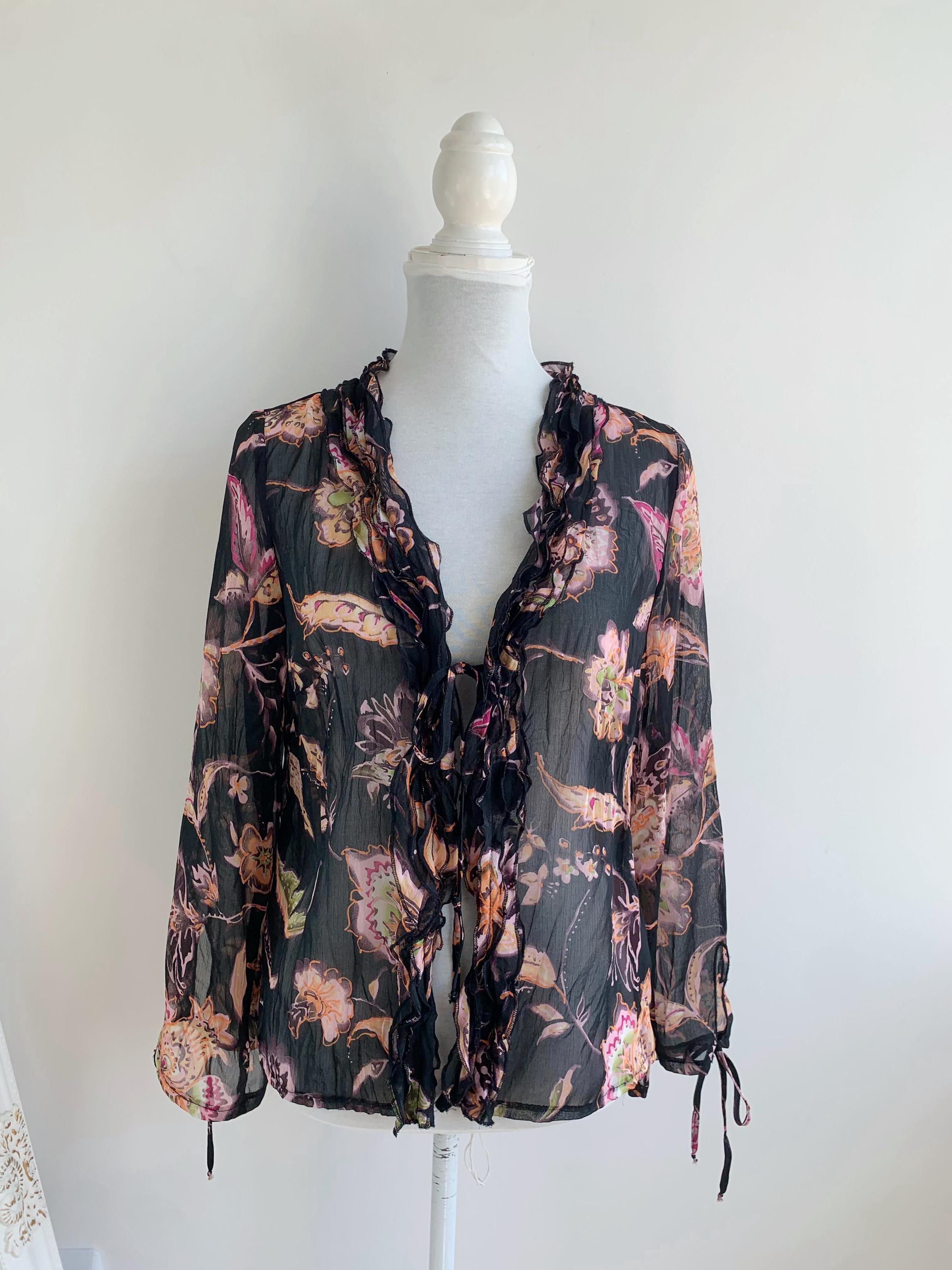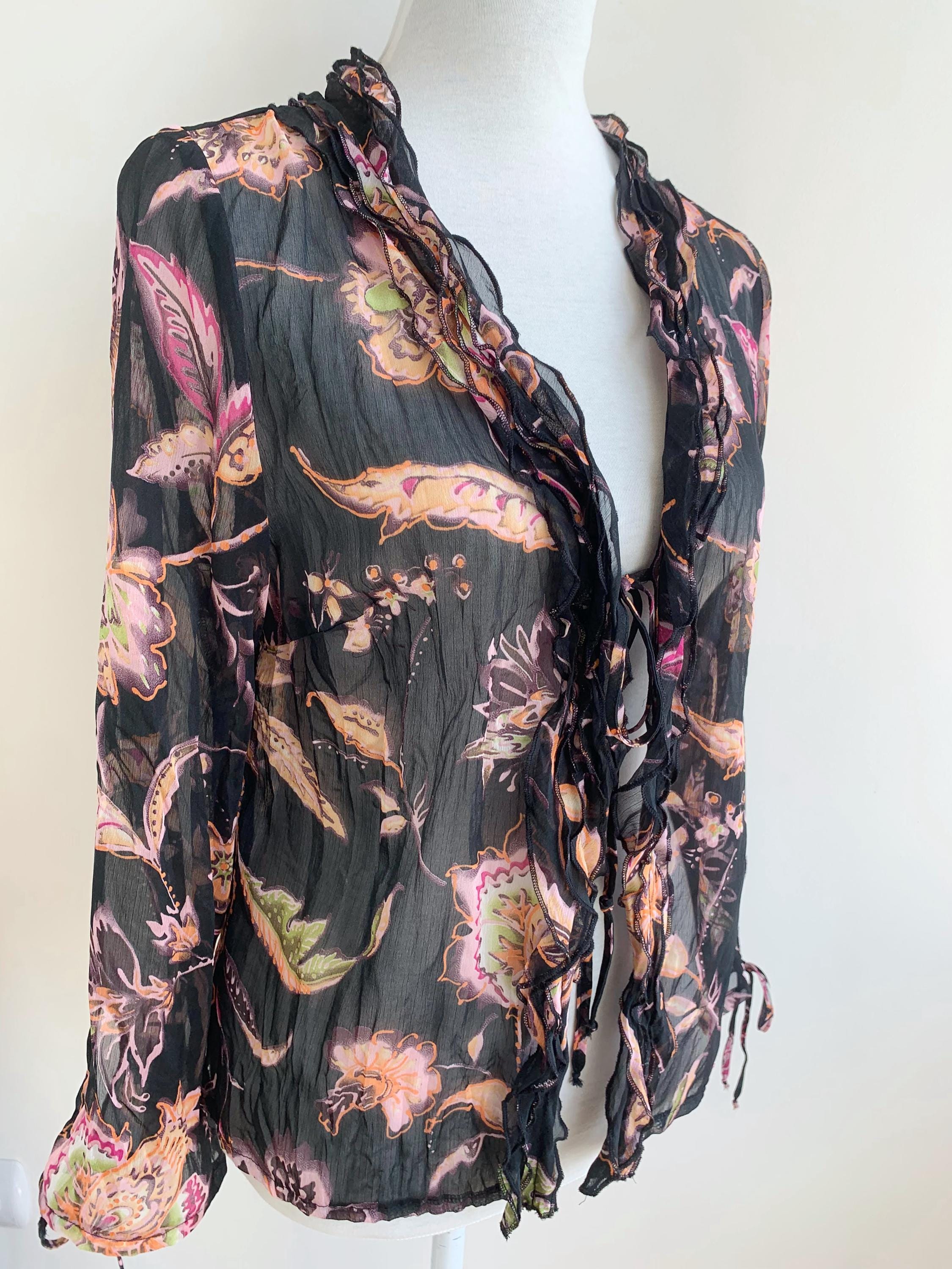 Step into a world of timeless bohemian charm with this exquisite vintage Authentic Clothing Company blouse. This Y2K-era piece is a celebration of feminine style, featuring a stunning floral pattern in shades of pink, orange, and green on a sheer black chiffon background. The V-neckline is elegantly framed by delicate ruffles that cascade down the front, adding a touch of romance and movement. The front ties allow for an adjustable fit, while the long sleeves are finished with charming tie cuffs, perfect for a casual or dressed-up look. Crafted from lightweight, flowing polyester, this blouse is an ideal choice for adding a unique, romantic touch to your wardrobe. Whether paired with high-waisted jeans for a casual outing or a skirt for a more formal event, this vintage top promises to make a statement.