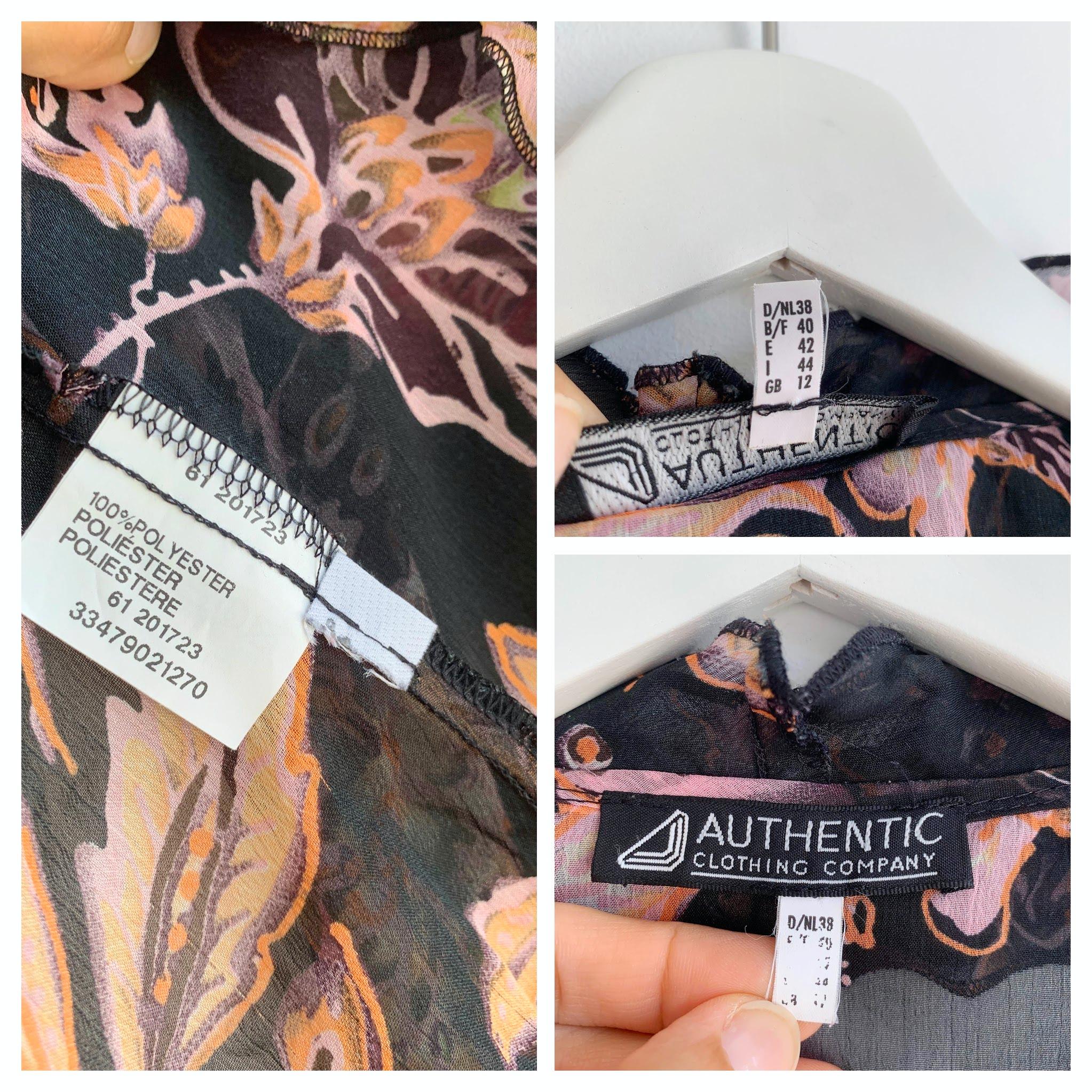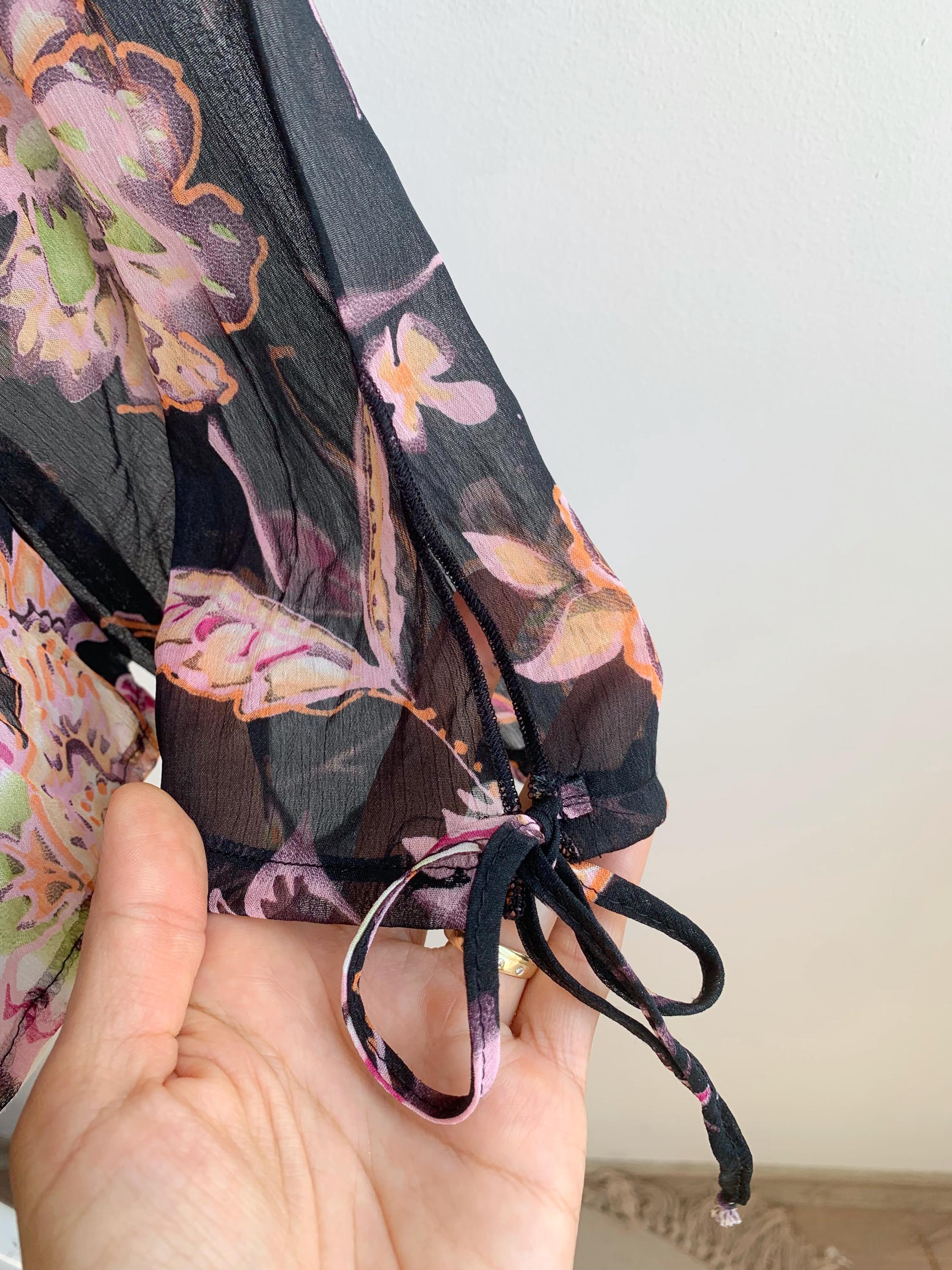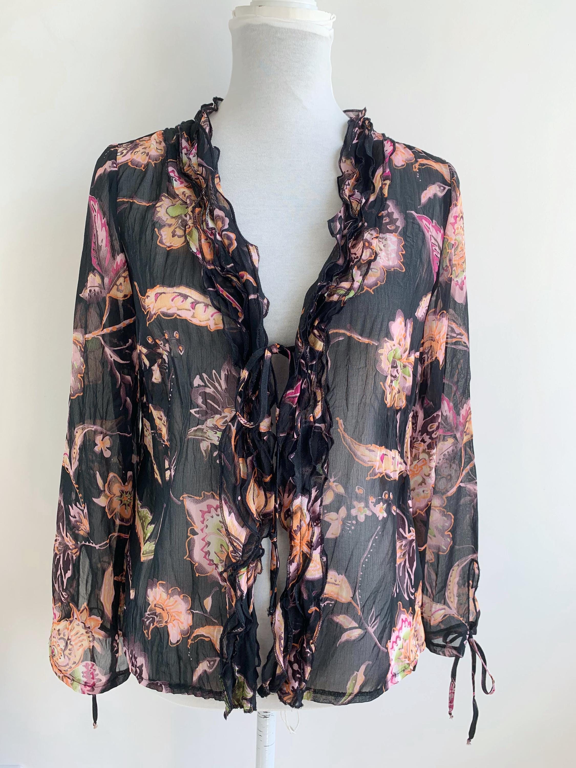 Step into a world of timeless bohemian charm with this exquisite vintage Authentic Clothing Company blouse. This Y2K-era piece is a celebration of feminine style, featuring a stunning floral pattern in shades of pink, orange, and green on a sheer black chiffon background. The V-neckline is elegantly framed by delicate ruffles that cascade down the front, adding a touch of romance and movement. The front ties allow for an adjustable fit, while the long sleeves are finished with charming tie cuffs, perfect for a casual or dressed-up look. Crafted from lightweight, flowing polyester, this blouse is an ideal choice for adding a unique, romantic touch to your wardrobe. Whether paired with high-waisted jeans for a casual outing or a skirt for a more formal event, this vintage top promises to make a statement.