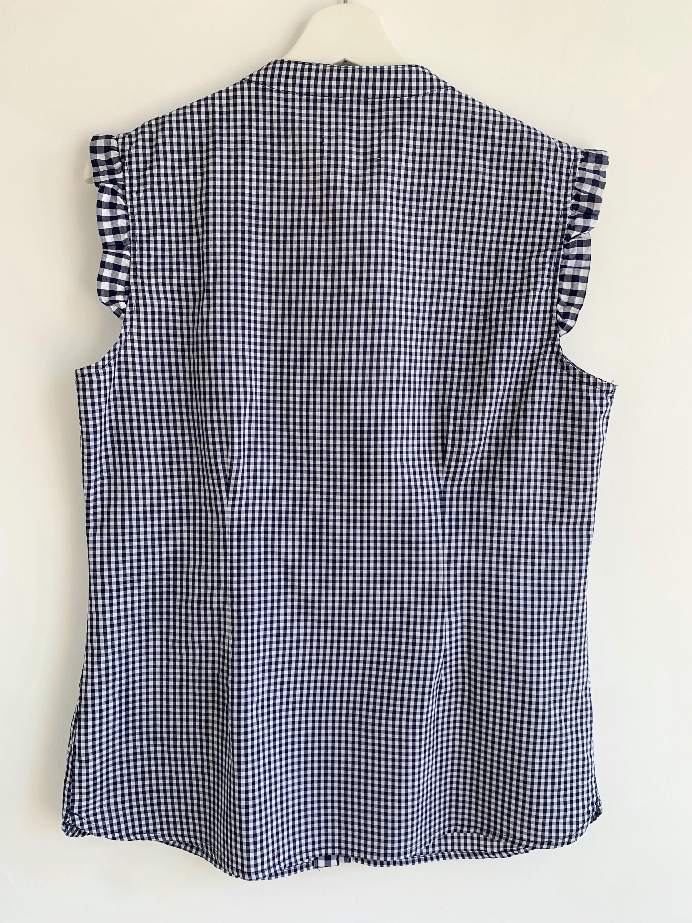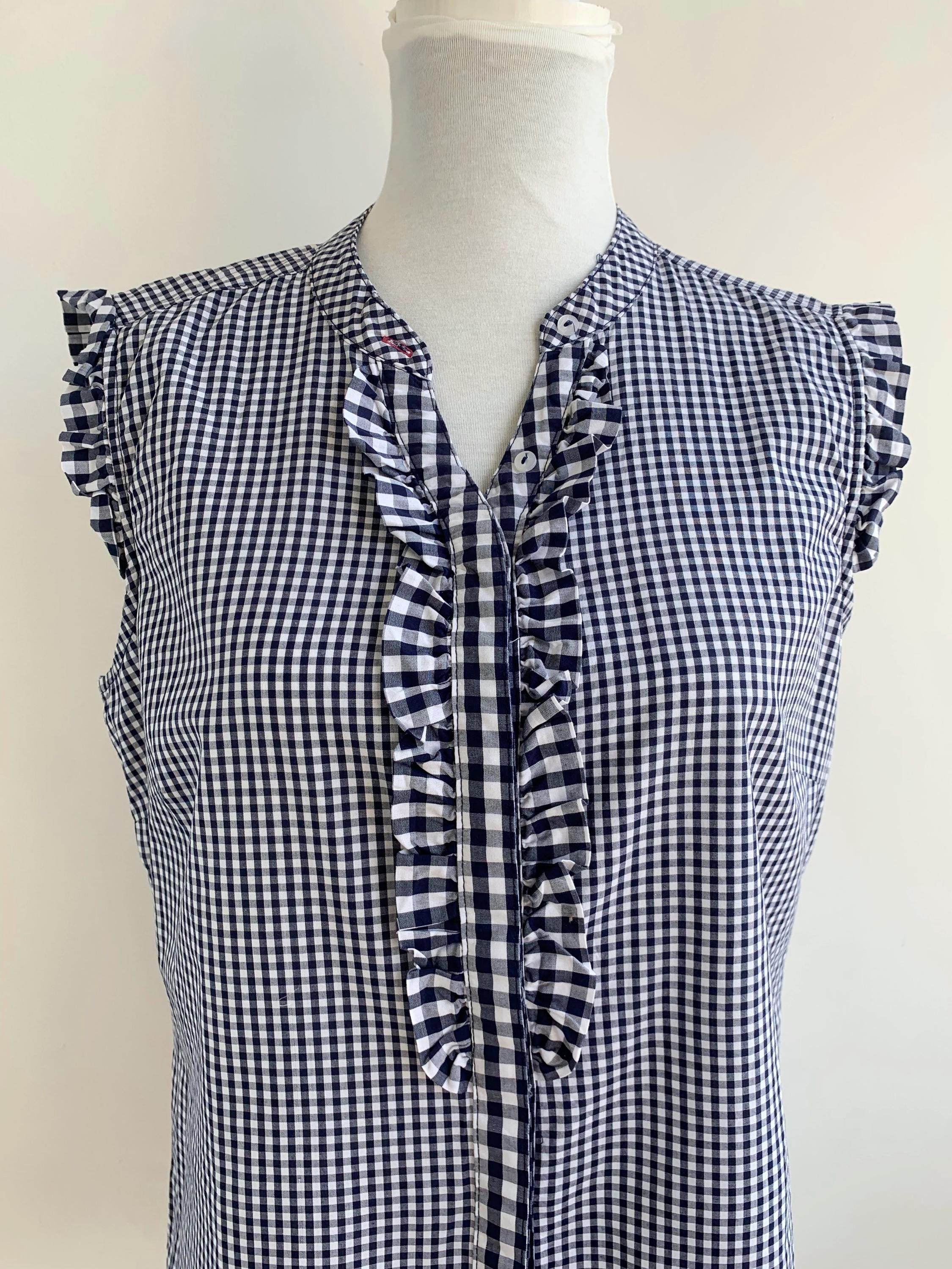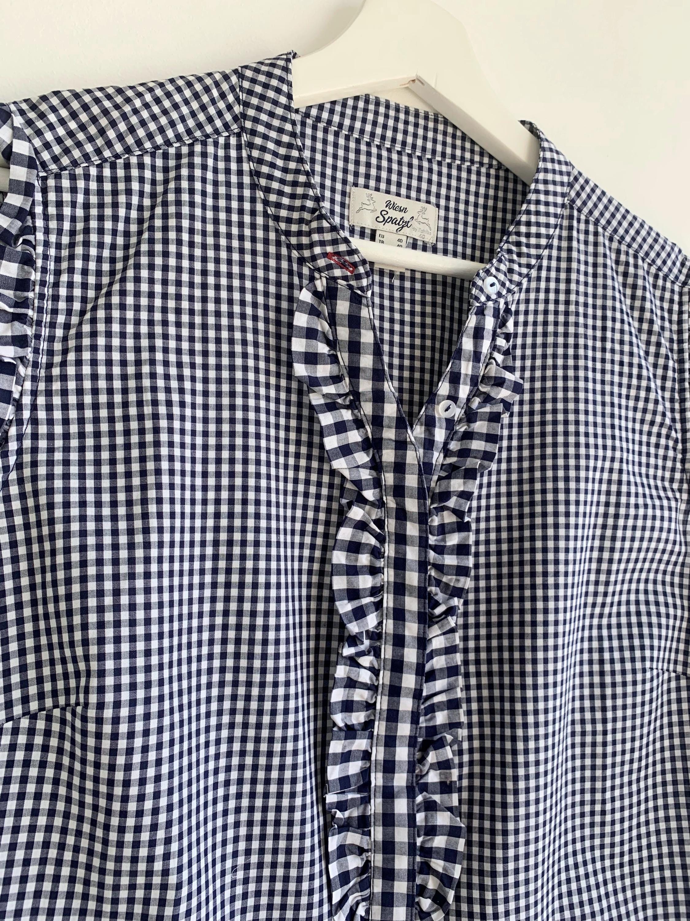 This charming vintage Wiesn Spatzl navy blue gingham blouse in size L is a perfect blend of classic style and playful detail. The navy blue and white checkered pattern is a timeless staple, while the delicate ruffles on the front placket and shoulders add a touch of feminine flair. Made in Germany, this Trachten-style top is ideal for creating an authentic look for Oktoberfest or simply adding a unique, retro touch to your everyday wardrobe. The sleeveless design with ruffled cap sleeves makes it perfect for warmer weather, and the flattering fit is both comfortable and stylish. This unique vintage shirt is a high-quality piece that will become a go-to item for years to come.