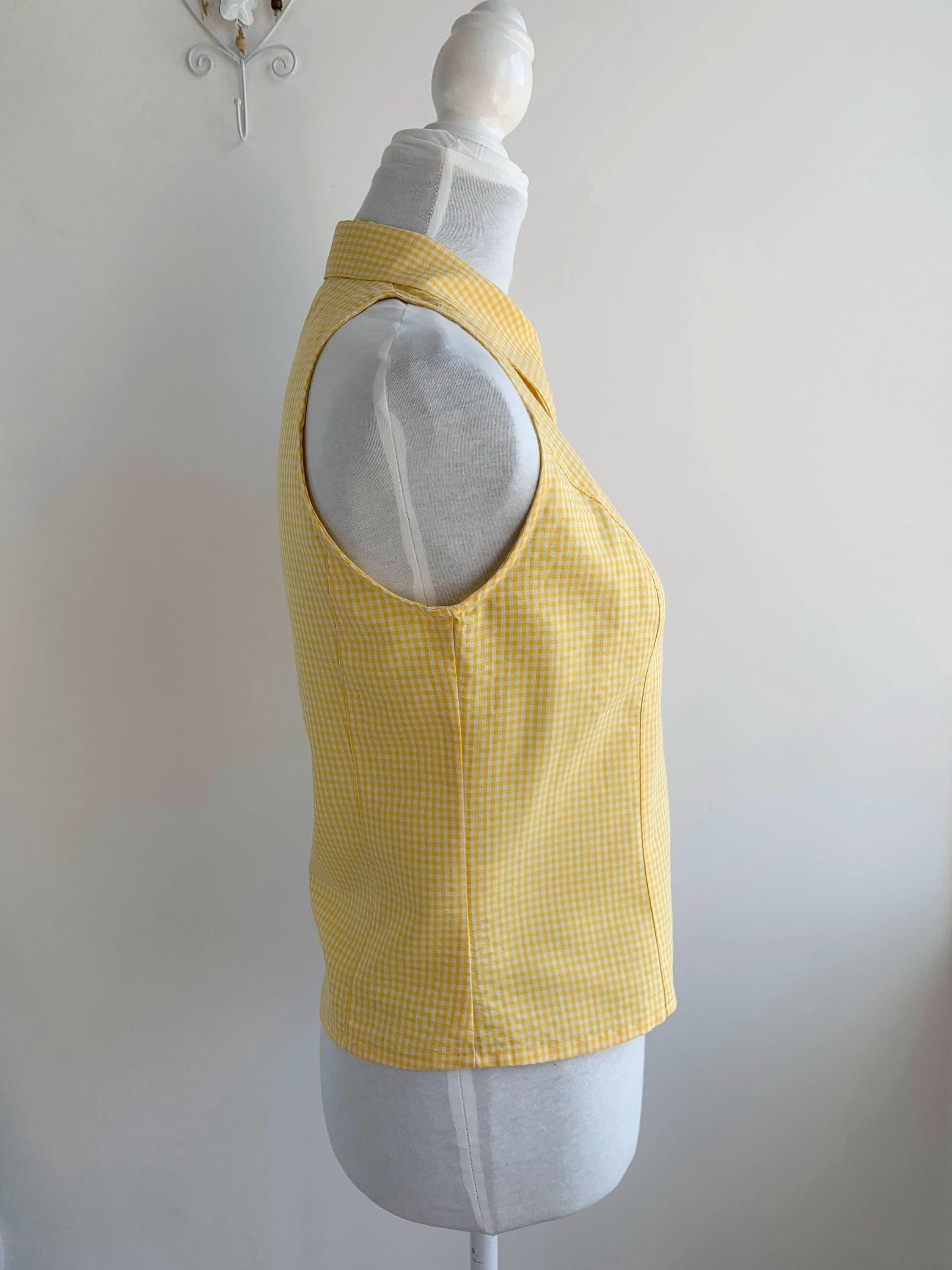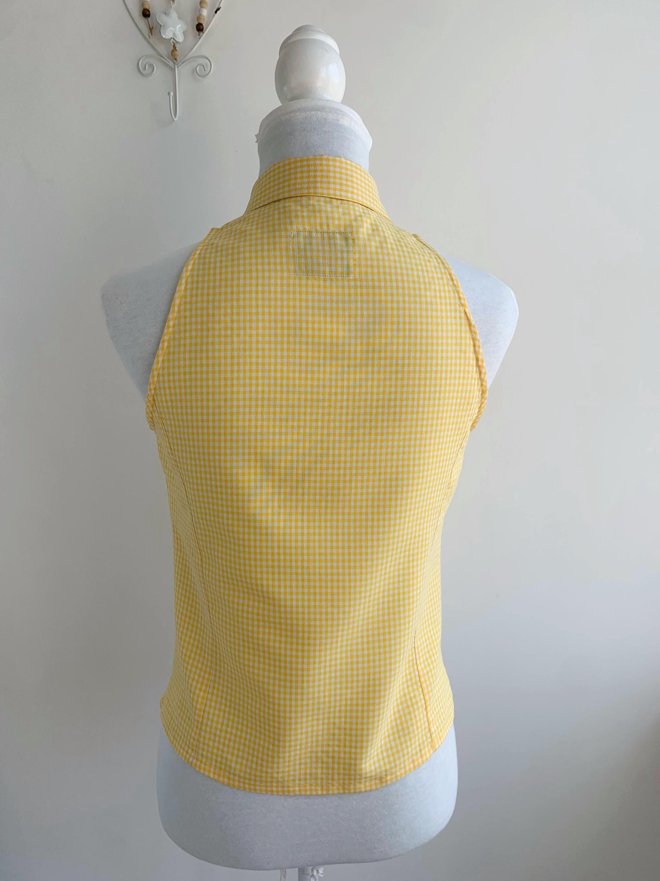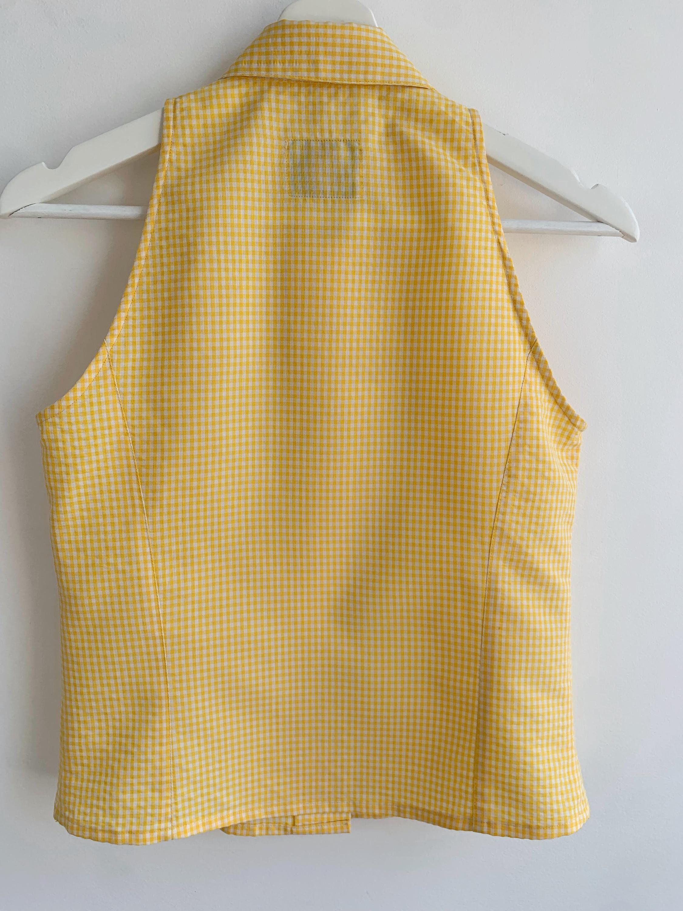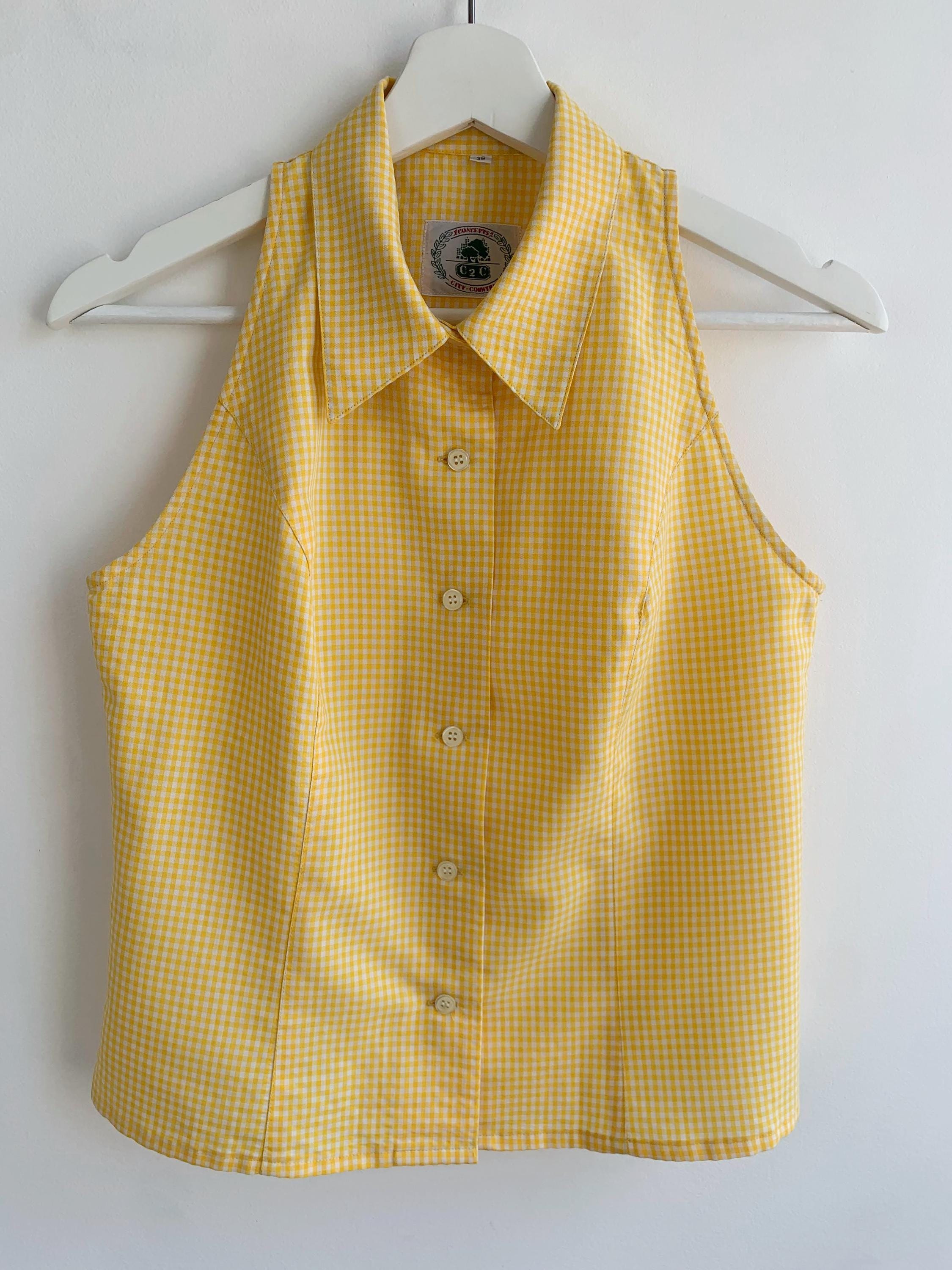 Step into sunshine with this adorable vintage yellow gingham blouse from C2C City Country in size S. This sleeveless halter-style top features a classic button-down front and a pointed collar, giving it a playful yet sophisticated retro vibe. Made in Spain, the vibrant yellow and white checkered pattern is perfect for adding a pop of color to your summer wardrobe. The form-fitting silhouette and cropped length make it an excellent choice for pairing with high-waisted jeans, skirts, or shorts. Whether you're going for a picnic-perfect look or a casual day out, this unique and charming 80s top is a must-have for any vintage lover.