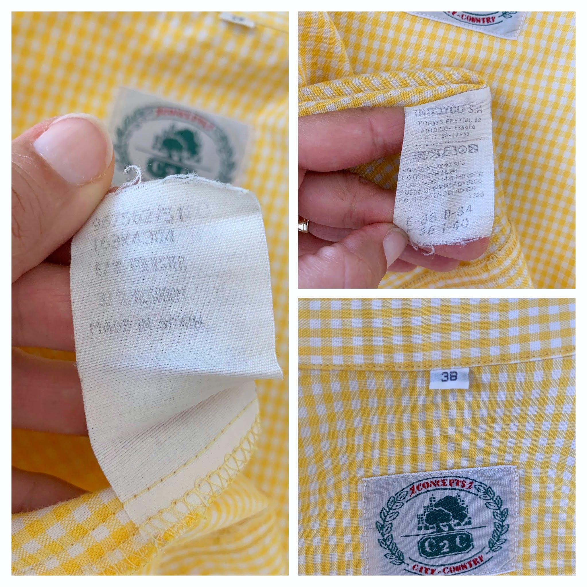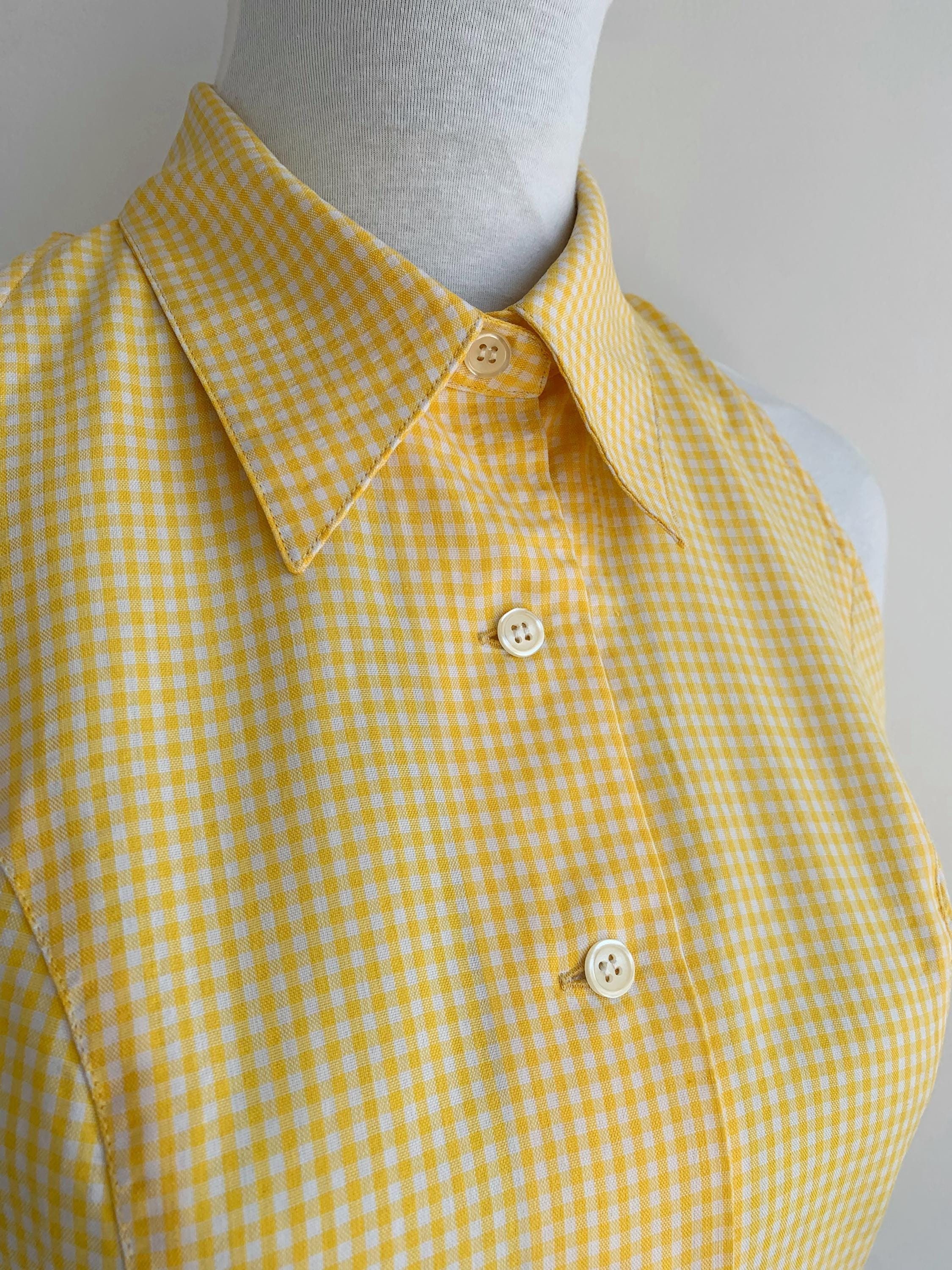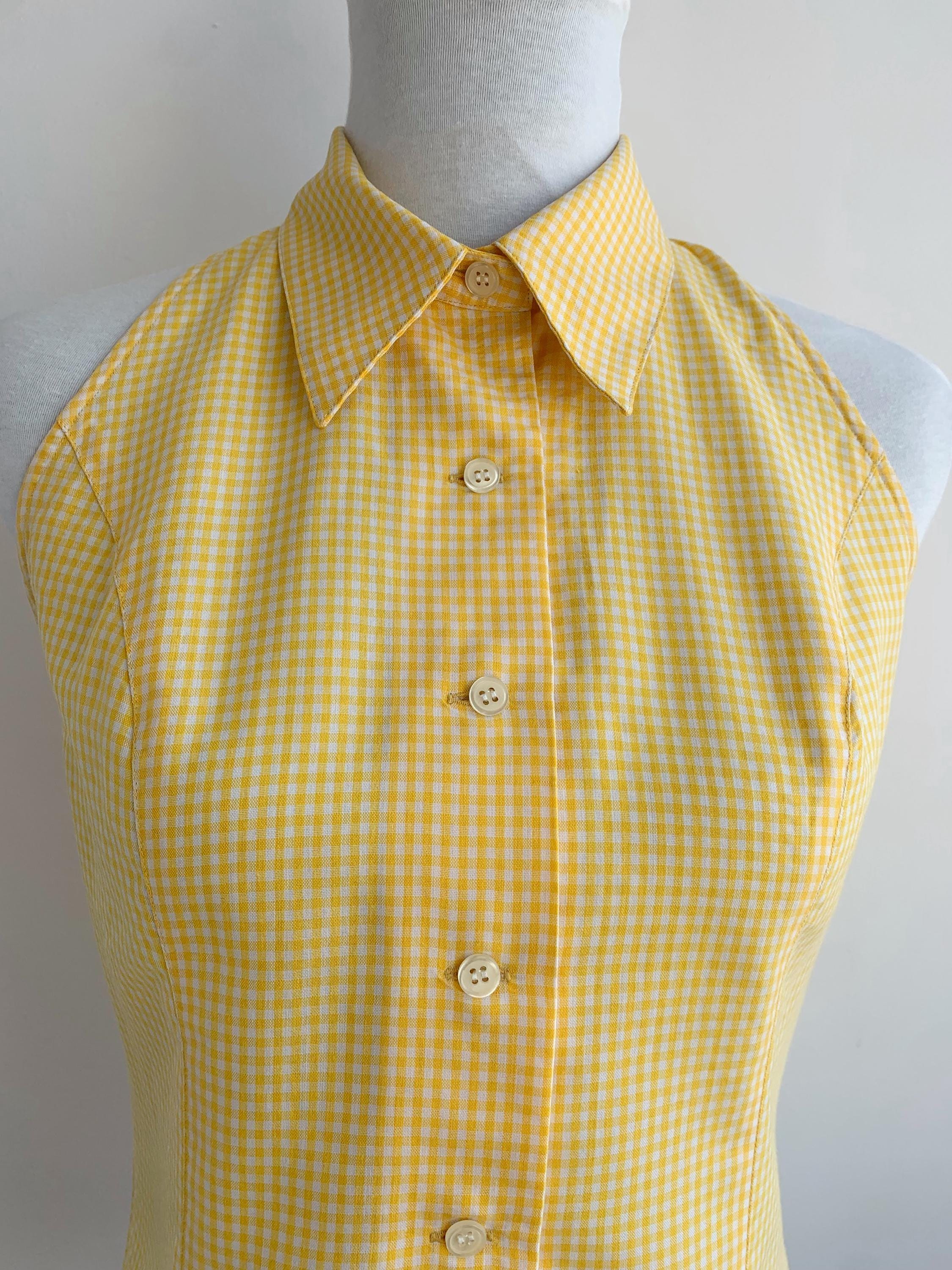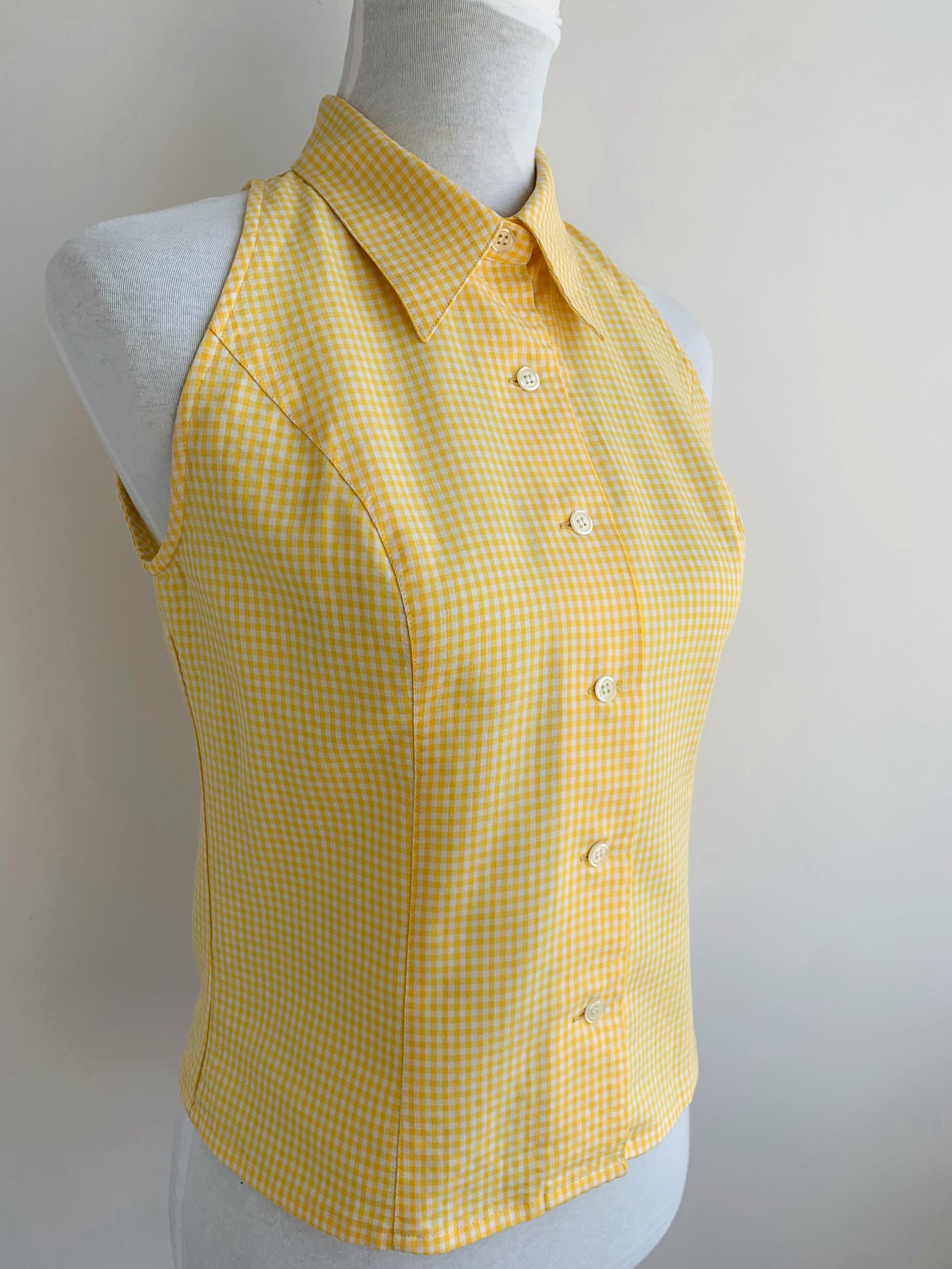 Step into sunshine with this adorable vintage yellow gingham blouse from C2C City Country in size S. This sleeveless halter-style top features a classic button-down front and a pointed collar, giving it a playful yet sophisticated retro vibe. Made in Spain, the vibrant yellow and white checkered pattern is perfect for adding a pop of color to your summer wardrobe. The form-fitting silhouette and cropped length make it an excellent choice for pairing with high-waisted jeans, skirts, or shorts. Whether you're going for a picnic-perfect look or a casual day out, this unique and charming 80s top is a must-have for any vintage lover.