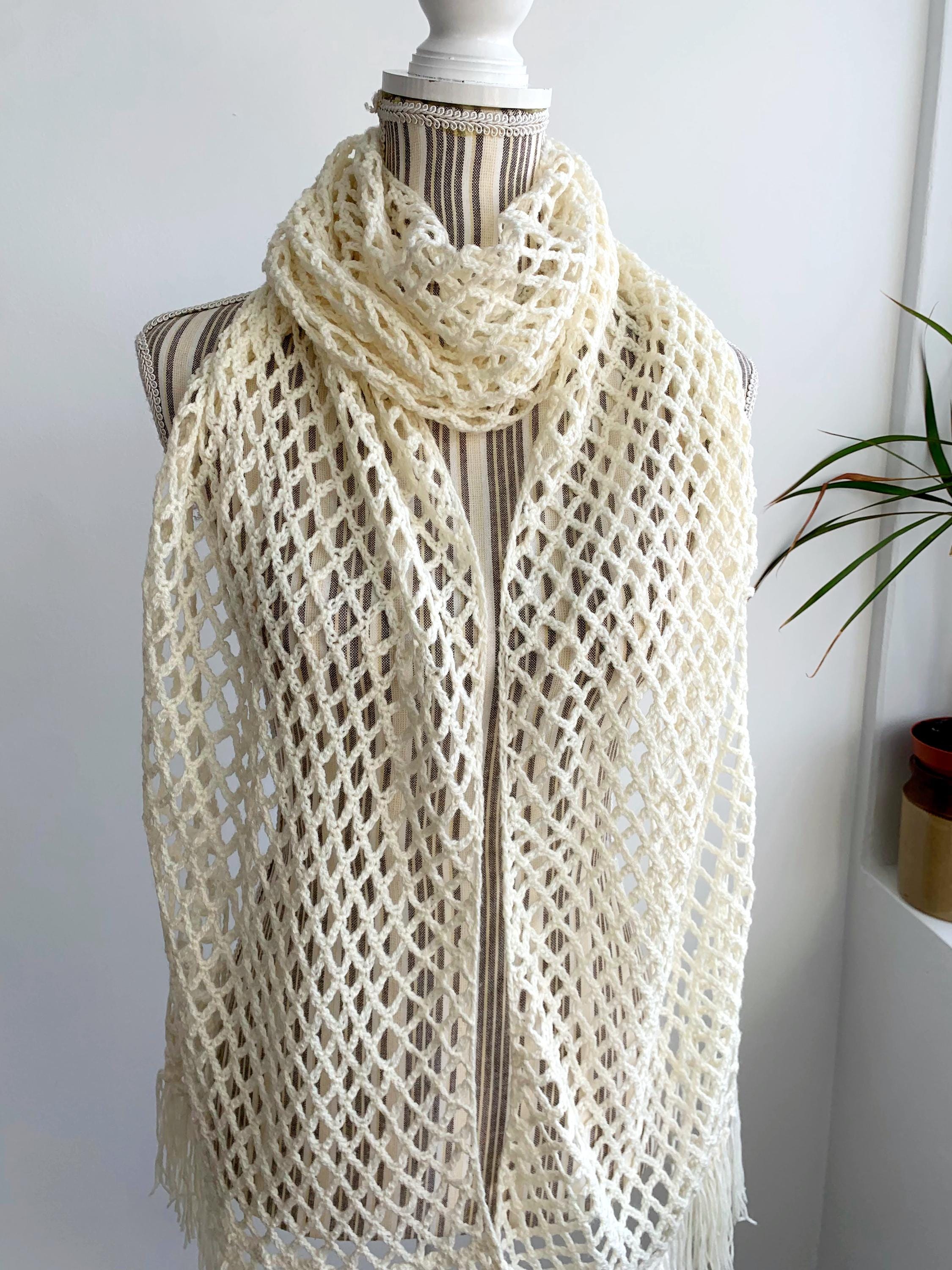 Add a touch of bohemian elegance to your wardrobe with this stunning vintage 90s crochet shawl. Handmade with a delicate, open-weave mesh pattern, this cream-white sheer
