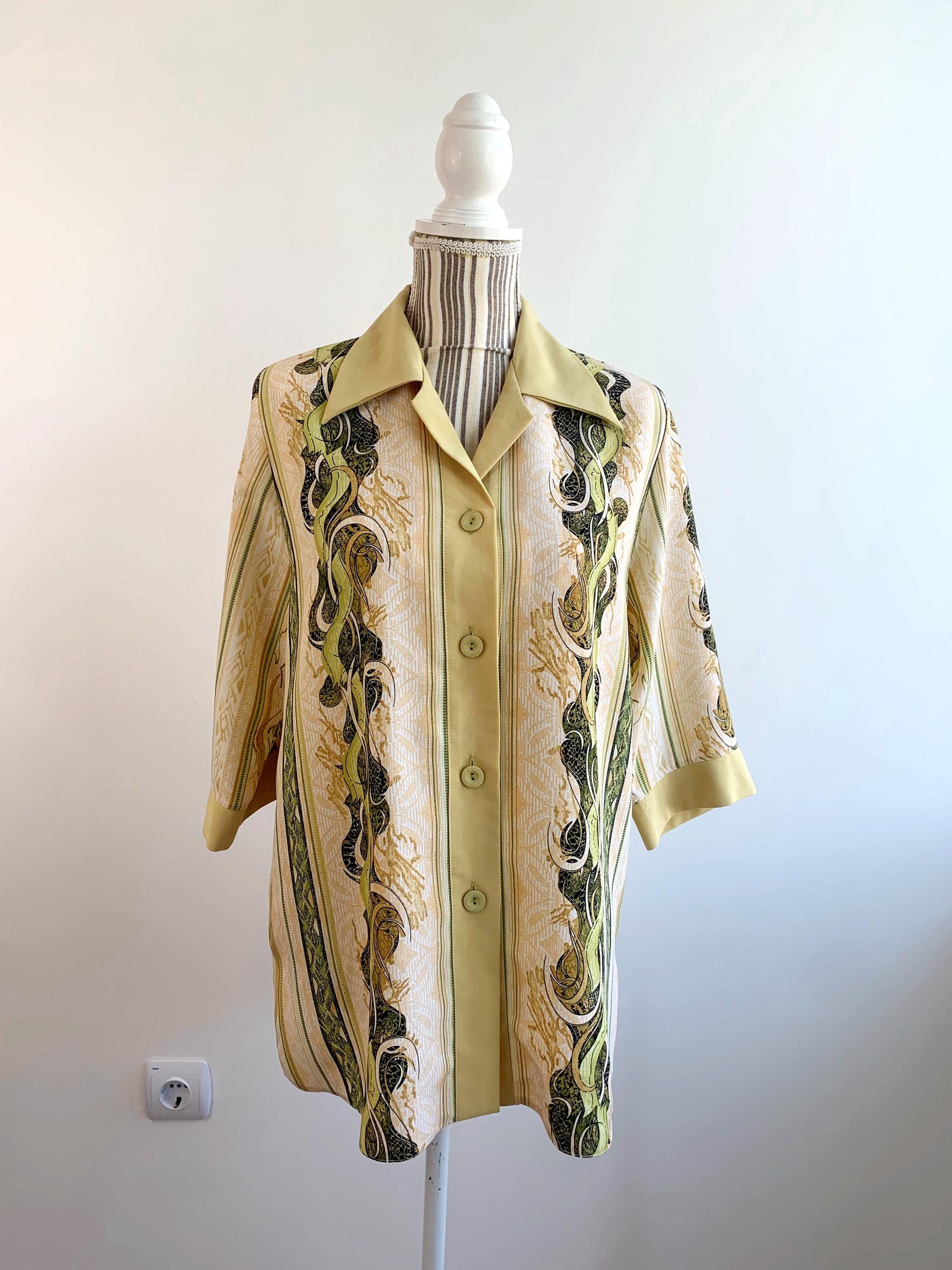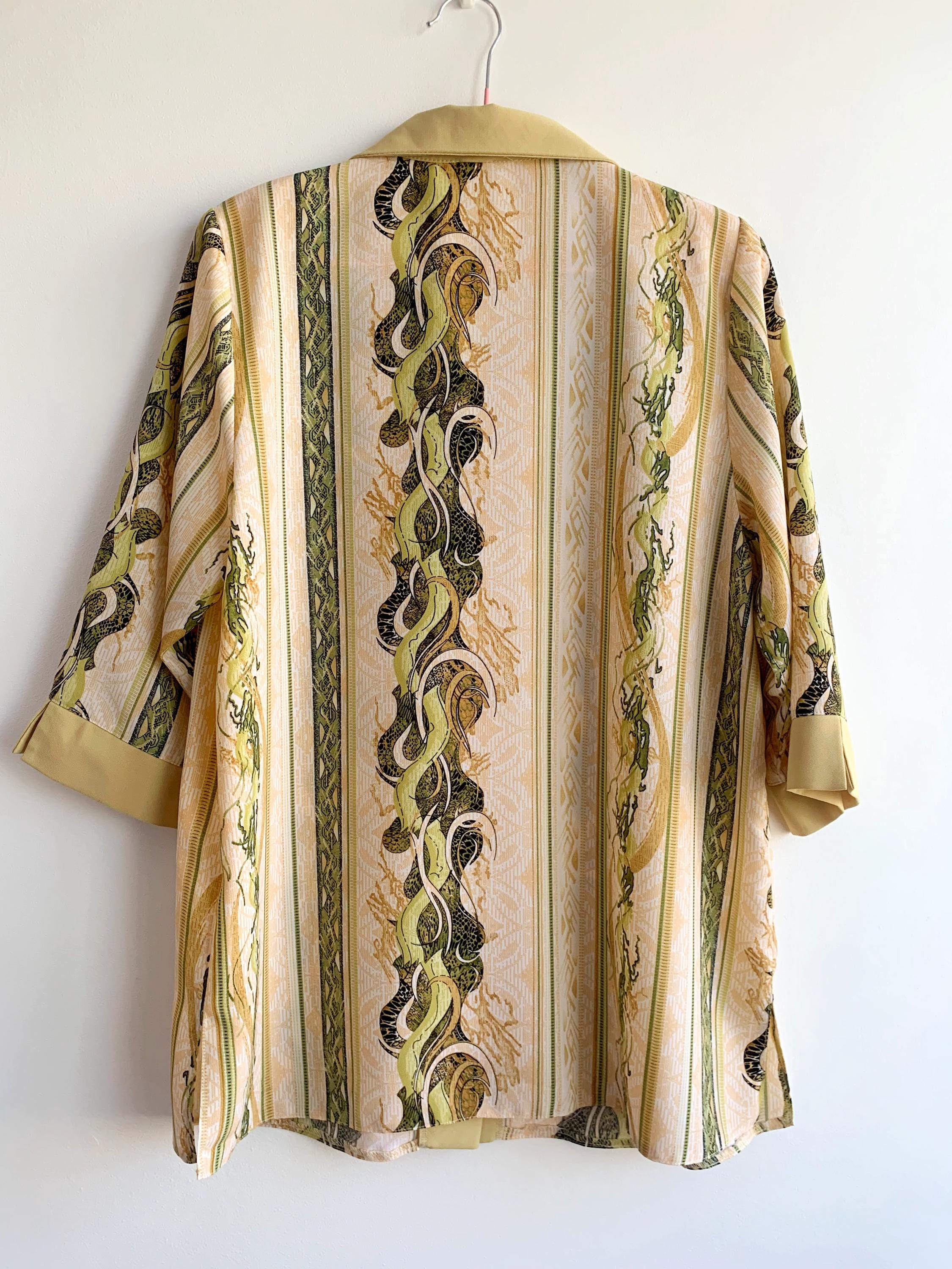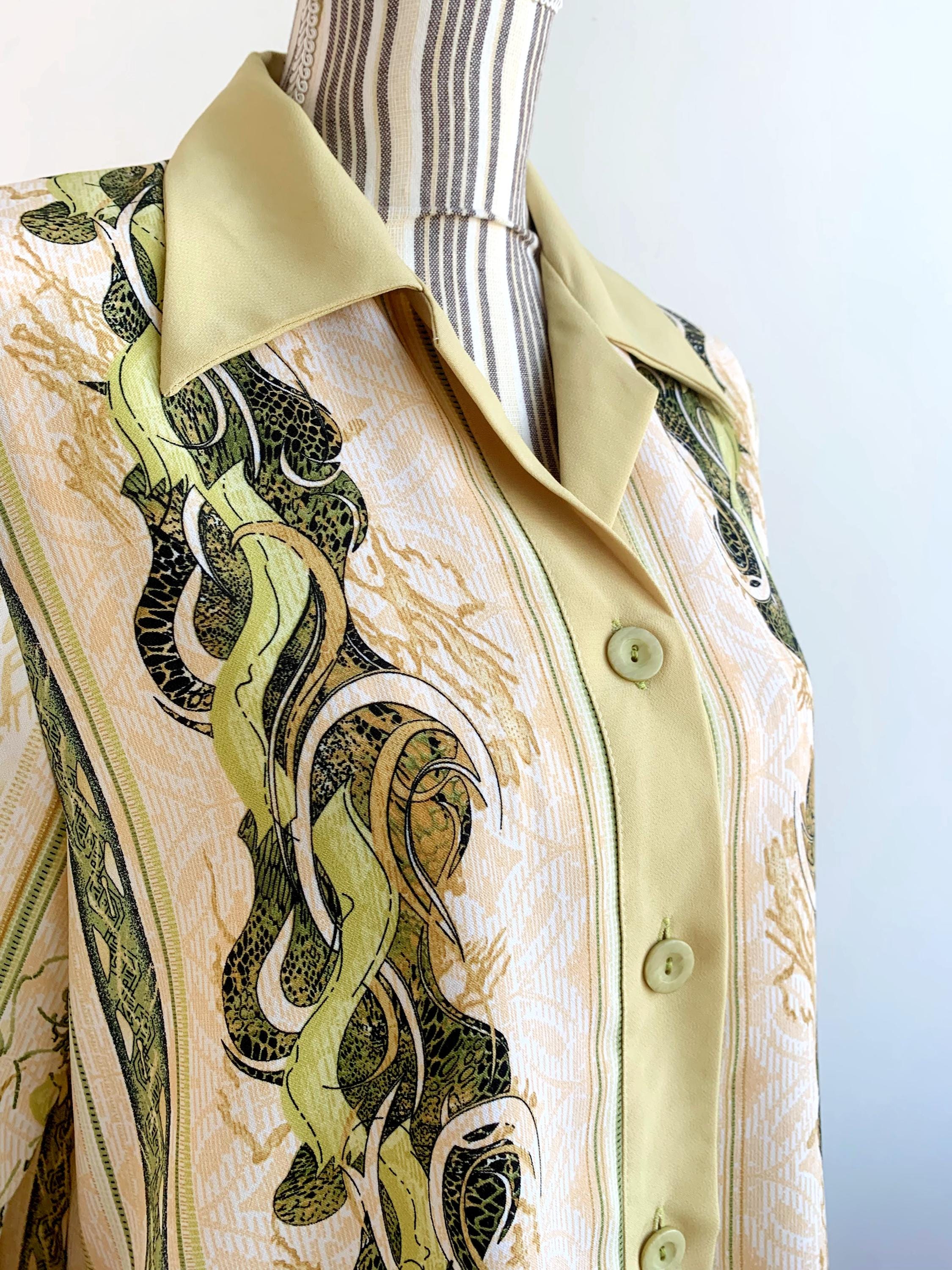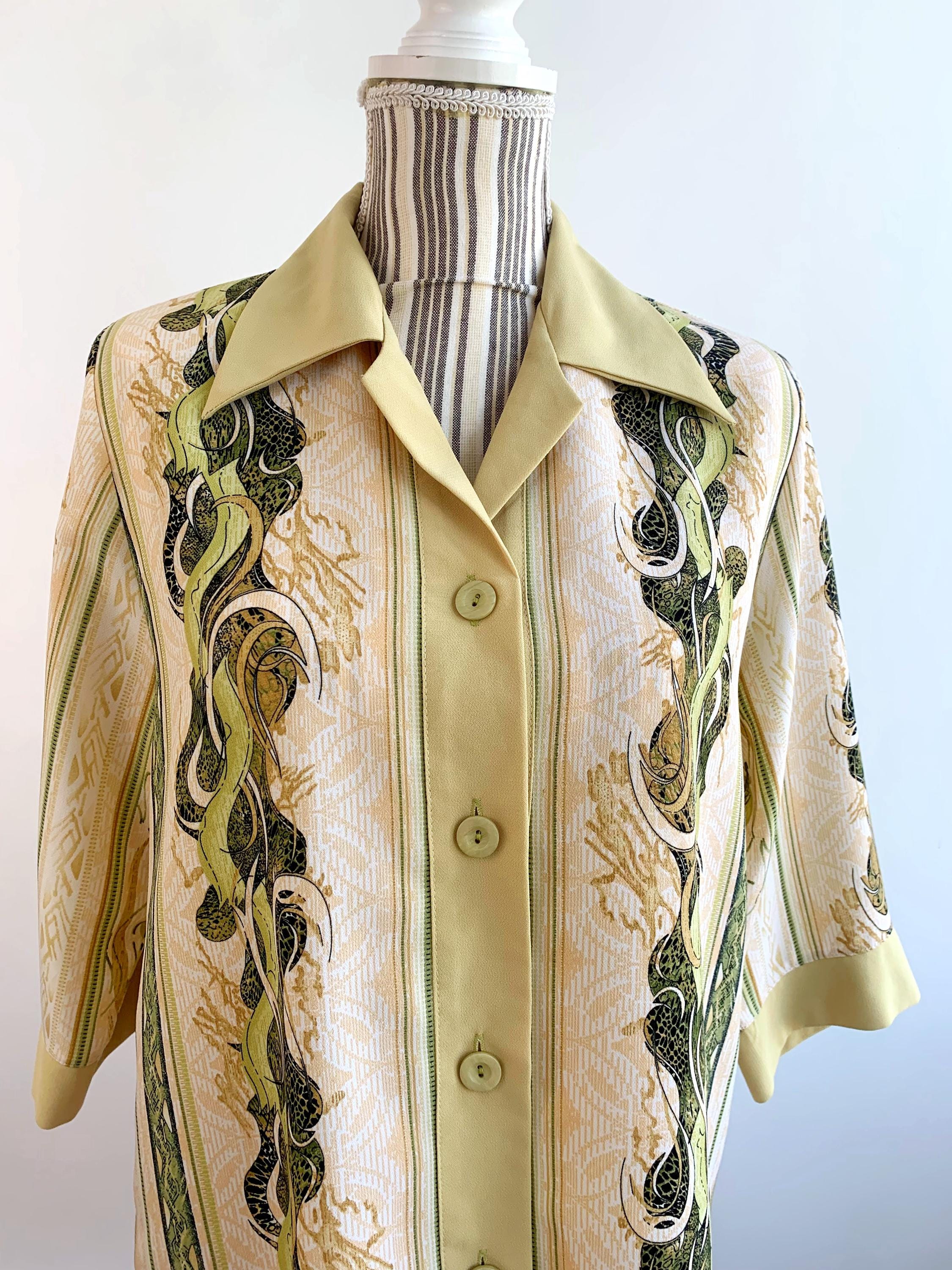 This is a vintage 90s does 70s eye-catching vintage blouse for women in size M, a true testament to the era's bold and artistic fashion. This striking button-up shirt features a mesmerizing psychedelic and abstract print in shades of olive green, tan, and cream, with subtle black accents that create a dynamic visual effect. The unique pattern, reminiscent of swirling vines or organic shapes, runs vertically down the front and back, giving it a distinctive retro flair. This collared button up top crafted with a comfortable, flowy silhouette and a classic collar, perfect for channeling effortless bohemian chic. This versatile piece of clothing can be styled tucked into high-waisted jeans, worn open over a tank top, or paired with a maxi skirt for a true vintage ensemble.