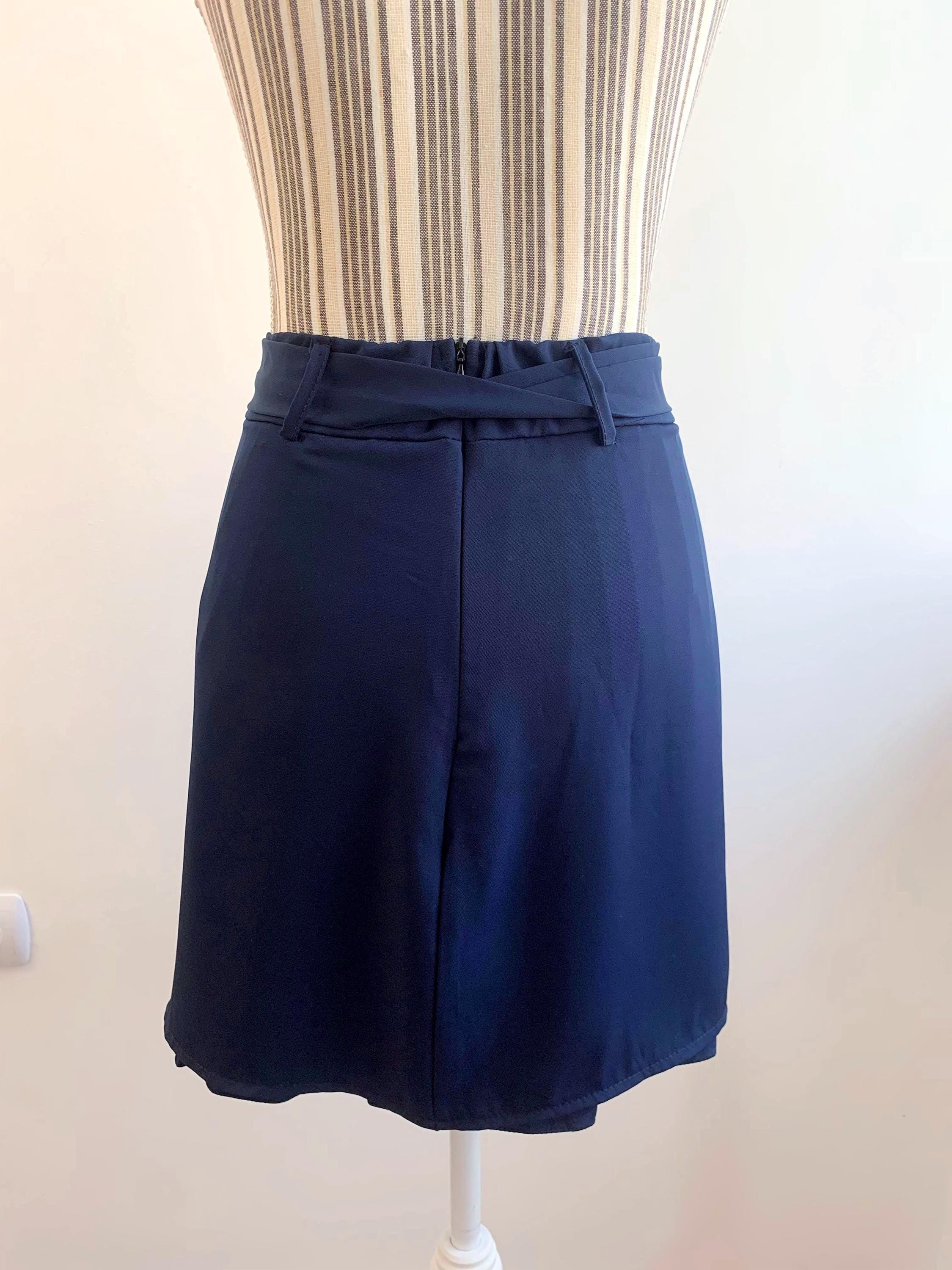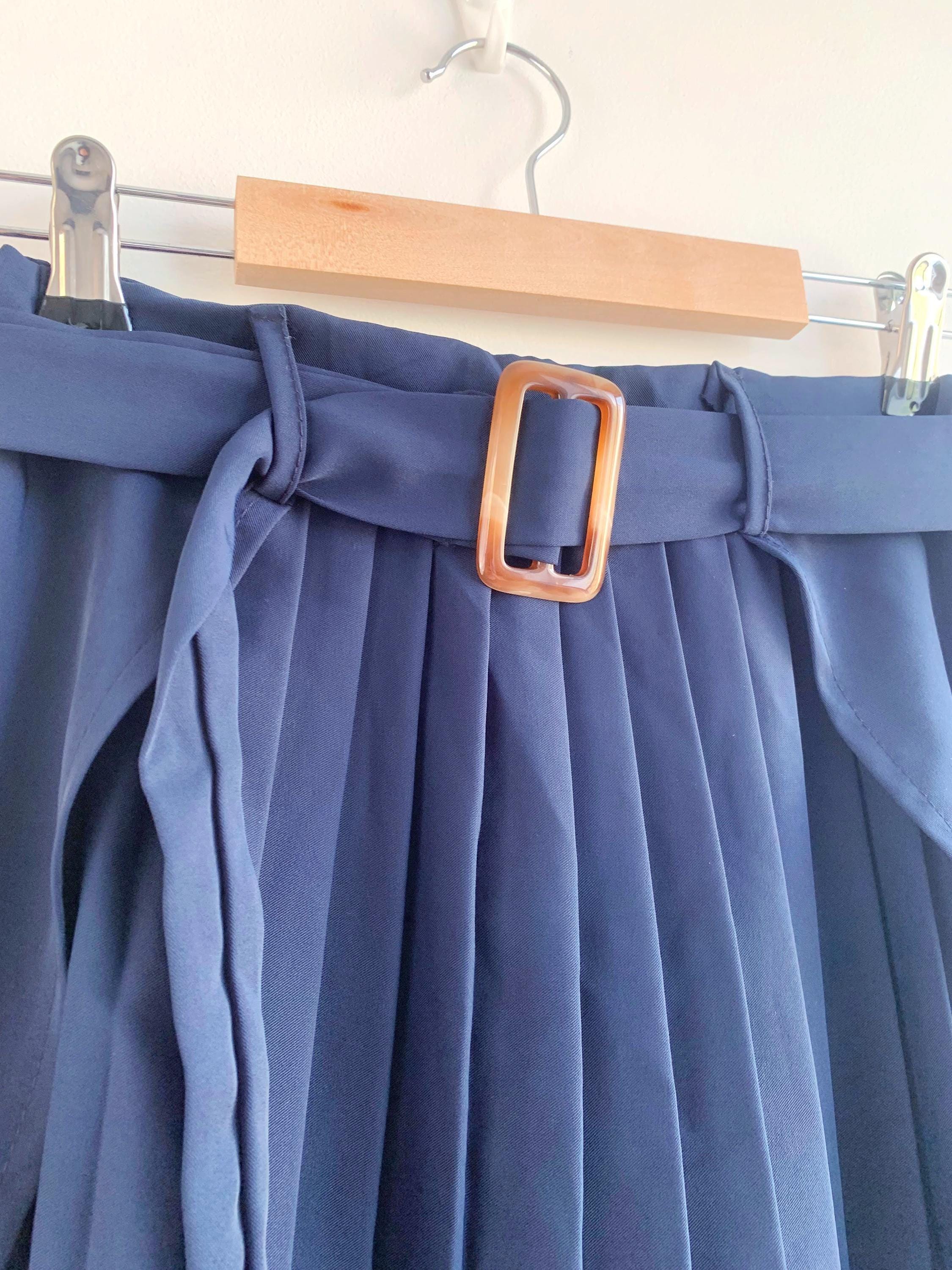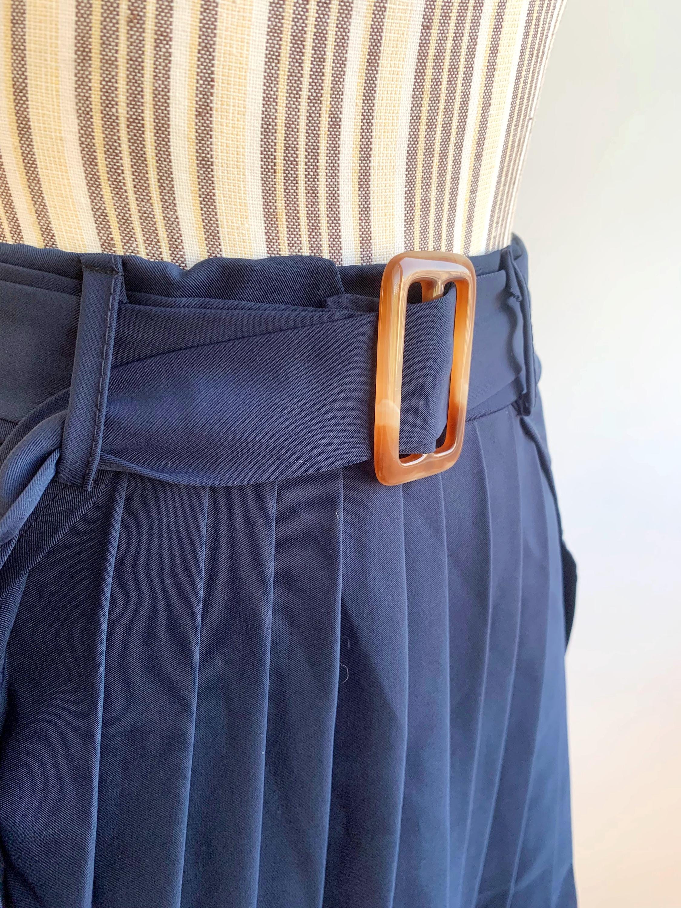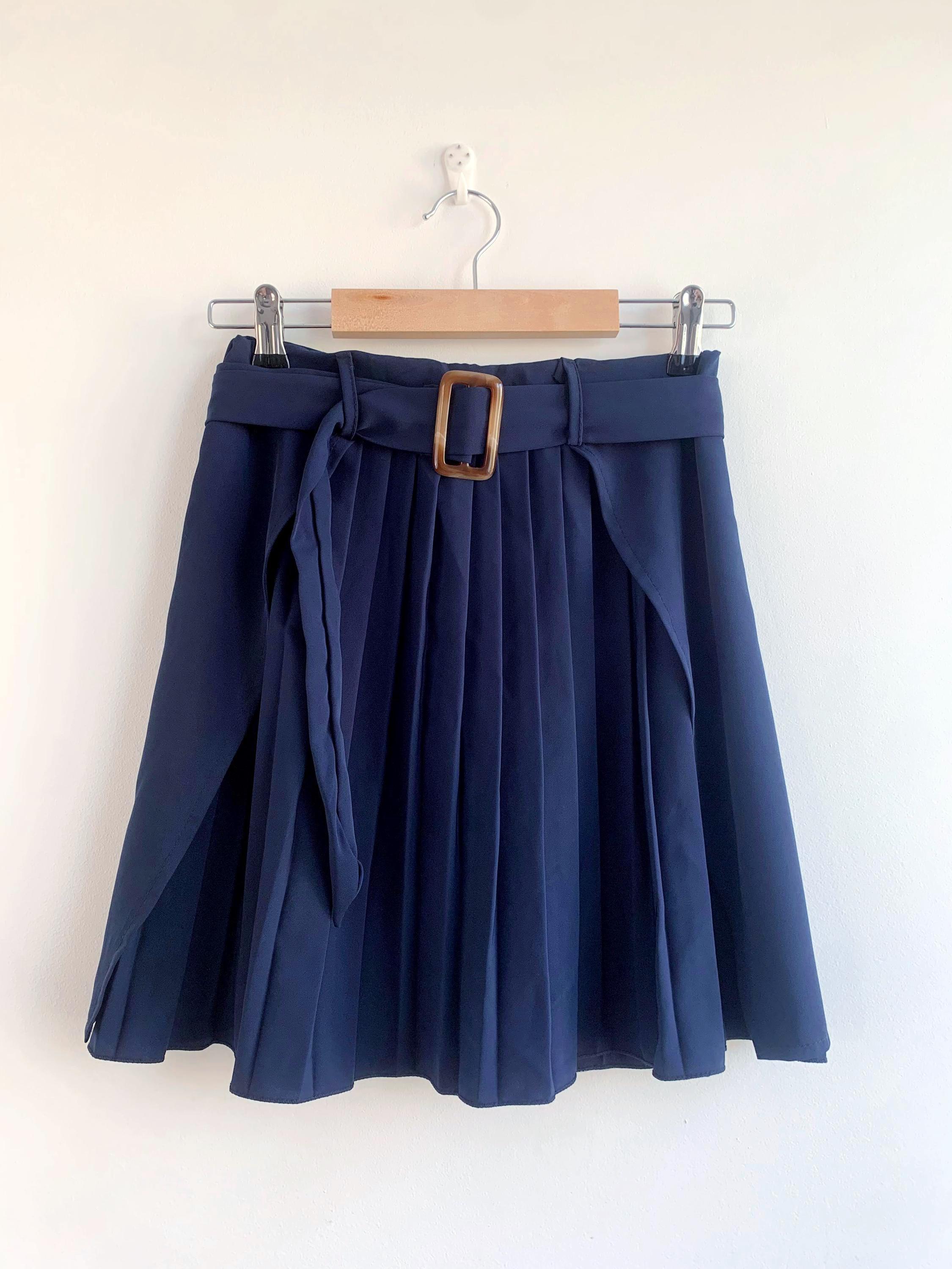 Step back in time with this adorable vintage pleated mini skirt in a classic navy blue volor in size S with elasticated waistline and stylish belt. This charming A-line skirt features crisp pleats that offer a flattering silhouette, perfect for adding a touch of retro elegance to your everyday style. The high-waisted design is complemented by a stylish built-in belt with a chic rectangular buckle, adding a unique detail and ensuring a perfect fit. Whether you're aiming for a smart casual look or a more sophisticated ensemble, this versatile skirt is a fantastic vintage find. It's a true statement piece that blends timeless design with modern wearability, ideal for any vintage fashion enthusiast or someone looking to infuse their wardrobe with unique, high-quality pieces.