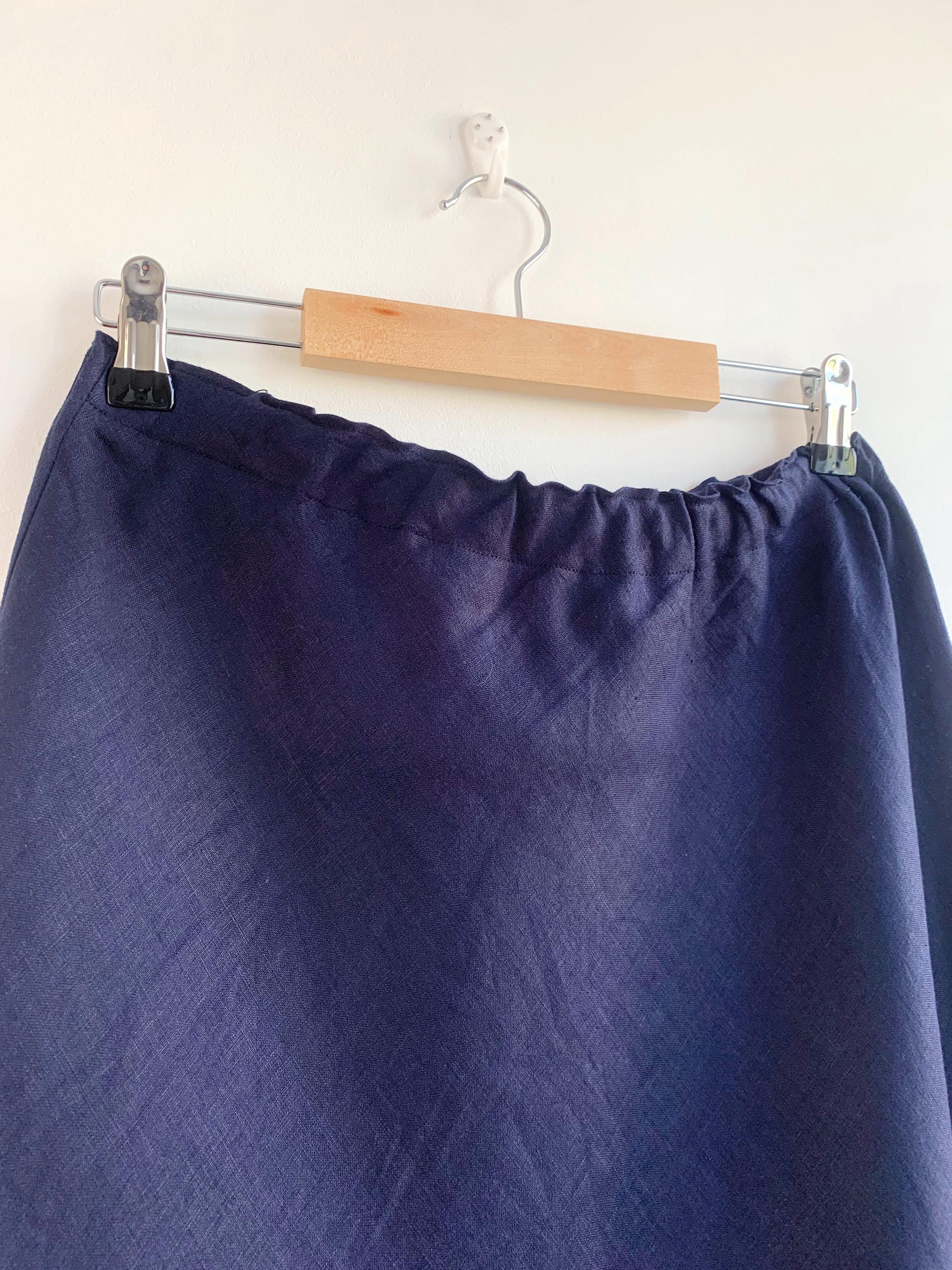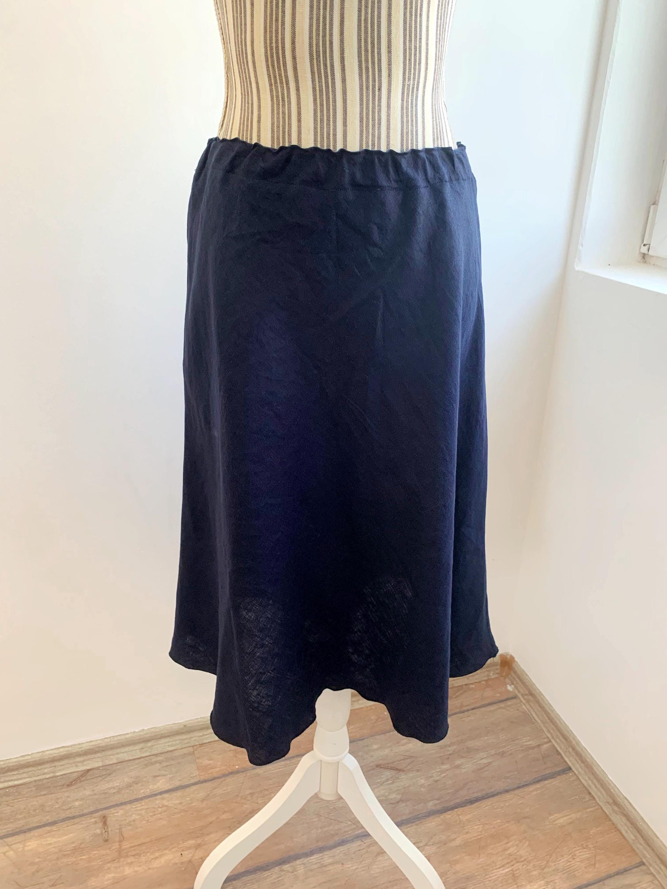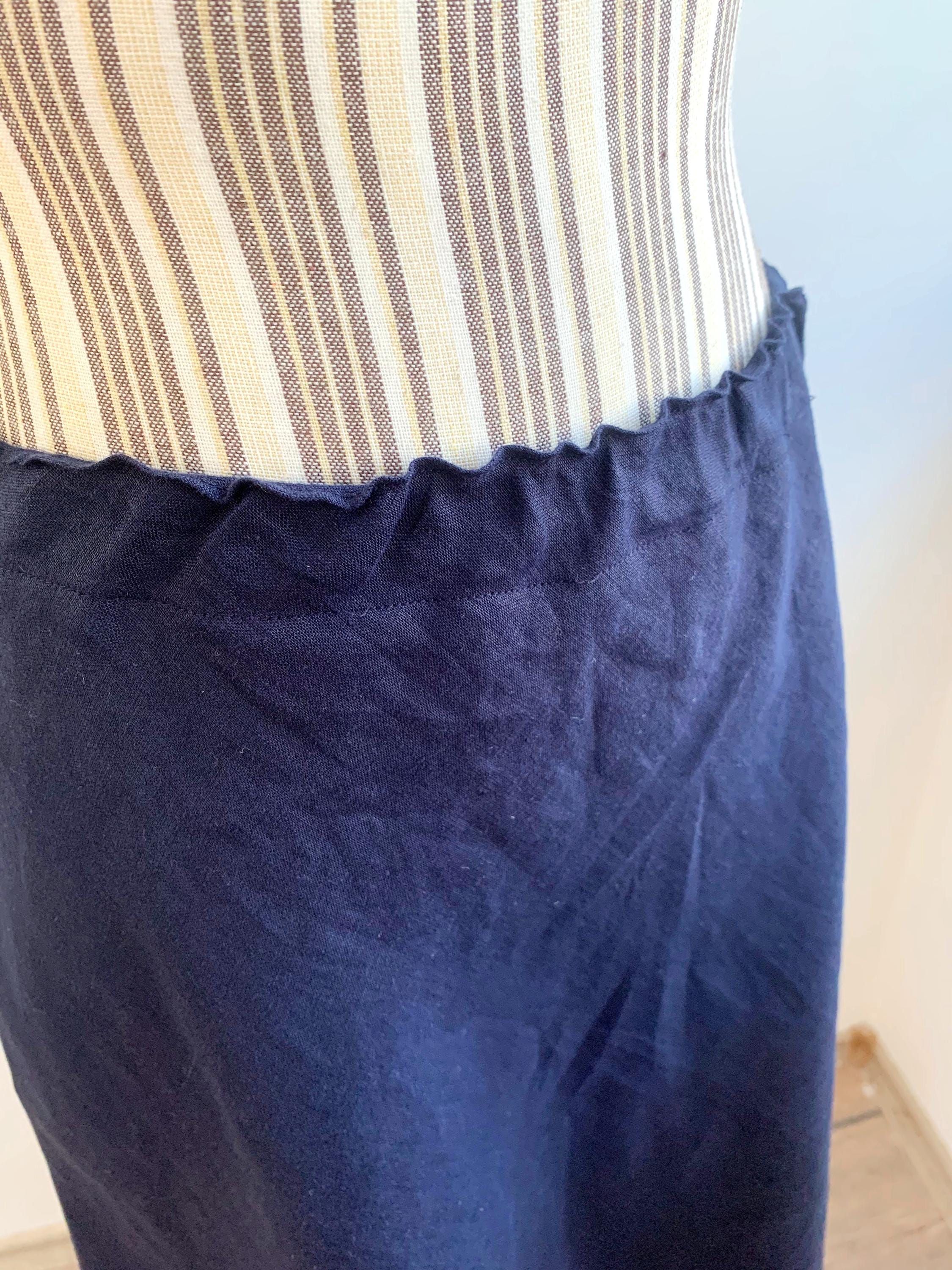 Step out in timeless style with this charming vintage navy blue midi linen skirt in size M/L, a perfect addition to your sustainable wardrobe. Crafted from a comfortable linen fabric, this A-line skirt features a flattering elastic waist, ensuring a comfortable and versatile fit for various body types. Its classic silhouette makes it an ideal choice for everyday wear, adding a touch of understated elegance to any outfit. The beautiful navy hue is versatile and effortlessly chic, making it easy to dress up or down for any occasion, from casual outings to more refined gatherings. Embrace the beauty of vintage fashion with this high-quality, unique piece that offers both comfort and enduring style.